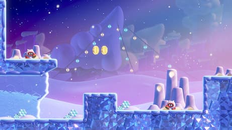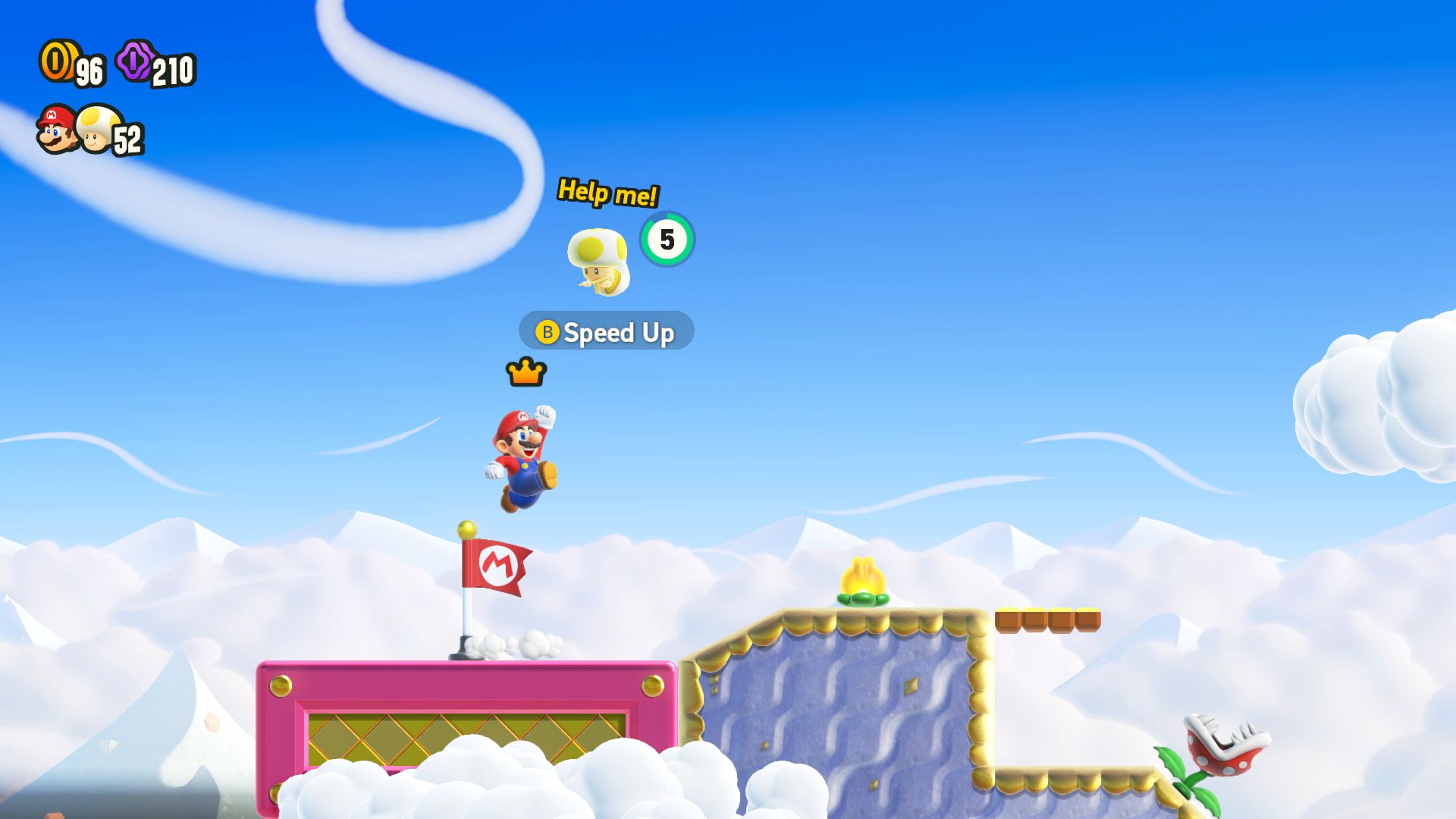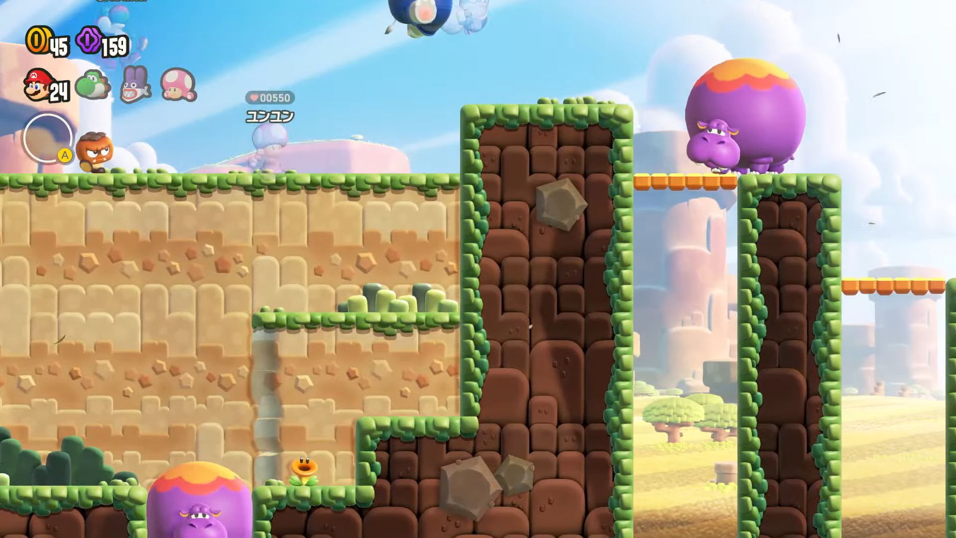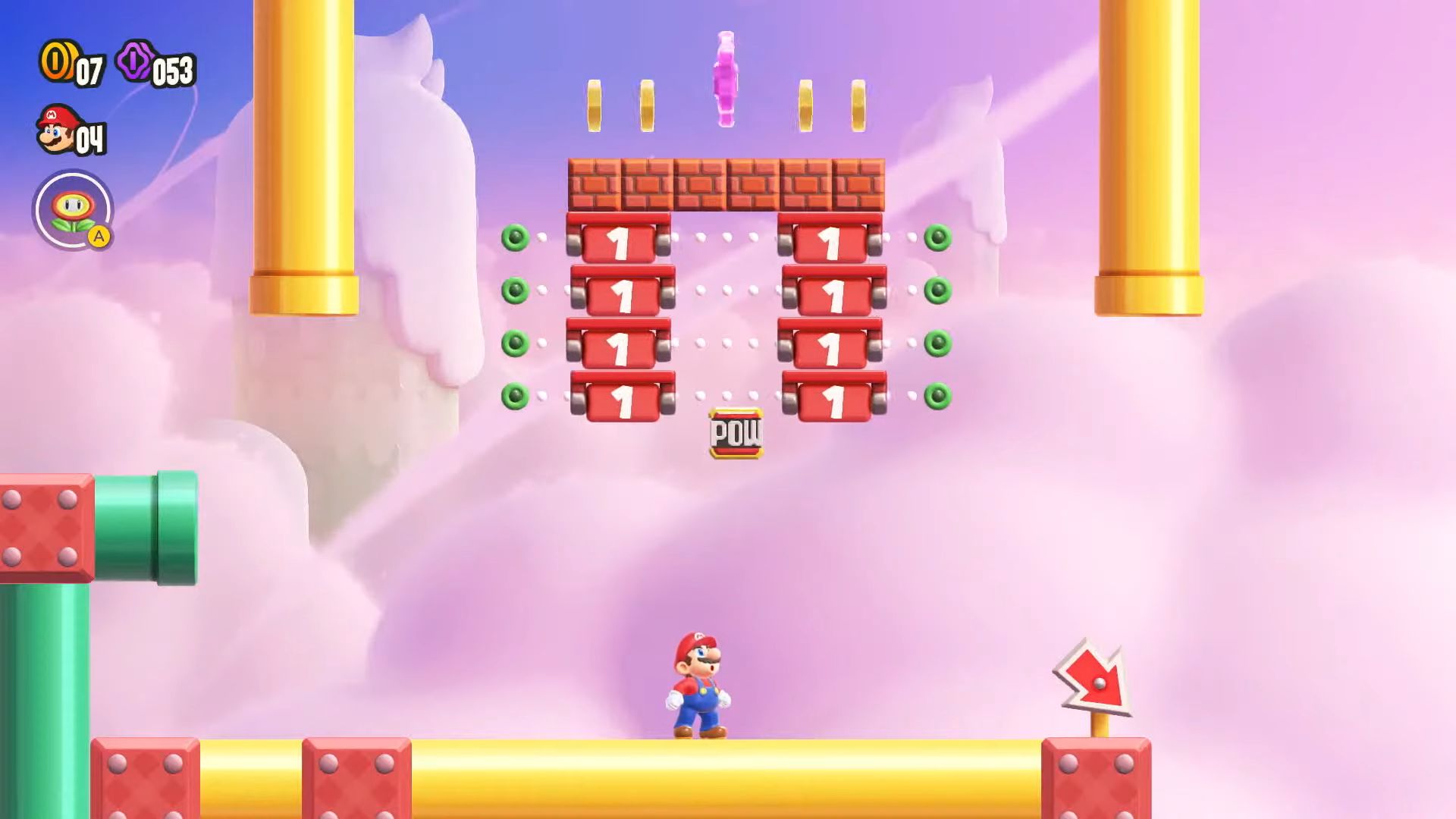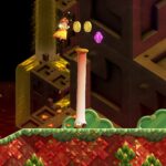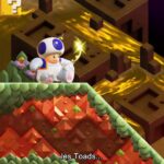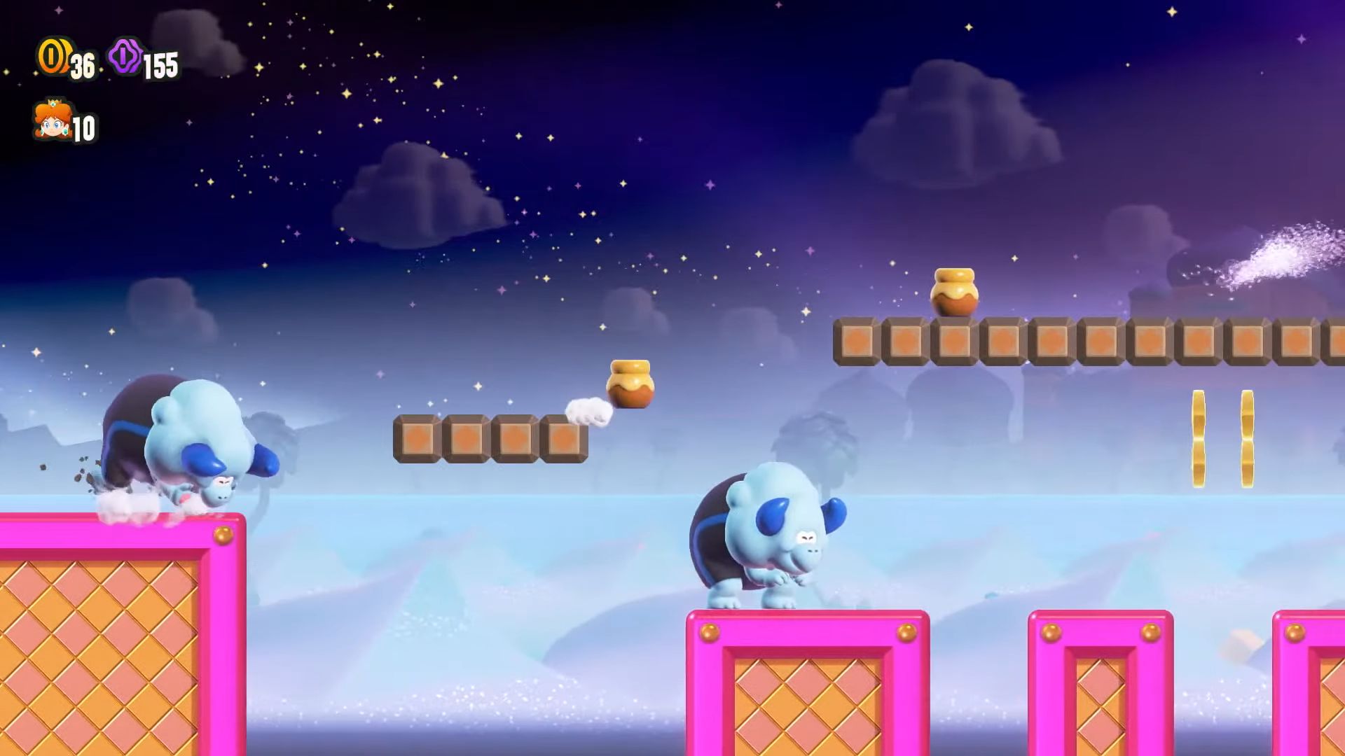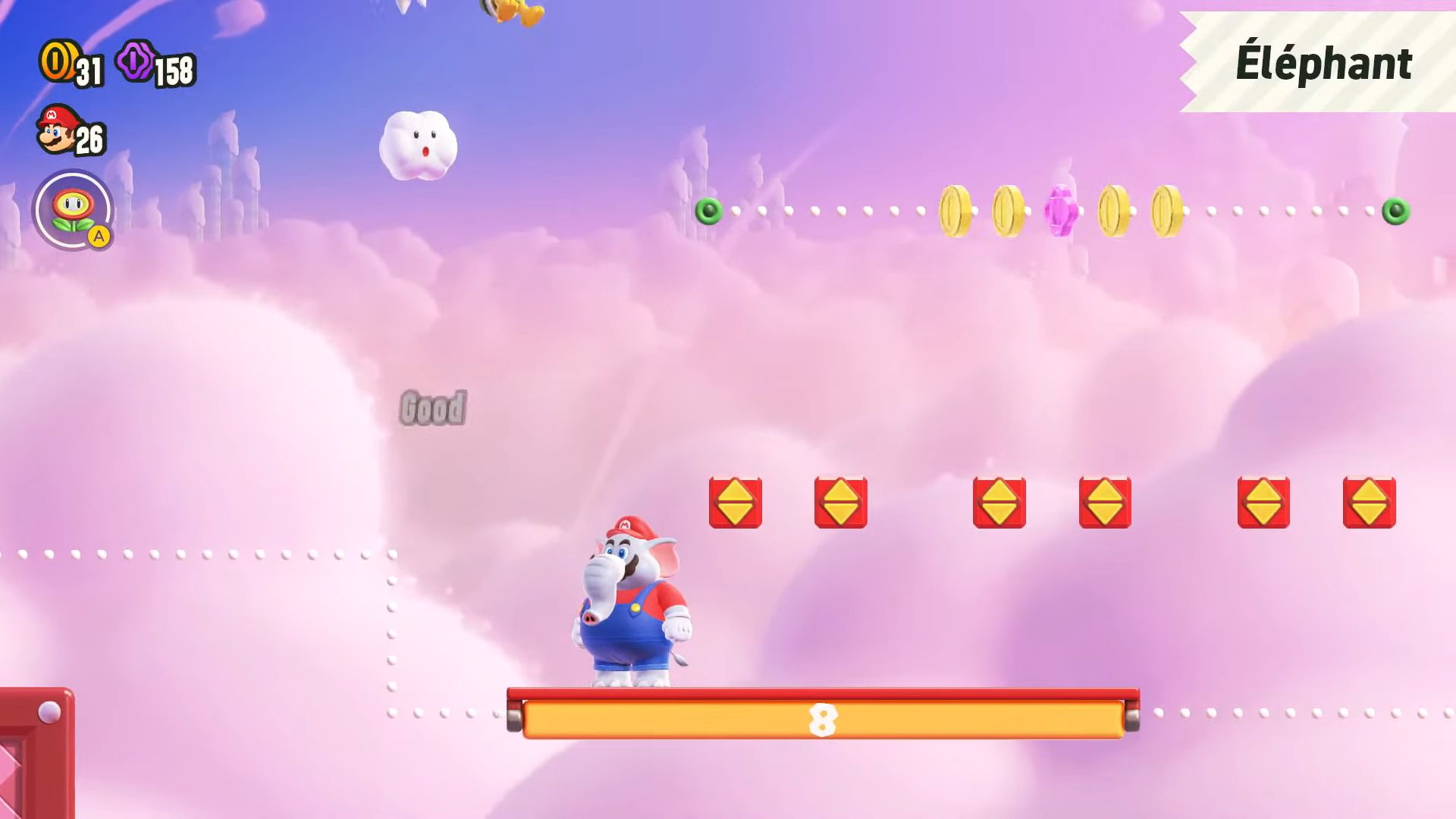 Certains prodiges peuvent même transformer notre personnage. Mario peut alors devenir un Goomba, une boule à pics, ou encore gonfler comme un ballon. Pour que le stage revienne à la normale, il suffira de mettre la main sur une graine prodige. Les graines prodiges sont aussi nécessaires pour déverrouiller certains stages. Un Poplin nous offrira également une graine prodige lorsque l’on atteindra l’arrivée d’un stage.