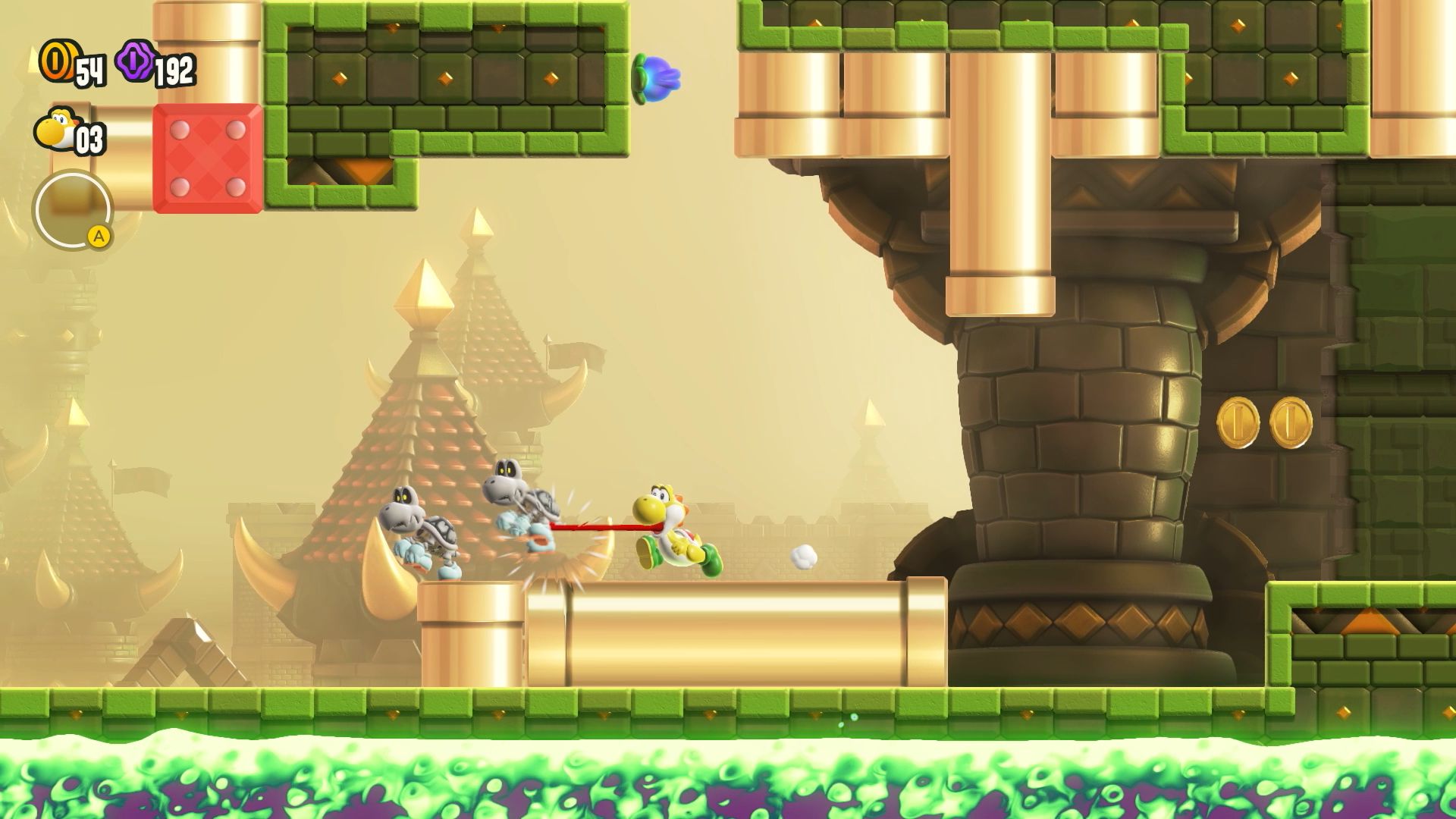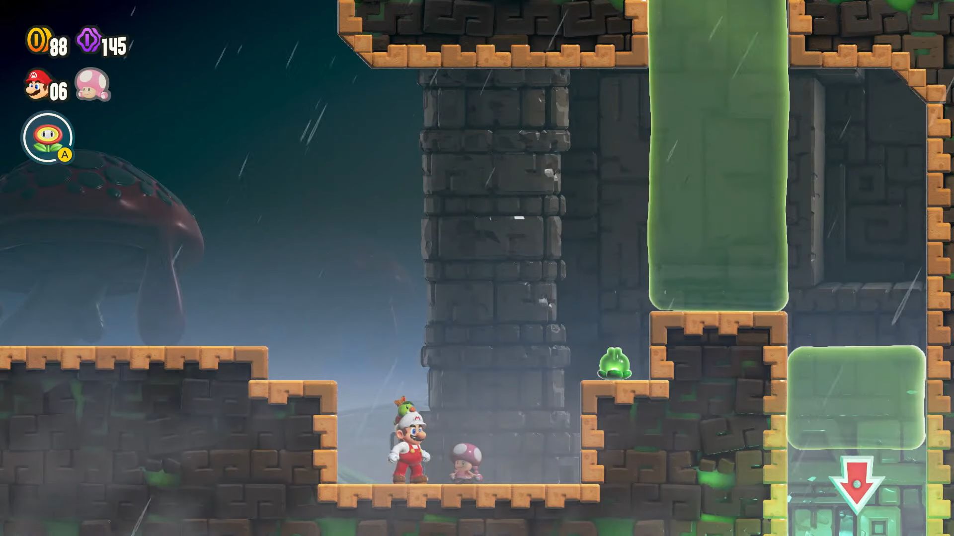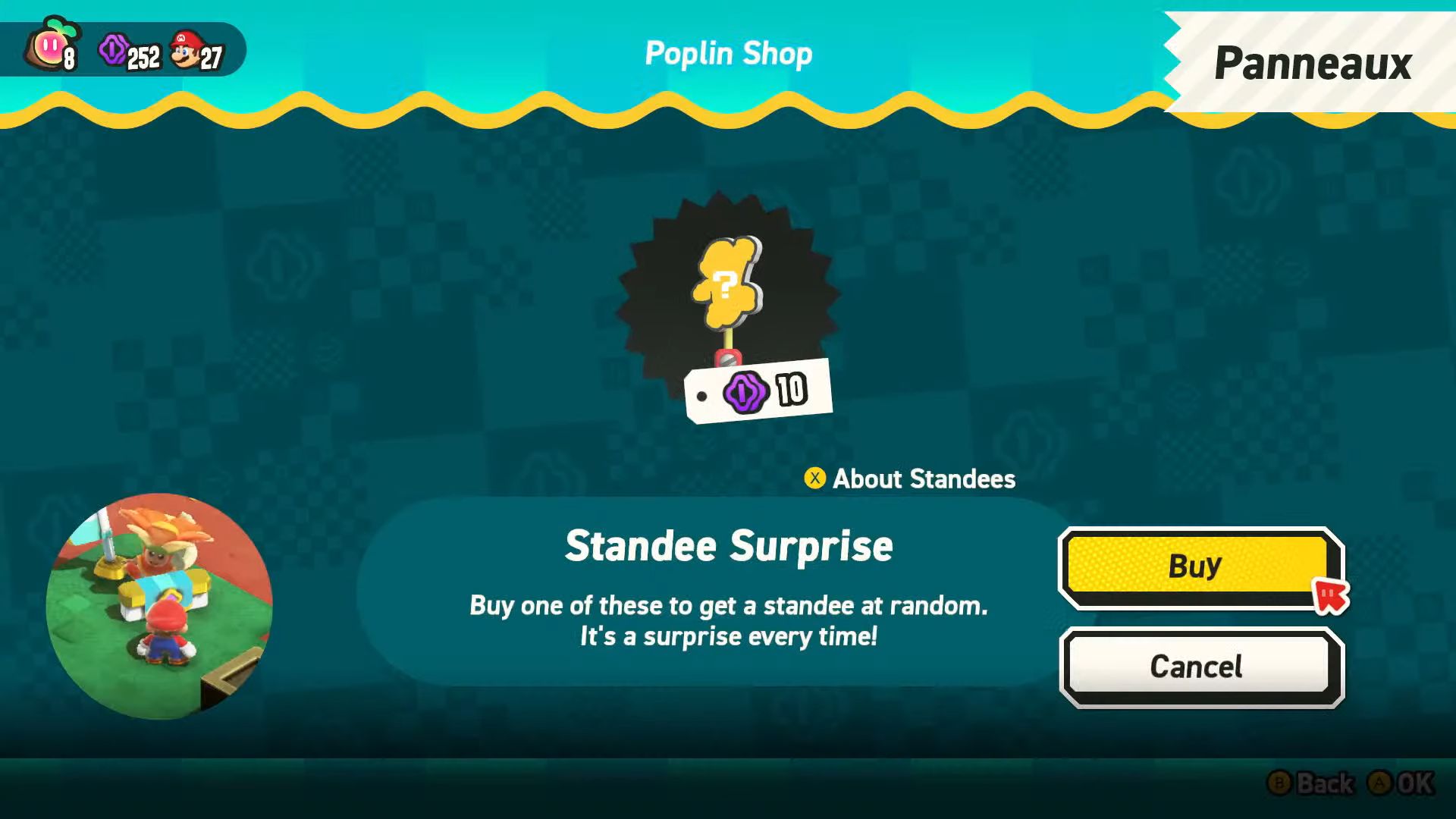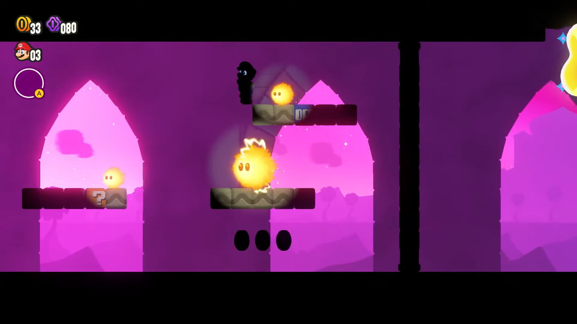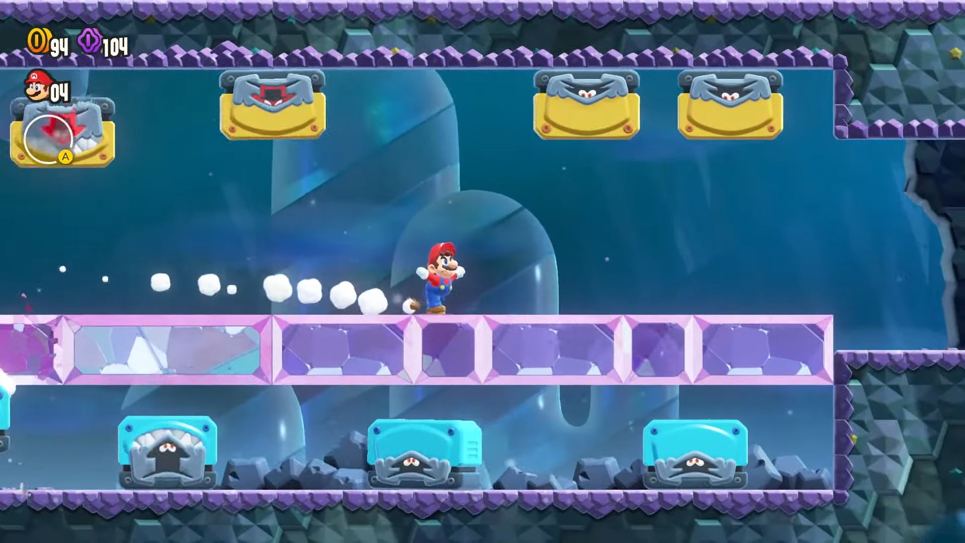 Certains prodiges peuvent même transformer notre personnage. Mario peut alors devenir un Goomba, une boule à pics, ou encore gonfler comme un ballon. Pour que le stage revienne à la normale, il suffira de mettre la main sur une graine prodige. Les graines prodiges sont aussi nécessaires pour déverrouiller certains stages. Un Poplin nous offrira également une graine prodige lorsque l’on atteindra l’arrivée d’un stage.