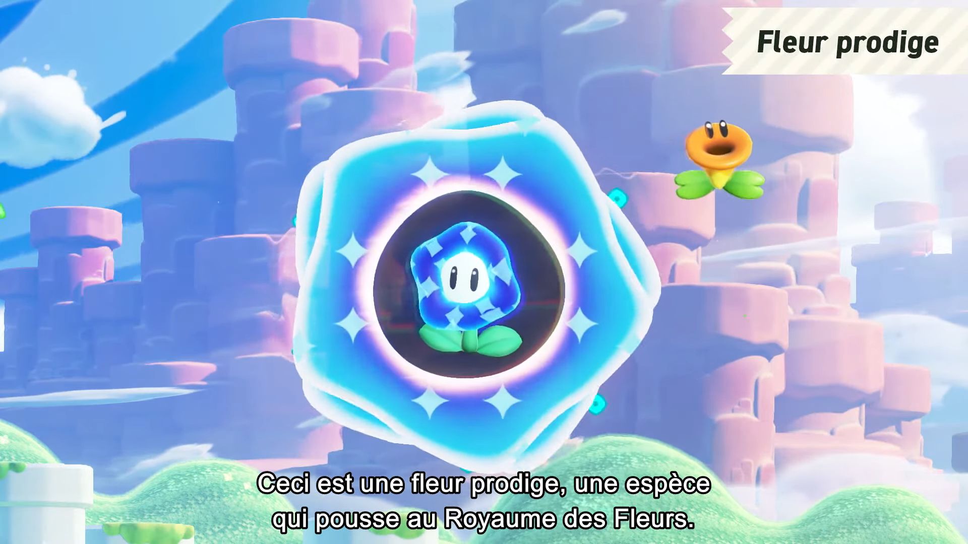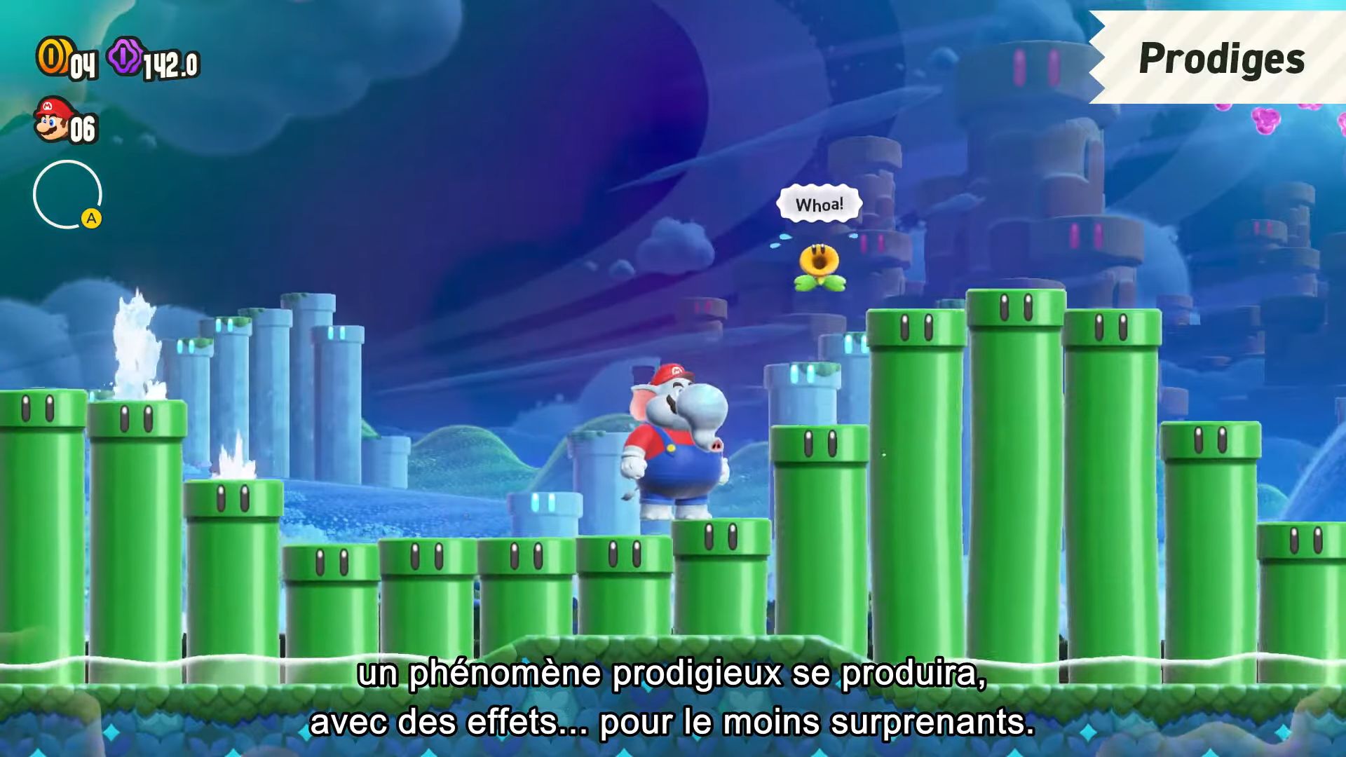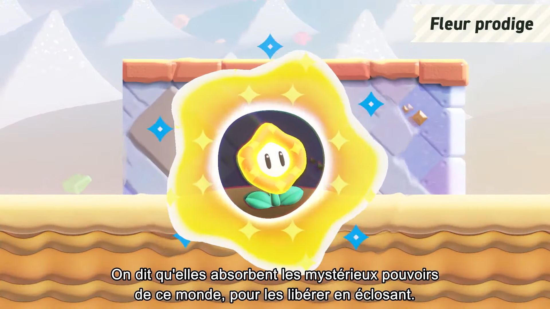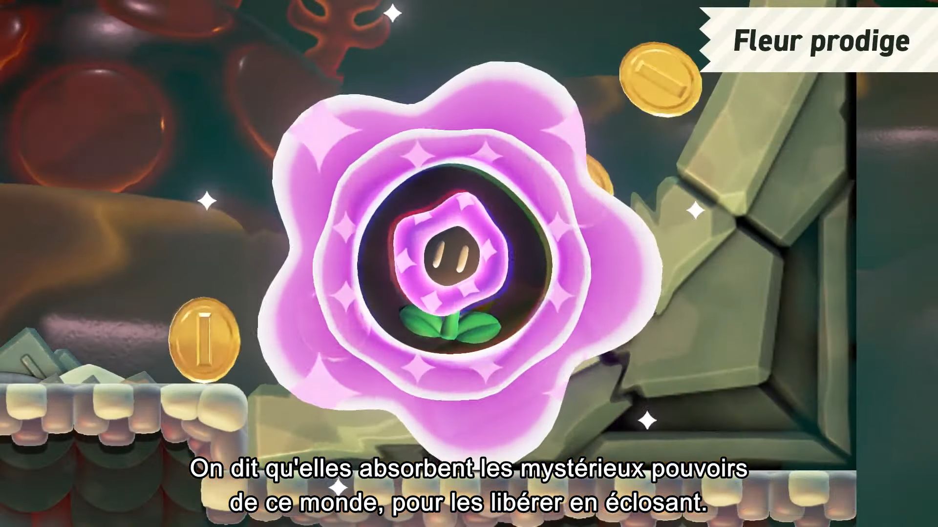 Dans Super Mario Bros. Wonder, on trouve des fleurs prodiges, une espèce qui pousse au Royaume des Fleurs. On raconte qu’elles absorbent les mystérieux pouvoirs de ce monde, pour les libérer en éclosant. C’est ce pouvoir que Bowser cherche à s’accaparer. Chaque fois que l’on touche une fleur prodige, un phénomène prodigieux se produira, avec des effets surprenants. Des tuyaux peuvent s’animer, une nuée d’ennemis peut débouler sans prévenir, le sol peut se mettre à pencher, on peut se retrouver en chute libre, des bulles peuvent envahir l’écran, la perspective d’un stage peut changer radicalement et on peut même se retrouver dans l’espace.