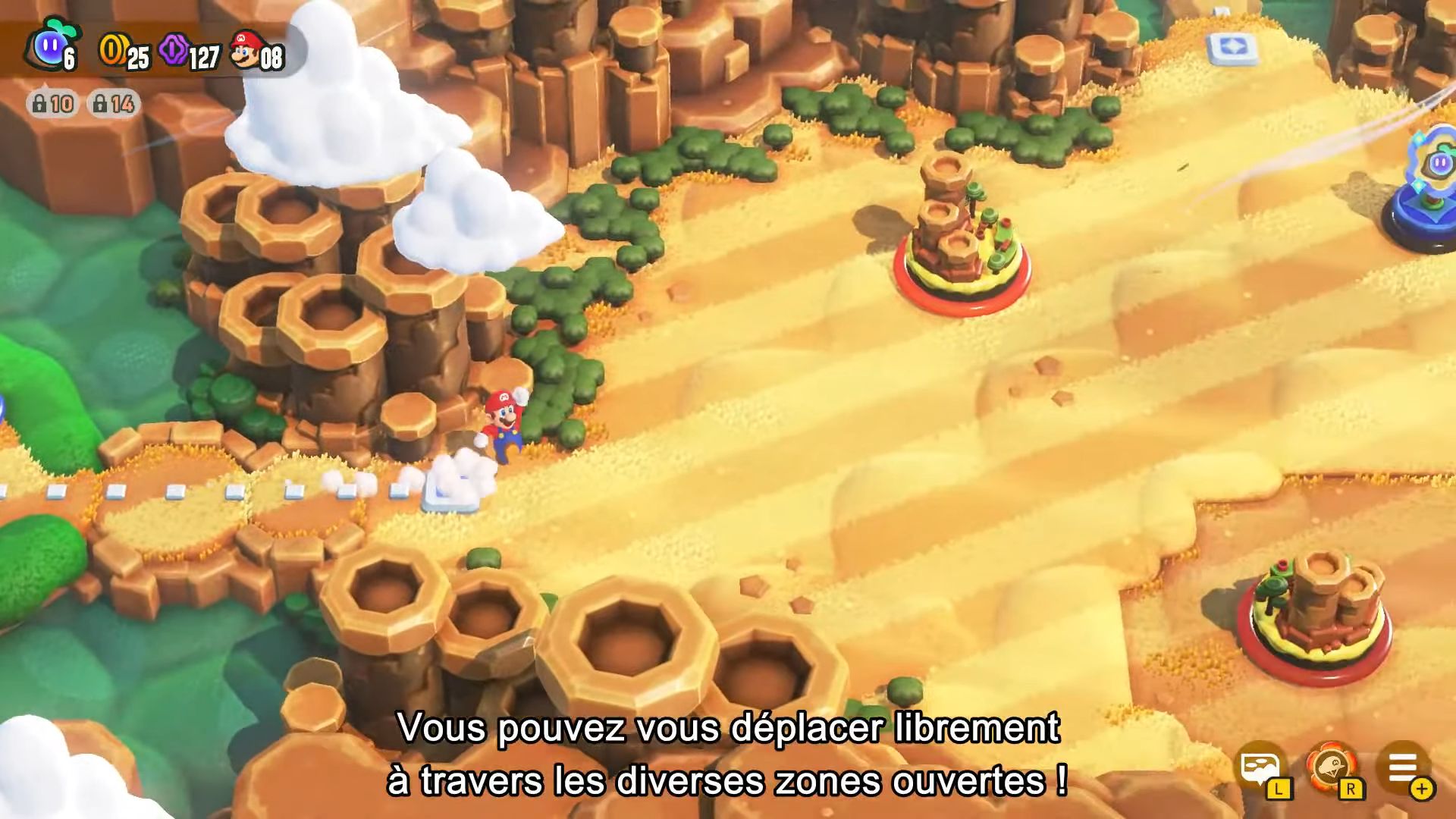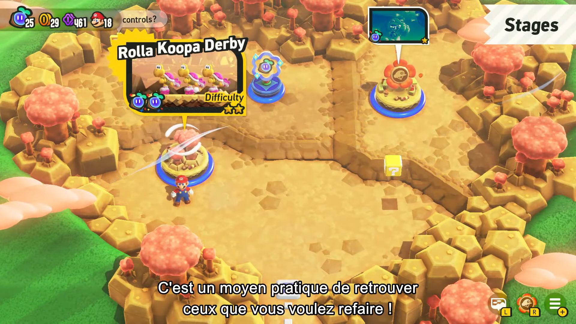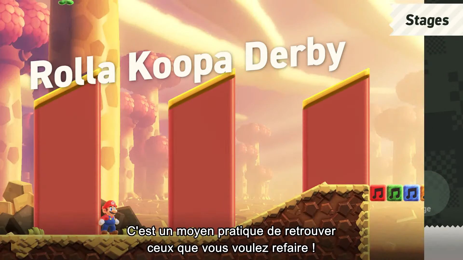 On nous promet une grande variété de stages dans chaque monde. Il sera possible de se déplacer sur la carte pour sélectionner un stage. De plus, on pourra se mouvoir librement à travers les diverses zones ouvertes. Si l’on ne se sent pas d’attaque pour un stage en particulier, on pourra toujours en choisir un autre, ce qui permettra de les faire dans l’ordre que l’on veut. Une fois un stage lancé, on pourra y revenir rapidement depuis le menu Stages. Au sein des stages, on croisera des fleurs cancan (qui sont d’ailleurs toutes doublées en français !). Elles pourront nous donner parfois des indices sur des éléments que l’on peut trouver dans les différents stages.
