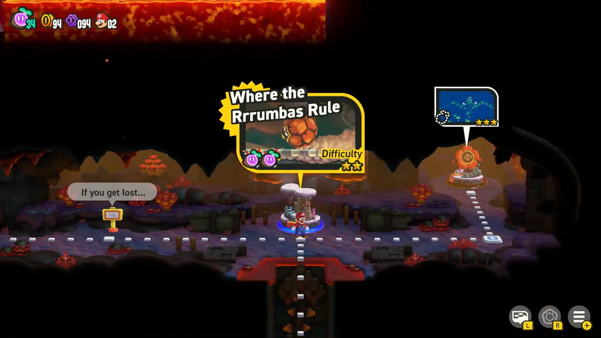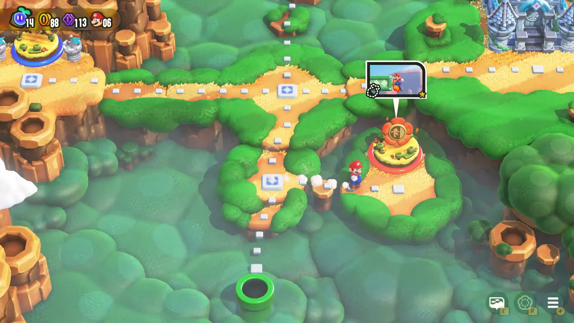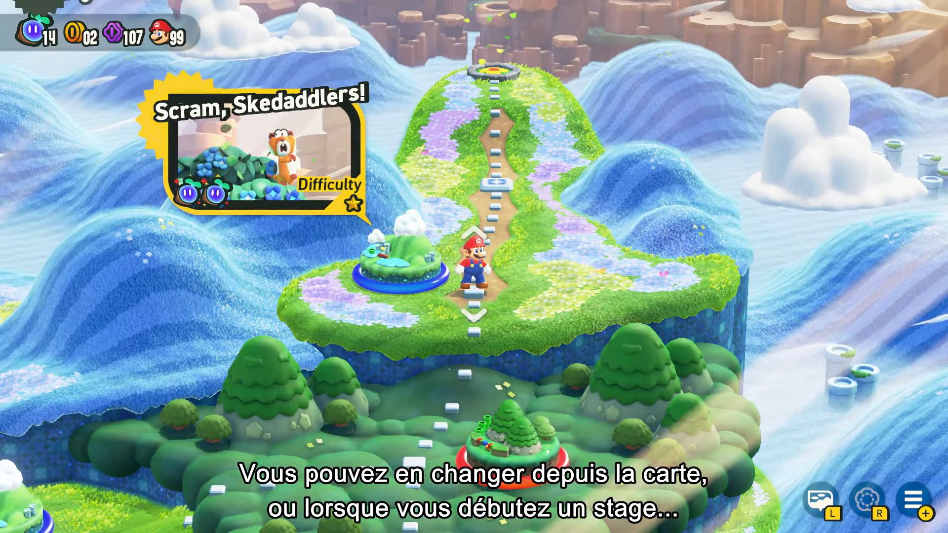 On nous promet une grande variété de stages dans chaque monde. Il sera possible de se déplacer sur la carte pour sélectionner un stage. De plus, on pourra se mouvoir librement à travers les diverses zones ouvertes. Si l’on ne se sent pas d’attaque pour un stage en particulier, on pourra toujours en choisir un autre, ce qui permettra de les faire dans l’ordre que l’on veut. Une fois un stage lancé, on pourra y revenir rapidement depuis le menu Stages. Au sein des stages, on croisera des fleurs cancan (qui sont d’ailleurs toutes doublées en français !). Elles pourront nous donner parfois des indices sur des éléments que l’on peut trouver dans les différents stages.