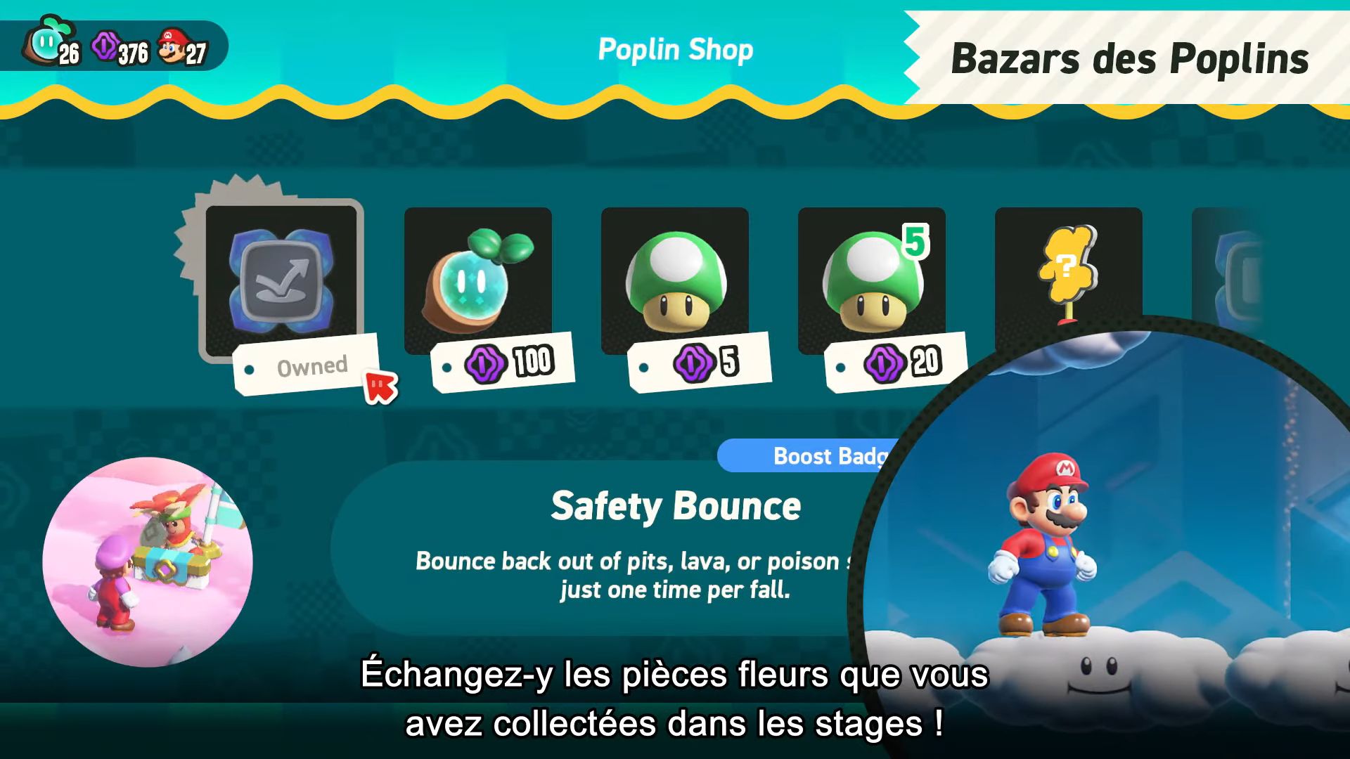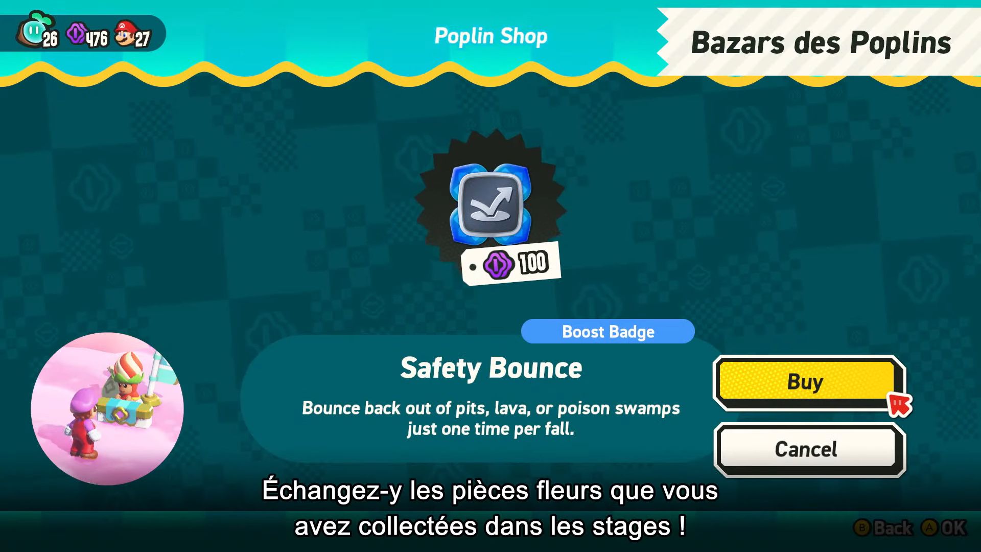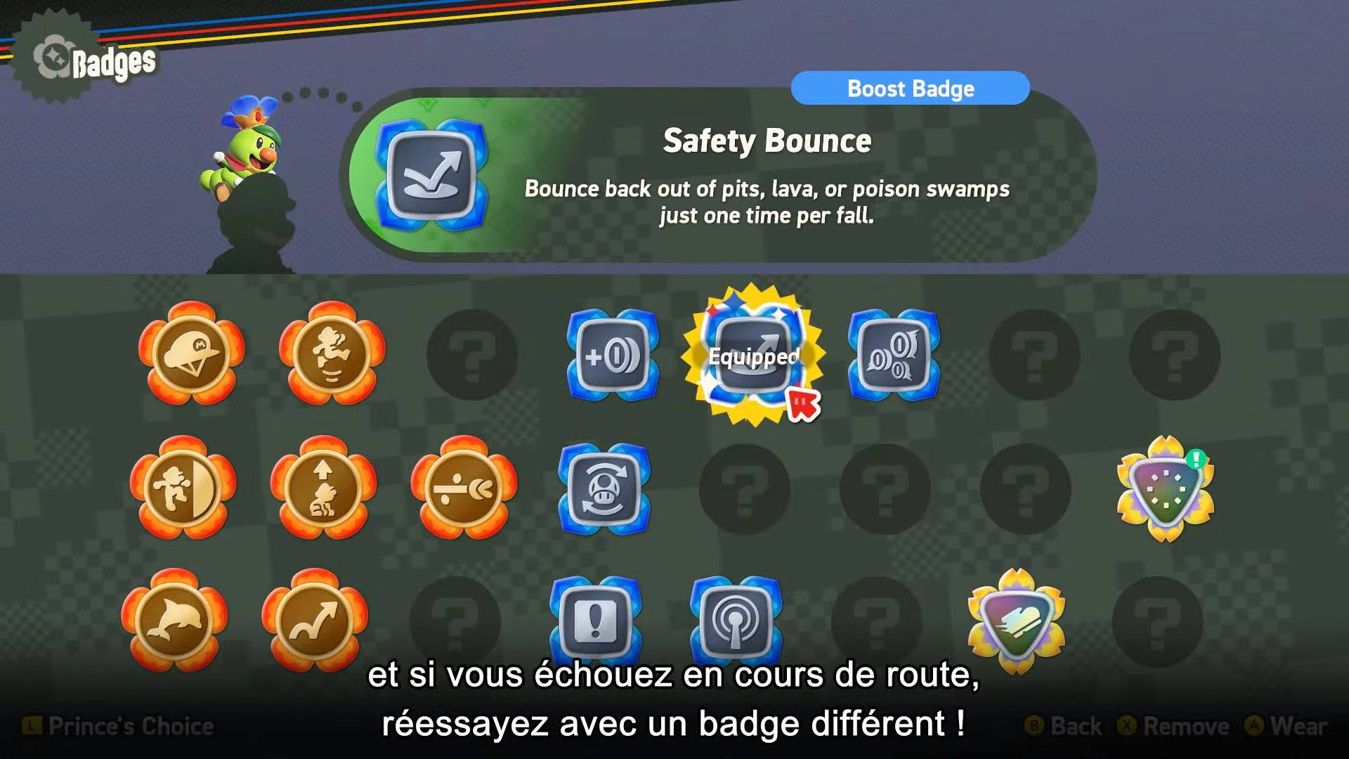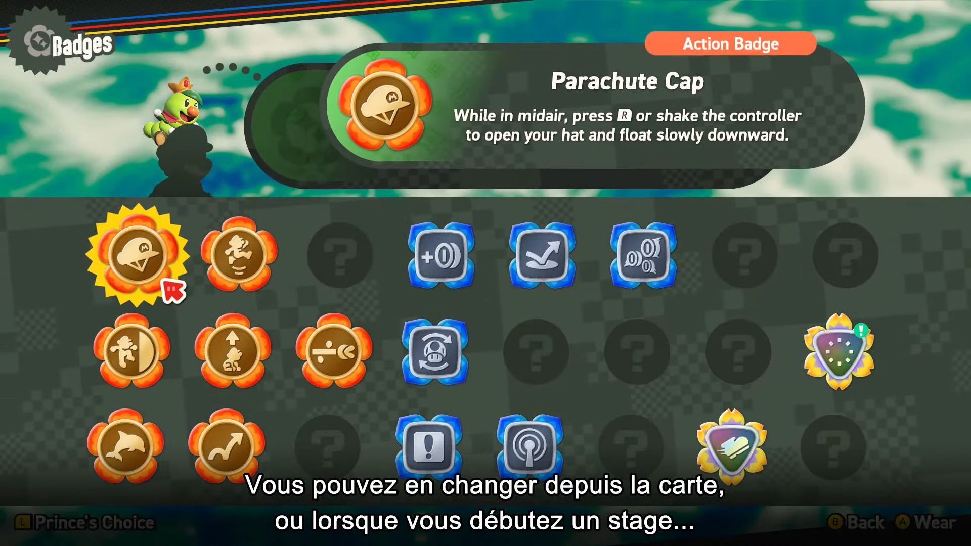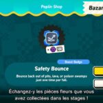 On ne pourra porter qu’un seul badge par stage. Il sera possible d’en changer depuis la carte, ou lorsque l’on débute un stage, et si l’on échoue en cours de route, on pourra réessayer avec un badge différent. Certains stages s’obtiennent en relevant des défis spéciaux dans les stages « défis badge » et d’autres peuvent être achetés dans les bazars des Poplins sur la carte. On pourra échanger les pièces fleurs récoltées dans les stages contre des badges.