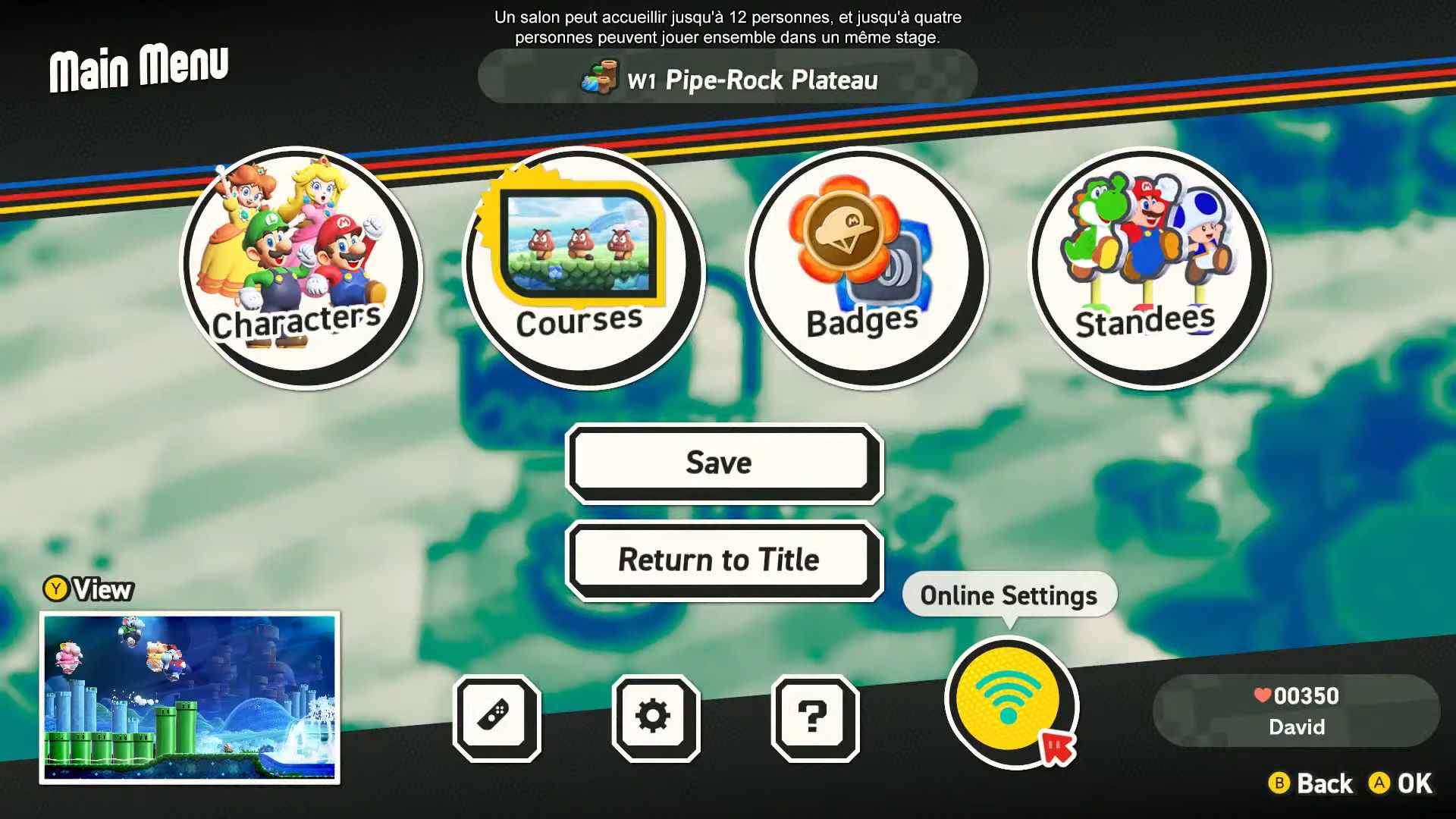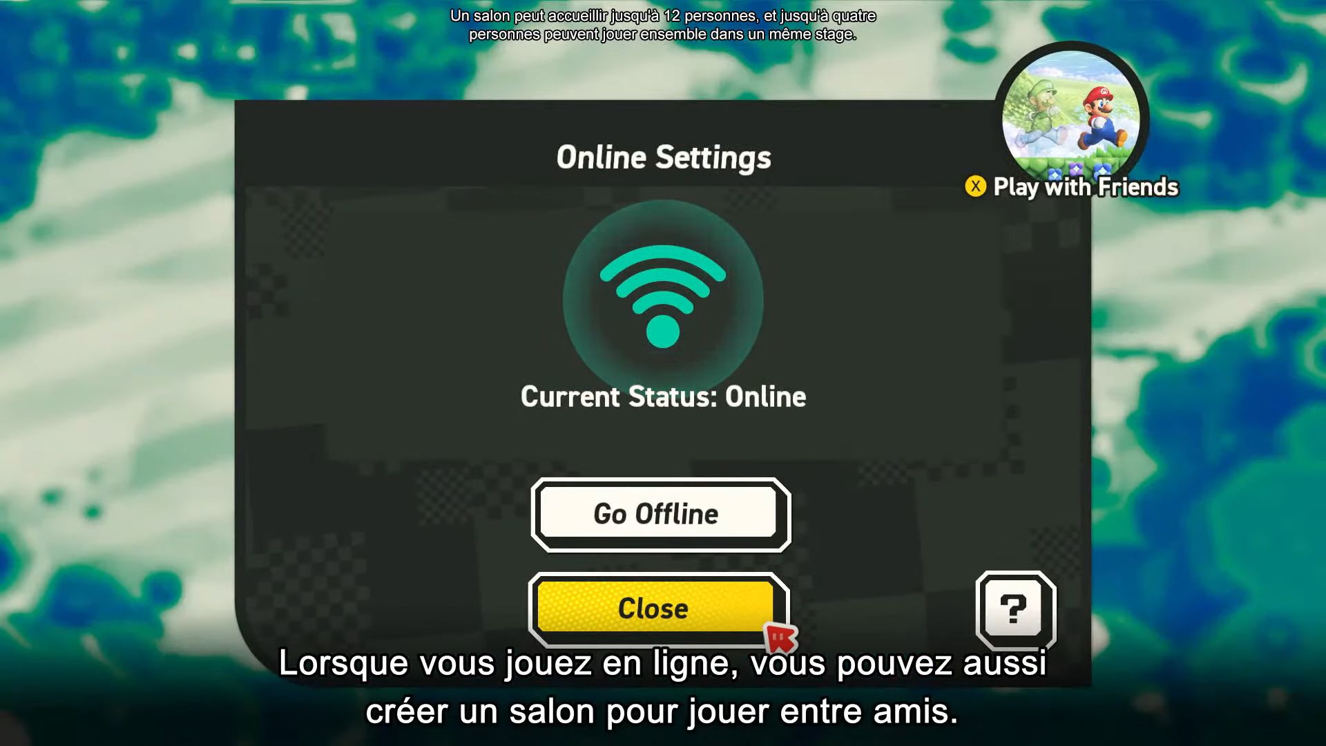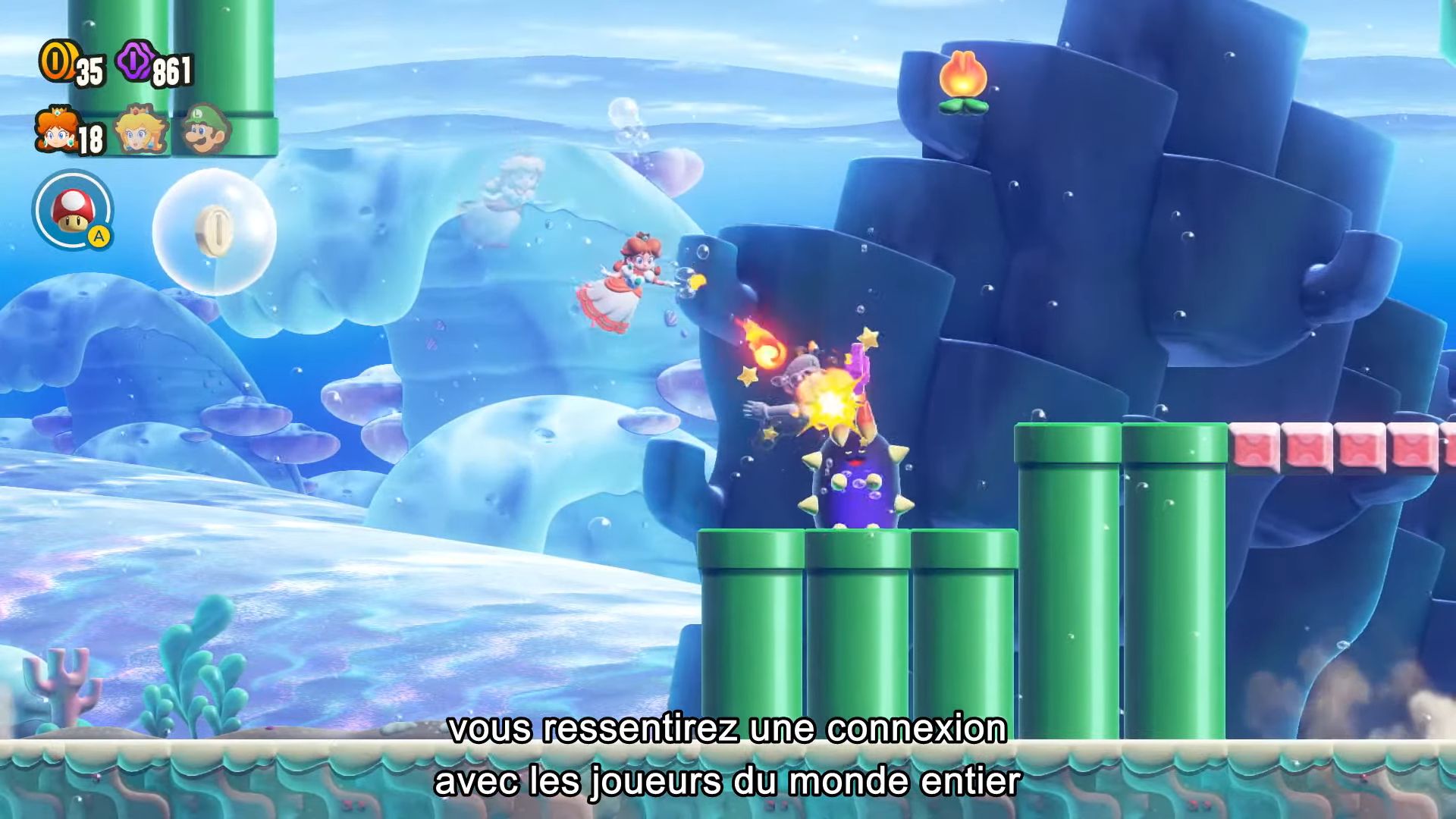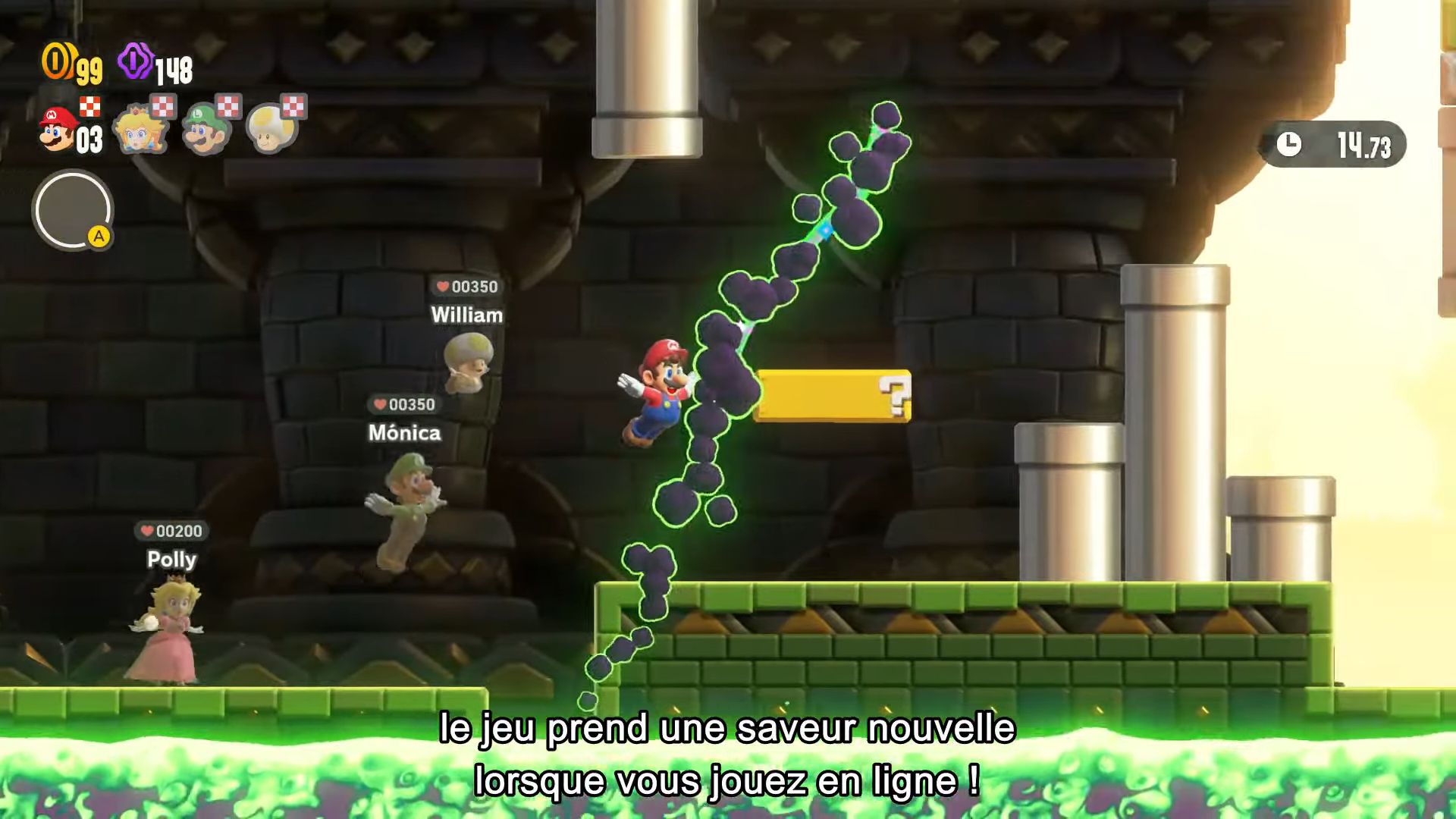 Super Mario Bros. Wonder embarquera des fonctionnalités en ligne. En se connectant à Internet, on pourra voir d’autres joueurs sur la carte ainsi que dans les stages. Il s’agit de personnes à travers le monde qui jouent en même temps que nous et qui apparaissent sous forme d’ombres live. Tout comme en coop locale, si l’on perd en cours de jeu, on pourra revenir en touchant l’ombre live d’un autre joueur. Il sera possible de se saluer et de s’échanger des objets spéciaux.