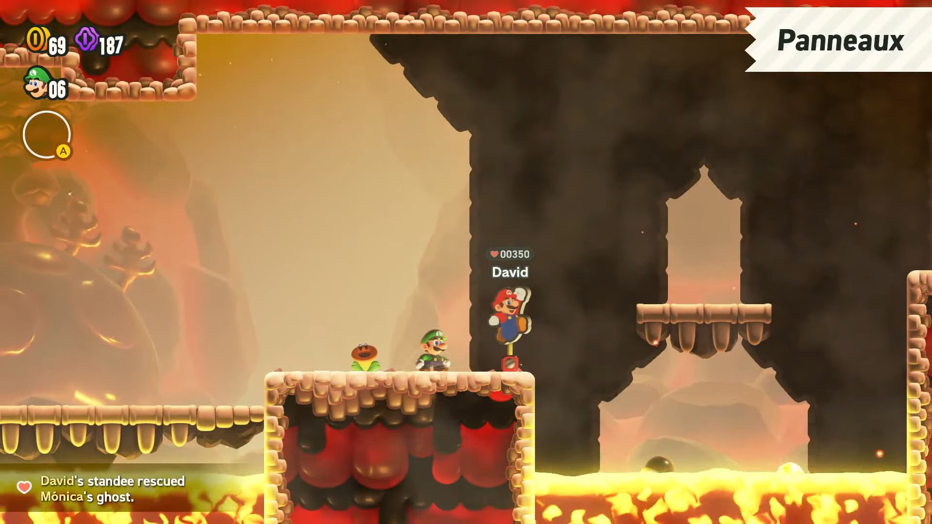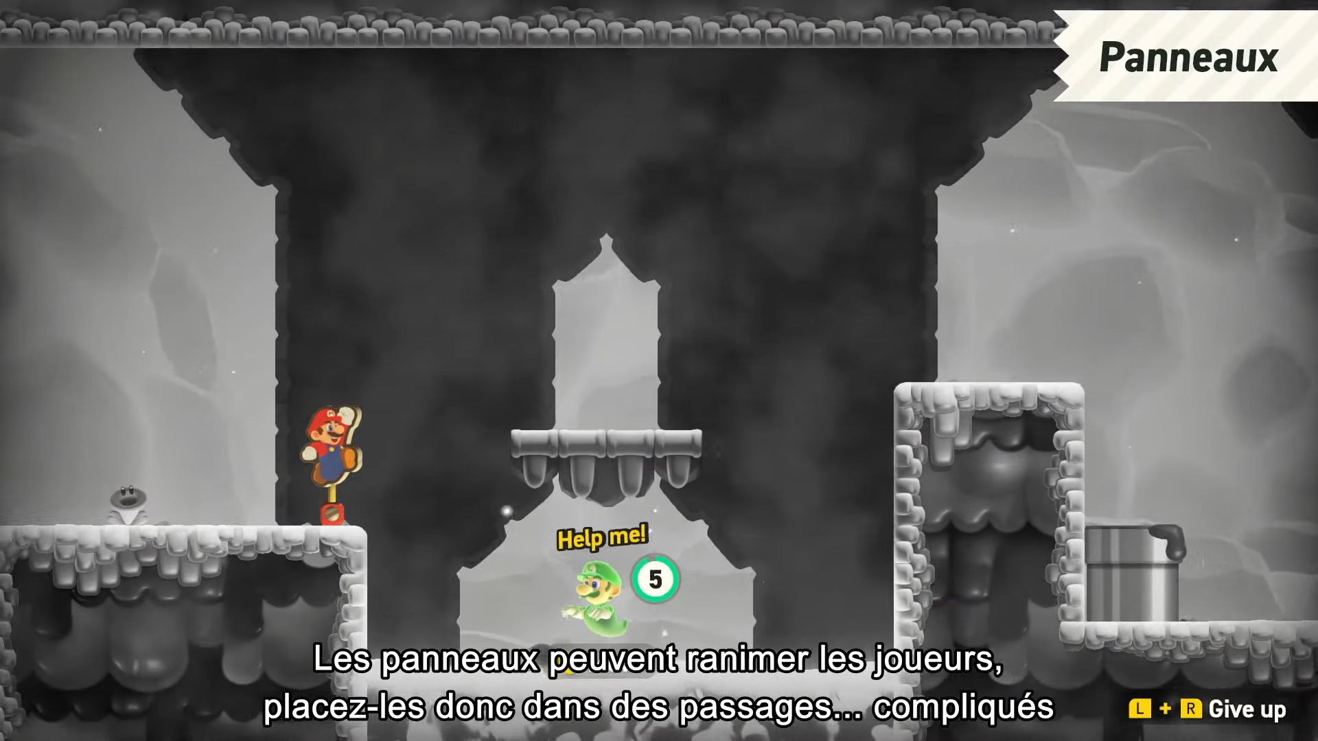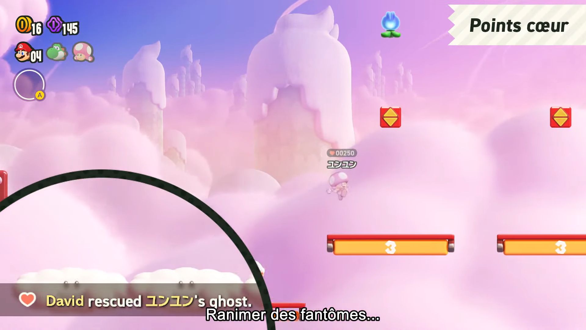 On pourra aussi placer un panneau dans un stage. Les panneaux peuvent ranimer les joueurs, il faudra donc les placer si possible dans des passages compliqués pour aider un maximum de personnes. Il sera possible d’acheter des panneaux-surprises aux bazars des Poplins pour agrandir notre collection. Lorsque l’on entre en contact avec un autre joueur ou avec son panneau, on pourra voir son nom d’utilisateur et ses points cœur. Ces points indiquent à quel point ils ont aidé les autres dans leurs aventures. Ranimer des fantômes, offrir des objets spéciaux ou encore atteindre le drapeau de fin ensemble sont quelques moyens d’obtenir des points cœur.