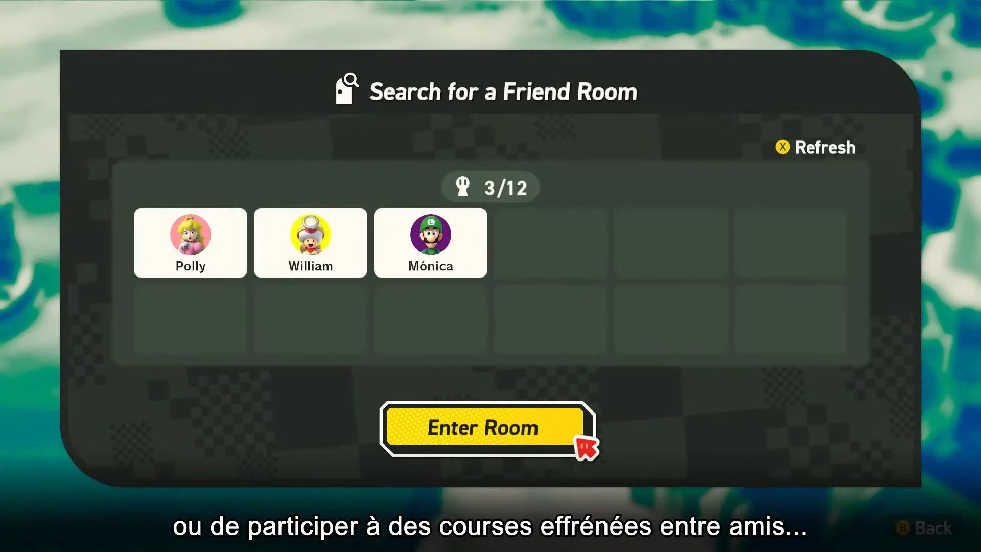 Lorsque l’on joue en ligne, on pourra aussi créer un salon pour jouer entre amis. Depuis un salon, on pourra voir dans quels stages nos amis se trouvent, démarrer un stage ensemble et même faire la course dans certains stages. Il sera possible de lancer une course en frappant un bloc de course. Atteindre le drapeau n’est cependant pas le seul moyen de terminer une course. Dans certains stages, il faudra mettre la main sur une graine prodige ou encore vaincre un boss.