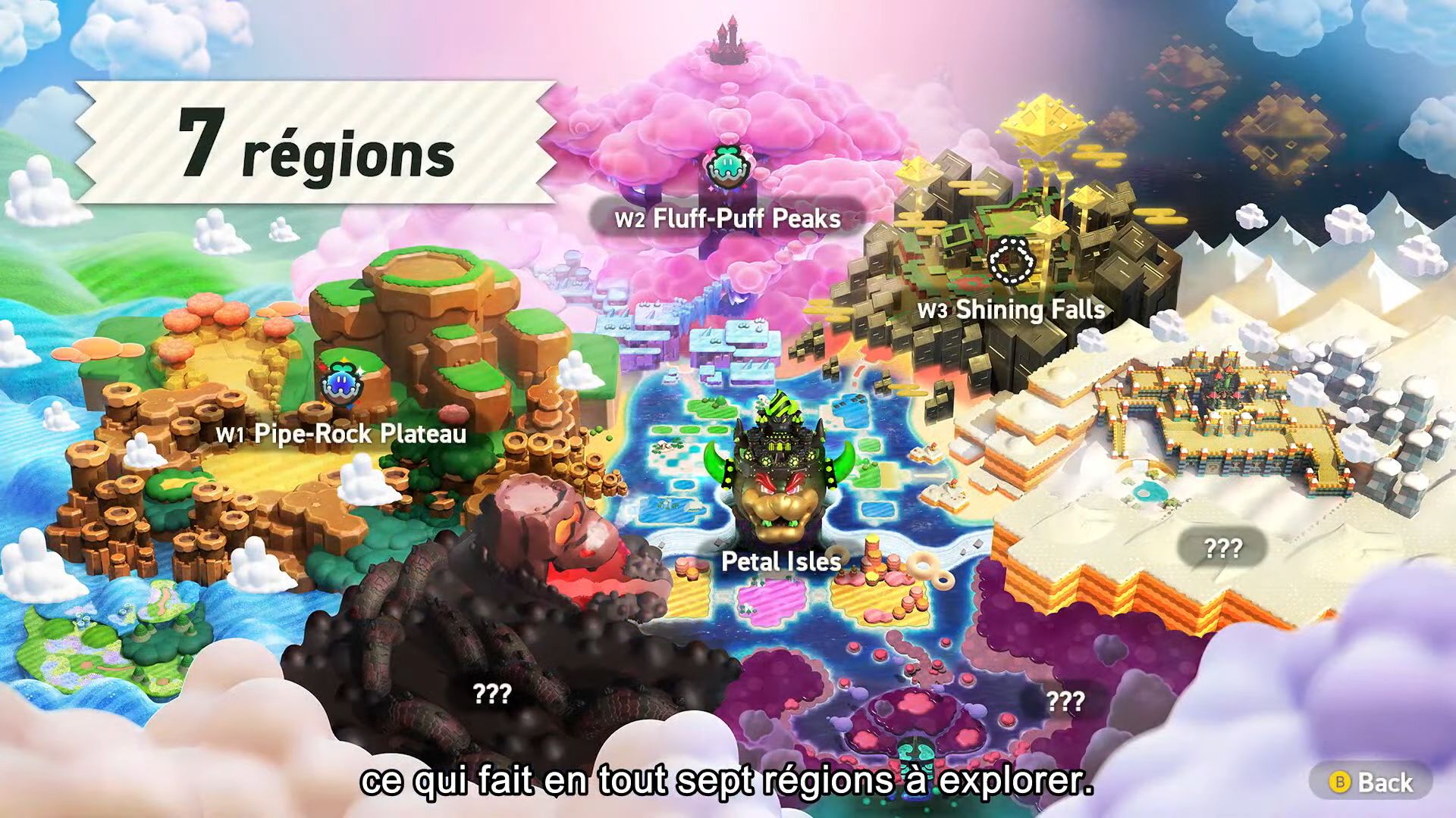 Le Royaume des Fleurs est constitué de six mondes situés autour des Îles florales, ce qui fait au total sept régions à explorer. L’aventure débute dans la Plaine des tuyaux. Une fois que l’on aura passé le pied gelé de la montagne, on pourra partir à la conquête du Mont nébuleux. Il y aura aussi les Chutes dorées, une région chatoyante avec de nombreux défis, mais aussi des fonds marins, des grottes, un désert aride, une étrange forêt où poussent des champignons géants ou encore des terres ardentes où s’écoulent des torrents de lave sur d’autres Îles florales.