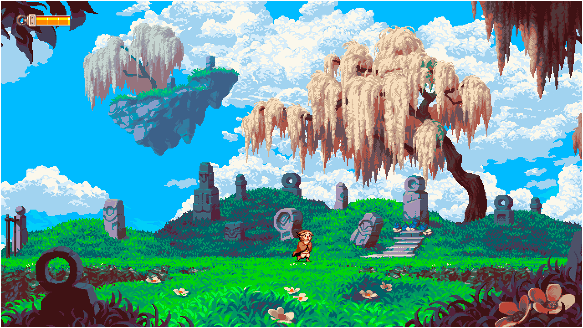 Pépite visuelle s’il en est, le titre de D-Pad Studio est une claque de tous les instants. Doté d’un pixel-art d’un niveau cosmique, les amoureux du genre seront aux anges, n’hésitant jamais à s’arrêter bouche bée devant des décors sublimes. Même les plus allergiques ne pourront que se courber devant le travail titanesque abattu, à défaut d’apprécier comme il se doit ce bijou de créativité. Animé de la plus belle des manières, chaque personnage, monstre ou machinerie dégage une unicité comme rarement le joueur en a déjà vu. Une qualité exacerbée par le mode portable de la Switch, qui rend les graphismes plus fins et agréables qu’ils ne le sont déjà. On en viendrait presque à se sentir coupable de traverser en un éclair chaque écran, tant la production est à des années-lumière au-dessus de la concurrence. En effet, Owlboy ne demandera que très rarement – pour ne pas dire jamais – au joueur de revisiter les lieux déjà explorés.