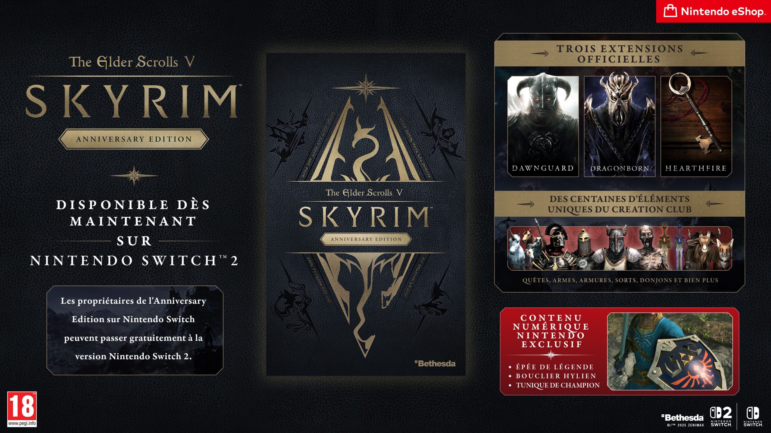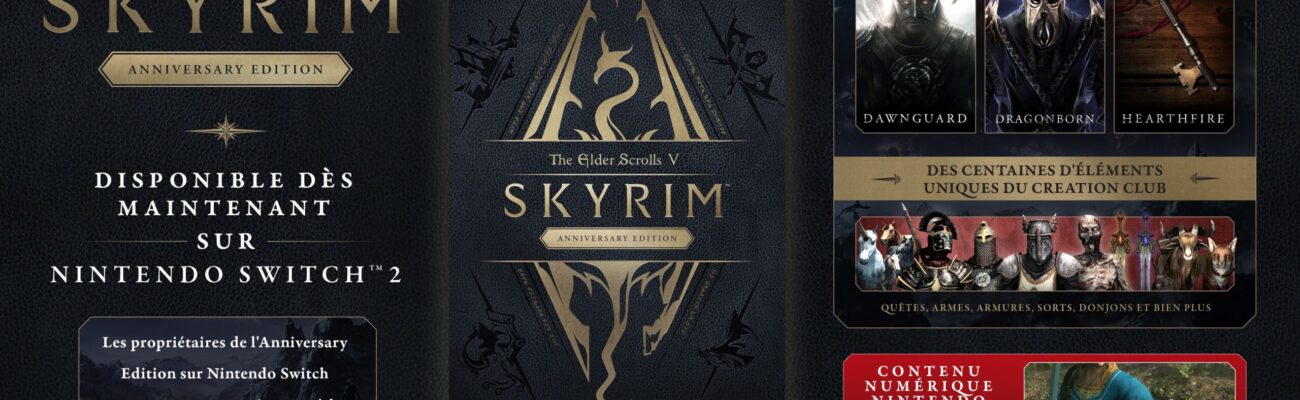 Surprise, sans annonce au préalable, The Elder Scrolls V : Skyrim Anniversary Edition est sorti ce 9 décembre 2025 sur l’eShop Nintendo Switch 2 pour 59,99 €. Les personnes qui possédaient déjà le jeu de base sur Switch peuvent se procurer la mise à niveau The Elder Scrolls V : Skyrim Anniversary à 19,99 €, sortie à l’origine le 29 septembre 2022 (le jeu de base étant disponible depuis le 17 septembre 2017) et ajoutant des quêtes, des donjons, des boss, des armes, des sorts et d’autres contenus. Elle permettra ainsi d’accéder à la version Nintendo Switch 2 de The Elder Scrolls V : Skyrim Anniversary Edition. Celles et ceux qui possédaient déjà la mise à niveau ou qui avaient acheté le pack Anniversary Edition à 59,99 € ont accès gratuitement à la version Nintendo Switch 2. Le fonctionnement est différent de celui d’une version Nintendo Switch 2 Edition. En effet, pour accéder à la version Nintendo Switch 2, les personnes qui possèdent la mise à niveau ou le pack doivent avoir le jeu installé sur la console Switch 2, puis lancer le titre, appuyer sur le bouton Y pour accéder au contenu de l’eShop et suivre les instructions pour télécharger The Elder Scrolls V : Skyrim Anniversary Edition sur Switch 2 depuis la boutique en ligne. Cela fonctionne aussi si l’on possède le jeu de base ou l’édition physique sur Switch, le jeu proposera alors d’acheter la mise à niveau. Le titre sera installé sous la forme d’une nouvelle application sur la console. L’espace nécessaire total pour le téléchargement de The Elder Scrolls V : Skyrim Anniversary Edition seul sur Switch 2 est de 53,1 Go. Une version physique complète exclusivement sur Switch 2 n’a pas été annoncée.