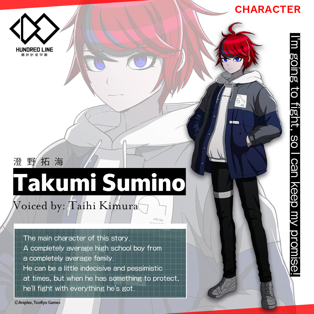 The Hundred Line -Last Defense Academy- est le projet « Extreme x Despair » de Too Kyo Games. Le protagoniste, Takumi Sumino, est décrit comme un adolescent comme les autres qui réside dans le complexe résidentiel de Tokyo, un endroit où tous les jours se ressemblent et où jamais rien ne se passe. Mais un jour, tout change : des monstres terrifiants débarquent et sèment le chaos en ville. De plus, une étrange créature du nom de Sirei fait son apparition et offre à Takumi le pouvoir de protéger tout ce qui lui est cher. Cependant, pour cela, il doit se poignarder en plein cœur…