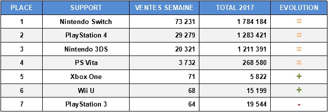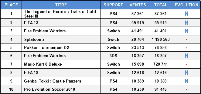 Fire Emblem Warriors débarque dans ce dernier top software japonais Media Create, et force est de constater que les chiffres déçoivent quelque peu, compte tenu de la popularité de la série et de la Switch. Avec 41 491 ventes sur Switch et 18 357 sur New 3DS, le titre fait moins bien en cumulé qu’Hyrule Warriors en son temps sur Wii U (69 090 ventes). L’impressionnant stock de Switch écoulé (73 231 exemplaires) n’aura donc pas profité qu’au titre de Koei Tecmo, mais également aux précédent gros titres de la console, qui observent tous un boost de ventes, Splatoon 2 en tête. L’autre grosse sortie de la semaine, c’est The Legend of Heroes : Trails of Cold Steel III sur PS4, qui prend la tête du classement avec 87 261 ventes. Un résultat quasiment divisé par deux par rapport au précédent, justifié par une sortie limité à une seule console, là où Trails of Cold Steel II avait bénéficié d’une sortie sur PS3 et Vita.