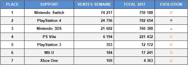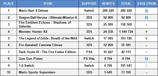 Grosse sortie pour la Switch dans ce dernier top japonais cette fois fourni par Famitsu, la Golden Week retardant la publication de Media Create. Mario Kart 8 Deluxe prend donc la première place du classement avec 280 229 ventes, soit le 4e meilleur démarrage pour la série au Japon. Un score très encourangeant compte tenu du parc installé de consoles pour le moment fort restreint. Et comme pour les précédentes moutures, nul doute que le jeu se vendra sur la durée. En deuxième position, Dragon Ball Heroes : Ultimate Mission X réussit à faire un poil mieux que son prédecesseur sorti en février 2013 : 92 809 ventes contre 90 119 pour le premier. Côté hardware, Nintendo a réussi à fournir près de deux fois plus de Switch que les semaines précédentes pour la sortie de Mario Kart 8 Deluxe, soit un total de 74 217 machines écoulées. En-dessous, la PS4 repasse devant la 3DS avec 24 756 ventes contre 21 602 pour la portable de Nintendo.