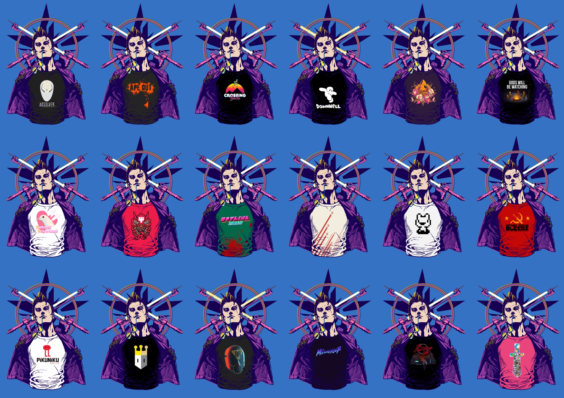 Grasshopper Manufacture a également dévoilé la liste de tous les t-shirts créés en collaboration avec Devolver Digital et plusieurs jeux indépendants édités par la société (la collaboration avec Hotline Miami était déjà connue, et n’oubliez pas qu’il y aura des t-shirts en collaboration avec d’autres sociétés, dont Heart Machine pour Hyper Light Drifter, Motion Twin pour Dead Cells et Cosmoscope pour Morphies Law) :