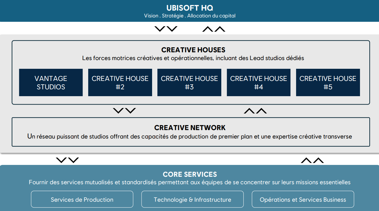 Ensuite, Ubisoft a tenu à détailler son nouveau modèle opérationnel structuré autour de cinq Creative Houses. Elles sont soutenues par un Creative Network, une plateforme d’expertise partagée fournissant des ressources de développement, par des équipes de Core Services mutualisés, ainsi que par un siège repensé. Il est annoncé que cette nouvelle organisation entrera en fonctionnement début avril. Pour la présenter, l’entreprise a partagé ce visuel :