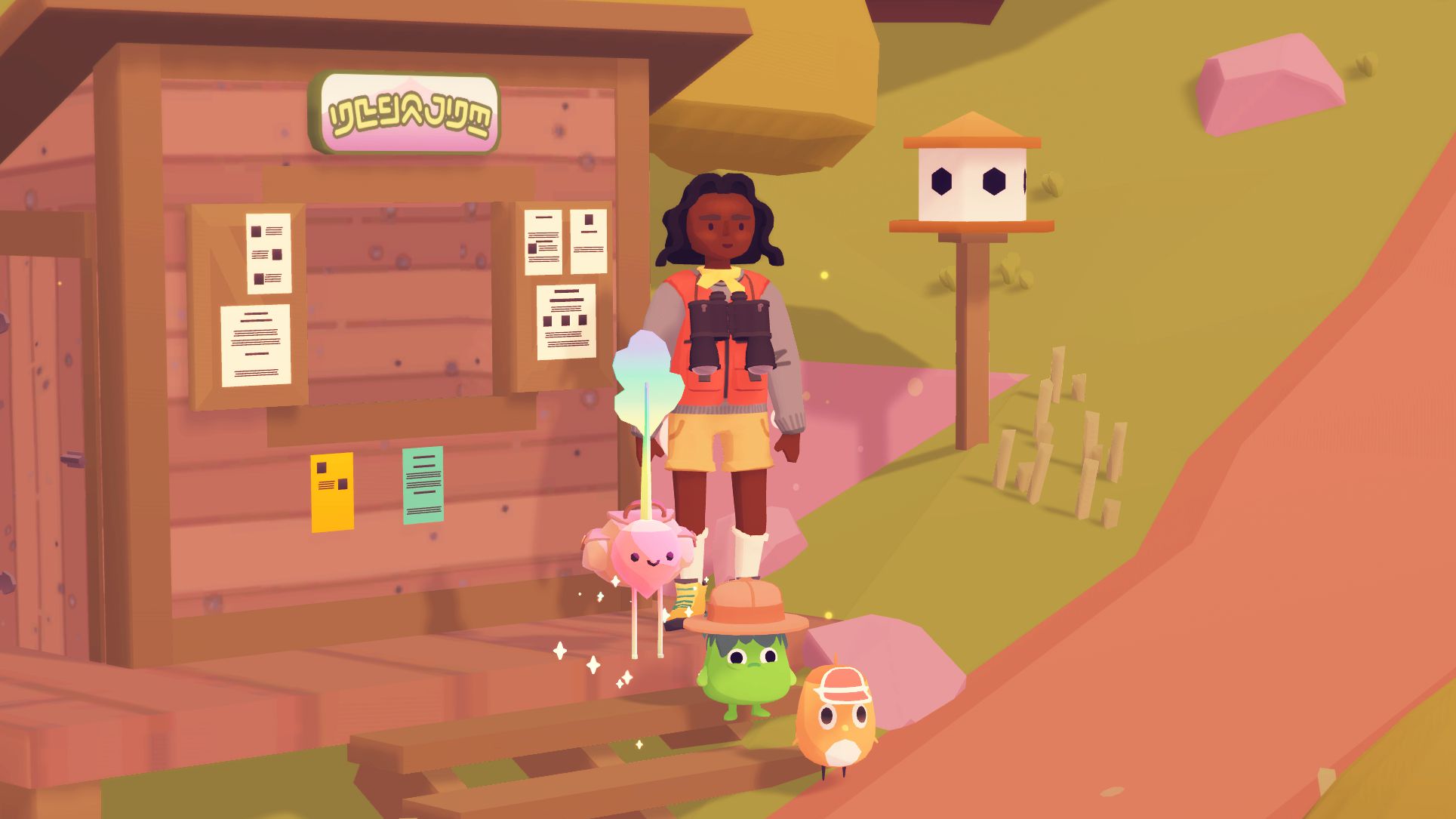 Ooblets est un jeu de collection de créatures et de gestion de ferme, ce qui fait donc forcément penser à un mélange entre les séries Story of Seasons / Bokujo Monogatari et Pokémon, ce qui est d’ailleurs tout à fait intentionnel. L’aventure se déroule à Badgeville, où notre personnage arrive pour rénover une ferme. Dans cette ville étrange, on trouve des ooblets, d’adorables petites créatures que l’on peut faire pousser comme des plantes. Le jeu offre la possibilité de personnaliser à la fois l’avatar et les ooblets avec différentes tenues et toutes sortes d’accessoires. On peut cuisiner des plats, les vendre, visiter la ville, acheter de quoi décorer notre cabane pour la transformer en une belle petite maison avec des meubles et des décorations ou encore offrir des cadeaux aux habitants pour se lier d’amitié avec eux.
