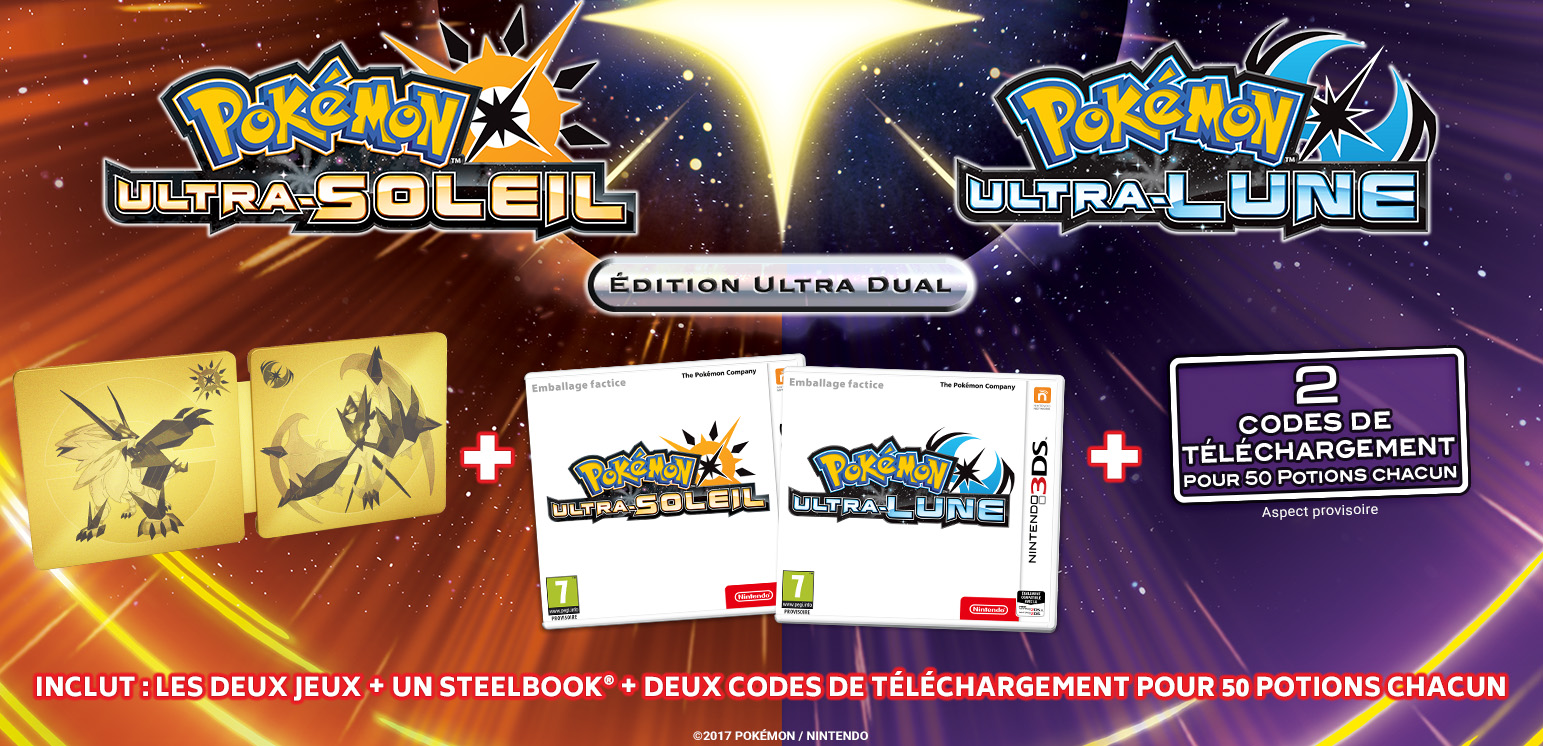 – Pokémon Ultra-Soleil et Pokémon Ultra-Lune – Édition Ultra Dual : une édition spéciale contenant les versions physiques de Pokémon Ultra-Soleil et Pokémon Ultra-Lune, un SteelBook et deux codes de téléchargement de 50 potions chacun.
