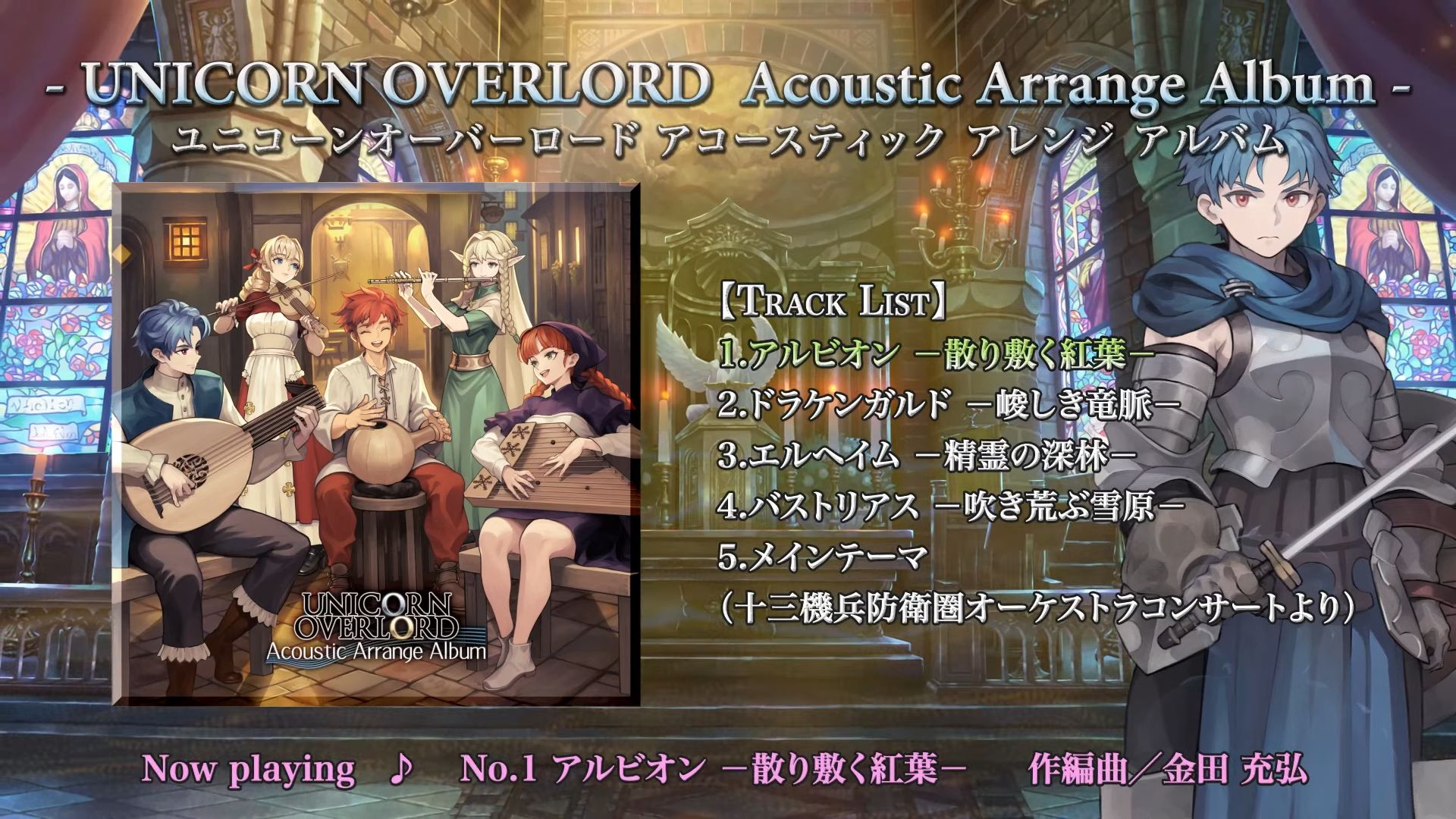Cet album contiendra un total de 8 musiques, dont 6 nouveaux arrangements acoustiques par des membres de Basiscape, sous la direction de Mitsuhiro Kaneda, également directeur musical et compositeur/arrangeur pour le jeu. Les sources sonores de 2 chansons interprétées lors du 13 Sentinels : Aegis Rim Orchestral Concert ReSTART 2024 seront également incluses (d’où le fait que seules les 6 autres pistes sont considérées comme de nouveaux arrangements). L’album est conçu pour faire revivre les aventures d’Unicorn Overlord, de sorte que même les personnes qui n’y auront pas joué puissent imaginer un grand périple à travers des pays et des batailles uniques. La pochette comprendra une illustration de Takafumi Noma. Voici la liste des pistes qui auront droit à un arrangement :