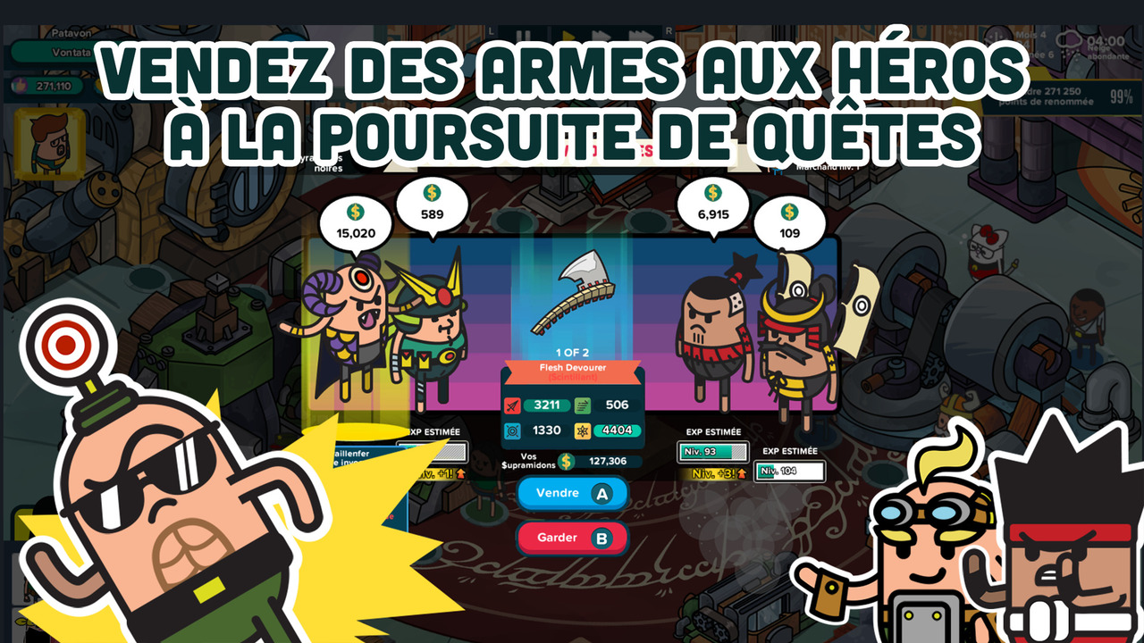 Tout commence lorsque le jeune Patatalata Kartoffel P. Aardappel Papa, alias Patata (ou n’importe quel autre nom qu’on souhaitera lui donner), se voit sollicité par le mystérieux Agent 46 pour reprendre l’atelier de son célèbre grand-père Batata, un légendaire forgeron-patate, aujourd’hui disparu, dont il était l’associé. Enthousiaste à défaut d’être compétent, l’apprenti marchand d’armes va se lancer dans cette nouvelle carrière, même s’il ne dispose apparemment que de 0,01 % du commerce, le reste appartenant à son rusé collaborateur. Il lui faudra dès lors faire preuve d’un minimum de bon sens commercial afin d’éviter la banqueroute et de payer les dividendes régulièrement exigés par l’actionnaire majoritaire de la boutique. Un challenge cependant tout à fait surmontable, car loin de focaliser sur la difficulté, le jeu de Daylight Studios tire d’abord son intérêt de mécaniques simples et addictives, ainsi que d’un univers potache plutôt plaisant. La campagne principale sera notamment l’occasion de croiser une quinzaine de héros légendaires, parodiant des stars du jeu vidéo et de la pop culture comme Luke Skywalker, Kratos ou un surprenant Wolverine façon Rule 63. Mais on pourra également recruter une trentaine de forgerons aux noms tout aussi fleuris, de Laura Craft à Nikola Patatesla, en passant par Batpatate, la patate chauve-souris. L’écriture n’est certes pas un modèle de finesse et de profondeur, néanmoins, les références restent suffisamment amusantes pour nous divertir et casser des routines de gameplay forcément un brin répétitives (c’est le genre qui veut ça).