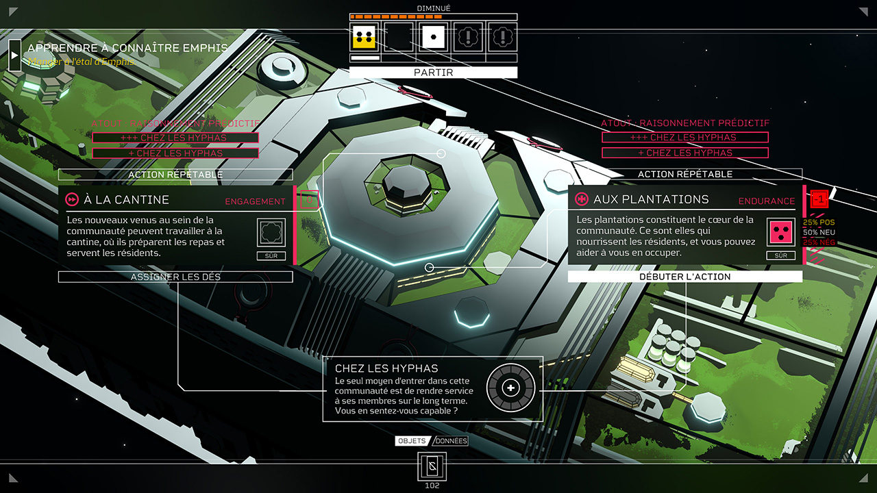C’est là que le stress entre dans la danse, l’une des grandes évolutions du concept par rapport Citizen Sleeper premier du nom, venant complexifier le gameplay en remplaçant les jauges d’endurance et de faim déjà connues. Cette fois, tout échec augmente d’autant une jauge de stress et entraîne par conséquent la détérioration de la valeur des dés, qui possèdent trois points de vie, autre élément inédit de cette suite. Si détérioration il y a, les options à disposition se voient limitées et sont susceptibles de provoquer une suite d’échecs encore plus impactants. Il est évidemment possible de réparer ces dés, mais au lourd prix de ressources, engendrant une spirale de dépendance qui fragilise l’équilibre entre survie, exploration, prise de risque et gestion de ressources, à la tension jamais aussi palpable.