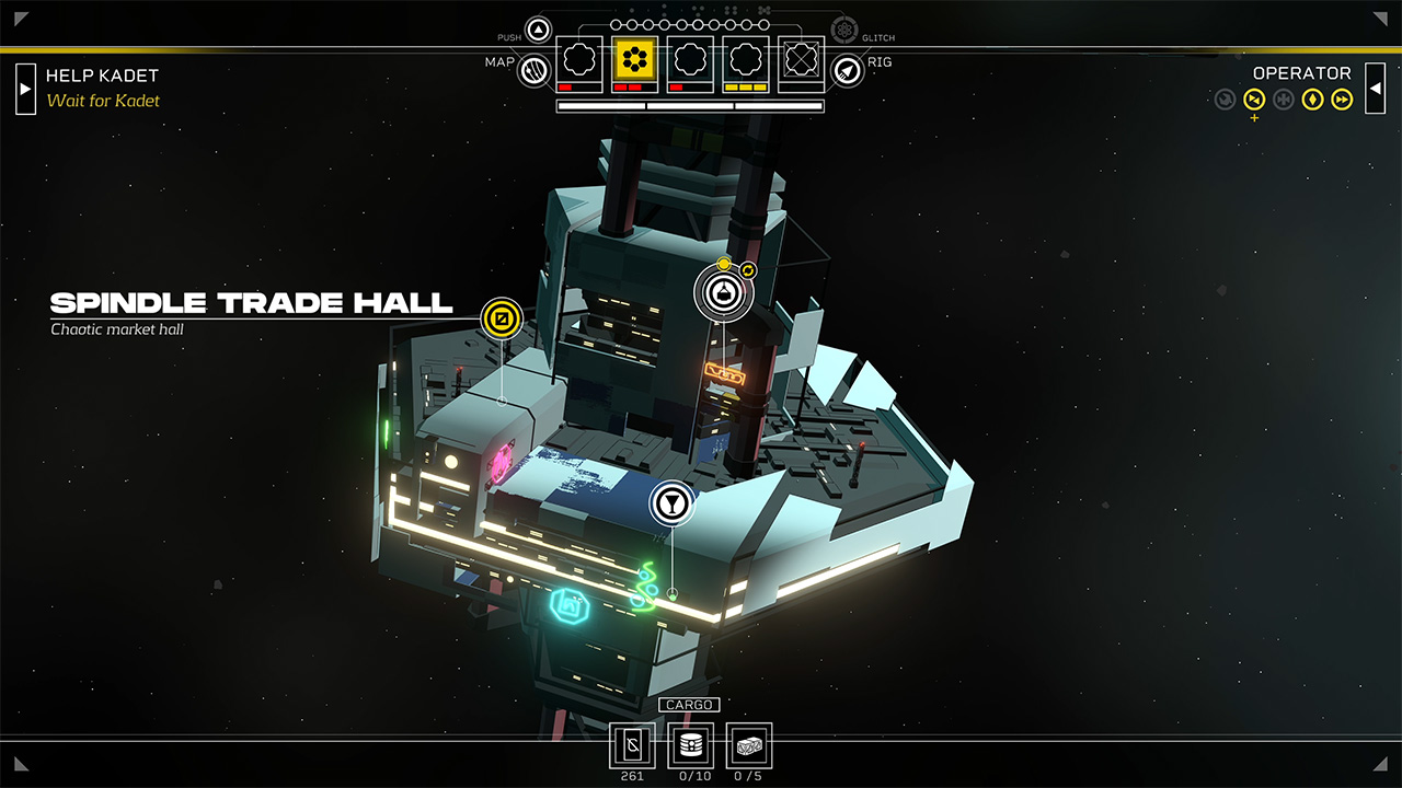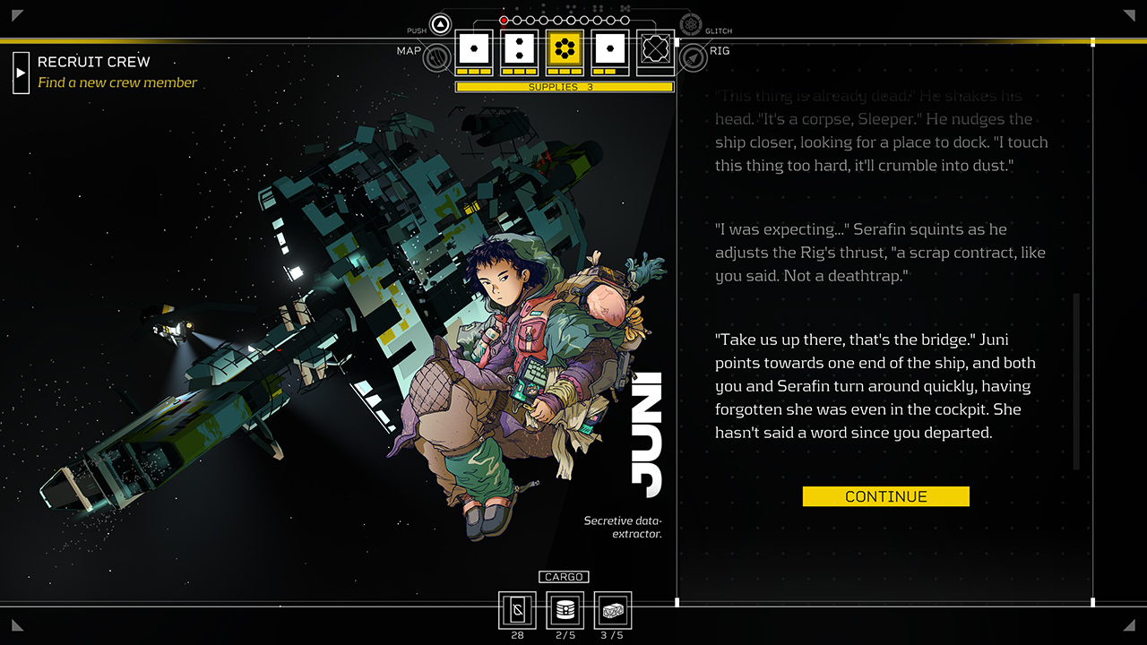 Contrairement à l’Œil d’Erlin, la mégastructure urbaine du premier jeu, Citizen Sleeper 2 offre un univers plus vaste encore dans la Ceinture Astrale, une autre partie du système Helion, composée de diverses stations davantage dispersées. La maison du protagoniste qu’on choisit entre trois classes aux caractéristiques propres sera le Rig, un vaisseau chipé qu’il sera possible de faire évoluer au fil de l’aventure, ce qui permet de le rendre progressivement plus familier et chargé en souvenirs à mesure que l’équipage grandit. Car oui, il va falloir se créer un équipage.