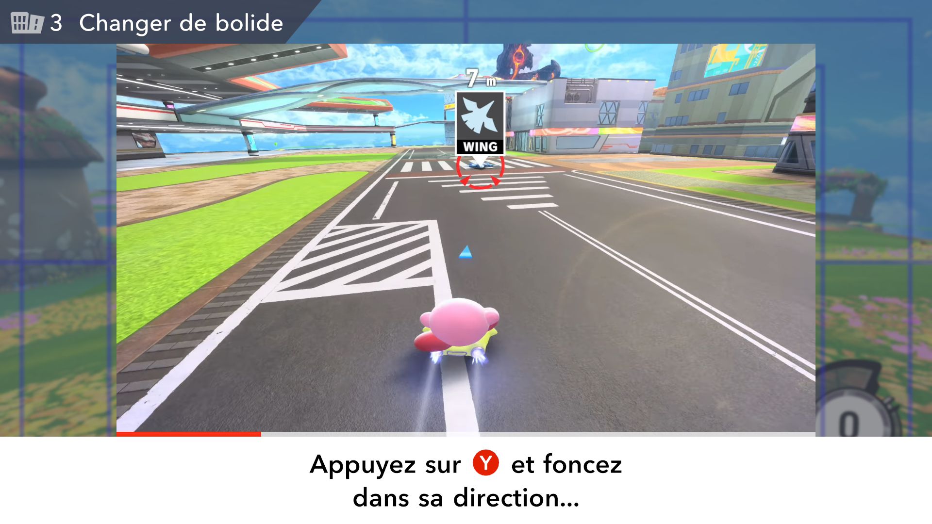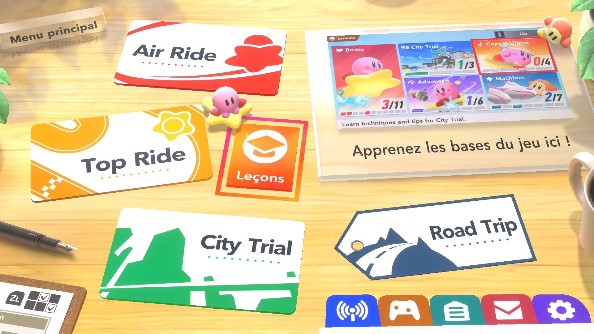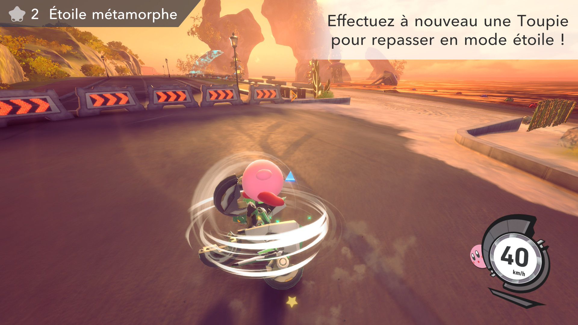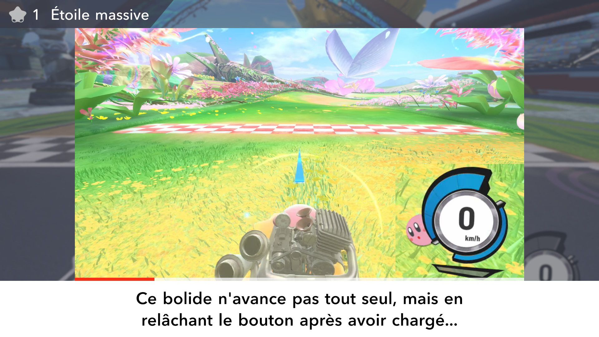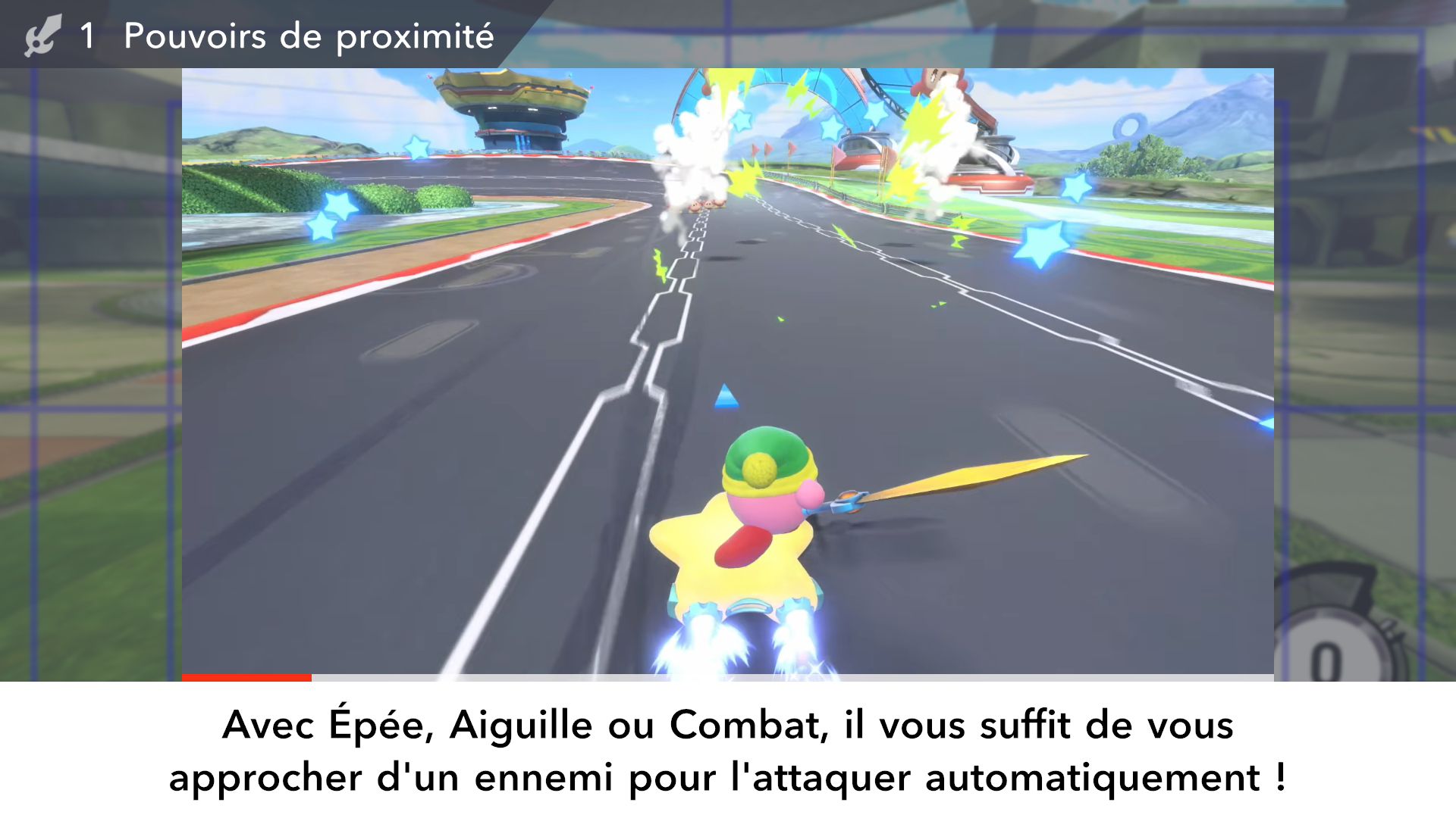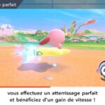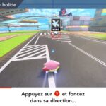 On part ensuite à la découverte des modes de Kirby Air Riders. Étant donné qu’ils ont déjà été longuement présentés dans les deux Direct dédiés au jeu puis sur les comptes Twitter officiels en anglais et en japonais ainsi que dans des vidéos promotionnelles diffusées par Nintendo, il est surtout important ici de se concentrer sur leurs sensations, leur variété et sur ce qu’ils ont à offrir plus exactement. Tout d’abord, comme le rappelait Sakurai, Kirby Air Ride et son successeur sont largement vus comme des jeux de course, mais leur attrait ne réside pas principalement dans les courses. C’est quelque chose que l’on peut comprendre assez vite, rien qu’en lançant tout d’abord le mode Leçons. Déjà inclus dans la démo, il n’est pas vraiment identique dans le jeu complet puisqu’il comporte une autre section dédiée aux bolides (ce qui paraît logique, étant donné qu’il n’y avait pas un vaste choix dans la démo). On peut ici essayer l’étoile massive, l’étoile métamorphe, l’étoile archéo, l’étoile vampire, l’étoile hop, l’étoile aéro et l’étoile fusée qui ont tous différentes particularités. Par exemple, l’étoile hop saute chaque fois que l’on incline rapidement le stick L d’un côté à l’autre, ce qui rend ce bolide très utile pour les sauts d’obstacles. Les autres sections sont celles de la démo : bases, City Trial, pouvoirs et techniques pro. Même si l’on a déjà tout terminé dans la démo, on recommande de tout refaire, surtout si l’on ne maîtrisait pas totalement le concept dans la démo, puisque le mode Leçons offre une certaine dose d’entraînement.