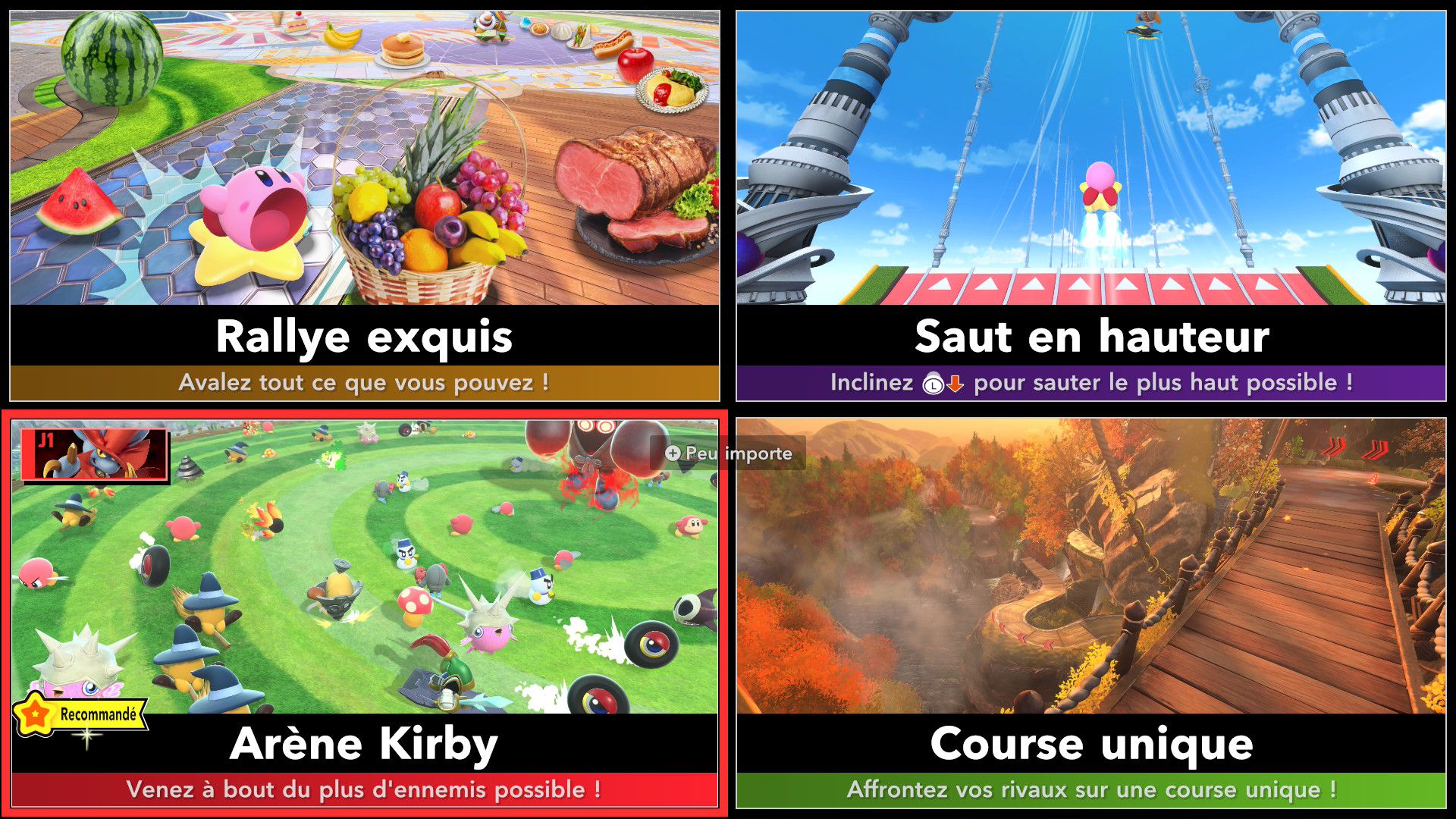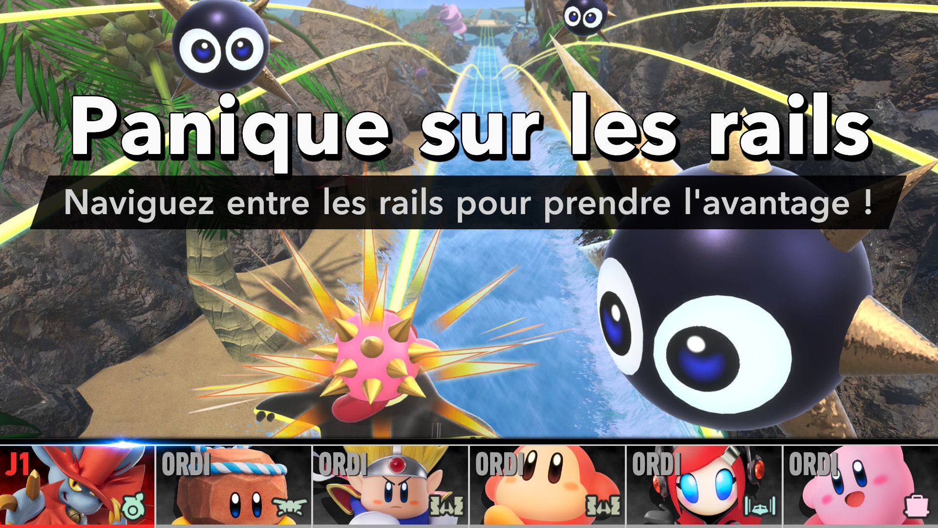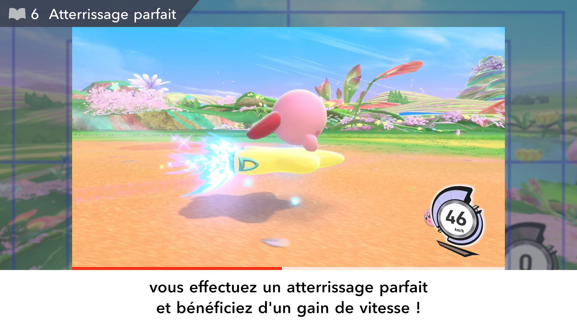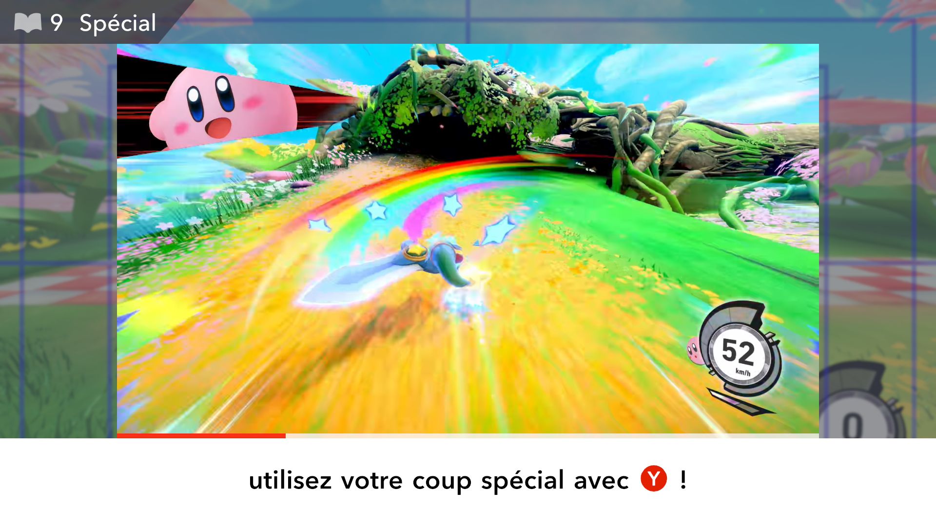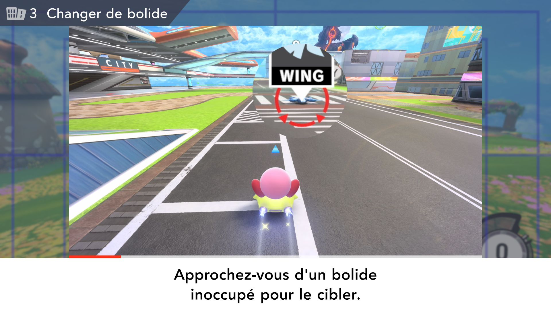 On part ensuite à la découverte des modes de Kirby Air Riders. Étant donné qu’ils ont déjà été longuement présentés dans les deux Direct dédiés au jeu puis sur les comptes Twitter officiels en anglais et en japonais ainsi que dans des vidéos promotionnelles diffusées par Nintendo, il est surtout important ici de se concentrer sur leurs sensations, leur variété et sur ce qu’ils ont à offrir plus exactement. Tout d’abord, comme le rappelait Sakurai, Kirby Air Ride et son successeur sont largement vus comme des jeux de course, mais leur attrait ne réside pas principalement dans les courses. C’est quelque chose que l’on peut comprendre assez vite, rien qu’en lançant tout d’abord le mode Leçons. Déjà inclus dans la démo, il n’est pas vraiment identique dans le jeu complet puisqu’il comporte une autre section dédiée aux bolides (ce qui paraît logique, étant donné qu’il n’y avait pas un vaste choix dans la démo). On peut ici essayer l’étoile massive, l’étoile métamorphe, l’étoile archéo, l’étoile vampire, l’étoile hop, l’étoile aéro et l’étoile fusée qui ont tous différentes particularités. Par exemple, l’étoile hop saute chaque fois que l’on incline rapidement le stick L d’un côté à l’autre, ce qui rend ce bolide très utile pour les sauts d’obstacles. Les autres sections sont celles de la démo : bases, City Trial, pouvoirs et techniques pro. Même si l’on a déjà tout terminé dans la démo, on recommande de tout refaire, surtout si l’on ne maîtrisait pas totalement le concept dans la démo, puisque le mode Leçons offre une certaine dose d’entraînement.