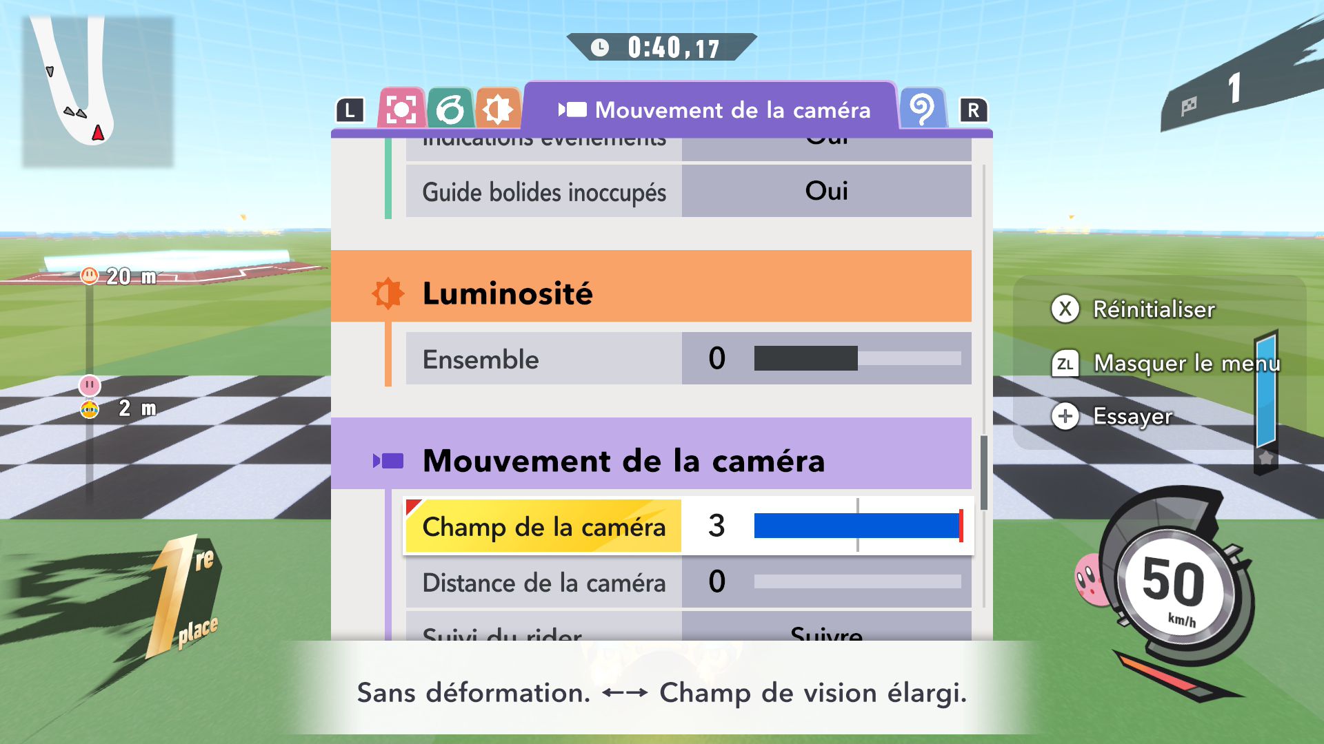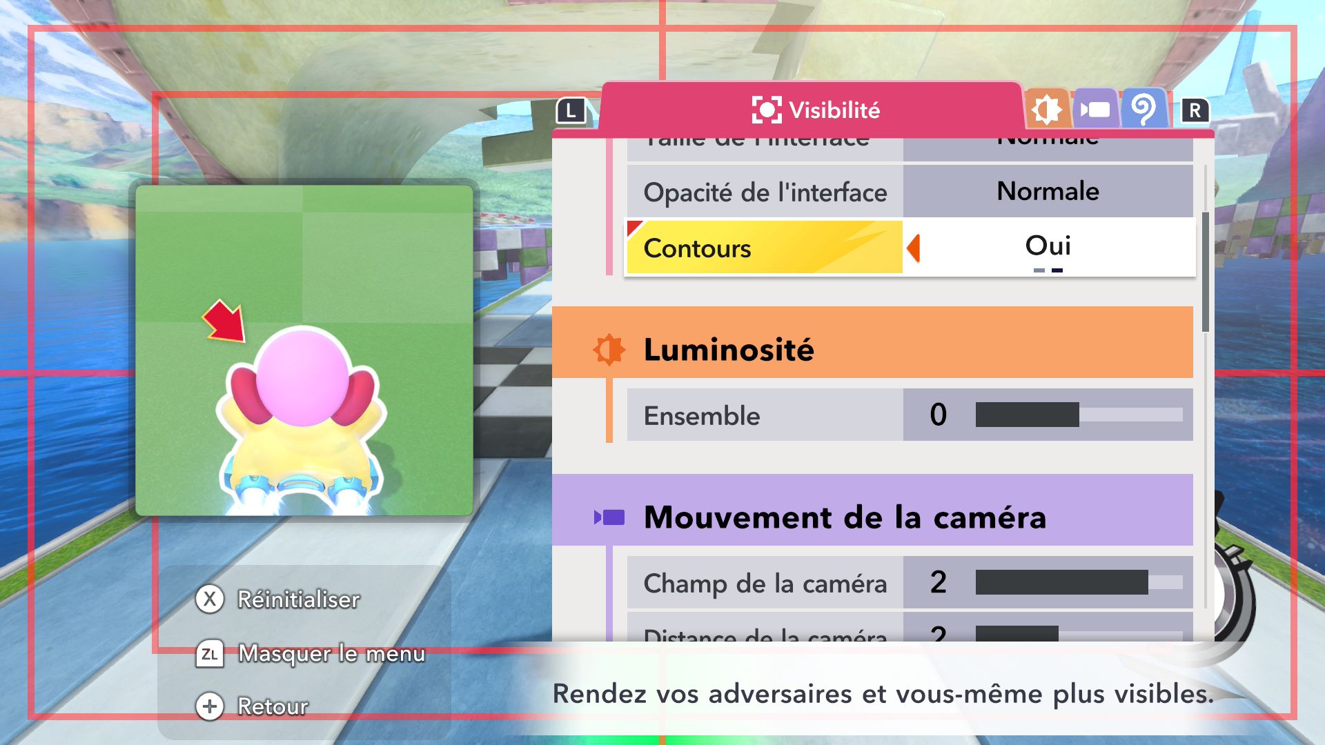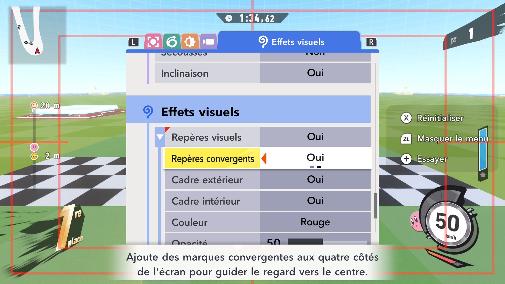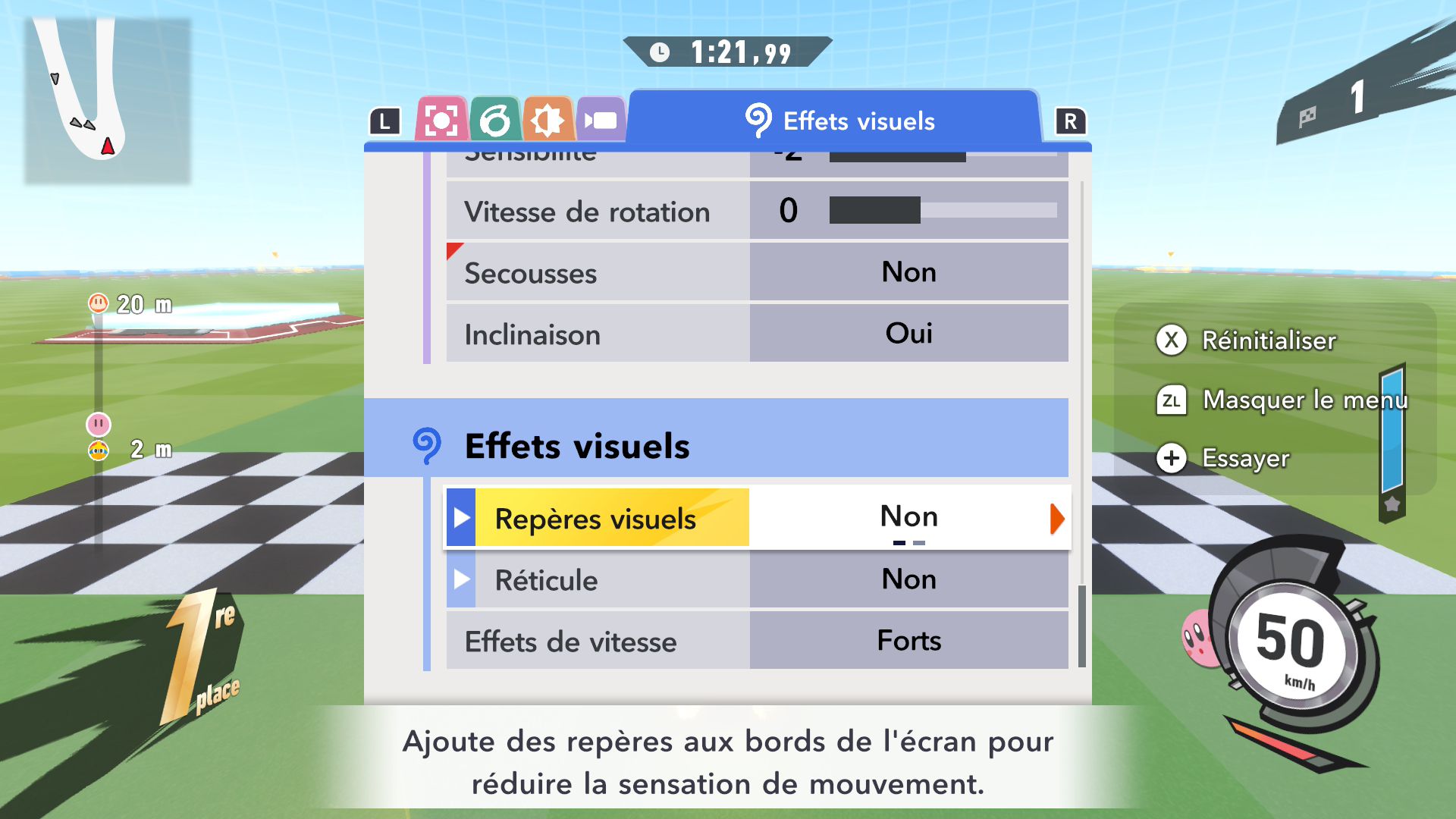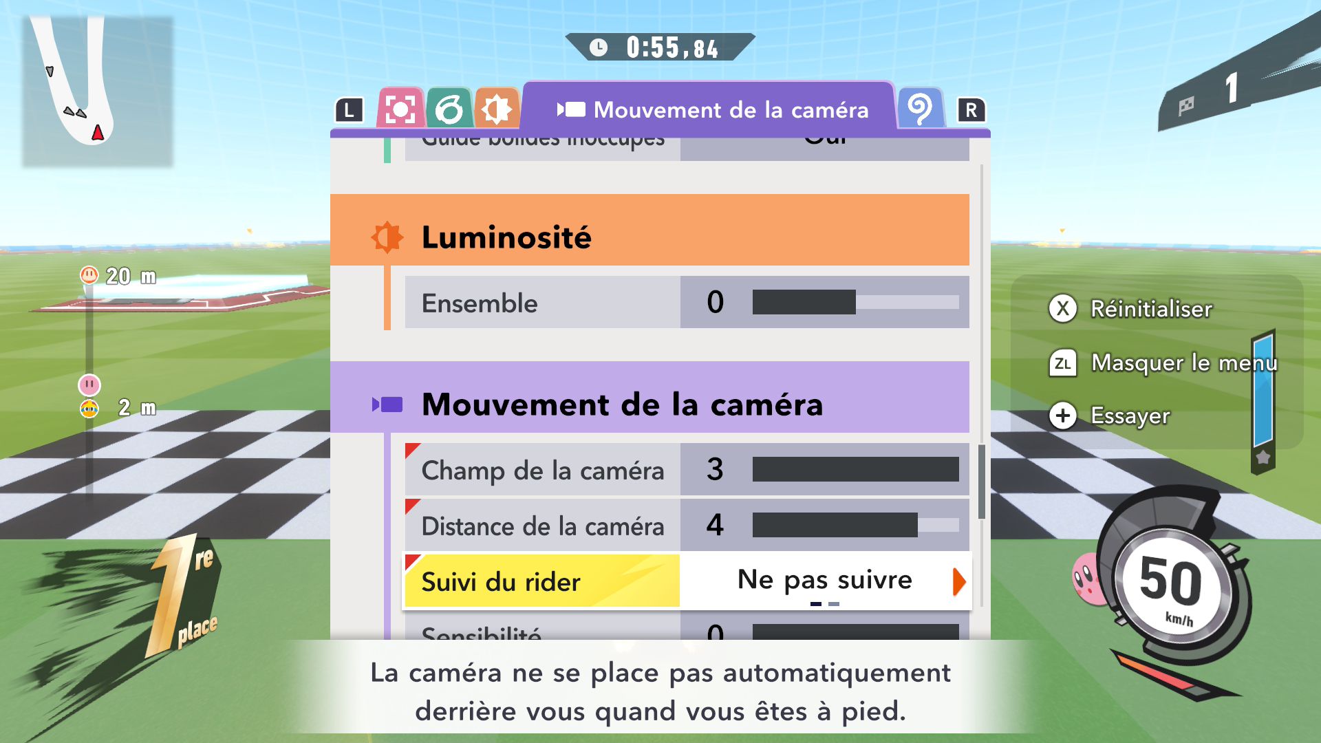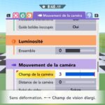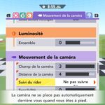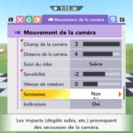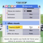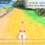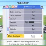 L’auteur de ce test en faisant partie, il paraissait très important d’essayer le jeu en utilisant toutes les options à disposition. Dans les réglages du mouvement de la caméra, il est donc possible d’élargir le champ de vision et de régler la distance de la caméra, le suivi du Rider (en choisissant de le suivre, la caméra se place automatiquement derrière notre personnage quand il se déplace à pied), la vitesse à laquelle tourne la caméra quand on incline le stick R, les secousses provenant des impacts et l’inclinaison de la caméra dans les virages. Le paramétrage des effets visuels est particulièrement important, car il peut fortement réduire les sensations de malaise, voire ne pas les déclencher du tout lorsque l’on est sensible aux mouvements brusques de caméra ou autres éléments pouvant provoquer des troubles plus ou moins importants. On peut donc choisir d’intégrer des repères visuels aux bords de l’écran pour réduire la sensation de mouvement ainsi que des repères convergents pour guider le regard vers le centre, un cadre rectangulaire extérieur et un cadre intérieur aux bords de l’écran, et ensuite de paramétrer leur opacité ainsi que leur épaisseur. Certes, le rendu en jeu est évidemment loin d’être magnifique, mais cela permet de profiter du jeu sans être malade au bout de quelques minutes. On a donc essayé de longues sessions pour voir si ces options sont réellement utiles, et le verdict est sans appel : les mauvaises sensations qui pourraient normalement être ressenties en jouant à un jeu de ce type ne surviennent pas. Pour les personnes qui seraient encore plus sensibles, il est également possible d’ajouter une marque au centre de l’écran pour aider le regard à se fixer et même d’ajuster l’intensité des changements dans le champ de vision pendant le jeu. En jouant à Kirby Air Riders, on se dit qu’il faut absolument que d’autres studios prennent exemple sur ces options, car cela peut permettre tout simplement à encore plus de personnes de profiter de différents types de jeux auxquels elles ne pourraient pas jouer à cause de leurs troubles. À ce niveau, Kirby Air Riders est déjà une véritable réussite. On peut même enregistrer plusieurs sets de paramètres personnalisés, ce qui est très utile étant donné qu’il y a différents modes de jeu où les sensations peuvent ne pas être les mêmes.