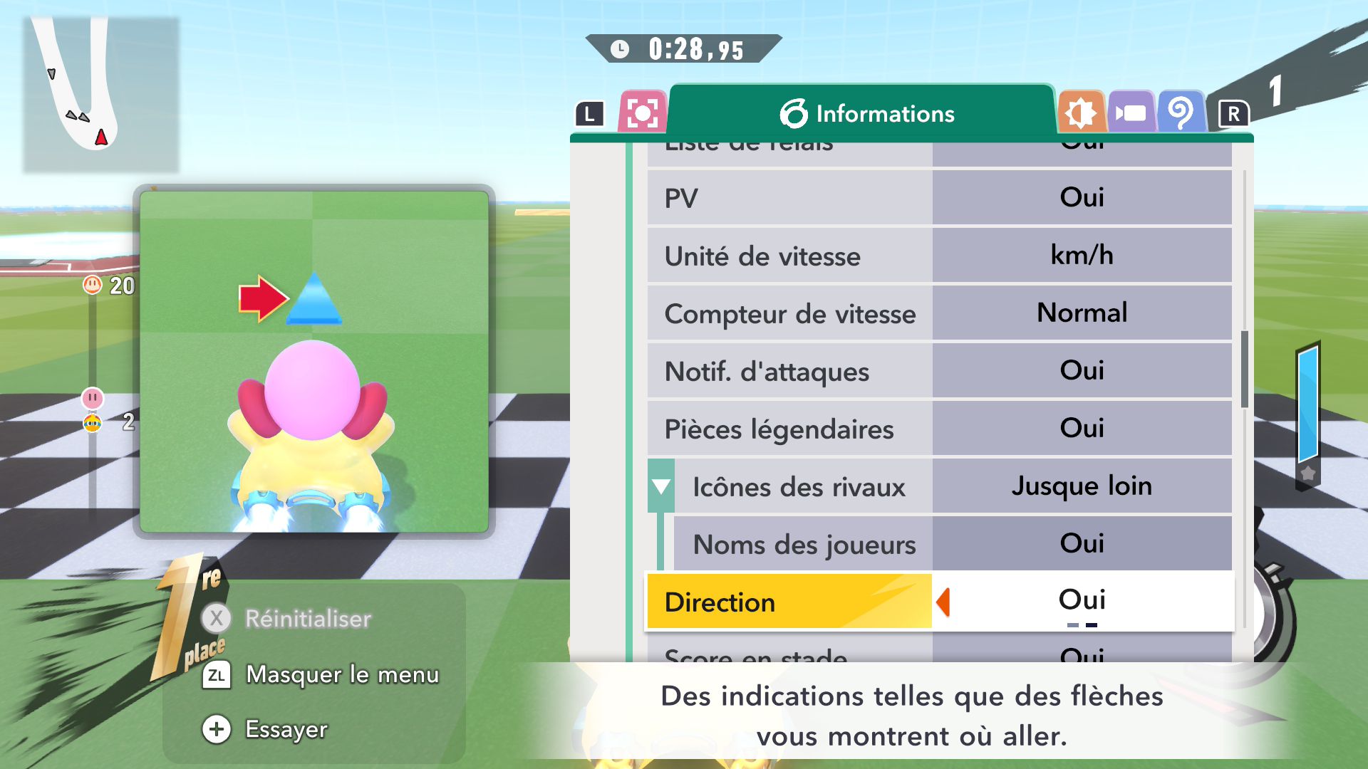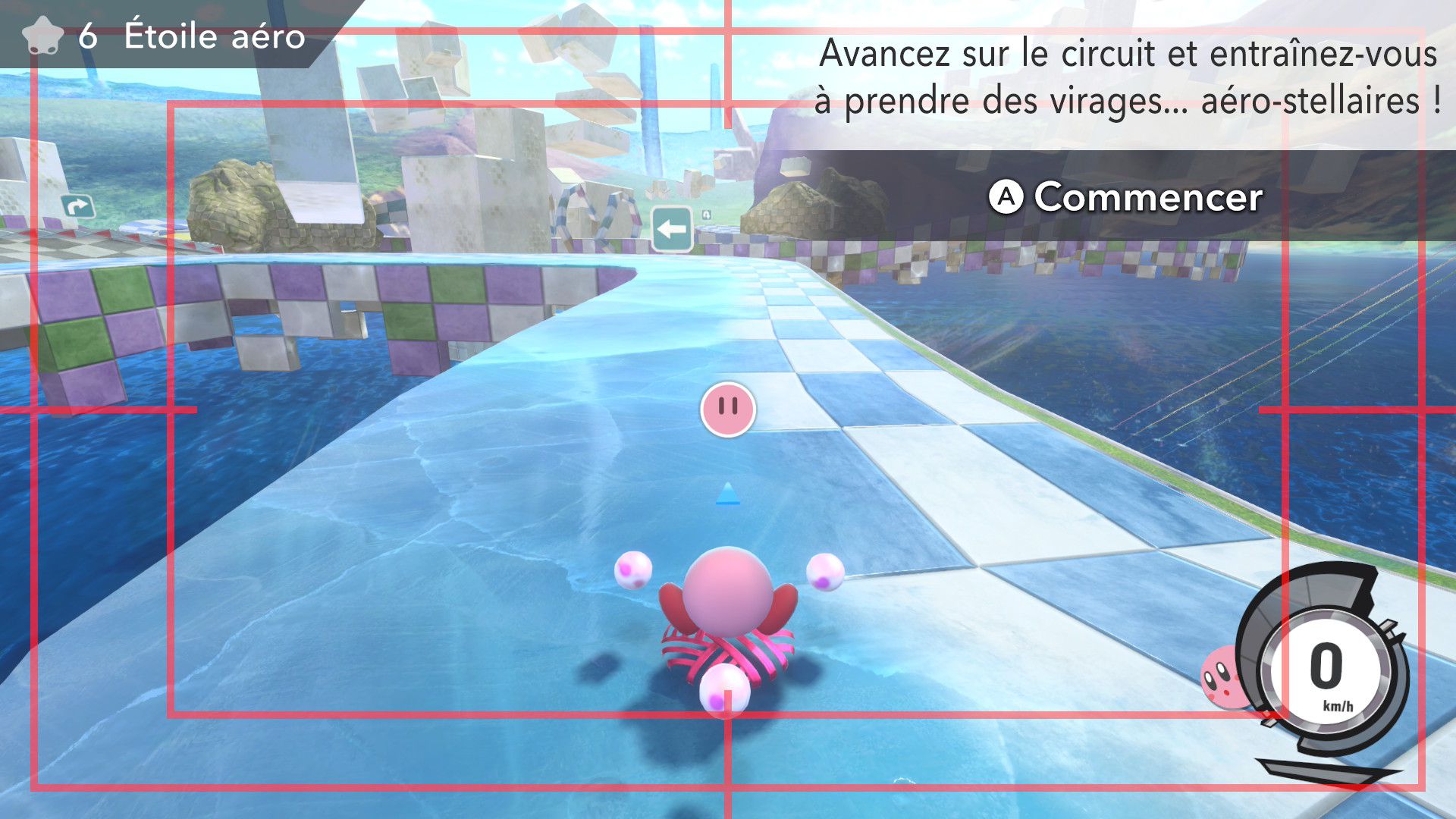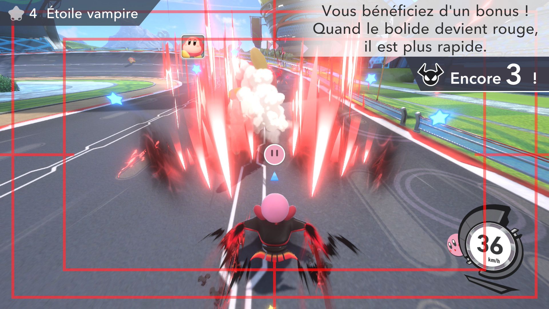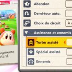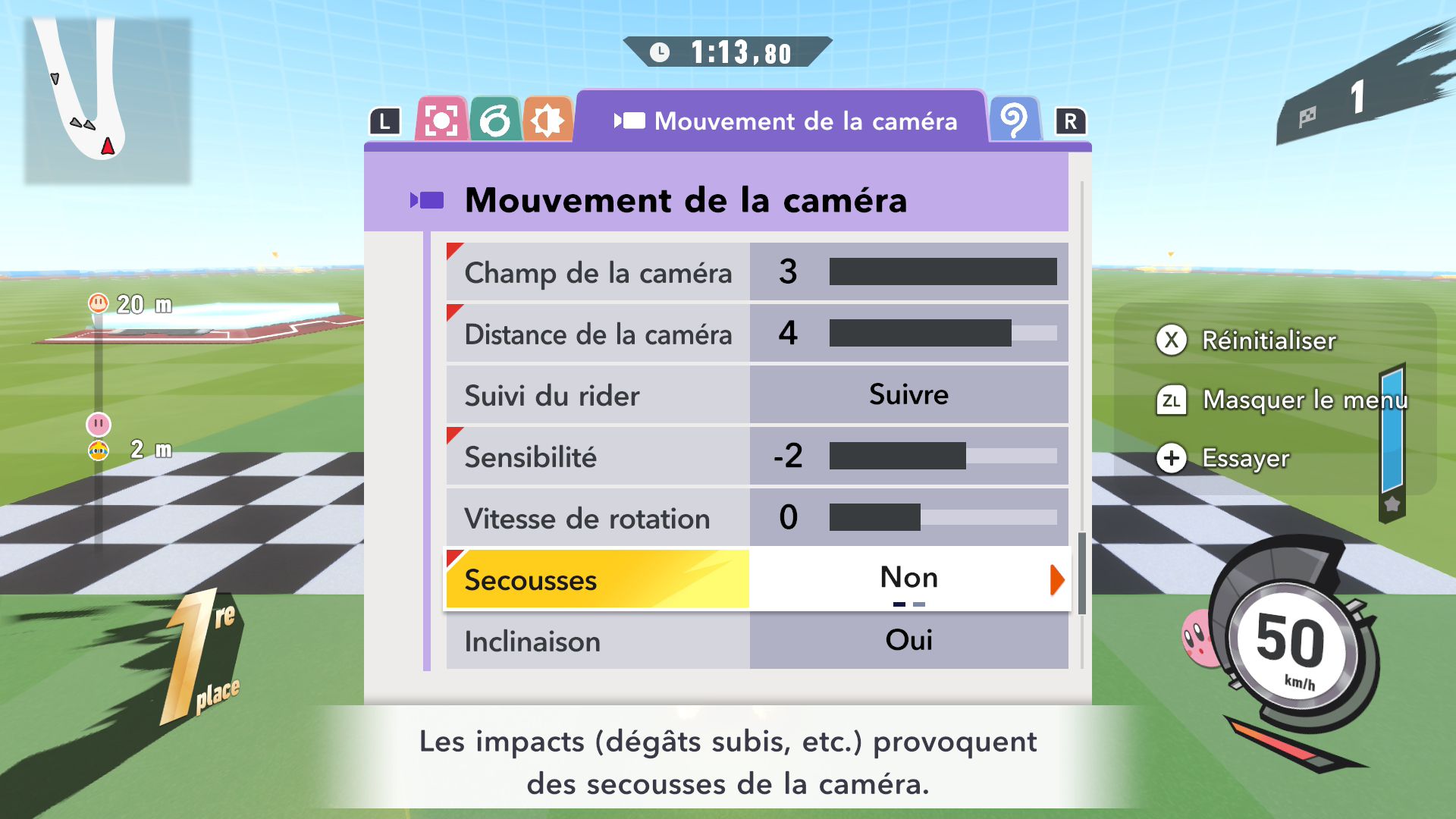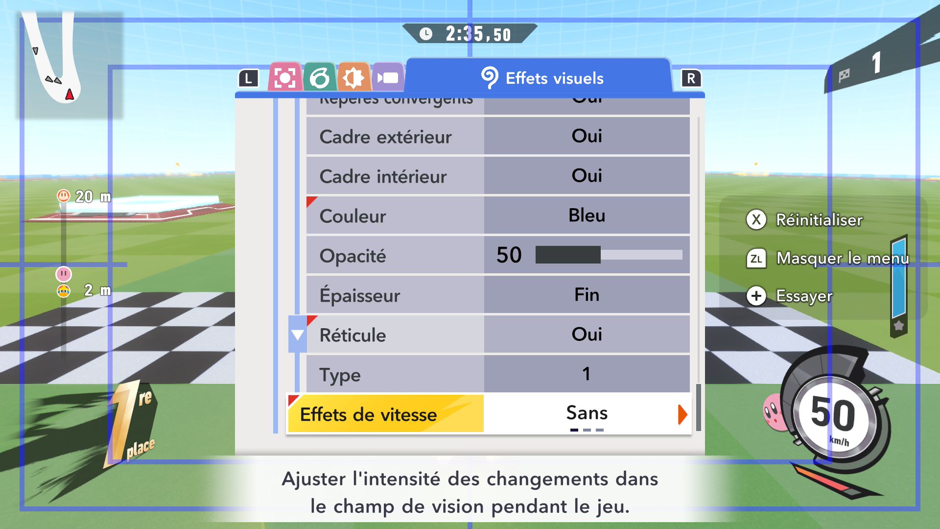 L’auteur de ce test en faisant partie, il paraissait très important d’essayer le jeu en utilisant toutes les options à disposition. Dans les réglages du mouvement de la caméra, il est donc possible d’élargir le champ de vision et de régler la distance de la caméra, le suivi du Rider (en choisissant de le suivre, la caméra se place automatiquement derrière notre personnage quand il se déplace à pied), la vitesse à laquelle tourne la caméra quand on incline le stick R, les secousses provenant des impacts et l’inclinaison de la caméra dans les virages. Le paramétrage des effets visuels est particulièrement important, car il peut fortement réduire les sensations de malaise, voire ne pas les déclencher du tout lorsque l’on est sensible aux mouvements brusques de caméra ou autres éléments pouvant provoquer des troubles plus ou moins importants. On peut donc choisir d’intégrer des repères visuels aux bords de l’écran pour réduire la sensation de mouvement ainsi que des repères convergents pour guider le regard vers le centre, un cadre rectangulaire extérieur et un cadre intérieur aux bords de l’écran, et ensuite de paramétrer leur opacité ainsi que leur épaisseur. Certes, le rendu en jeu est évidemment loin d’être magnifique, mais cela permet de profiter du jeu sans être malade au bout de quelques minutes. On a donc essayé de longues sessions pour voir si ces options sont réellement utiles, et le verdict est sans appel : les mauvaises sensations qui pourraient normalement être ressenties en jouant à un jeu de ce type ne surviennent pas. Pour les personnes qui seraient encore plus sensibles, il est également possible d’ajouter une marque au centre de l’écran pour aider le regard à se fixer et même d’ajuster l’intensité des changements dans le champ de vision pendant le jeu. En jouant à Kirby Air Riders, on se dit qu’il faut absolument que d’autres studios prennent exemple sur ces options, car cela peut permettre tout simplement à encore plus de personnes de profiter de différents types de jeux auxquels elles ne pourraient pas jouer à cause de leurs troubles. À ce niveau, Kirby Air Riders est déjà une véritable réussite. On peut même enregistrer plusieurs sets de paramètres personnalisés, ce qui est très utile étant donné qu’il y a différents modes de jeu où les sensations peuvent ne pas être les mêmes.