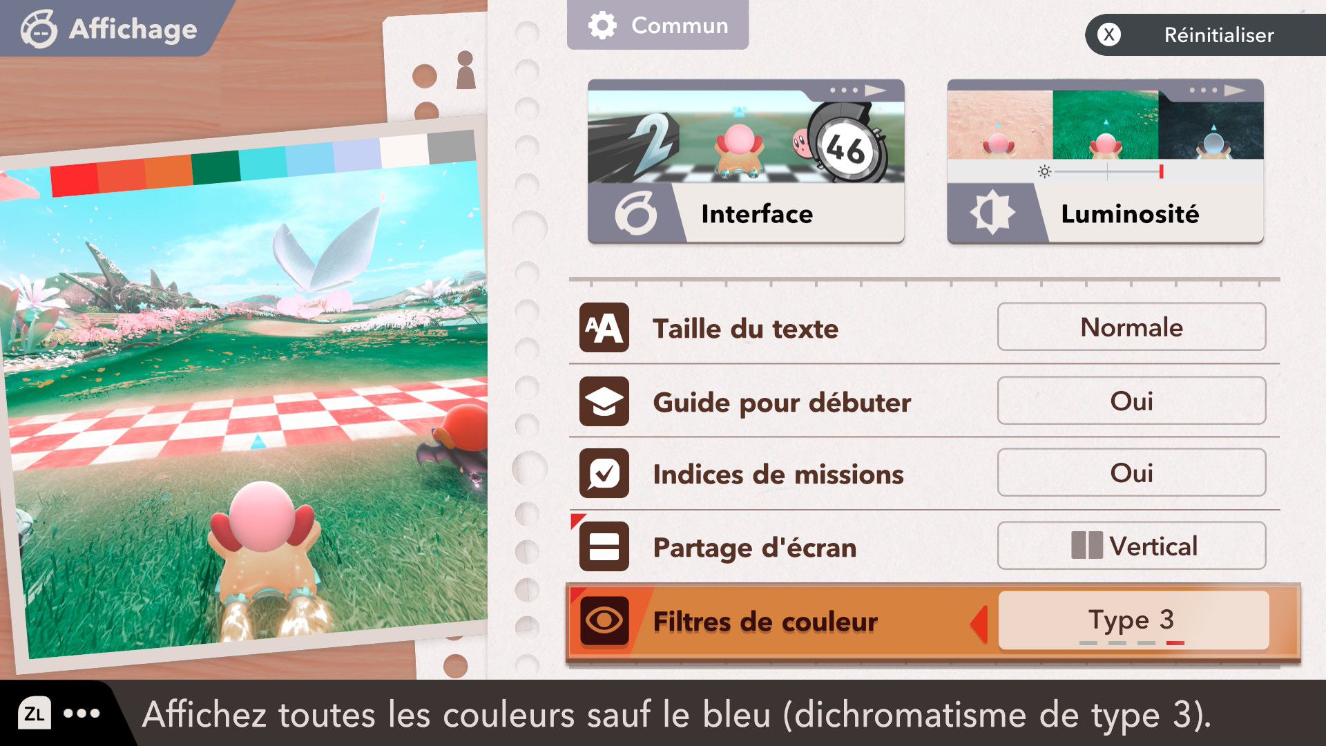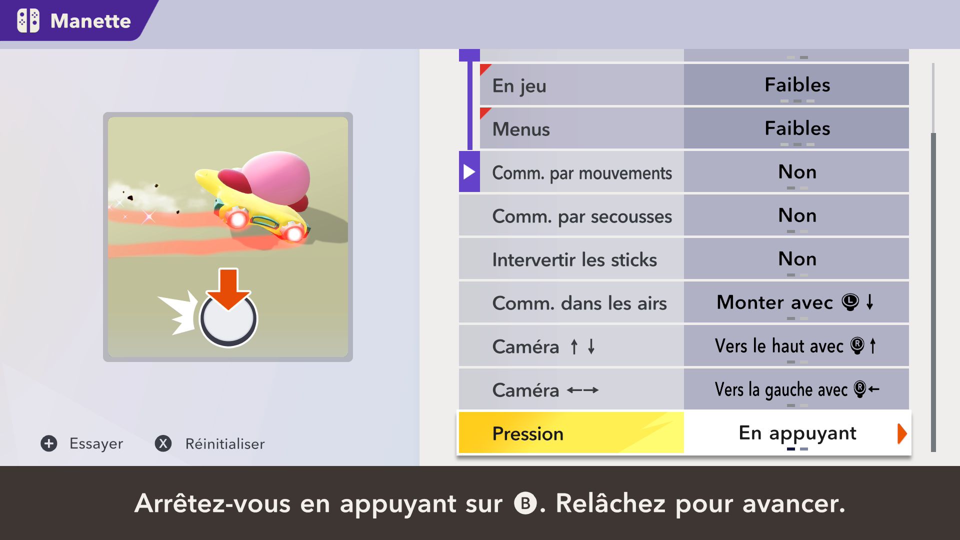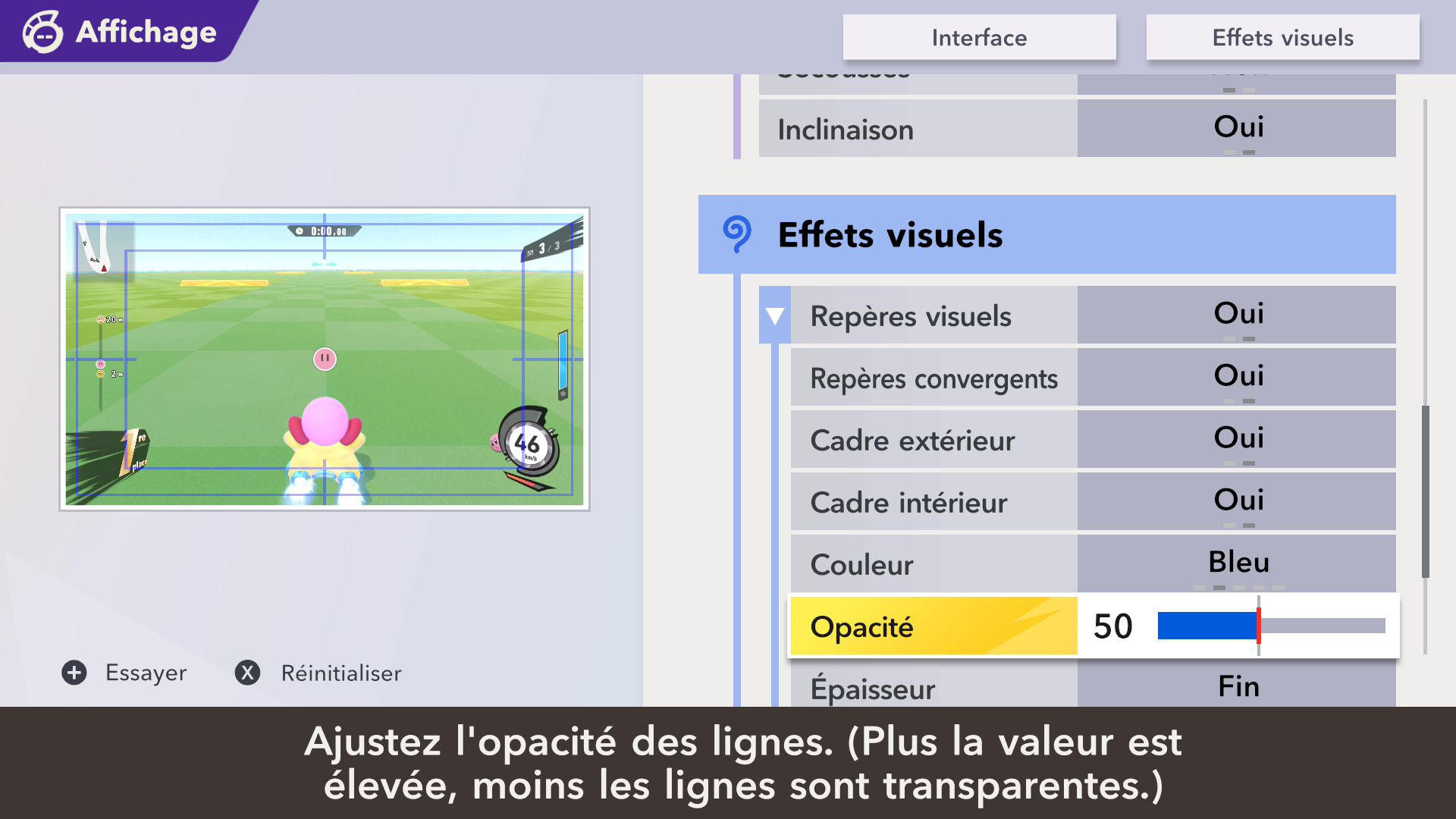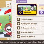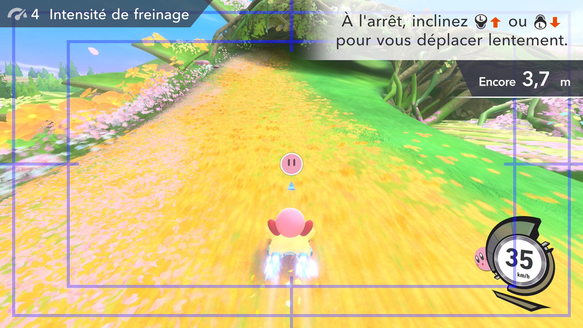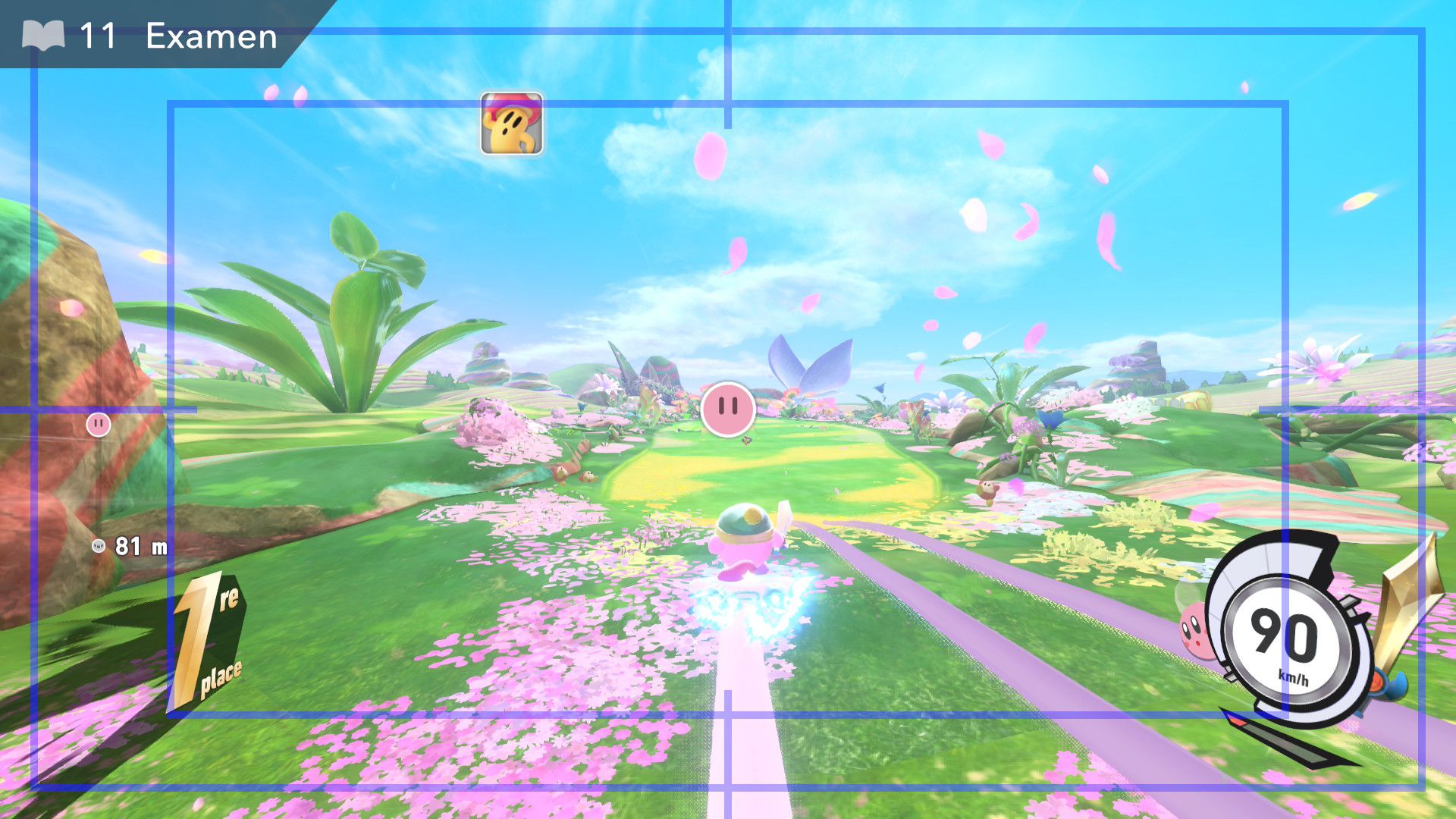 L’auteur de ce test en faisant partie, il paraissait très important d’essayer le jeu en utilisant toutes les options à disposition. Dans les réglages du mouvement de la caméra, il est donc possible d’élargir le champ de vision et de régler la distance de la caméra, le suivi du Rider (en choisissant de le suivre, la caméra se place automatiquement derrière notre personnage quand il se déplace à pied), la vitesse à laquelle tourne la caméra quand on incline le stick R, les secousses provenant des impacts et l’inclinaison de la caméra dans les virages. Le paramétrage des effets visuels est particulièrement important, car il peut fortement réduire les sensations de malaise, voire ne pas les déclencher du tout lorsque l’on est sensible aux mouvements brusques de caméra ou autres éléments pouvant provoquer des troubles plus ou moins importants. On peut donc choisir d’intégrer des repères visuels aux bords de l’écran pour réduire la sensation de mouvement ainsi que des repères convergents pour guider le regard vers le centre, un cadre rectangulaire extérieur et un cadre intérieur aux bords de l’écran, et ensuite de paramétrer leur opacité ainsi que leur épaisseur. Certes, le rendu en jeu est évidemment loin d’être magnifique, mais cela permet de profiter du jeu sans être malade au bout de quelques minutes. On a donc essayé de longues sessions pour voir si ces options sont réellement utiles, et le verdict est sans appel : les mauvaises sensations qui pourraient normalement être ressenties en jouant à un jeu de ce type ne surviennent pas. Pour les personnes qui seraient encore plus sensibles, il est également possible d’ajouter une marque au centre de l’écran pour aider le regard à se fixer et même d’ajuster l’intensité des changements dans le champ de vision pendant le jeu. En jouant à Kirby Air Riders, on se dit qu’il faut absolument que d’autres studios prennent exemple sur ces options, car cela peut permettre tout simplement à encore plus de personnes de profiter de différents types de jeux auxquels elles ne pourraient pas jouer à cause de leurs troubles. À ce niveau, Kirby Air Riders est déjà une véritable réussite. On peut même enregistrer plusieurs sets de paramètres personnalisés, ce qui est très utile étant donné qu’il y a différents modes de jeu où les sensations peuvent ne pas être les mêmes.