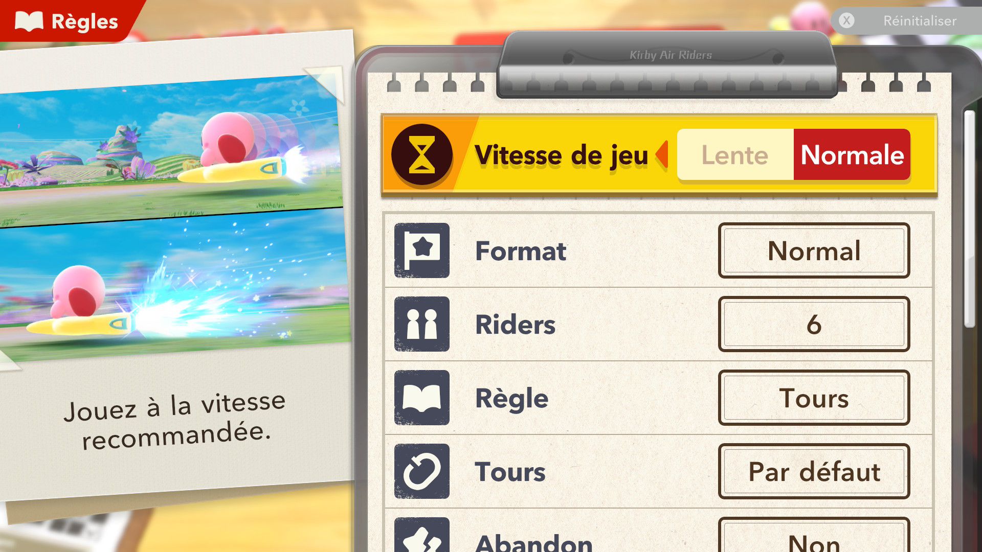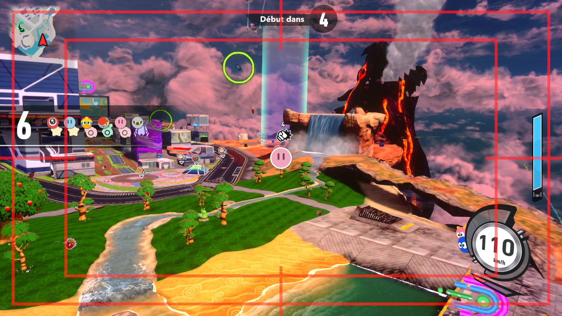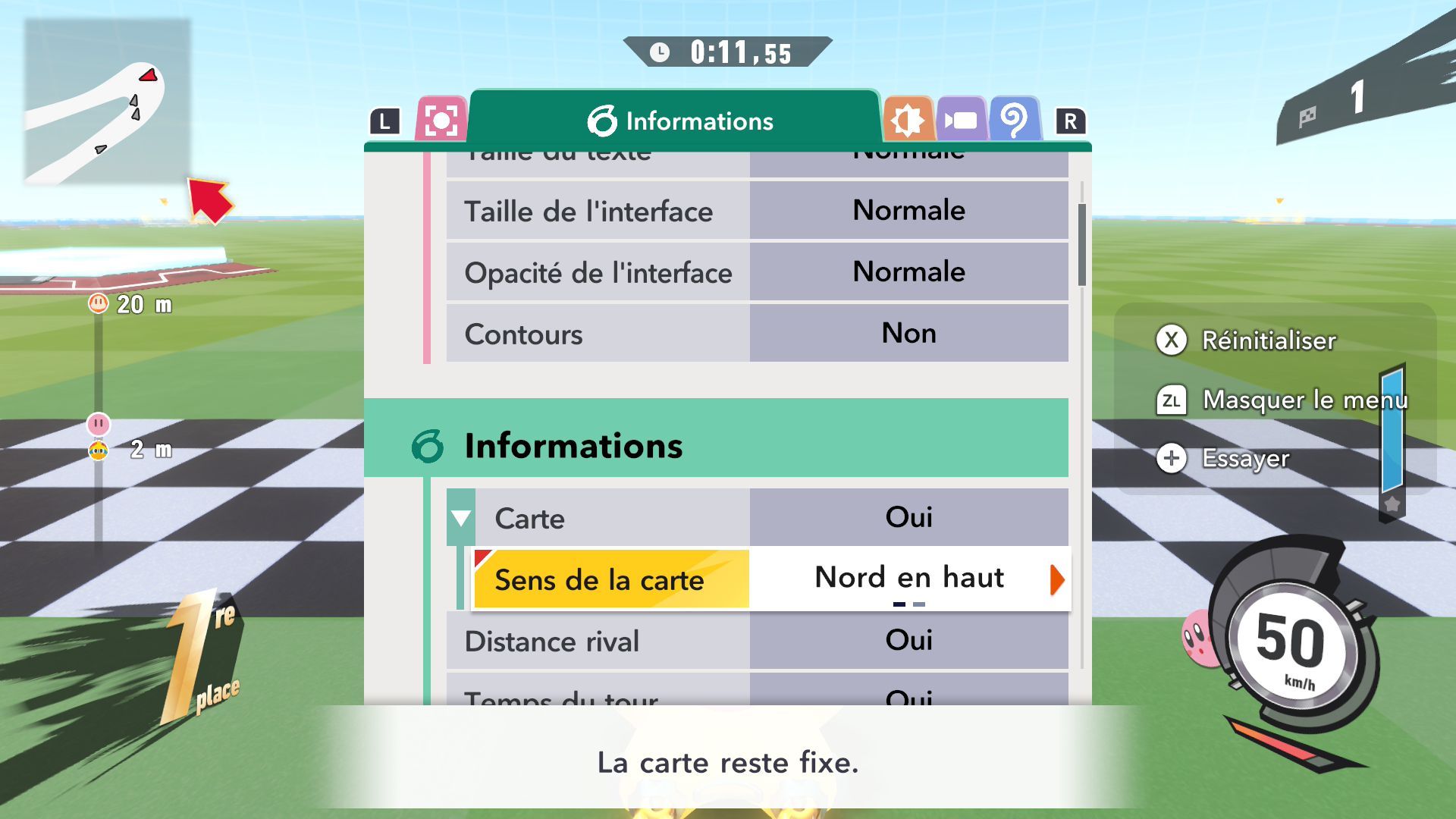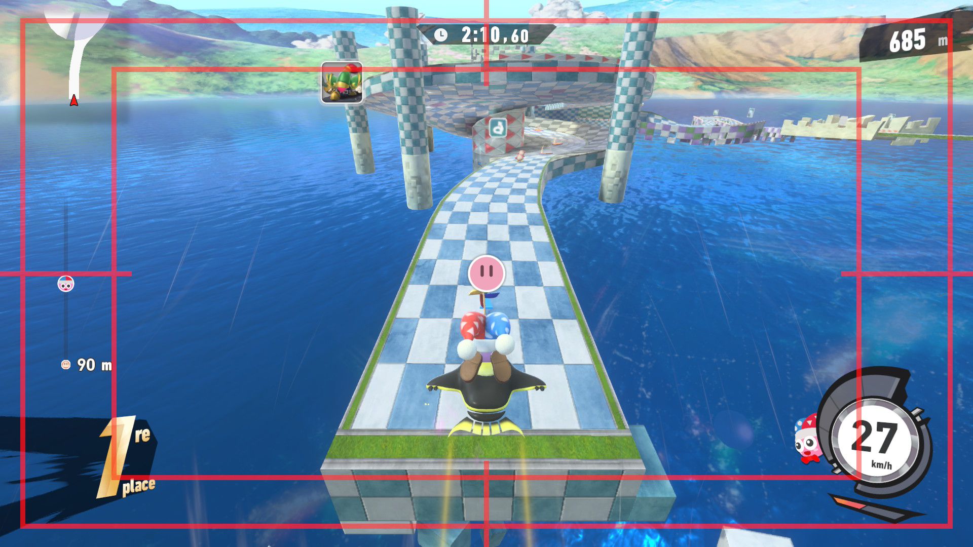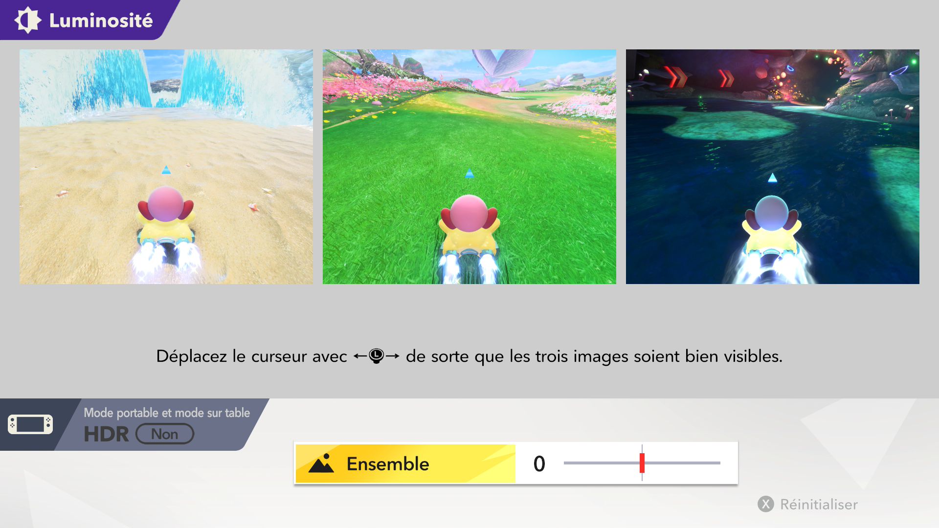 L’auteur de ce test en faisant partie, il paraissait très important d’essayer le jeu en utilisant toutes les options à disposition. Dans les réglages du mouvement de la caméra, il est donc possible d’élargir le champ de vision et de régler la distance de la caméra, le suivi du Rider (en choisissant de le suivre, la caméra se place automatiquement derrière notre personnage quand il se déplace à pied), la vitesse à laquelle tourne la caméra quand on incline le stick R, les secousses provenant des impacts et l’inclinaison de la caméra dans les virages. Le paramétrage des effets visuels est particulièrement important, car il peut fortement réduire les sensations de malaise, voire ne pas les déclencher du tout lorsque l’on est sensible aux mouvements brusques de caméra ou autres éléments pouvant provoquer des troubles plus ou moins importants. On peut donc choisir d’intégrer des repères visuels aux bords de l’écran pour réduire la sensation de mouvement ainsi que des repères convergents pour guider le regard vers le centre, un cadre rectangulaire extérieur et un cadre intérieur aux bords de l’écran, et ensuite de paramétrer leur opacité ainsi que leur épaisseur. Certes, le rendu en jeu est évidemment loin d’être magnifique, mais cela permet de profiter du jeu sans être malade au bout de quelques minutes. On a donc essayé de longues sessions pour voir si ces options sont réellement utiles, et le verdict est sans appel : les mauvaises sensations qui pourraient normalement être ressenties en jouant à un jeu de ce type ne surviennent pas. Pour les personnes qui seraient encore plus sensibles, il est également possible d’ajouter une marque au centre de l’écran pour aider le regard à se fixer et même d’ajuster l’intensité des changements dans le champ de vision pendant le jeu. En jouant à Kirby Air Riders, on se dit qu’il faut absolument que d’autres studios prennent exemple sur ces options, car cela peut permettre tout simplement à encore plus de personnes de profiter de différents types de jeux auxquels elles ne pourraient pas jouer à cause de leurs troubles. À ce niveau, Kirby Air Riders est déjà une véritable réussite. On peut même enregistrer plusieurs sets de paramètres personnalisés, ce qui est très utile étant donné qu’il y a différents modes de jeu où les sensations peuvent ne pas être les mêmes.