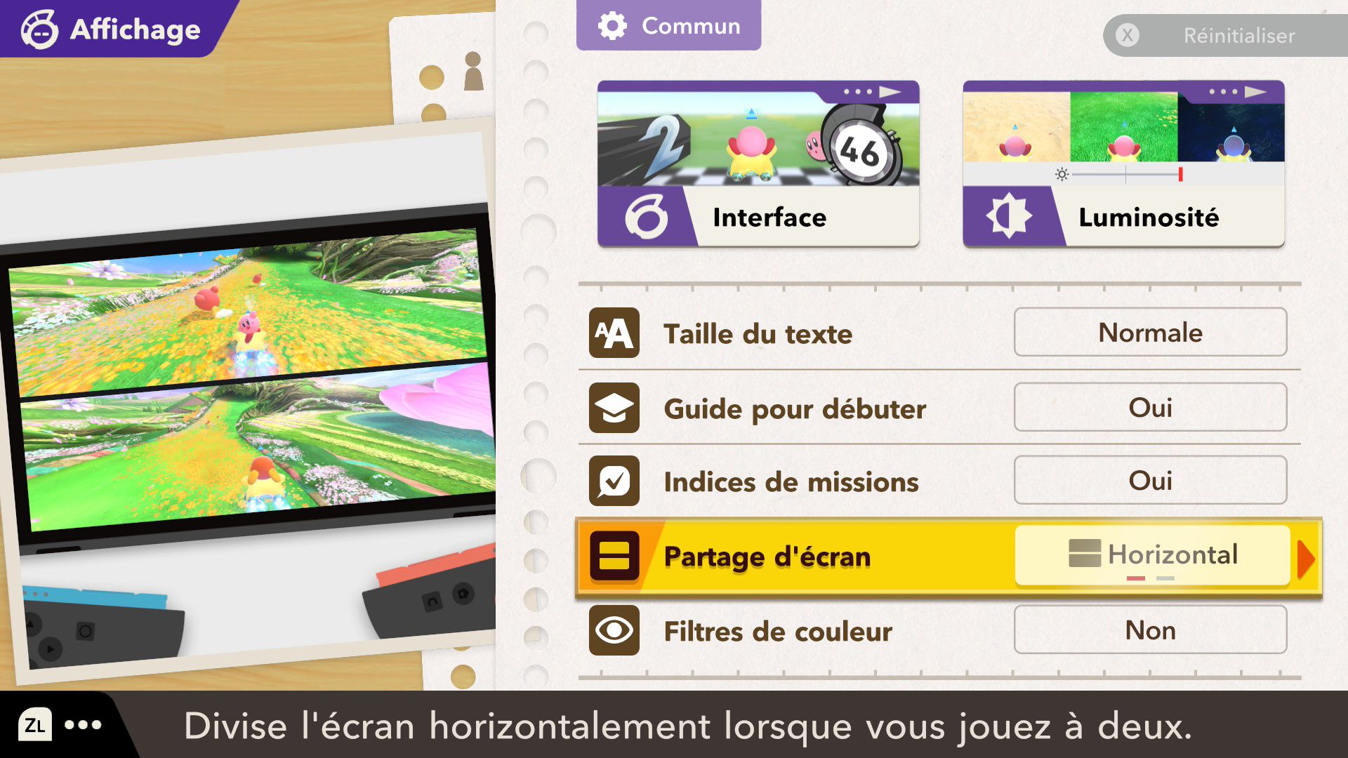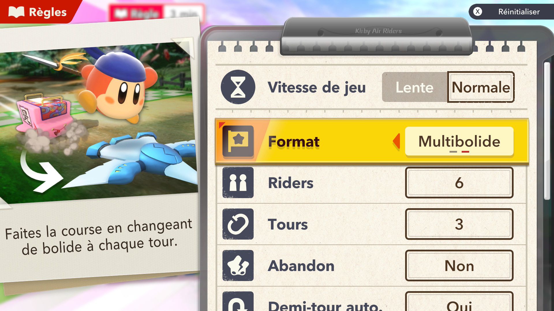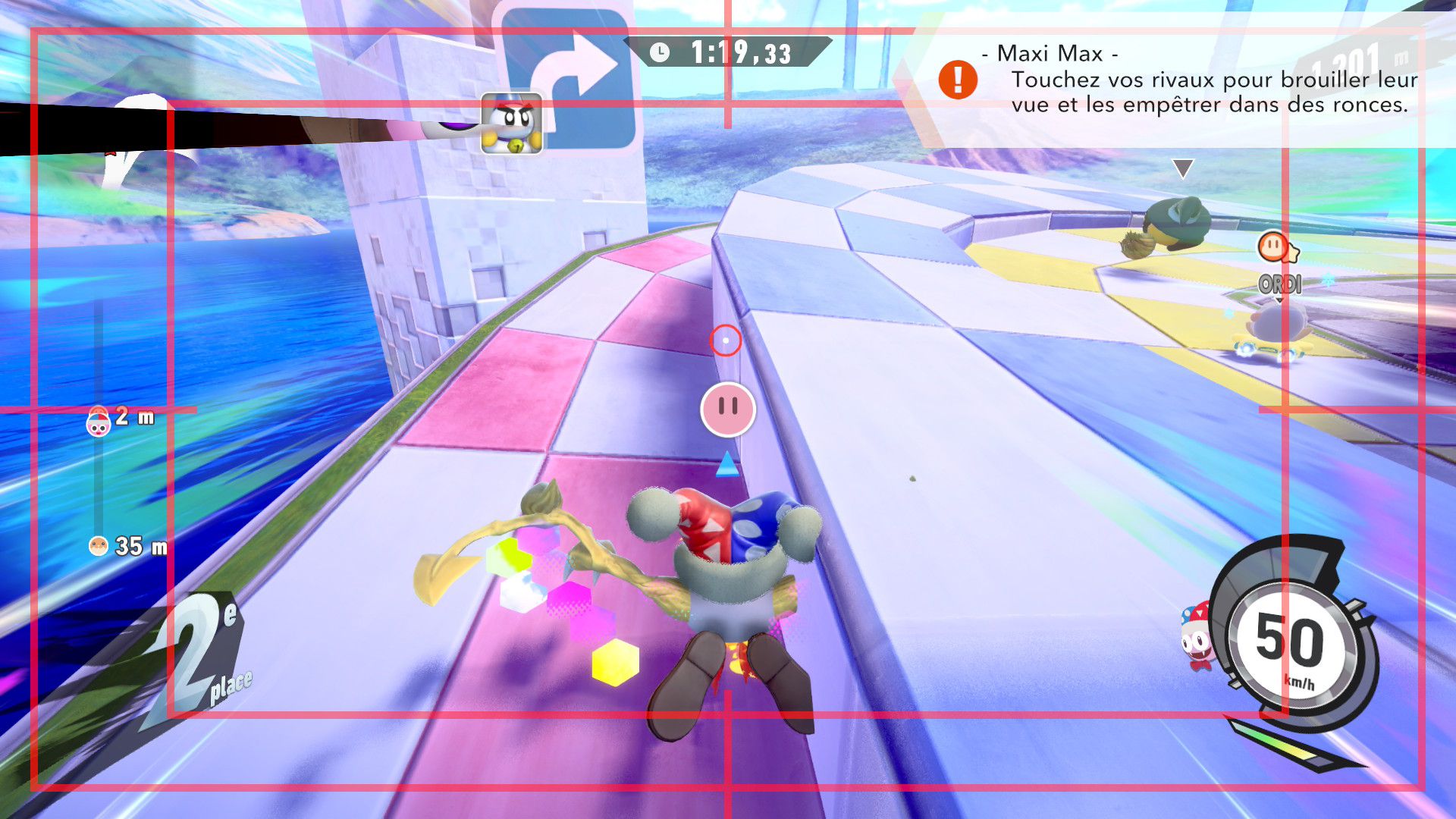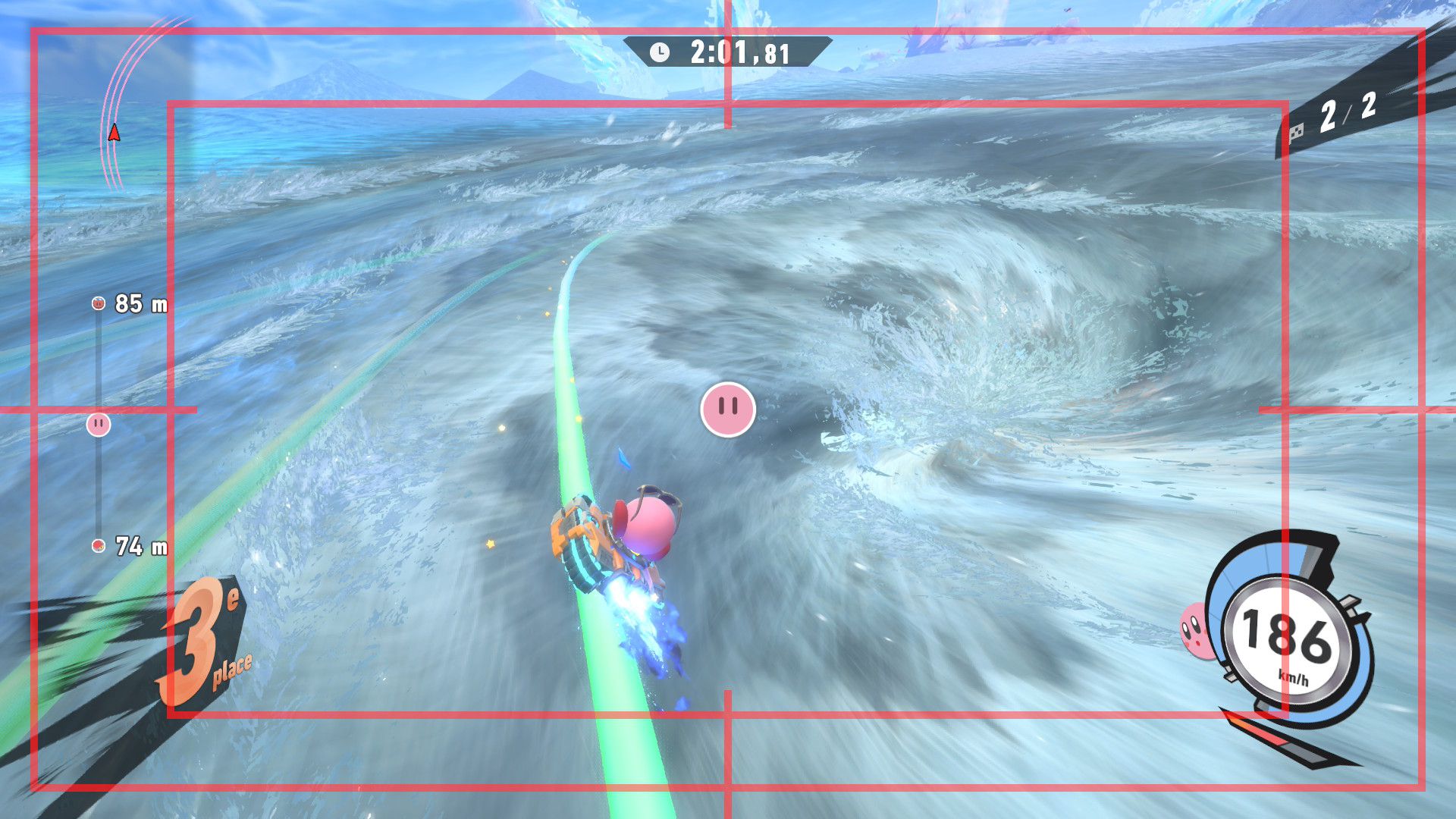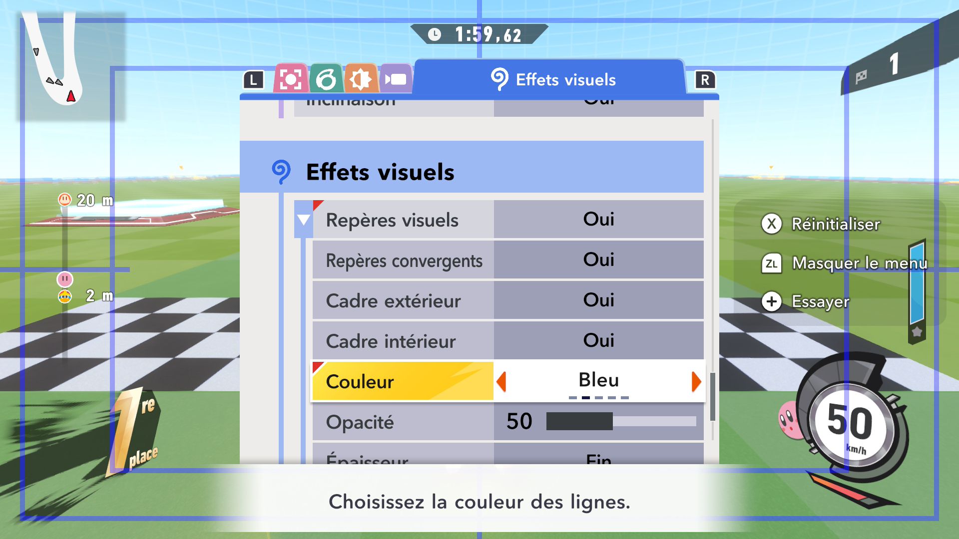 L’auteur de ce test en faisant partie, il paraissait très important d’essayer le jeu en utilisant toutes les options à disposition. Dans les réglages du mouvement de la caméra, il est donc possible d’élargir le champ de vision et de régler la distance de la caméra, le suivi du Rider (en choisissant de le suivre, la caméra se place automatiquement derrière notre personnage quand il se déplace à pied), la vitesse à laquelle tourne la caméra quand on incline le stick R, les secousses provenant des impacts et l’inclinaison de la caméra dans les virages. Le paramétrage des effets visuels est particulièrement important, car il peut fortement réduire les sensations de malaise, voire ne pas les déclencher du tout lorsque l’on est sensible aux mouvements brusques de caméra ou autres éléments pouvant provoquer des troubles plus ou moins importants. On peut donc choisir d’intégrer des repères visuels aux bords de l’écran pour réduire la sensation de mouvement ainsi que des repères convergents pour guider le regard vers le centre, un cadre rectangulaire extérieur et un cadre intérieur aux bords de l’écran, et ensuite de paramétrer leur opacité ainsi que leur épaisseur. Certes, le rendu en jeu est évidemment loin d’être magnifique, mais cela permet de profiter du jeu sans être malade au bout de quelques minutes. On a donc essayé de longues sessions pour voir si ces options sont réellement utiles, et le verdict est sans appel : les mauvaises sensations qui pourraient normalement être ressenties en jouant à un jeu de ce type ne surviennent pas. Pour les personnes qui seraient encore plus sensibles, il est également possible d’ajouter une marque au centre de l’écran pour aider le regard à se fixer et même d’ajuster l’intensité des changements dans le champ de vision pendant le jeu. En jouant à Kirby Air Riders, on se dit qu’il faut absolument que d’autres studios prennent exemple sur ces options, car cela peut permettre tout simplement à encore plus de personnes de profiter de différents types de jeux auxquels elles ne pourraient pas jouer à cause de leurs troubles. À ce niveau, Kirby Air Riders est déjà une véritable réussite. On peut même enregistrer plusieurs sets de paramètres personnalisés, ce qui est très utile étant donné qu’il y a différents modes de jeu où les sensations peuvent ne pas être les mêmes.