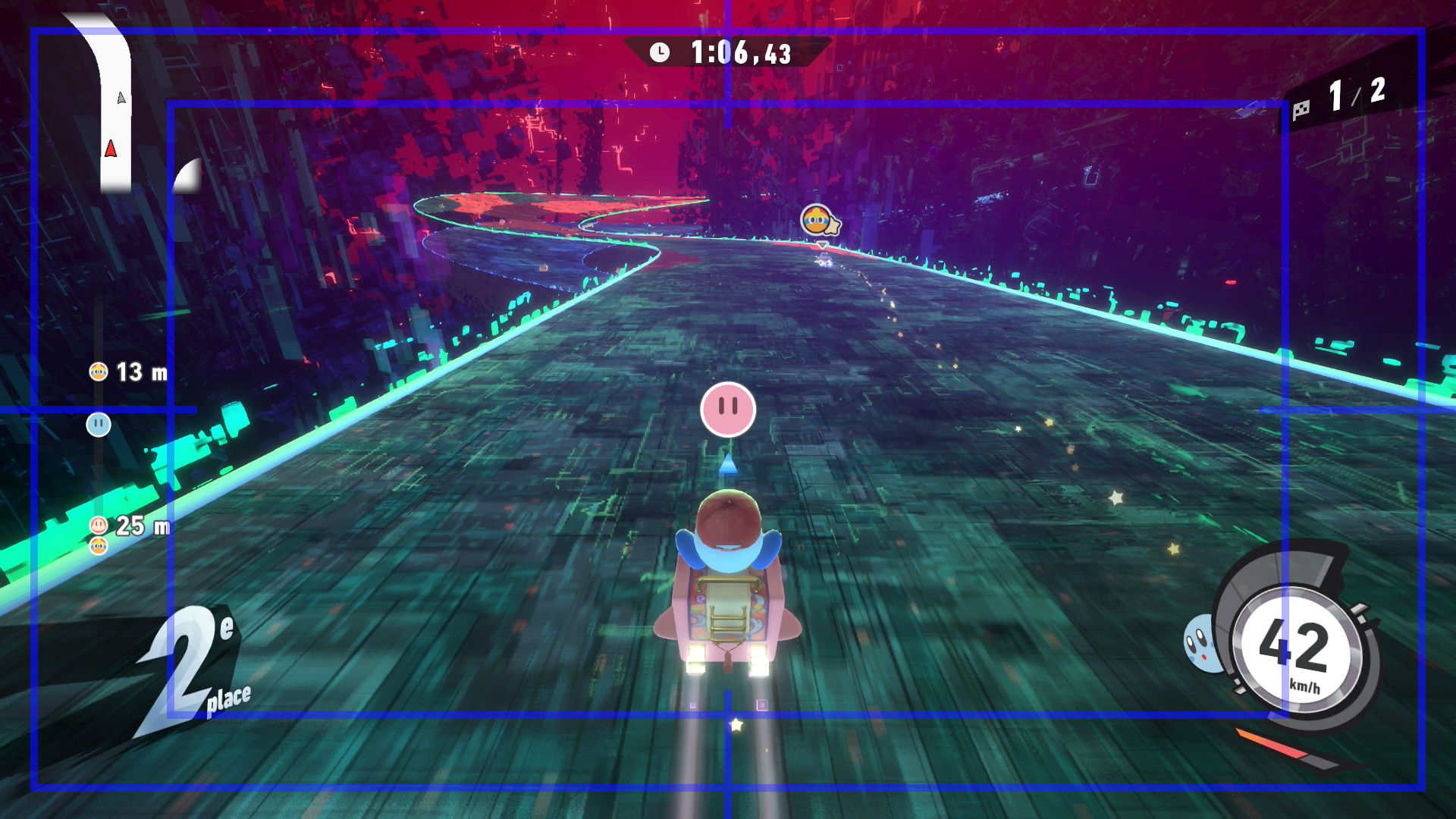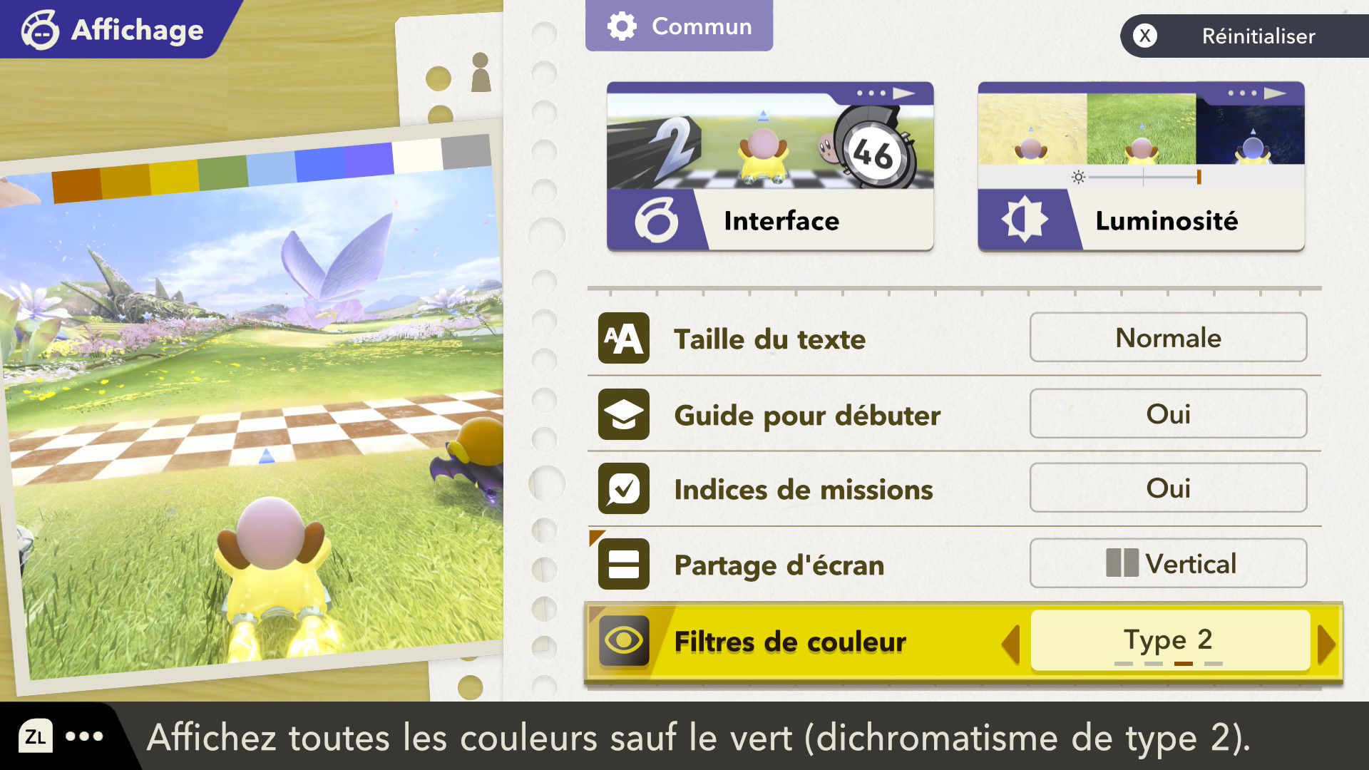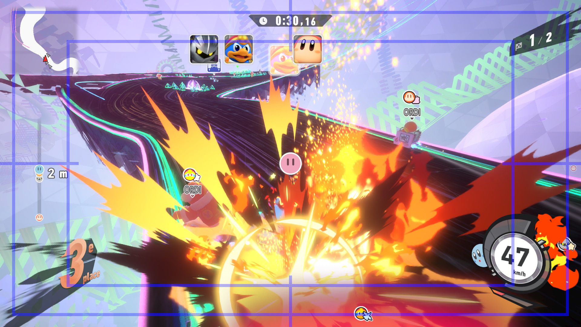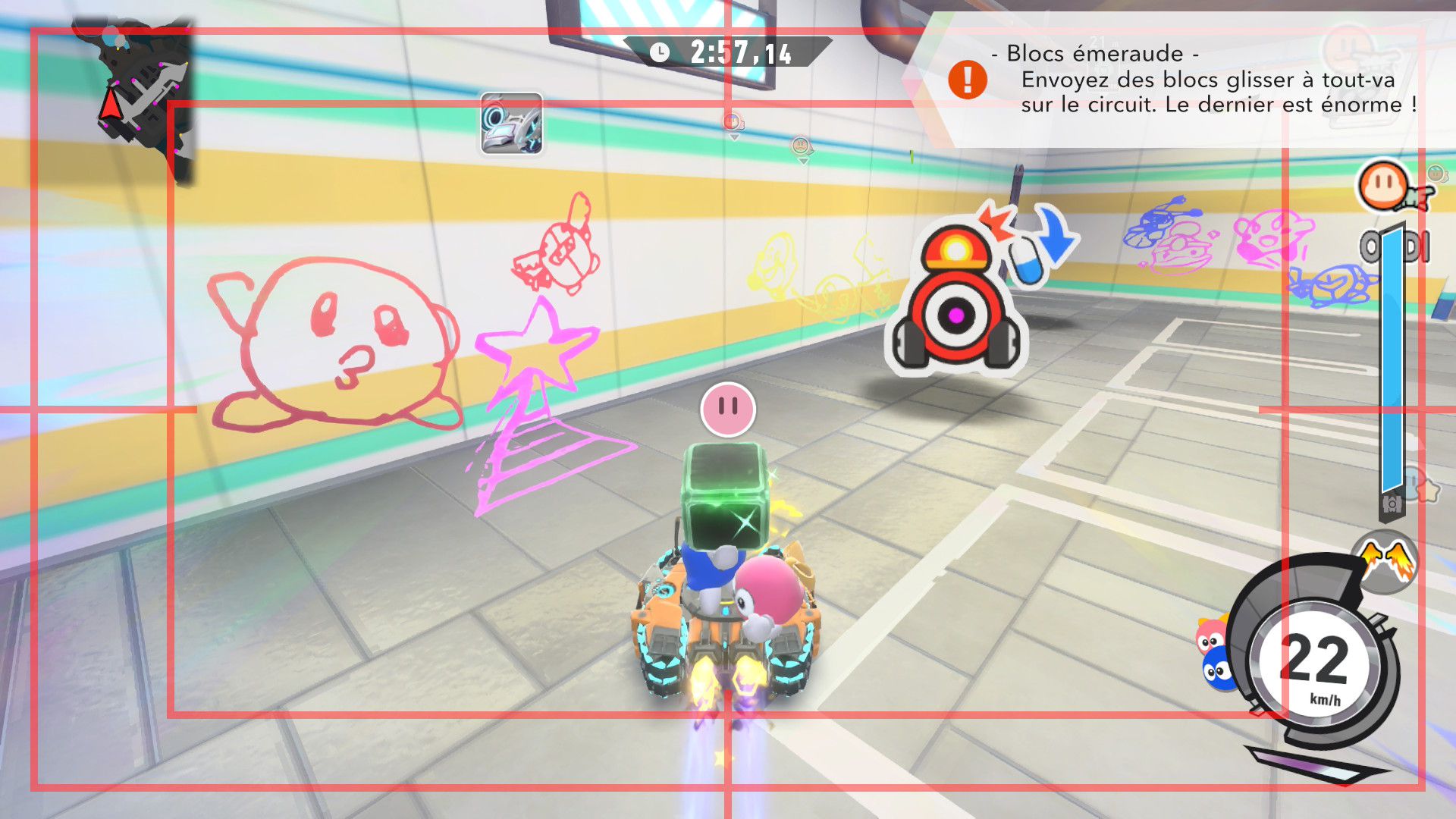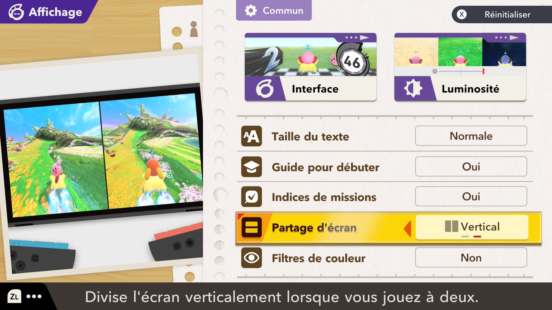 L’auteur de ce test en faisant partie, il paraissait très important d’essayer le jeu en utilisant toutes les options à disposition. Dans les réglages du mouvement de la caméra, il est donc possible d’élargir le champ de vision et de régler la distance de la caméra, le suivi du Rider (en choisissant de le suivre, la caméra se place automatiquement derrière notre personnage quand il se déplace à pied), la vitesse à laquelle tourne la caméra quand on incline le stick R, les secousses provenant des impacts et l’inclinaison de la caméra dans les virages. Le paramétrage des effets visuels est particulièrement important, car il peut fortement réduire les sensations de malaise, voire ne pas les déclencher du tout lorsque l’on est sensible aux mouvements brusques de caméra ou autres éléments pouvant provoquer des troubles plus ou moins importants. On peut donc choisir d’intégrer des repères visuels aux bords de l’écran pour réduire la sensation de mouvement ainsi que des repères convergents pour guider le regard vers le centre, un cadre rectangulaire extérieur et un cadre intérieur aux bords de l’écran, et ensuite de paramétrer leur opacité ainsi que leur épaisseur. Certes, le rendu en jeu est évidemment loin d’être magnifique, mais cela permet de profiter du jeu sans être malade au bout de quelques minutes. On a donc essayé de longues sessions pour voir si ces options sont réellement utiles, et le verdict est sans appel : les mauvaises sensations qui pourraient normalement être ressenties en jouant à un jeu de ce type ne surviennent pas. Pour les personnes qui seraient encore plus sensibles, il est également possible d’ajouter une marque au centre de l’écran pour aider le regard à se fixer et même d’ajuster l’intensité des changements dans le champ de vision pendant le jeu. En jouant à Kirby Air Riders, on se dit qu’il faut absolument que d’autres studios prennent exemple sur ces options, car cela peut permettre tout simplement à encore plus de personnes de profiter de différents types de jeux auxquels elles ne pourraient pas jouer à cause de leurs troubles. À ce niveau, Kirby Air Riders est déjà une véritable réussite. On peut même enregistrer plusieurs sets de paramètres personnalisés, ce qui est très utile étant donné qu’il y a différents modes de jeu où les sensations peuvent ne pas être les mêmes.
