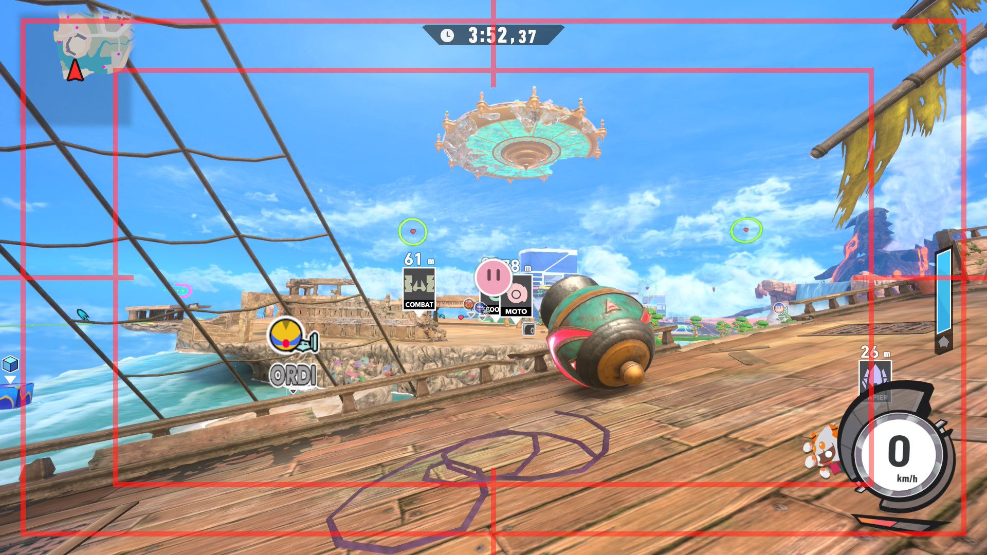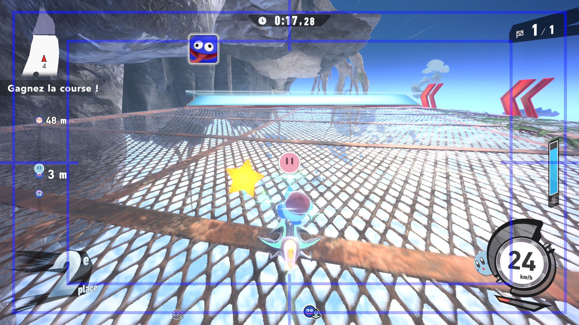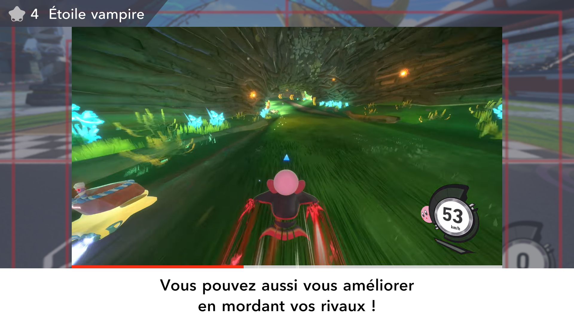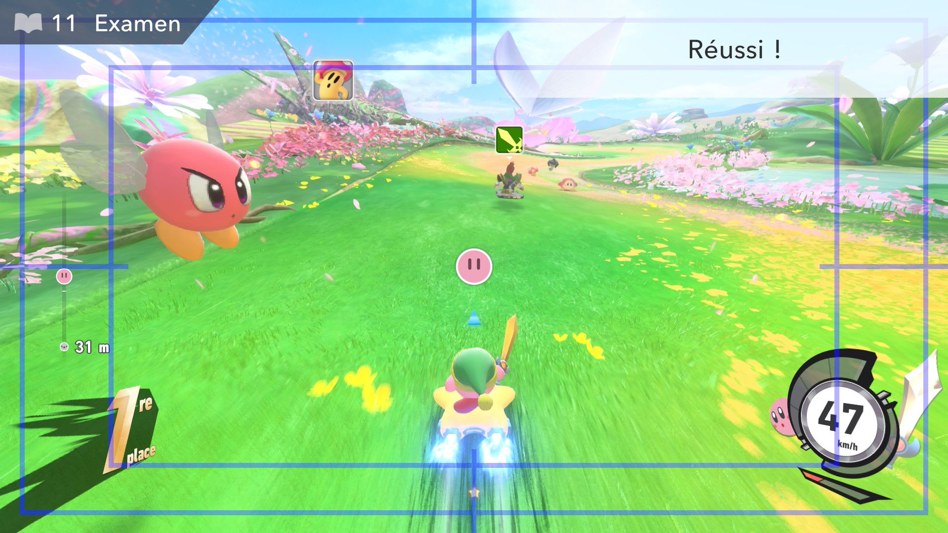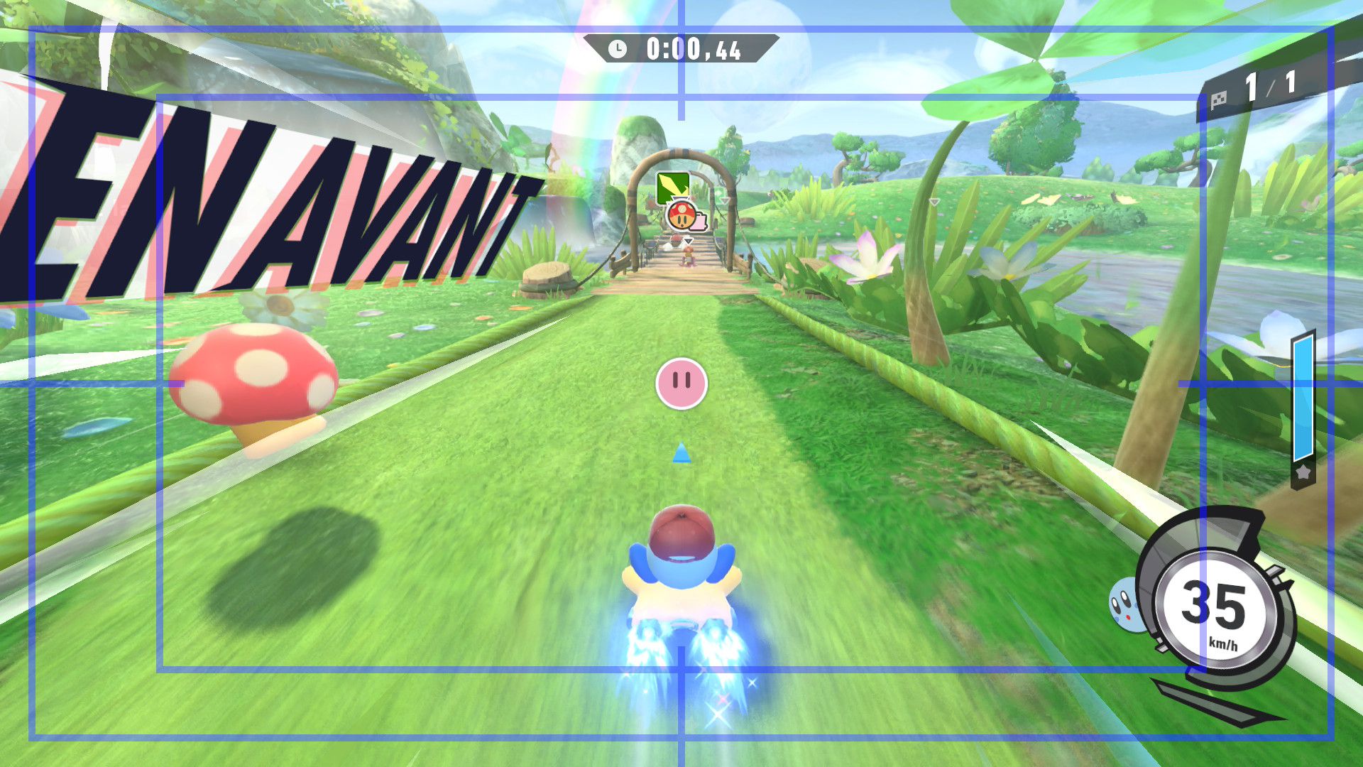 L’auteur de ce test en faisant partie, il paraissait très important d’essayer le jeu en utilisant toutes les options à disposition. Dans les réglages du mouvement de la caméra, il est donc possible d’élargir le champ de vision et de régler la distance de la caméra, le suivi du Rider (en choisissant de le suivre, la caméra se place automatiquement derrière notre personnage quand il se déplace à pied), la vitesse à laquelle tourne la caméra quand on incline le stick R, les secousses provenant des impacts et l’inclinaison de la caméra dans les virages. Le paramétrage des effets visuels est particulièrement important, car il peut fortement réduire les sensations de malaise, voire ne pas les déclencher du tout lorsque l’on est sensible aux mouvements brusques de caméra ou autres éléments pouvant provoquer des troubles plus ou moins importants. On peut donc choisir d’intégrer des repères visuels aux bords de l’écran pour réduire la sensation de mouvement ainsi que des repères convergents pour guider le regard vers le centre, un cadre rectangulaire extérieur et un cadre intérieur aux bords de l’écran, et ensuite de paramétrer leur opacité ainsi que leur épaisseur. Certes, le rendu en jeu est évidemment loin d’être magnifique, mais cela permet de profiter du jeu sans être malade au bout de quelques minutes. On a donc essayé de longues sessions pour voir si ces options sont réellement utiles, et le verdict est sans appel : les mauvaises sensations qui pourraient normalement être ressenties en jouant à un jeu de ce type ne surviennent pas. Pour les personnes qui seraient encore plus sensibles, il est également possible d’ajouter une marque au centre de l’écran pour aider le regard à se fixer et même d’ajuster l’intensité des changements dans le champ de vision pendant le jeu. En jouant à Kirby Air Riders, on se dit qu’il faut absolument que d’autres studios prennent exemple sur ces options, car cela peut permettre tout simplement à encore plus de personnes de profiter de différents types de jeux auxquels elles ne pourraient pas jouer à cause de leurs troubles. À ce niveau, Kirby Air Riders est déjà une véritable réussite. On peut même enregistrer plusieurs sets de paramètres personnalisés, ce qui est très utile étant donné qu’il y a différents modes de jeu où les sensations peuvent ne pas être les mêmes.