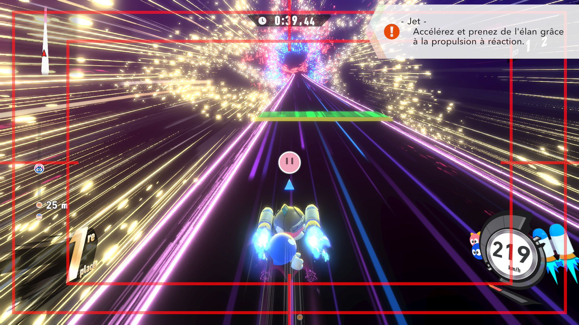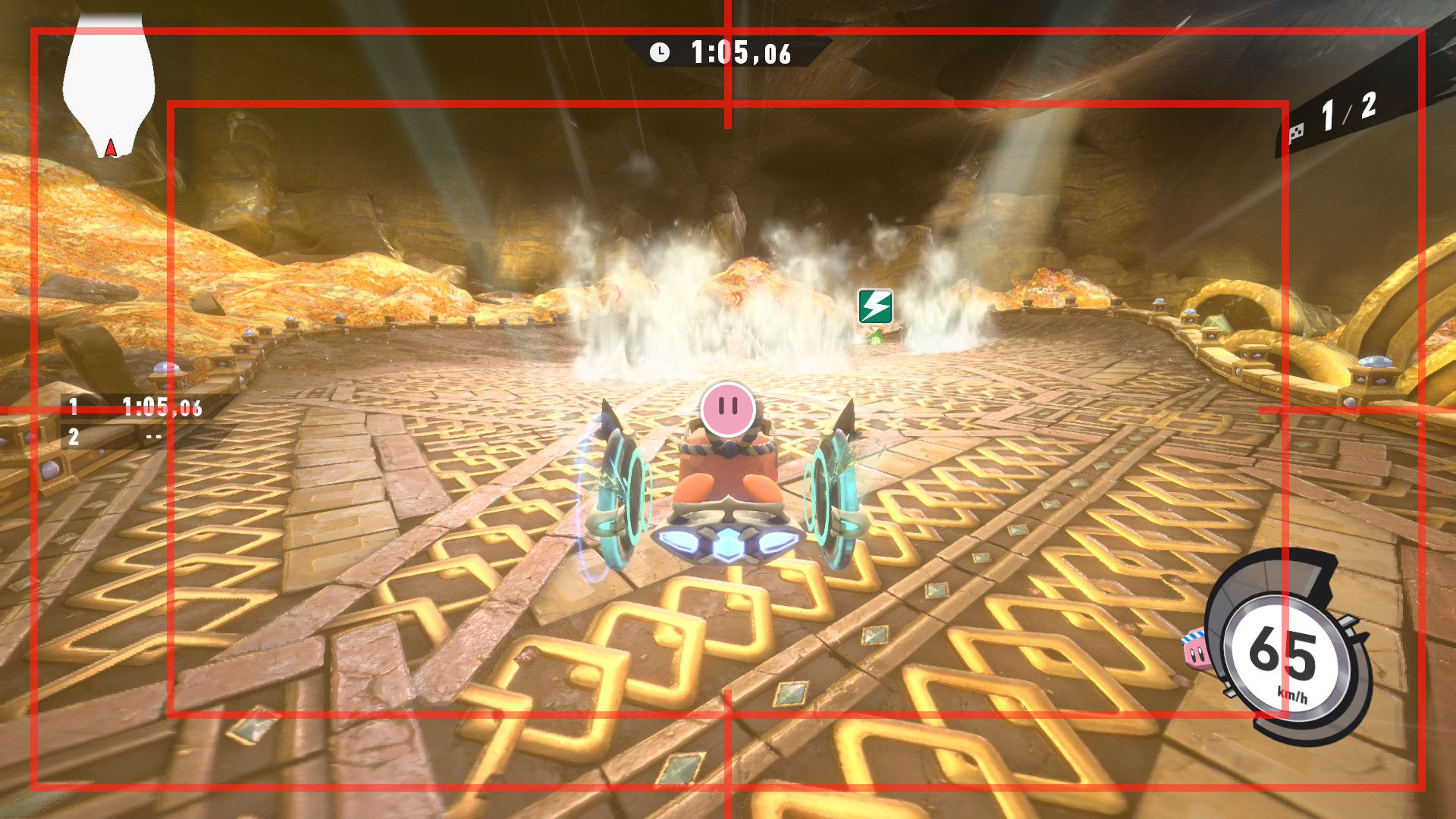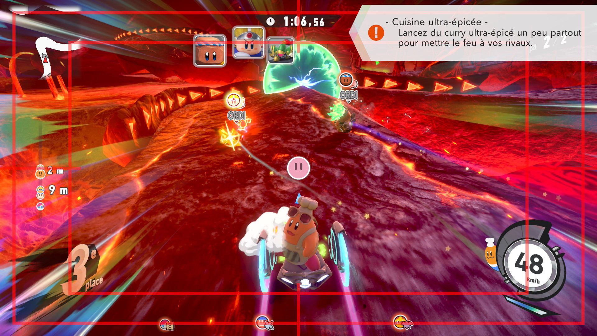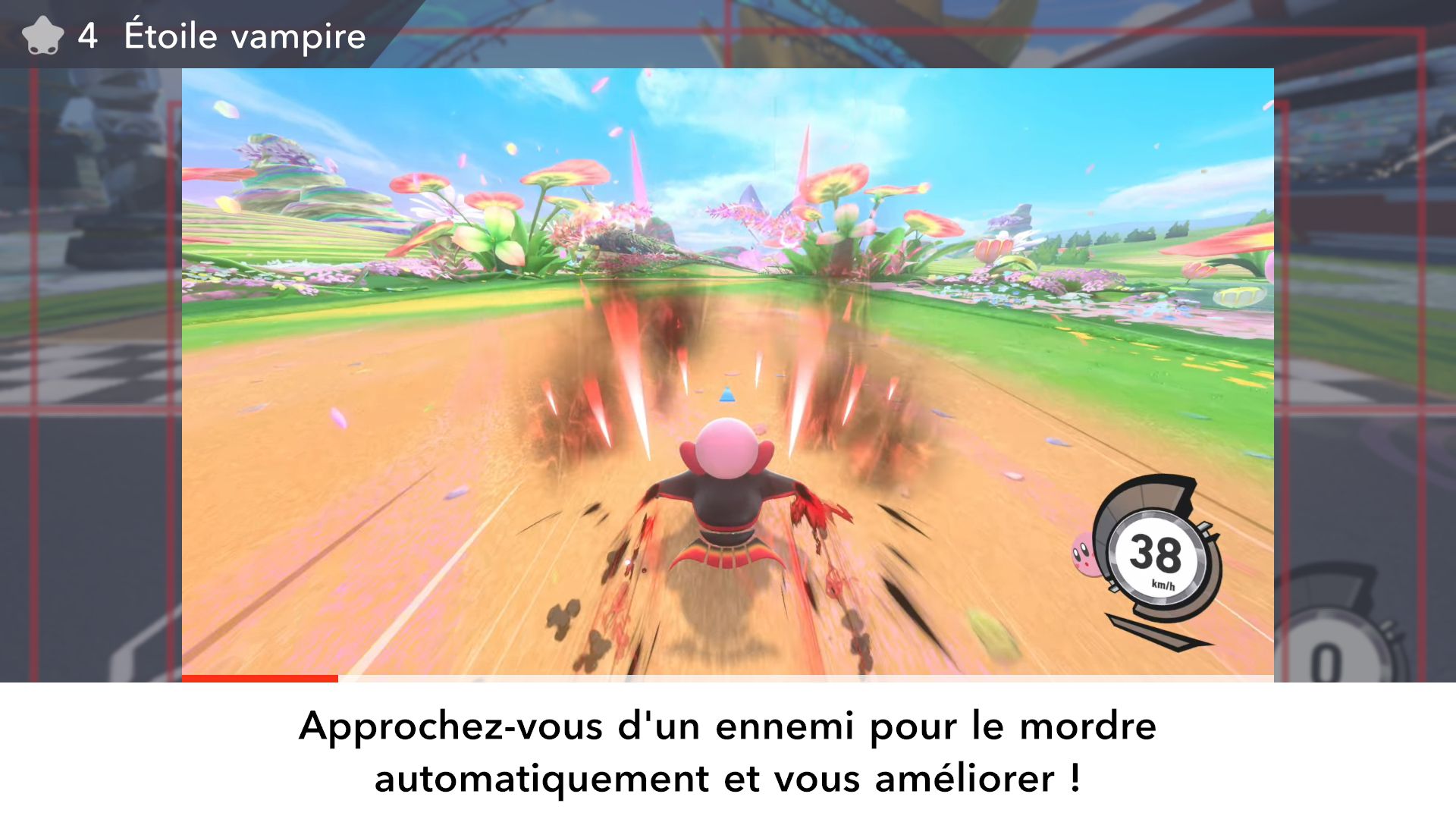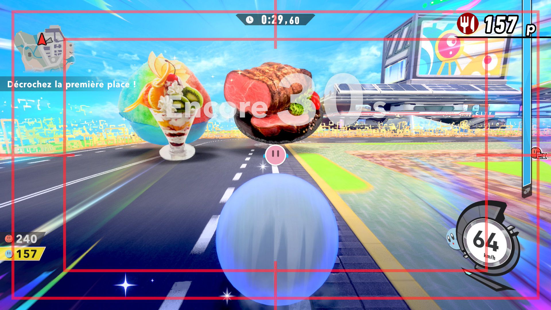 L’auteur de ce test en faisant partie, il paraissait très important d’essayer le jeu en utilisant toutes les options à disposition. Dans les réglages du mouvement de la caméra, il est donc possible d’élargir le champ de vision et de régler la distance de la caméra, le suivi du Rider (en choisissant de le suivre, la caméra se place automatiquement derrière notre personnage quand il se déplace à pied), la vitesse à laquelle tourne la caméra quand on incline le stick R, les secousses provenant des impacts et l’inclinaison de la caméra dans les virages. Le paramétrage des effets visuels est particulièrement important, car il peut fortement réduire les sensations de malaise, voire ne pas les déclencher du tout lorsque l’on est sensible aux mouvements brusques de caméra ou autres éléments pouvant provoquer des troubles plus ou moins importants. On peut donc choisir d’intégrer des repères visuels aux bords de l’écran pour réduire la sensation de mouvement ainsi que des repères convergents pour guider le regard vers le centre, un cadre rectangulaire extérieur et un cadre intérieur aux bords de l’écran, et ensuite de paramétrer leur opacité ainsi que leur épaisseur. Certes, le rendu en jeu est évidemment loin d’être magnifique, mais cela permet de profiter du jeu sans être malade au bout de quelques minutes. On a donc essayé de longues sessions pour voir si ces options sont réellement utiles, et le verdict est sans appel : les mauvaises sensations qui pourraient normalement être ressenties en jouant à un jeu de ce type ne surviennent pas. Pour les personnes qui seraient encore plus sensibles, il est également possible d’ajouter une marque au centre de l’écran pour aider le regard à se fixer et même d’ajuster l’intensité des changements dans le champ de vision pendant le jeu. En jouant à Kirby Air Riders, on se dit qu’il faut absolument que d’autres studios prennent exemple sur ces options, car cela peut permettre tout simplement à encore plus de personnes de profiter de différents types de jeux auxquels elles ne pourraient pas jouer à cause de leurs troubles. À ce niveau, Kirby Air Riders est déjà une véritable réussite. On peut même enregistrer plusieurs sets de paramètres personnalisés, ce qui est très utile étant donné qu’il y a différents modes de jeu où les sensations peuvent ne pas être les mêmes.