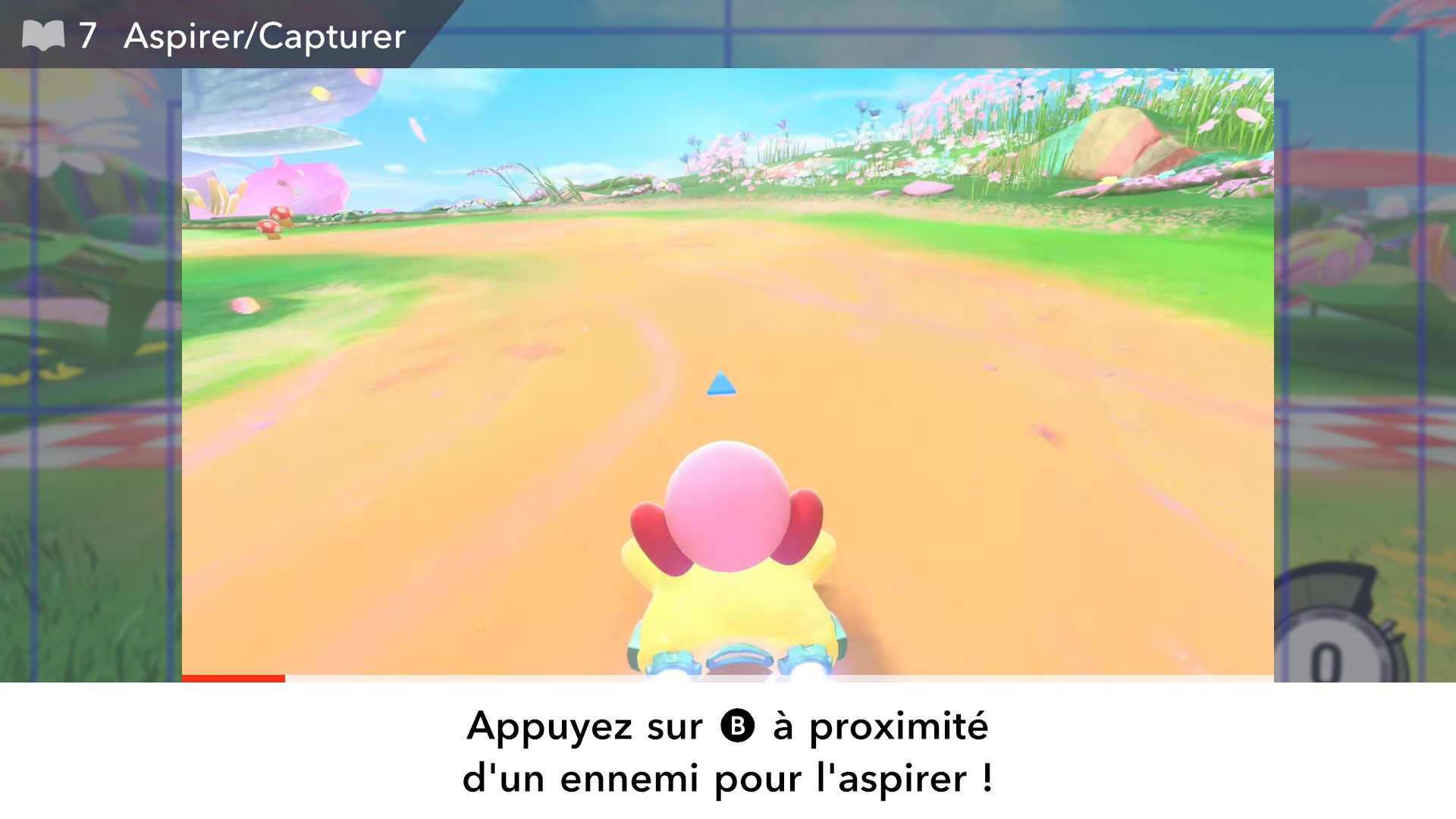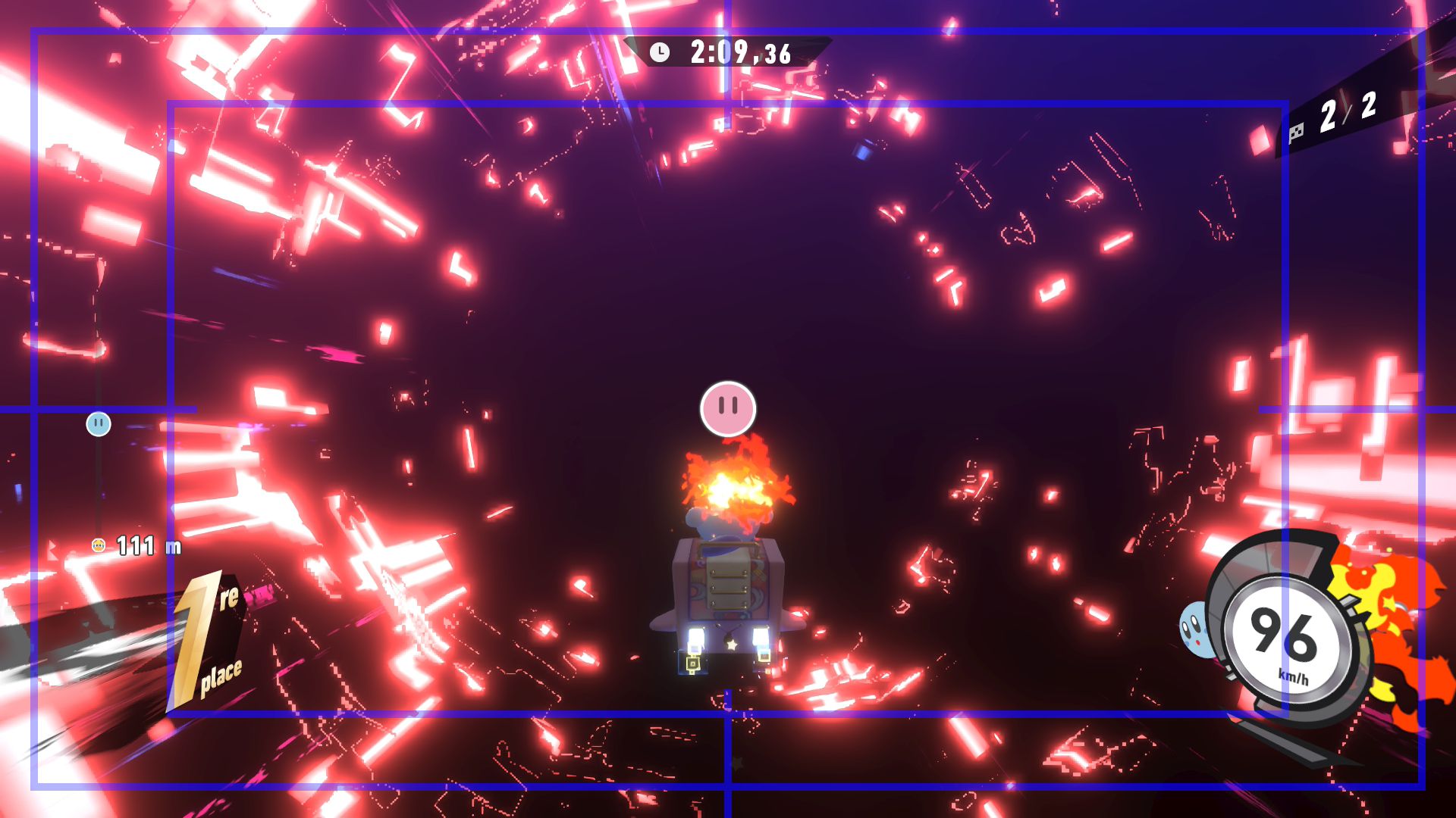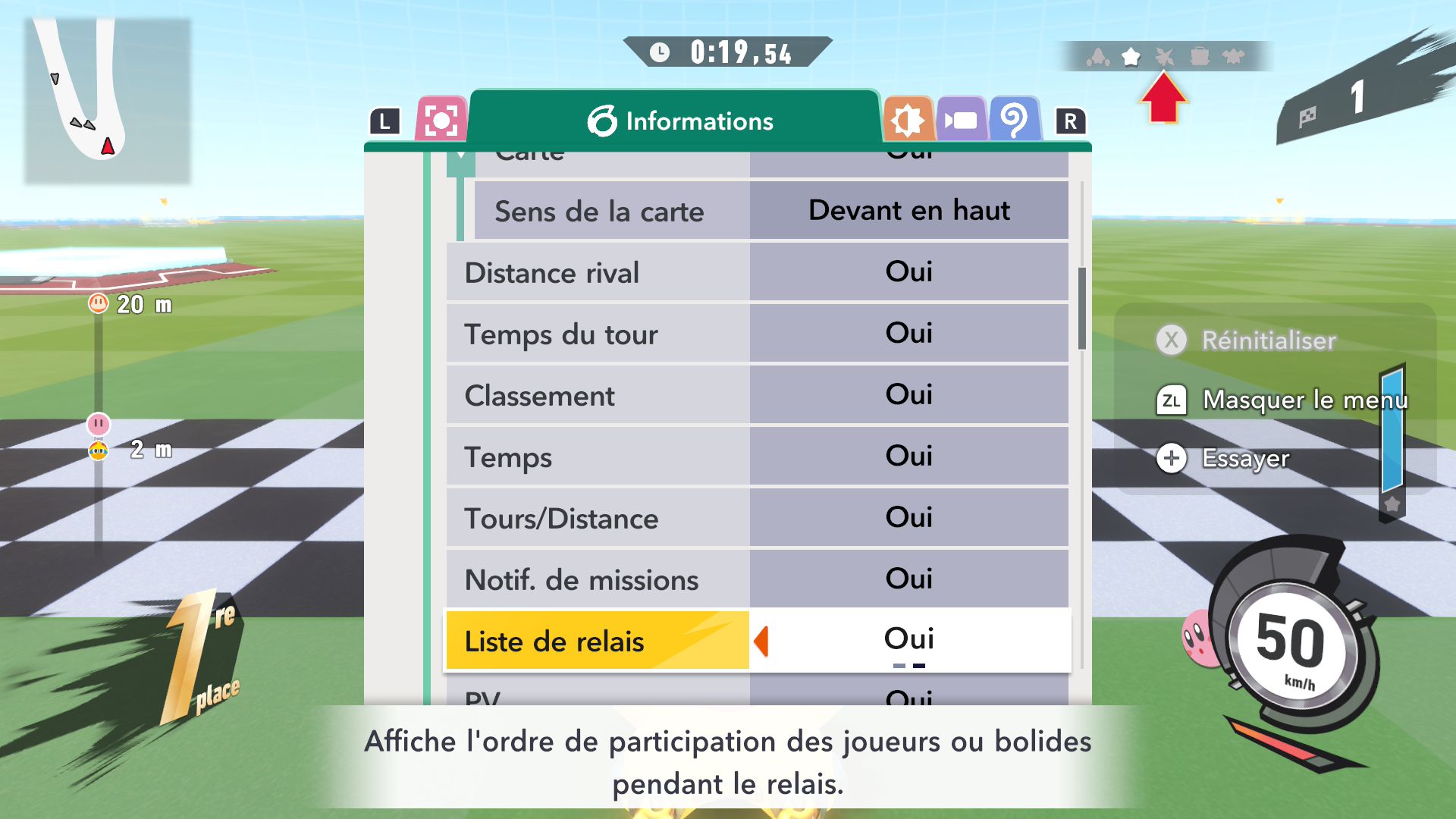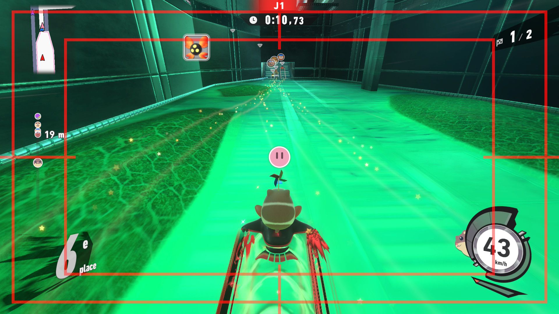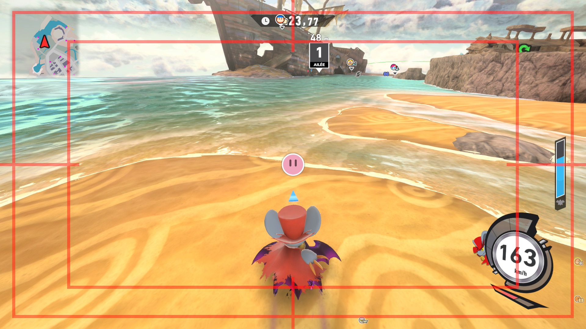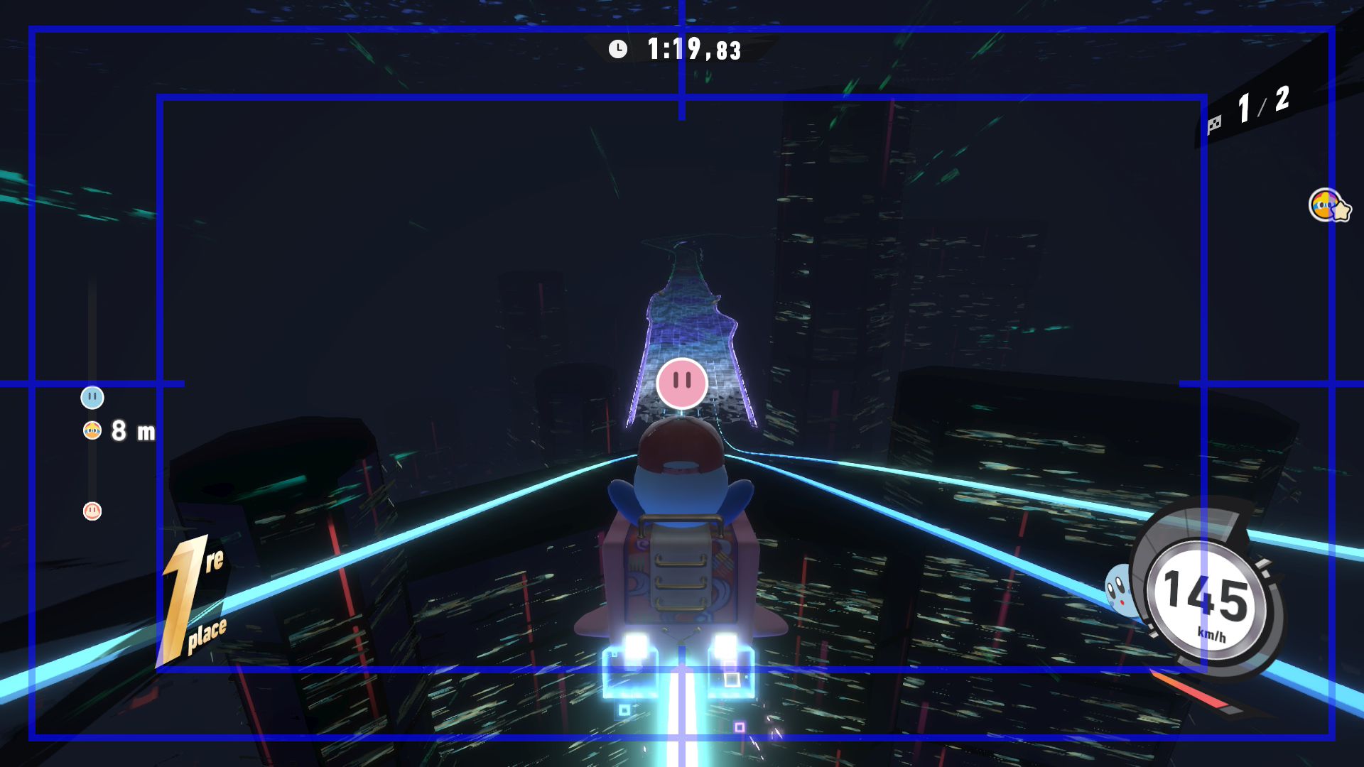 L’auteur de ce test en faisant partie, il paraissait très important d’essayer le jeu en utilisant toutes les options à disposition. Dans les réglages du mouvement de la caméra, il est donc possible d’élargir le champ de vision et de régler la distance de la caméra, le suivi du Rider (en choisissant de le suivre, la caméra se place automatiquement derrière notre personnage quand il se déplace à pied), la vitesse à laquelle tourne la caméra quand on incline le stick R, les secousses provenant des impacts et l’inclinaison de la caméra dans les virages. Le paramétrage des effets visuels est particulièrement important, car il peut fortement réduire les sensations de malaise, voire ne pas les déclencher du tout lorsque l’on est sensible aux mouvements brusques de caméra ou autres éléments pouvant provoquer des troubles plus ou moins importants. On peut donc choisir d’intégrer des repères visuels aux bords de l’écran pour réduire la sensation de mouvement ainsi que des repères convergents pour guider le regard vers le centre, un cadre rectangulaire extérieur et un cadre intérieur aux bords de l’écran, et ensuite de paramétrer leur opacité ainsi que leur épaisseur. Certes, le rendu en jeu est évidemment loin d’être magnifique, mais cela permet de profiter du jeu sans être malade au bout de quelques minutes. On a donc essayé de longues sessions pour voir si ces options sont réellement utiles, et le verdict est sans appel : les mauvaises sensations qui pourraient normalement être ressenties en jouant à un jeu de ce type ne surviennent pas. Pour les personnes qui seraient encore plus sensibles, il est également possible d’ajouter une marque au centre de l’écran pour aider le regard à se fixer et même d’ajuster l’intensité des changements dans le champ de vision pendant le jeu. En jouant à Kirby Air Riders, on se dit qu’il faut absolument que d’autres studios prennent exemple sur ces options, car cela peut permettre tout simplement à encore plus de personnes de profiter de différents types de jeux auxquels elles ne pourraient pas jouer à cause de leurs troubles. À ce niveau, Kirby Air Riders est déjà une véritable réussite. On peut même enregistrer plusieurs sets de paramètres personnalisés, ce qui est très utile étant donné qu’il y a différents modes de jeu où les sensations peuvent ne pas être les mêmes.