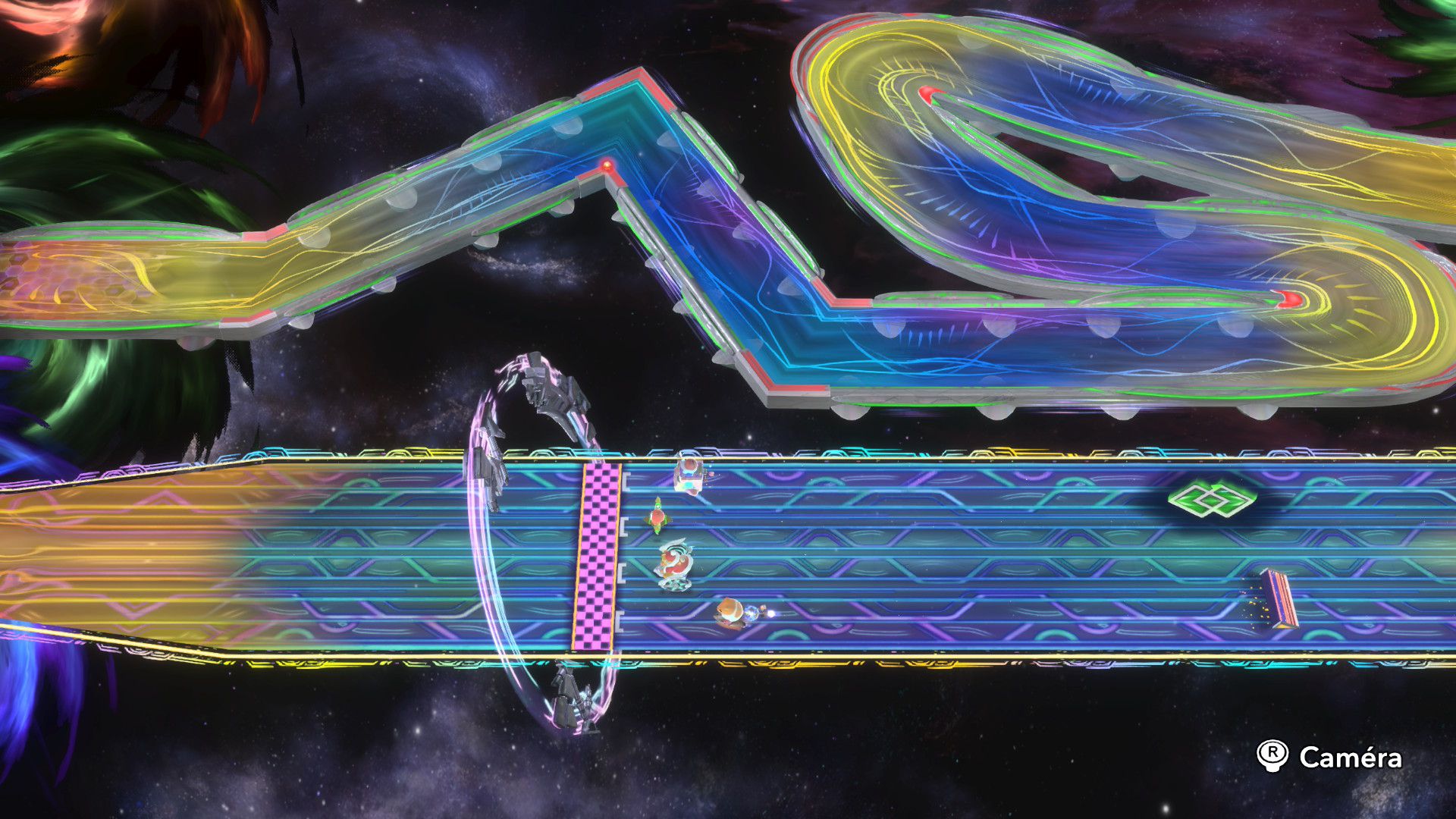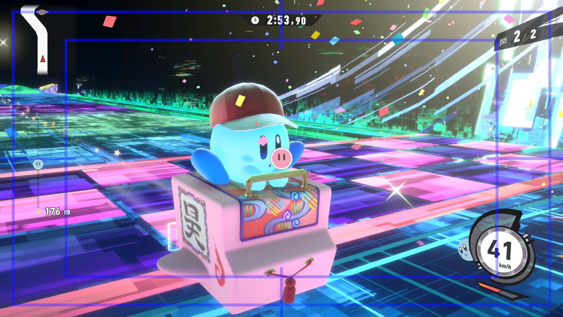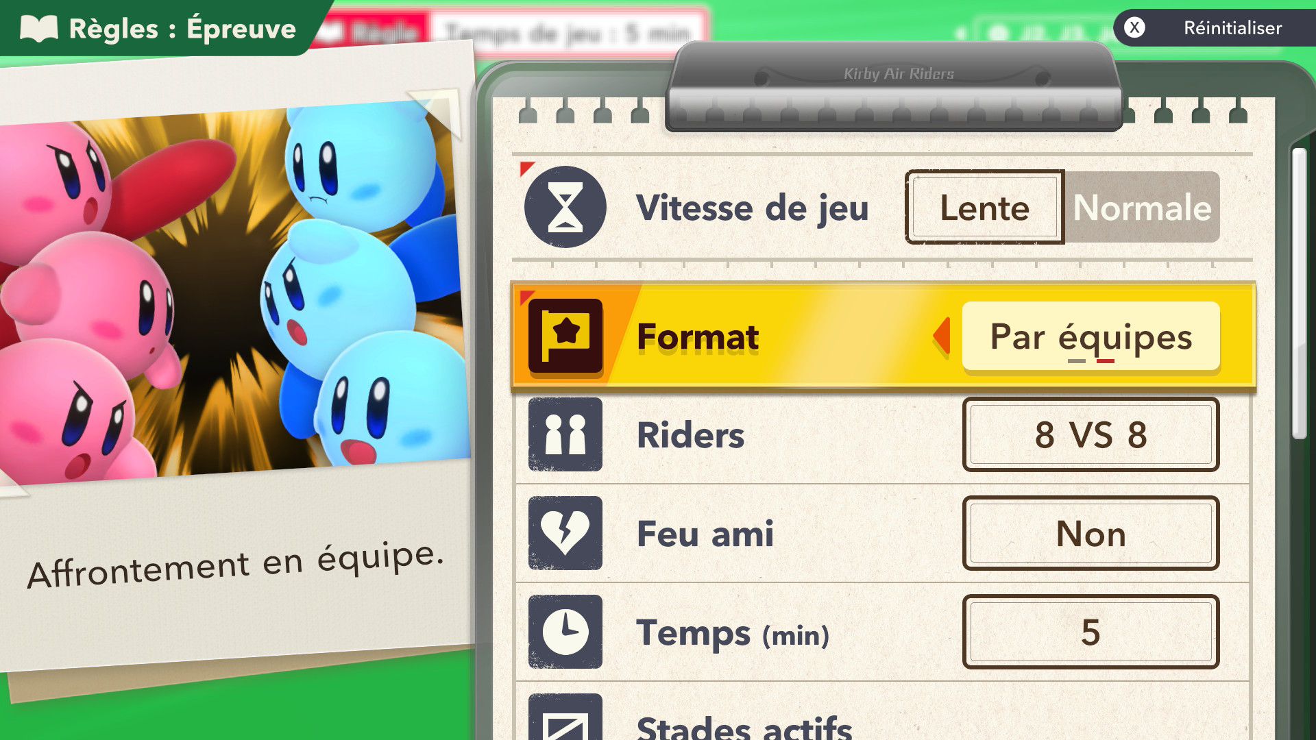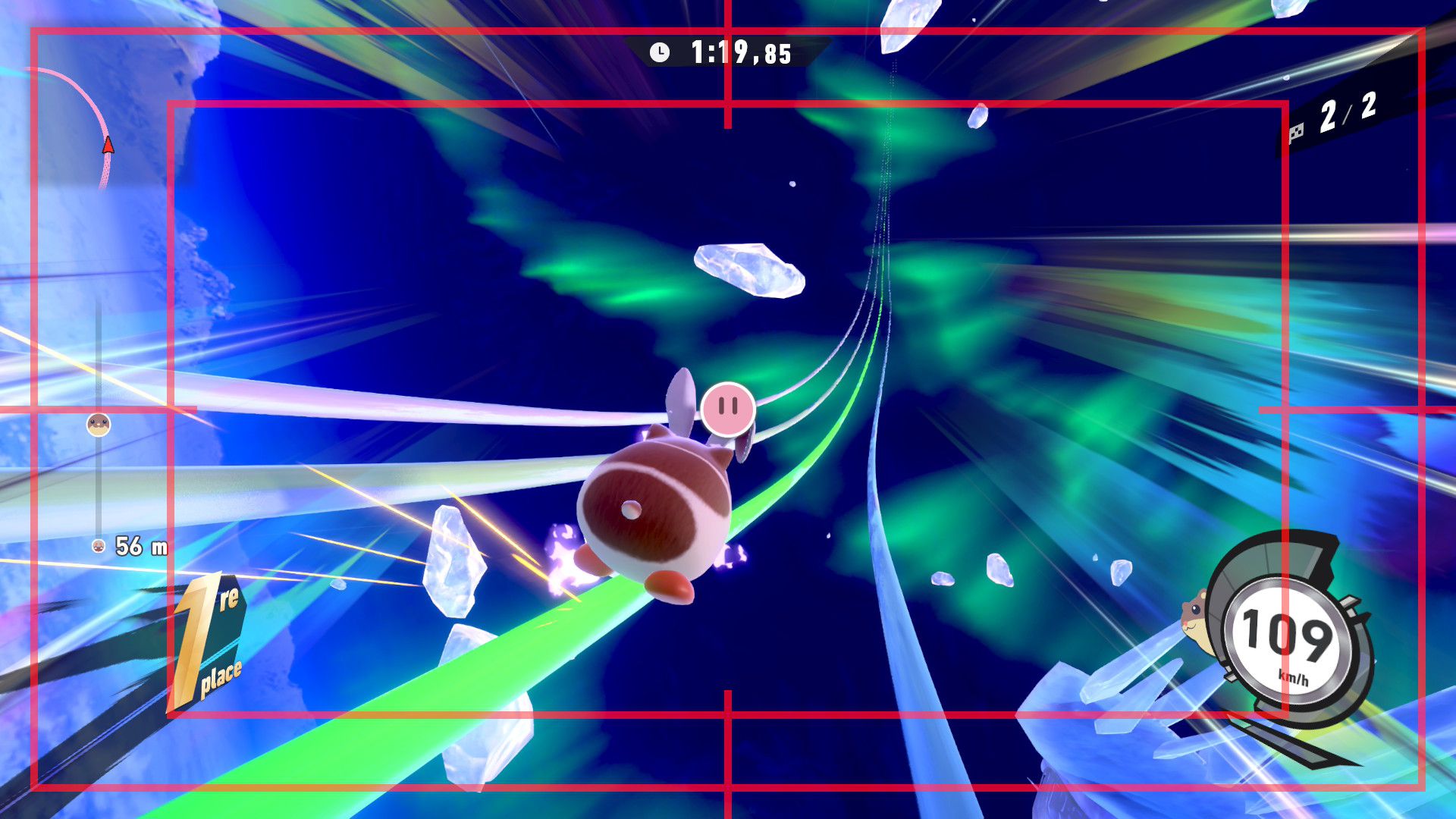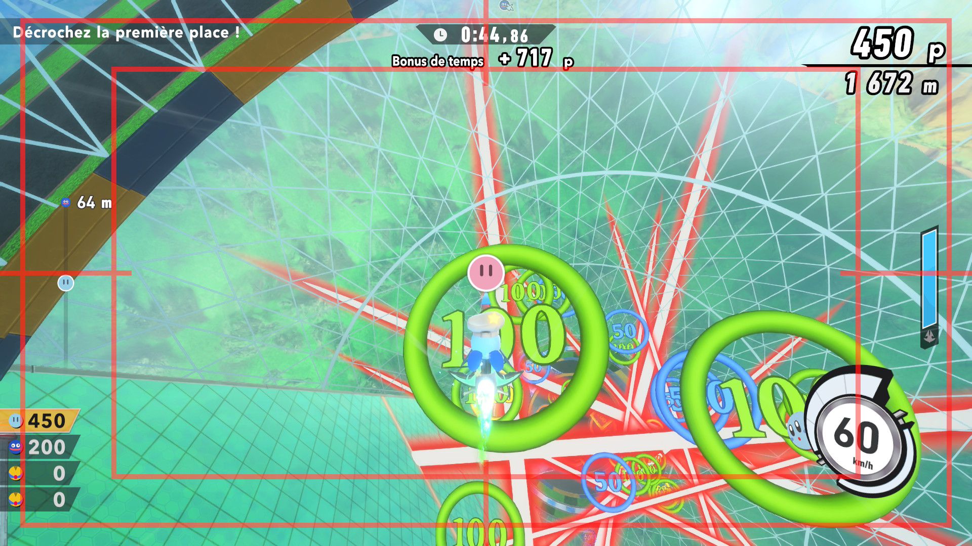 L’auteur de ce test en faisant partie, il paraissait très important d’essayer le jeu en utilisant toutes les options à disposition. Dans les réglages du mouvement de la caméra, il est donc possible d’élargir le champ de vision et de régler la distance de la caméra, le suivi du Rider (en choisissant de le suivre, la caméra se place automatiquement derrière notre personnage quand il se déplace à pied), la vitesse à laquelle tourne la caméra quand on incline le stick R, les secousses provenant des impacts et l’inclinaison de la caméra dans les virages. Le paramétrage des effets visuels est particulièrement important, car il peut fortement réduire les sensations de malaise, voire ne pas les déclencher du tout lorsque l’on est sensible aux mouvements brusques de caméra ou autres éléments pouvant provoquer des troubles plus ou moins importants. On peut donc choisir d’intégrer des repères visuels aux bords de l’écran pour réduire la sensation de mouvement ainsi que des repères convergents pour guider le regard vers le centre, un cadre rectangulaire extérieur et un cadre intérieur aux bords de l’écran, et ensuite de paramétrer leur opacité ainsi que leur épaisseur. Certes, le rendu en jeu est évidemment loin d’être magnifique, mais cela permet de profiter du jeu sans être malade au bout de quelques minutes. On a donc essayé de longues sessions pour voir si ces options sont réellement utiles, et le verdict est sans appel : les mauvaises sensations qui pourraient normalement être ressenties en jouant à un jeu de ce type ne surviennent pas. Pour les personnes qui seraient encore plus sensibles, il est également possible d’ajouter une marque au centre de l’écran pour aider le regard à se fixer et même d’ajuster l’intensité des changements dans le champ de vision pendant le jeu. En jouant à Kirby Air Riders, on se dit qu’il faut absolument que d’autres studios prennent exemple sur ces options, car cela peut permettre tout simplement à encore plus de personnes de profiter de différents types de jeux auxquels elles ne pourraient pas jouer à cause de leurs troubles. À ce niveau, Kirby Air Riders est déjà une véritable réussite. On peut même enregistrer plusieurs sets de paramètres personnalisés, ce qui est très utile étant donné qu’il y a différents modes de jeu où les sensations peuvent ne pas être les mêmes.