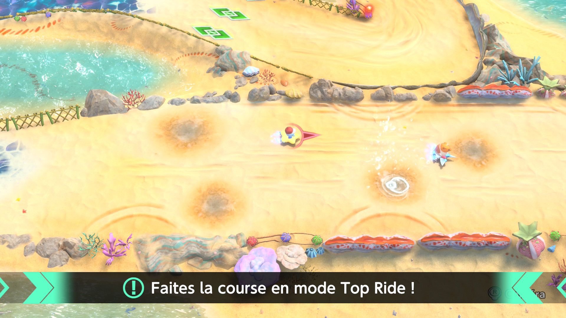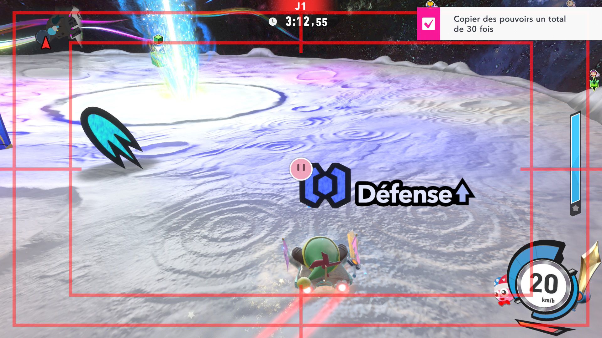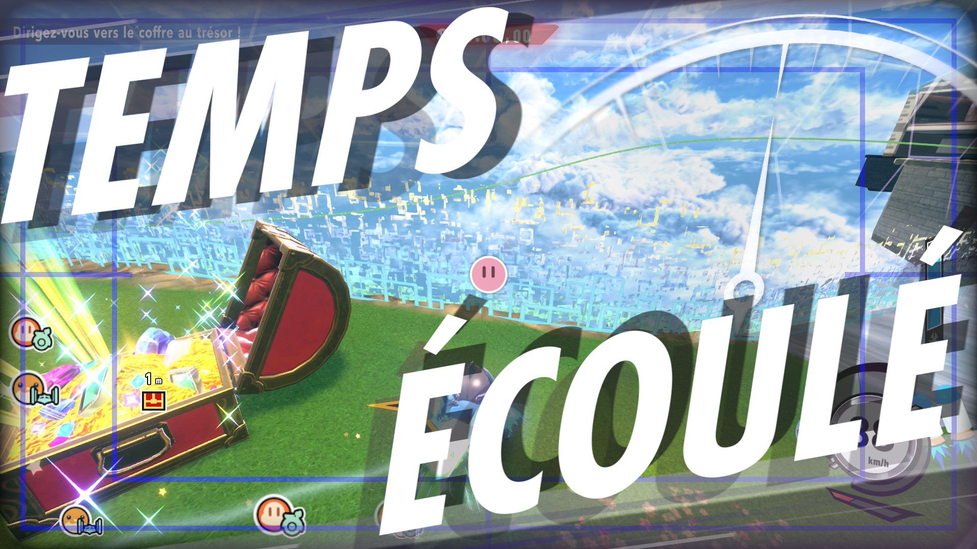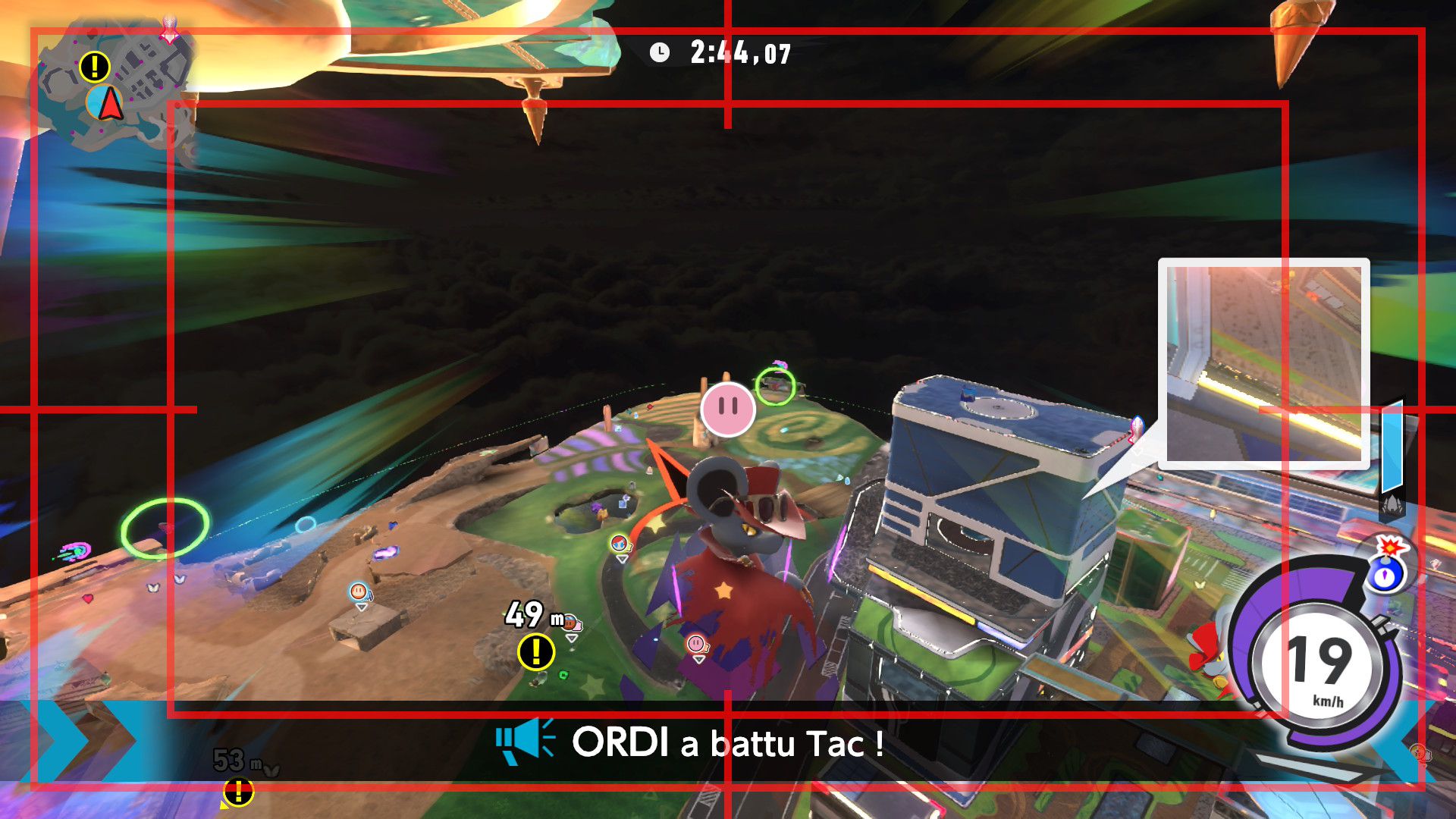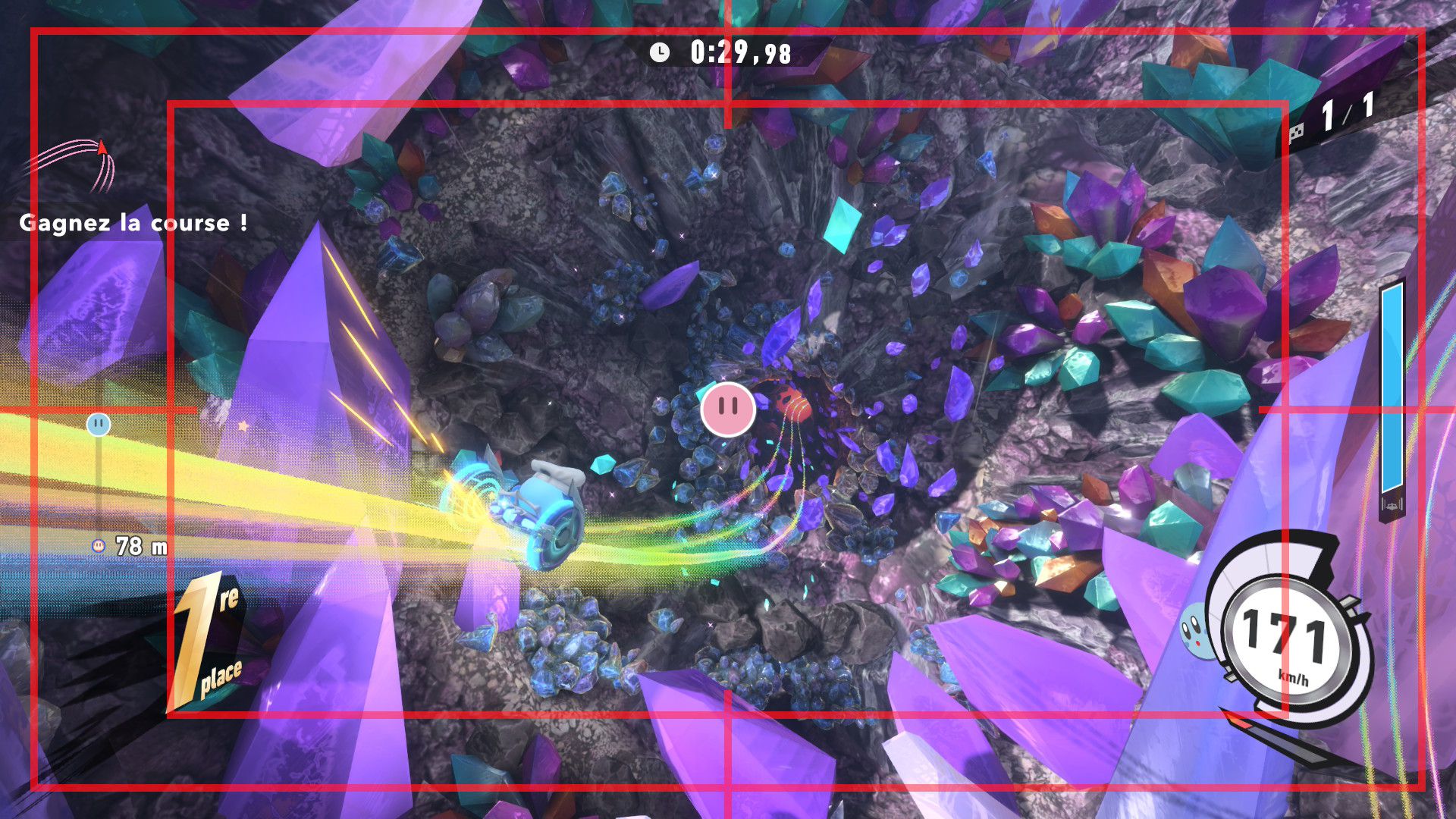 L’auteur de ce test en faisant partie, il paraissait très important d’essayer le jeu en utilisant toutes les options à disposition. Dans les réglages du mouvement de la caméra, il est donc possible d’élargir le champ de vision et de régler la distance de la caméra, le suivi du Rider (en choisissant de le suivre, la caméra se place automatiquement derrière notre personnage quand il se déplace à pied), la vitesse à laquelle tourne la caméra quand on incline le stick R, les secousses provenant des impacts et l’inclinaison de la caméra dans les virages. Le paramétrage des effets visuels est particulièrement important, car il peut fortement réduire les sensations de malaise, voire ne pas les déclencher du tout lorsque l’on est sensible aux mouvements brusques de caméra ou autres éléments pouvant provoquer des troubles plus ou moins importants. On peut donc choisir d’intégrer des repères visuels aux bords de l’écran pour réduire la sensation de mouvement ainsi que des repères convergents pour guider le regard vers le centre, un cadre rectangulaire extérieur et un cadre intérieur aux bords de l’écran, et ensuite de paramétrer leur opacité ainsi que leur épaisseur. Certes, le rendu en jeu est évidemment loin d’être magnifique, mais cela permet de profiter du jeu sans être malade au bout de quelques minutes. On a donc essayé de longues sessions pour voir si ces options sont réellement utiles, et le verdict est sans appel : les mauvaises sensations qui pourraient normalement être ressenties en jouant à un jeu de ce type ne surviennent pas. Pour les personnes qui seraient encore plus sensibles, il est également possible d’ajouter une marque au centre de l’écran pour aider le regard à se fixer et même d’ajuster l’intensité des changements dans le champ de vision pendant le jeu. En jouant à Kirby Air Riders, on se dit qu’il faut absolument que d’autres studios prennent exemple sur ces options, car cela peut permettre tout simplement à encore plus de personnes de profiter de différents types de jeux auxquels elles ne pourraient pas jouer à cause de leurs troubles. À ce niveau, Kirby Air Riders est déjà une véritable réussite. On peut même enregistrer plusieurs sets de paramètres personnalisés, ce qui est très utile étant donné qu’il y a différents modes de jeu où les sensations peuvent ne pas être les mêmes.