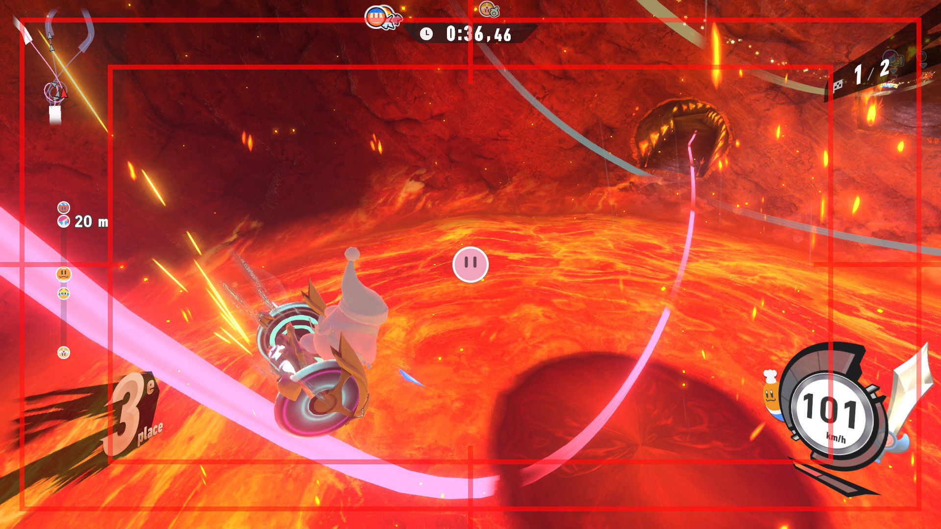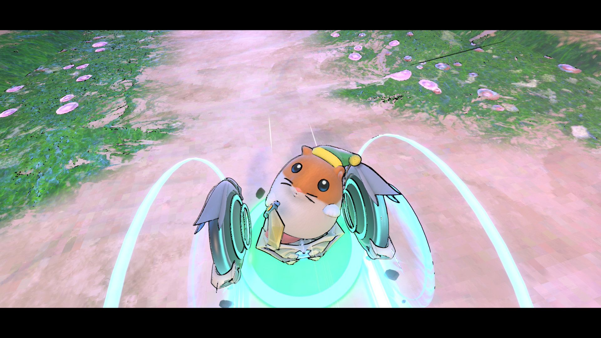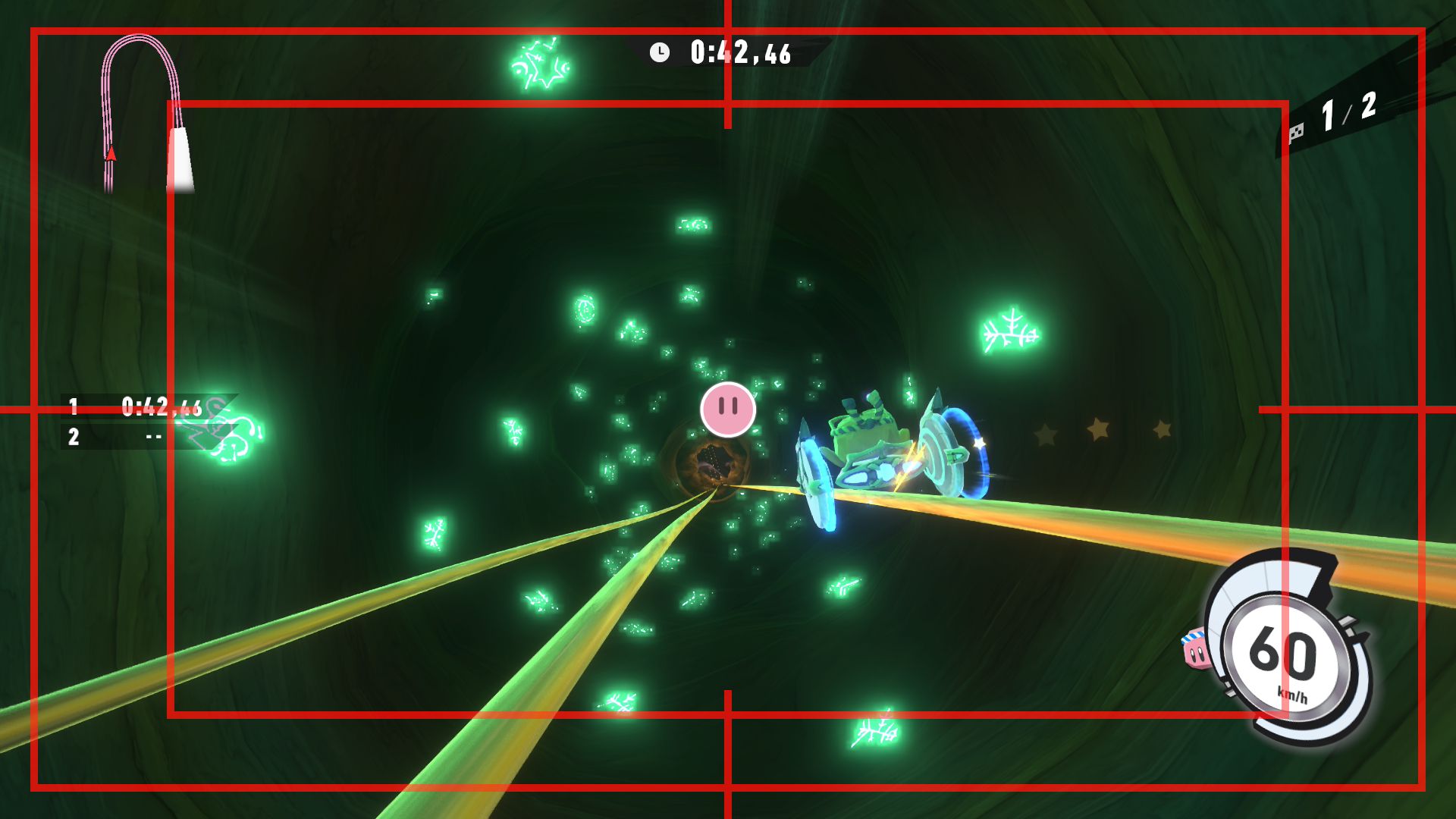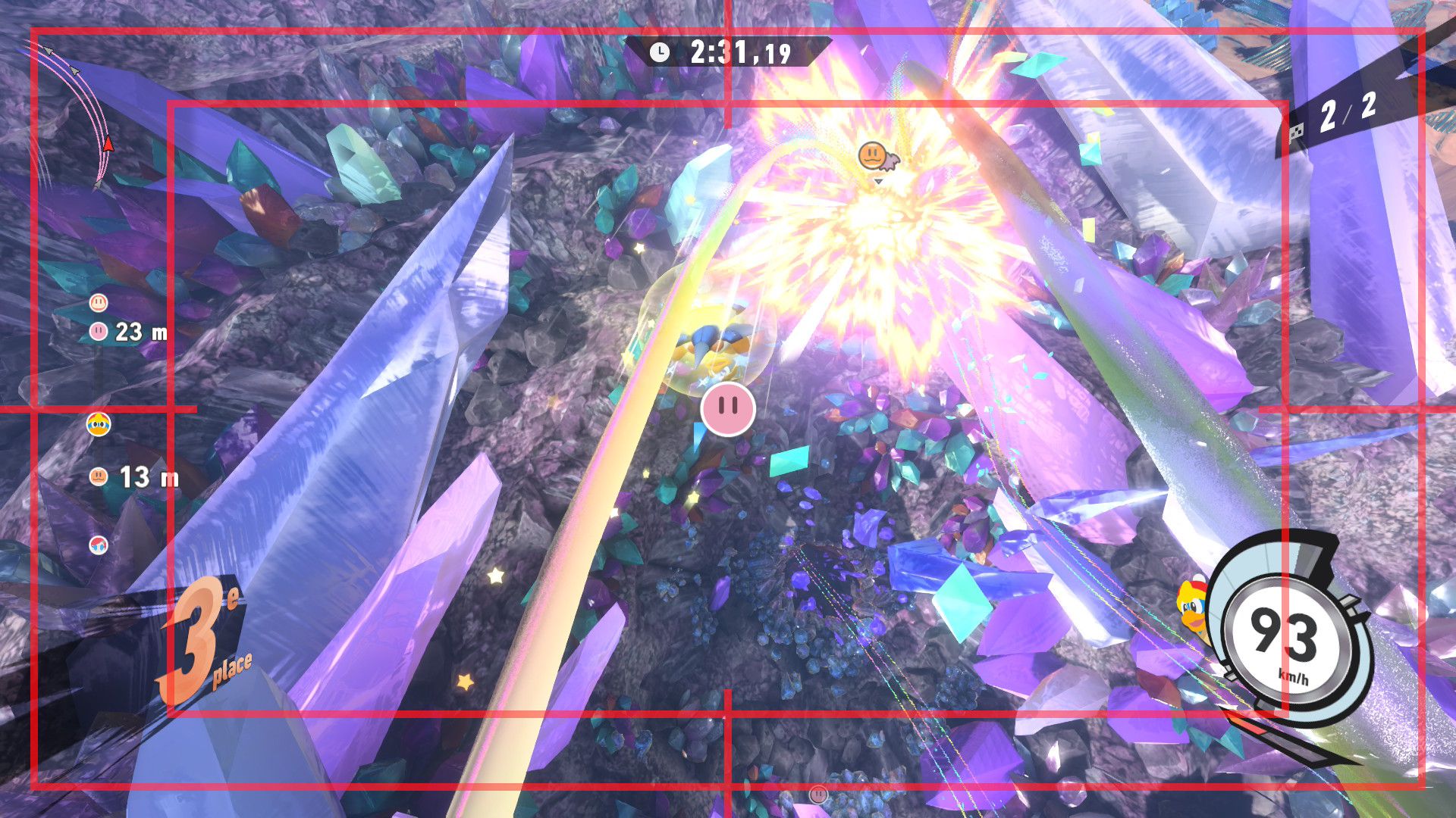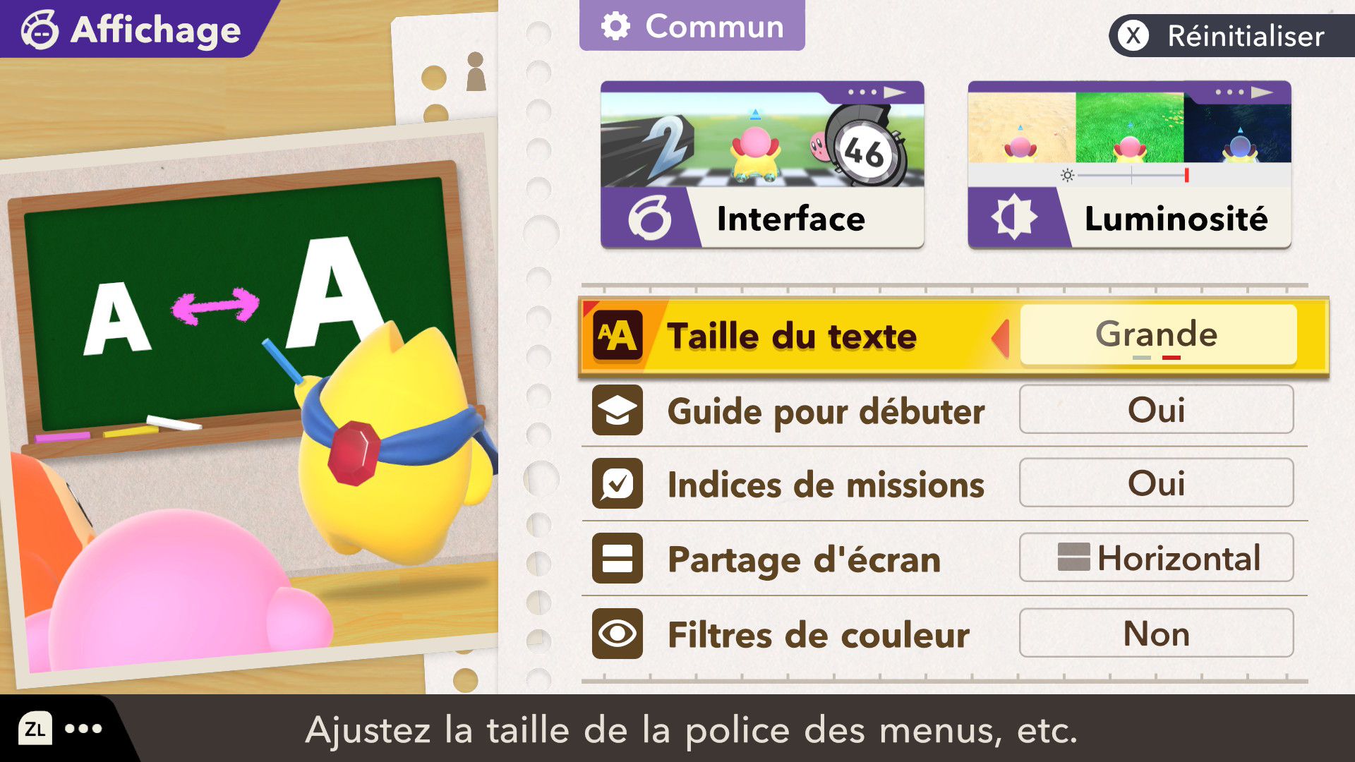 L’auteur de ce test en faisant partie, il paraissait très important d’essayer le jeu en utilisant toutes les options à disposition. Dans les réglages du mouvement de la caméra, il est donc possible d’élargir le champ de vision et de régler la distance de la caméra, le suivi du Rider (en choisissant de le suivre, la caméra se place automatiquement derrière notre personnage quand il se déplace à pied), la vitesse à laquelle tourne la caméra quand on incline le stick R, les secousses provenant des impacts et l’inclinaison de la caméra dans les virages. Le paramétrage des effets visuels est particulièrement important, car il peut fortement réduire les sensations de malaise, voire ne pas les déclencher du tout lorsque l’on est sensible aux mouvements brusques de caméra ou autres éléments pouvant provoquer des troubles plus ou moins importants. On peut donc choisir d’intégrer des repères visuels aux bords de l’écran pour réduire la sensation de mouvement ainsi que des repères convergents pour guider le regard vers le centre, un cadre rectangulaire extérieur et un cadre intérieur aux bords de l’écran, et ensuite de paramétrer leur opacité ainsi que leur épaisseur. Certes, le rendu en jeu est évidemment loin d’être magnifique, mais cela permet de profiter du jeu sans être malade au bout de quelques minutes. On a donc essayé de longues sessions pour voir si ces options sont réellement utiles, et le verdict est sans appel : les mauvaises sensations qui pourraient normalement être ressenties en jouant à un jeu de ce type ne surviennent pas. Pour les personnes qui seraient encore plus sensibles, il est également possible d’ajouter une marque au centre de l’écran pour aider le regard à se fixer et même d’ajuster l’intensité des changements dans le champ de vision pendant le jeu. En jouant à Kirby Air Riders, on se dit qu’il faut absolument que d’autres studios prennent exemple sur ces options, car cela peut permettre tout simplement à encore plus de personnes de profiter de différents types de jeux auxquels elles ne pourraient pas jouer à cause de leurs troubles. À ce niveau, Kirby Air Riders est déjà une véritable réussite. On peut même enregistrer plusieurs sets de paramètres personnalisés, ce qui est très utile étant donné qu’il y a différents modes de jeu où les sensations peuvent ne pas être les mêmes.