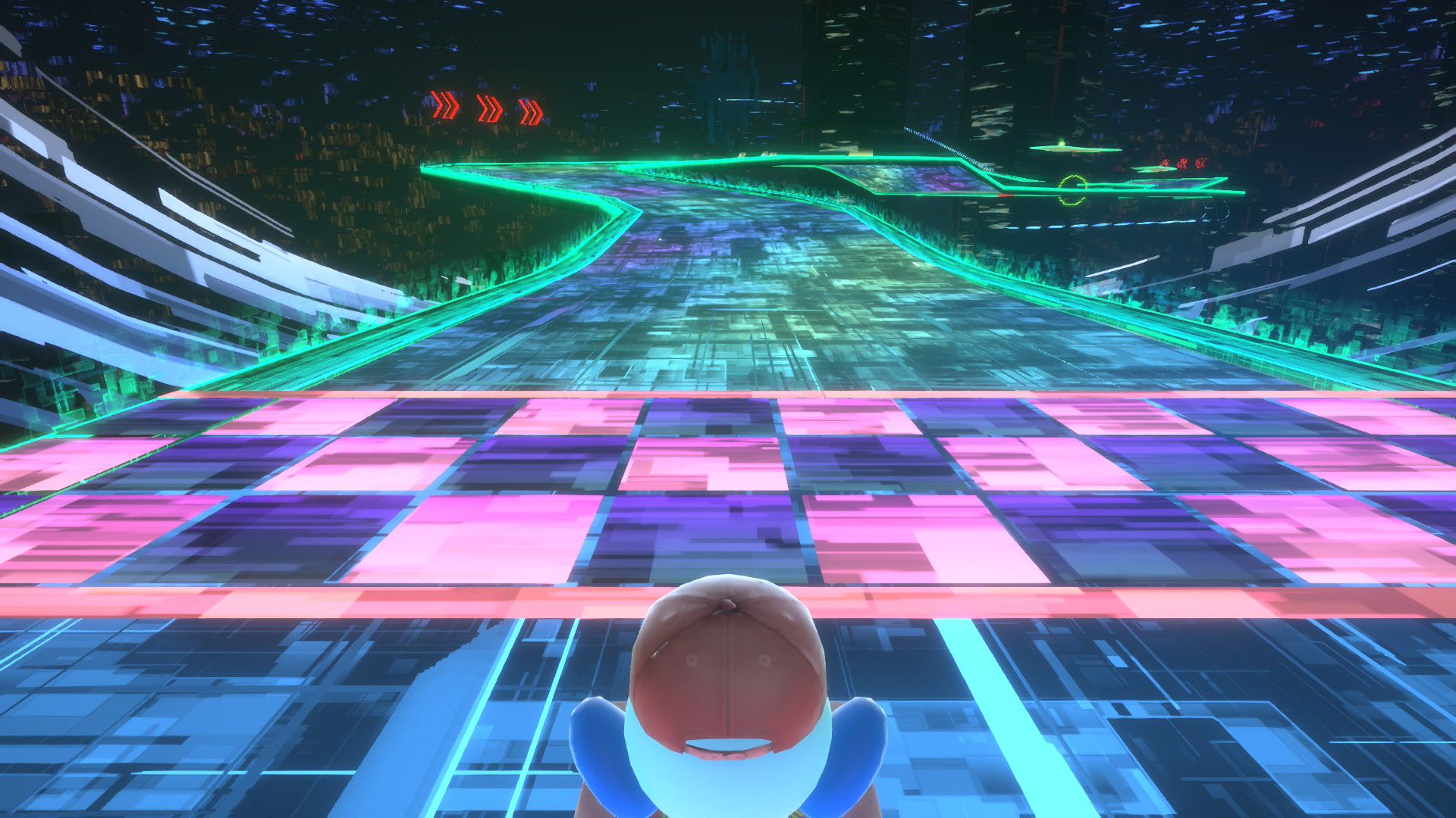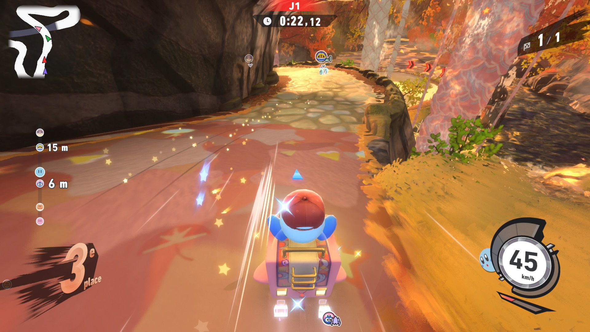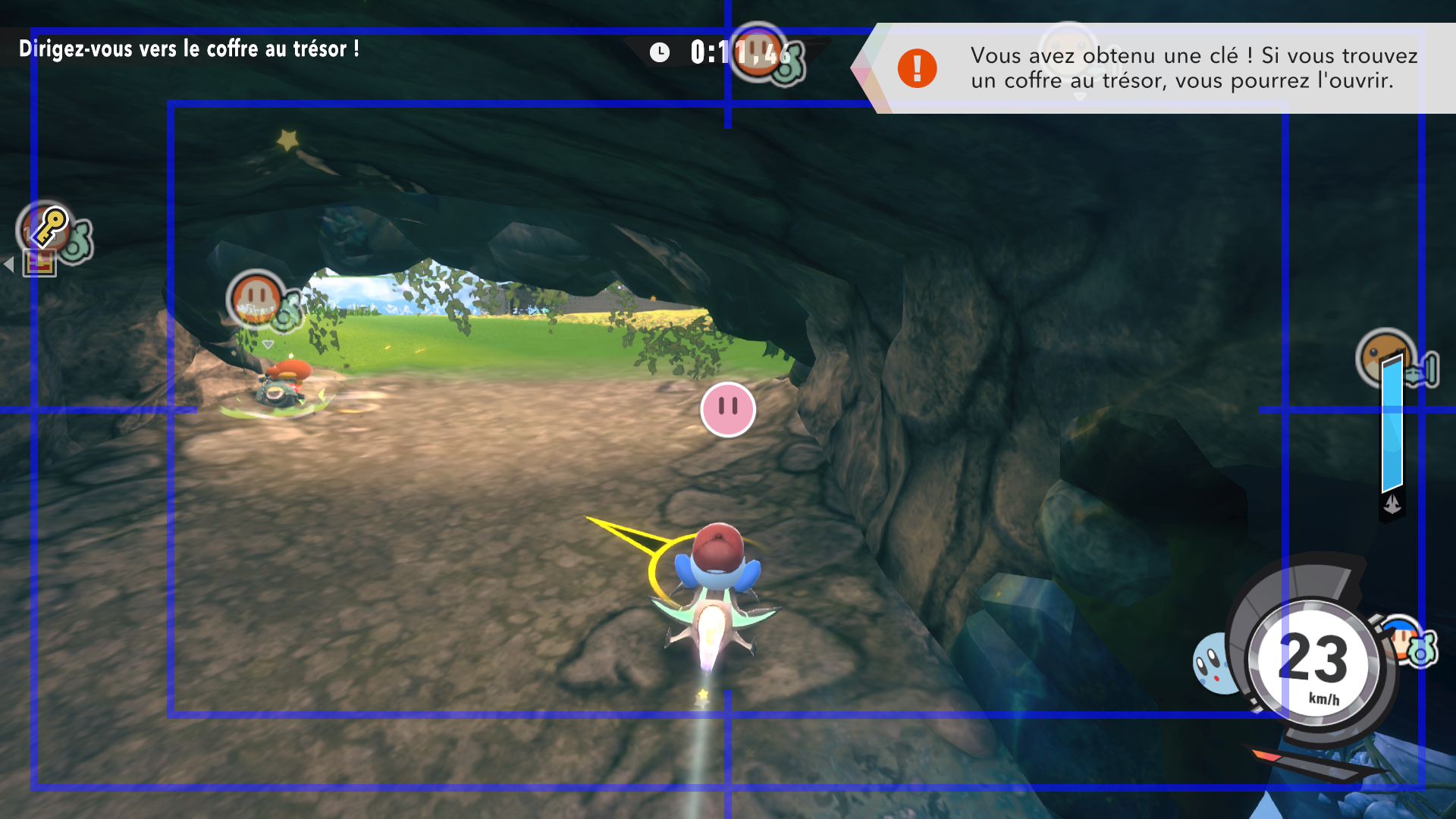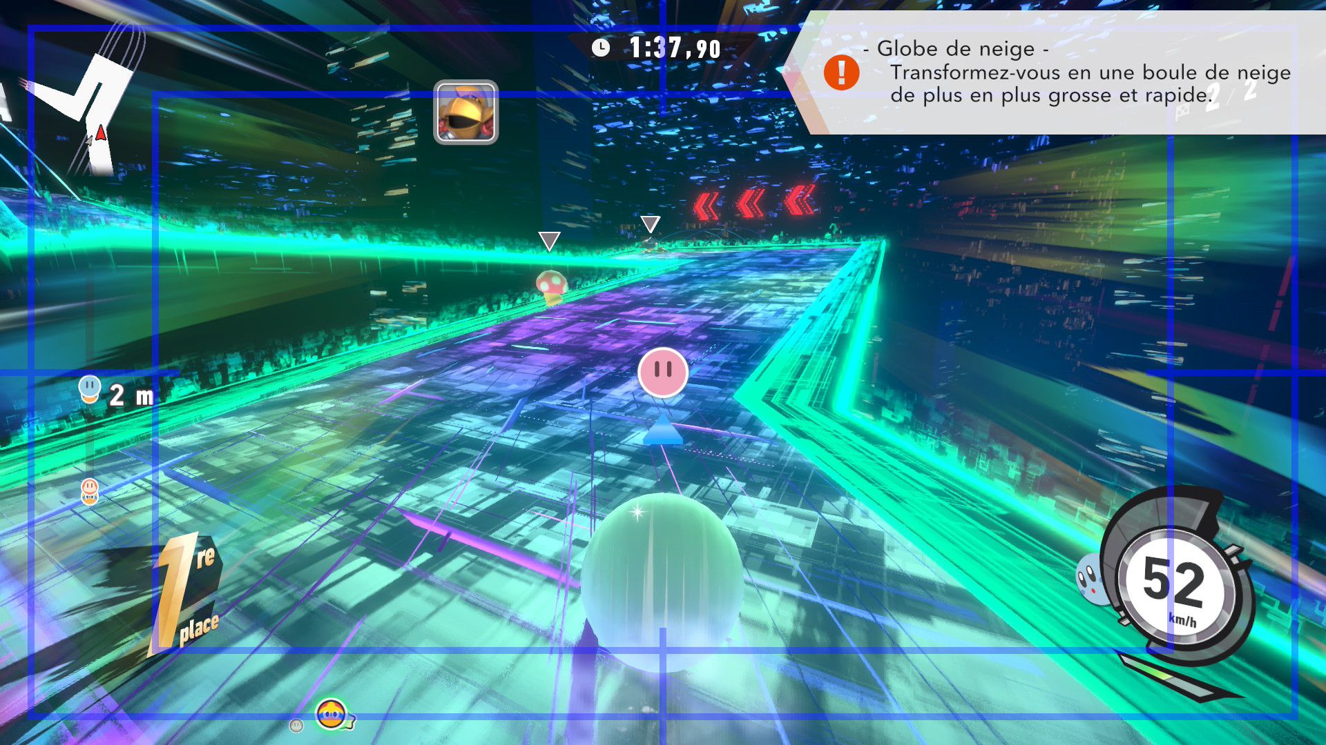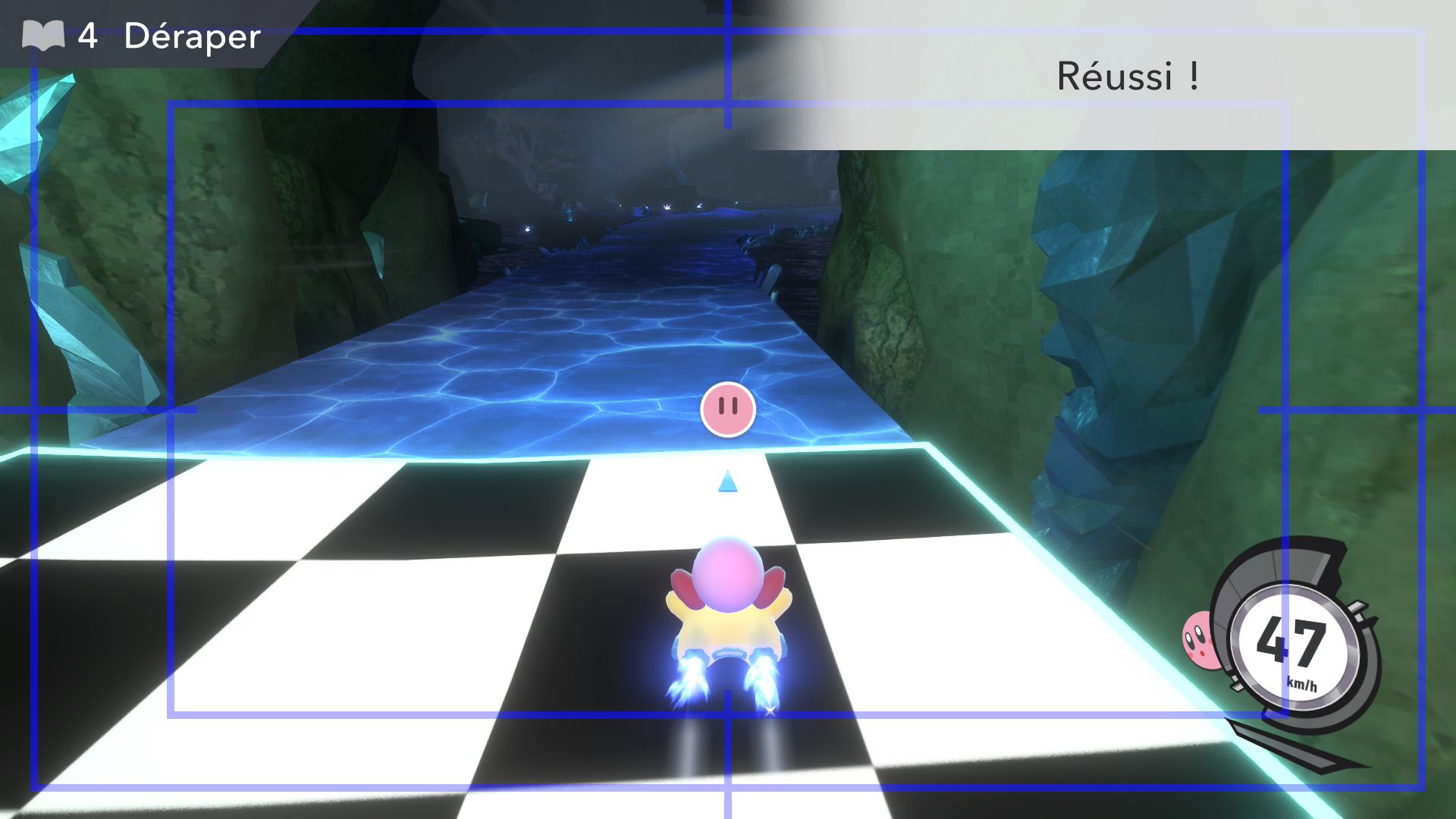 L’auteur de ce test en faisant partie, il paraissait très important d’essayer le jeu en utilisant toutes les options à disposition. Dans les réglages du mouvement de la caméra, il est donc possible d’élargir le champ de vision et de régler la distance de la caméra, le suivi du Rider (en choisissant de le suivre, la caméra se place automatiquement derrière notre personnage quand il se déplace à pied), la vitesse à laquelle tourne la caméra quand on incline le stick R, les secousses provenant des impacts et l’inclinaison de la caméra dans les virages. Le paramétrage des effets visuels est particulièrement important, car il peut fortement réduire les sensations de malaise, voire ne pas les déclencher du tout lorsque l’on est sensible aux mouvements brusques de caméra ou autres éléments pouvant provoquer des troubles plus ou moins importants. On peut donc choisir d’intégrer des repères visuels aux bords de l’écran pour réduire la sensation de mouvement ainsi que des repères convergents pour guider le regard vers le centre, un cadre rectangulaire extérieur et un cadre intérieur aux bords de l’écran, et ensuite de paramétrer leur opacité ainsi que leur épaisseur. Certes, le rendu en jeu est évidemment loin d’être magnifique, mais cela permet de profiter du jeu sans être malade au bout de quelques minutes. On a donc essayé de longues sessions pour voir si ces options sont réellement utiles, et le verdict est sans appel : les mauvaises sensations qui pourraient normalement être ressenties en jouant à un jeu de ce type ne surviennent pas. Pour les personnes qui seraient encore plus sensibles, il est également possible d’ajouter une marque au centre de l’écran pour aider le regard à se fixer et même d’ajuster l’intensité des changements dans le champ de vision pendant le jeu. En jouant à Kirby Air Riders, on se dit qu’il faut absolument que d’autres studios prennent exemple sur ces options, car cela peut permettre tout simplement à encore plus de personnes de profiter de différents types de jeux auxquels elles ne pourraient pas jouer à cause de leurs troubles. À ce niveau, Kirby Air Riders est déjà une véritable réussite. On peut même enregistrer plusieurs sets de paramètres personnalisés, ce qui est très utile étant donné qu’il y a différents modes de jeu où les sensations peuvent ne pas être les mêmes.