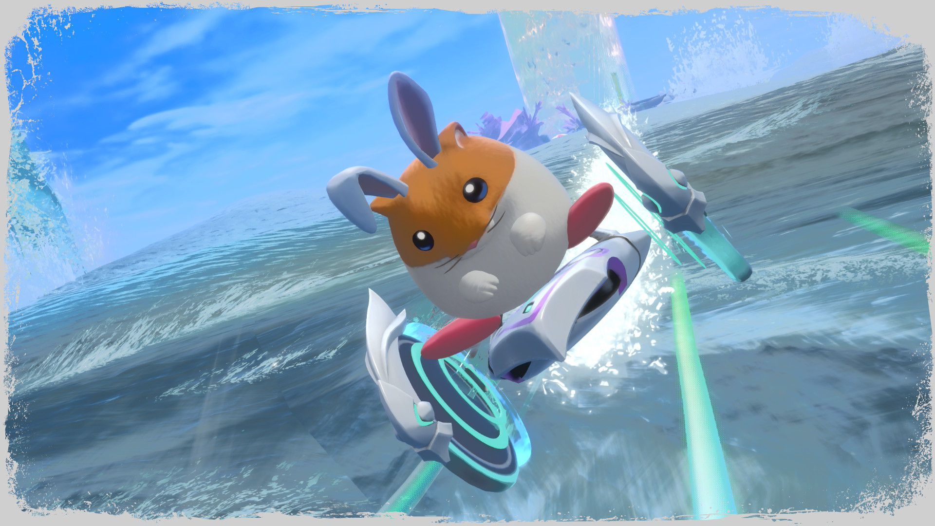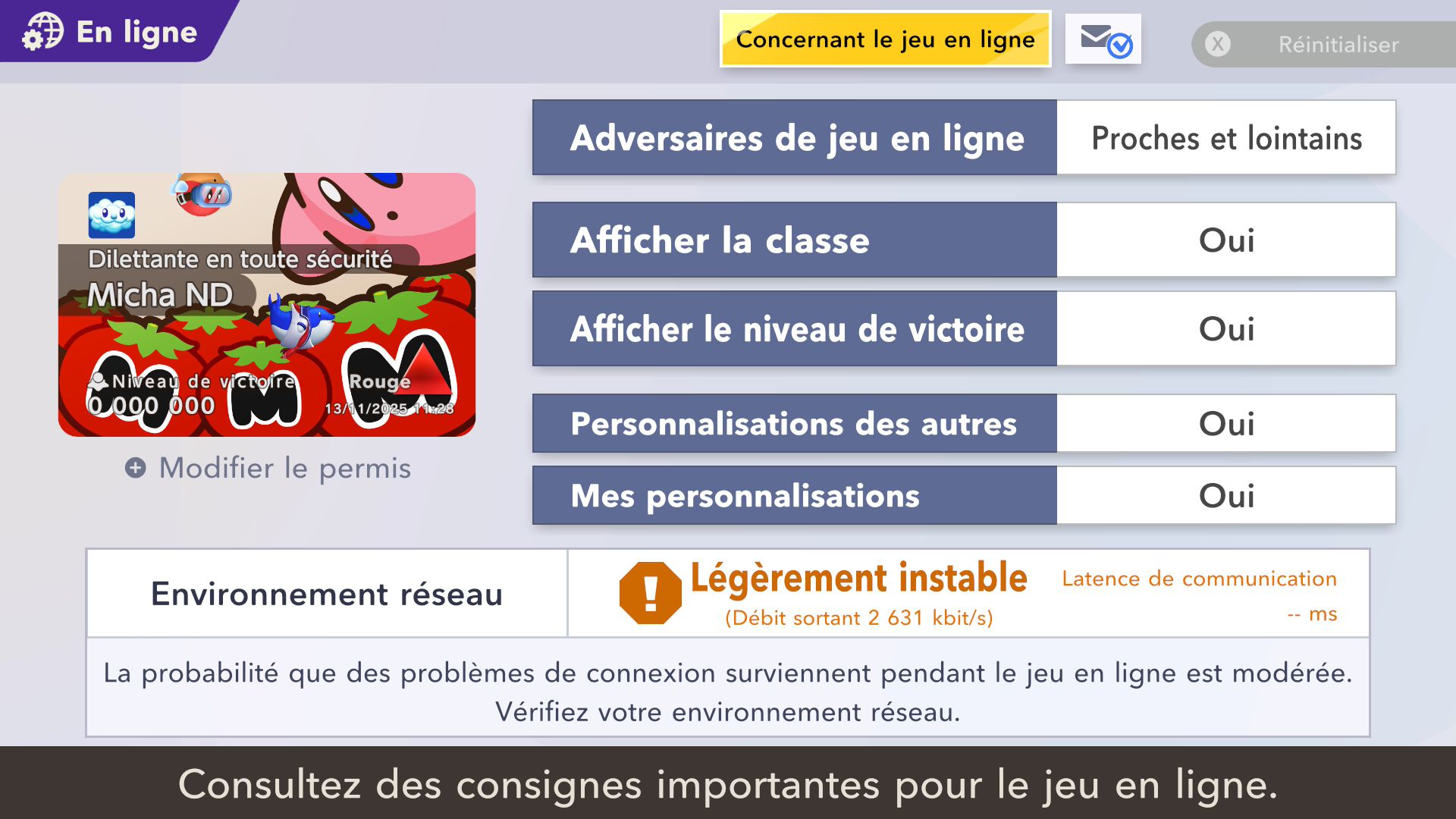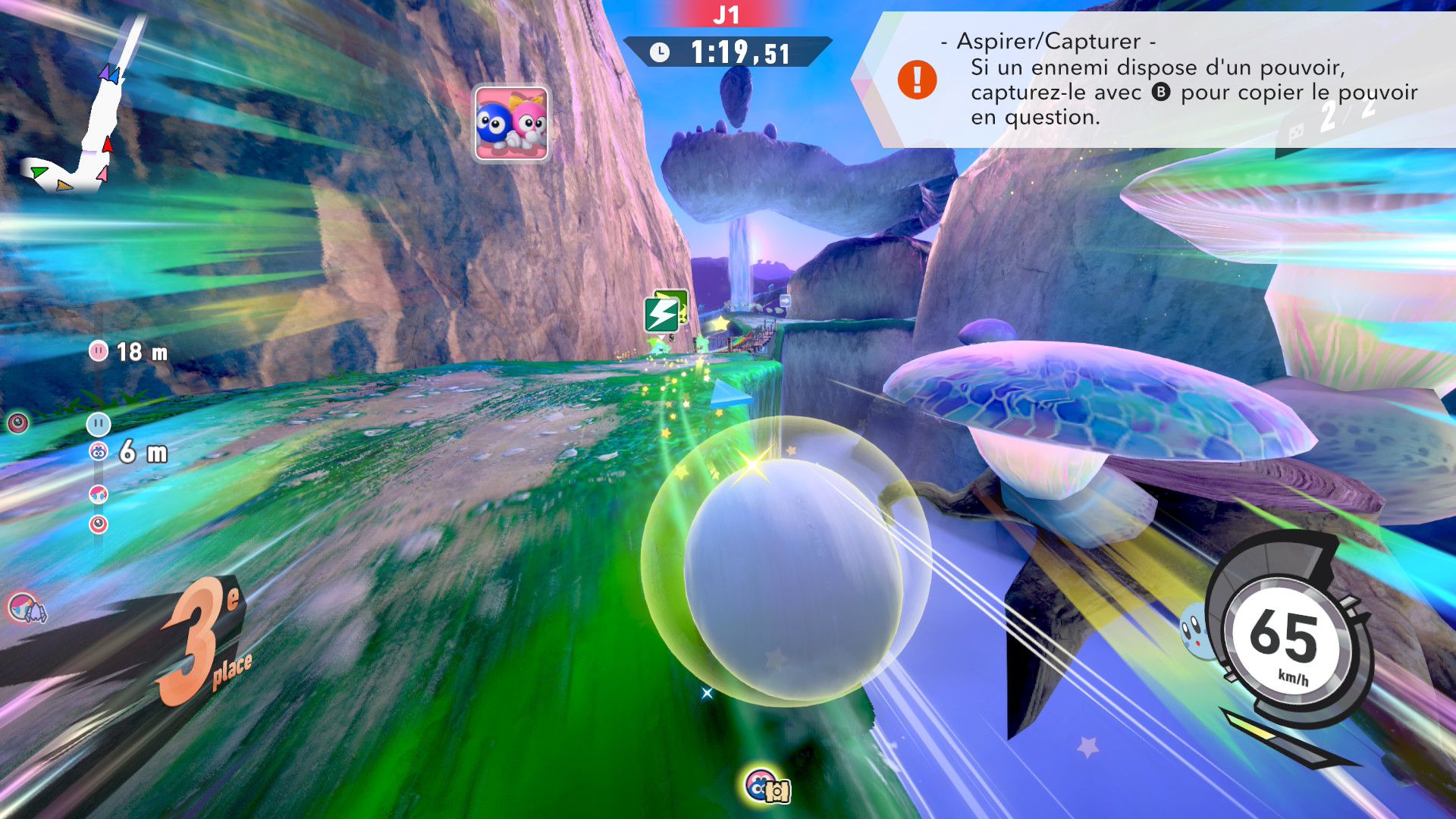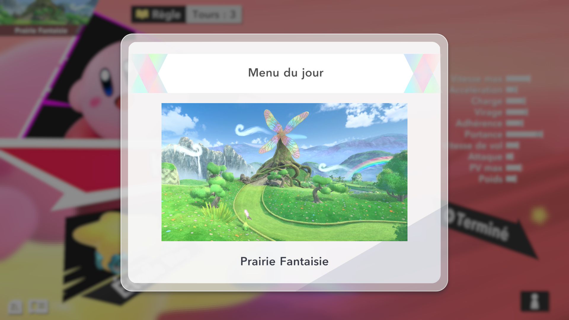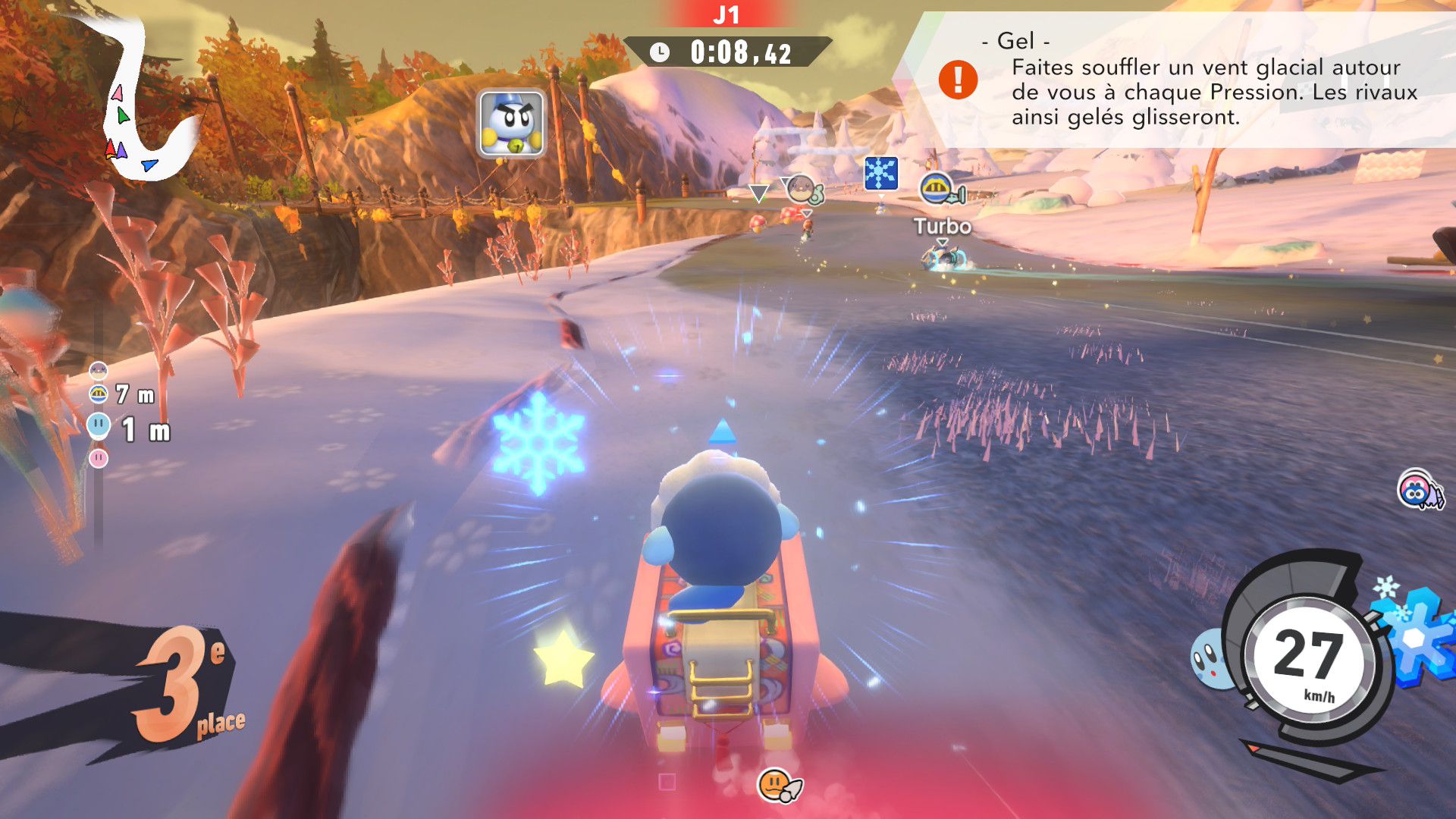 L’auteur de ce test en faisant partie, il paraissait très important d’essayer le jeu en utilisant toutes les options à disposition. Dans les réglages du mouvement de la caméra, il est donc possible d’élargir le champ de vision et de régler la distance de la caméra, le suivi du Rider (en choisissant de le suivre, la caméra se place automatiquement derrière notre personnage quand il se déplace à pied), la vitesse à laquelle tourne la caméra quand on incline le stick R, les secousses provenant des impacts et l’inclinaison de la caméra dans les virages. Le paramétrage des effets visuels est particulièrement important, car il peut fortement réduire les sensations de malaise, voire ne pas les déclencher du tout lorsque l’on est sensible aux mouvements brusques de caméra ou autres éléments pouvant provoquer des troubles plus ou moins importants. On peut donc choisir d’intégrer des repères visuels aux bords de l’écran pour réduire la sensation de mouvement ainsi que des repères convergents pour guider le regard vers le centre, un cadre rectangulaire extérieur et un cadre intérieur aux bords de l’écran, et ensuite de paramétrer leur opacité ainsi que leur épaisseur. Certes, le rendu en jeu est évidemment loin d’être magnifique, mais cela permet de profiter du jeu sans être malade au bout de quelques minutes. On a donc essayé de longues sessions pour voir si ces options sont réellement utiles, et le verdict est sans appel : les mauvaises sensations qui pourraient normalement être ressenties en jouant à un jeu de ce type ne surviennent pas. Pour les personnes qui seraient encore plus sensibles, il est également possible d’ajouter une marque au centre de l’écran pour aider le regard à se fixer et même d’ajuster l’intensité des changements dans le champ de vision pendant le jeu. En jouant à Kirby Air Riders, on se dit qu’il faut absolument que d’autres studios prennent exemple sur ces options, car cela peut permettre tout simplement à encore plus de personnes de profiter de différents types de jeux auxquels elles ne pourraient pas jouer à cause de leurs troubles. À ce niveau, Kirby Air Riders est déjà une véritable réussite. On peut même enregistrer plusieurs sets de paramètres personnalisés, ce qui est très utile étant donné qu’il y a différents modes de jeu où les sensations peuvent ne pas être les mêmes.