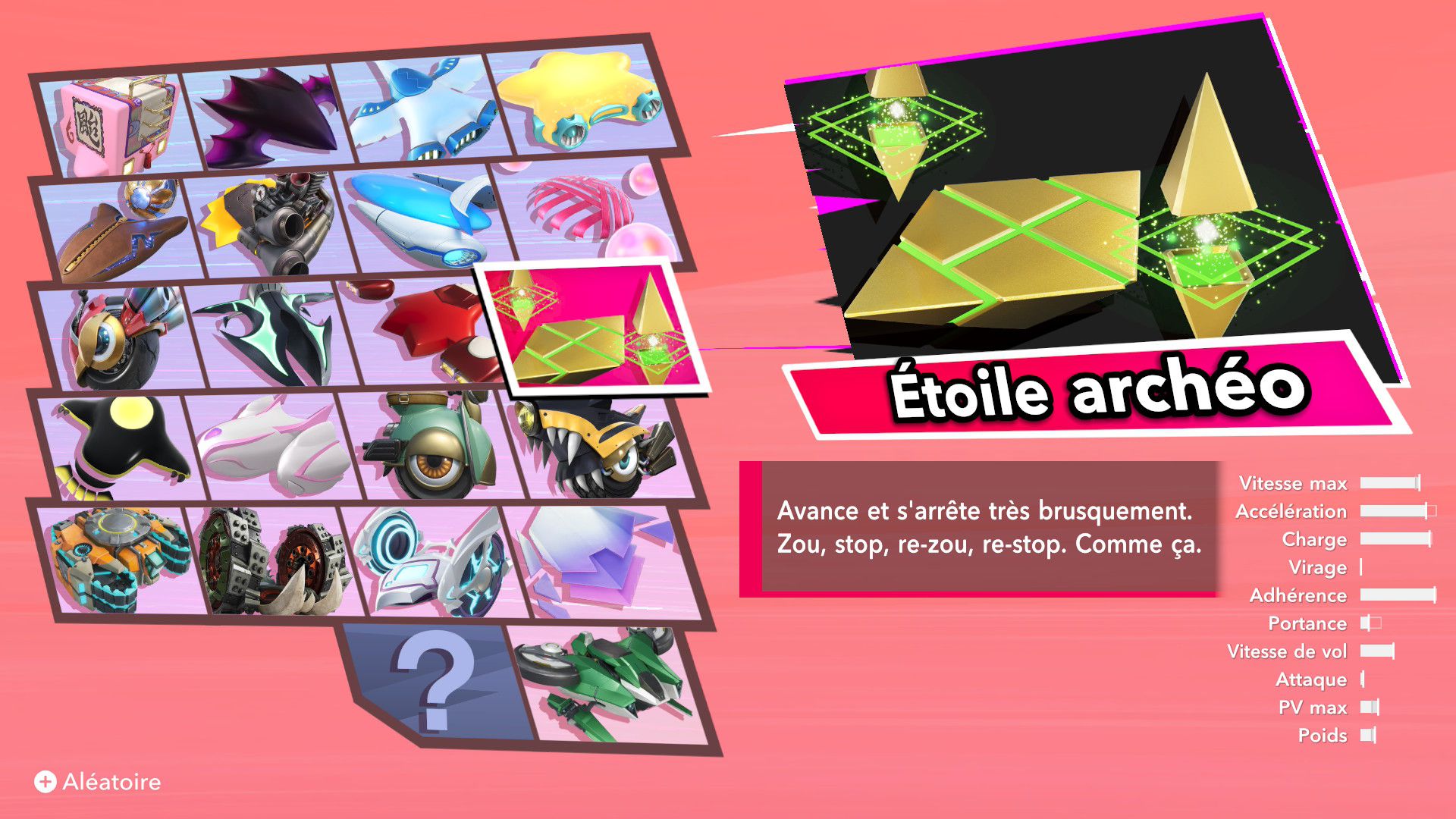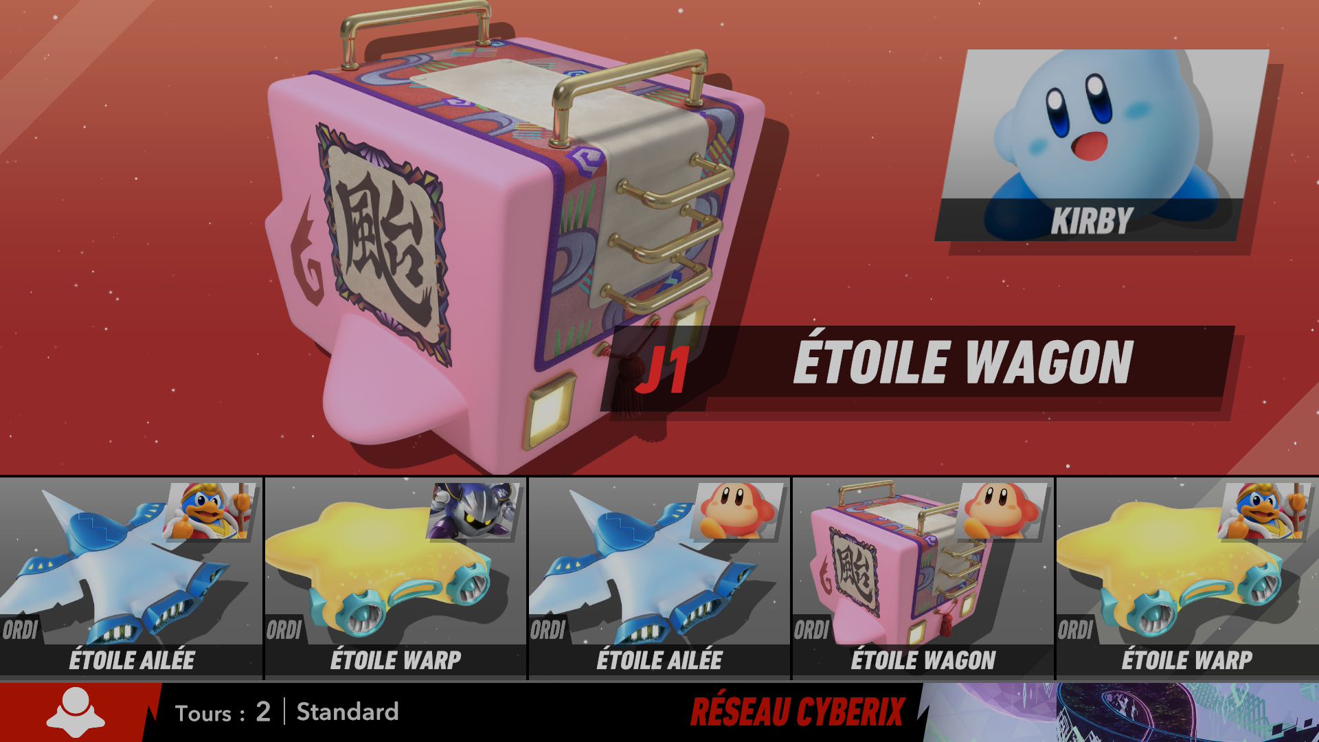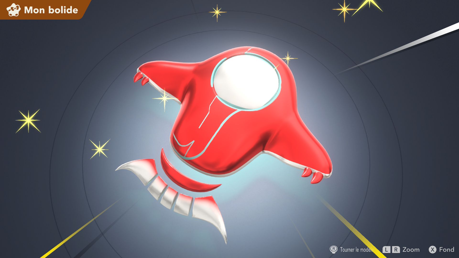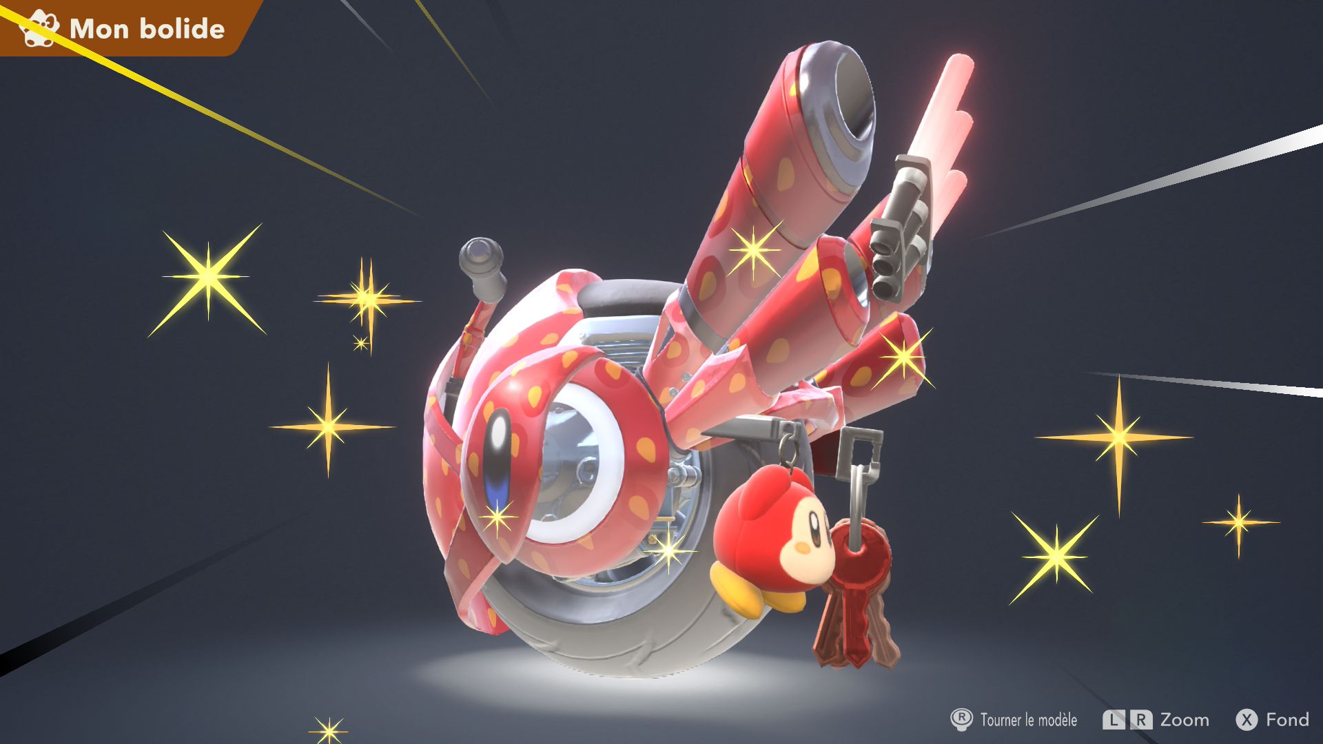 Les autres éléments de Kirby Air Riders sont assez secondaires, mais tout de même amusants. On souhaiterait d’abord parler de la fonction « Mon bolide », elle aussi présentée dans un Direct dédié au jeu. Jusqu’à 100 bolides personnalisés peuvent être créés en choisissant les couleurs, les motifs, les accessoires, les décalcos, les effets et les sons. En découvrant cette fonctionnalité, on peut se dire que les possibilités sont assez limitées. Cependant, on découvre par la suite que de nombreux éléments de personnalisation doivent être débloqués par le biais des missions, et que ceux-ci peuvent offrir encore plus de liberté de création. Étant donné que le jeu était déjà sorti au Japon et en Australie, on a pu d’ailleurs découvrir les premiers bolides partagés par d’autres joueurs et joueuses. Les résultats sont assez impressionnants : on trouve des bolides inspirés de Pokémon (Stari, notamment, ou encore Kyogre), Bob l’éponge (Patrick, évidemment) et bien d’autres. De notre côté, dans le cadre de ce test, nous avons voulu tester un peu les limites de la créativité de cette fonction en essayant de créer un bolide Monado – la fameuse épée légendaire de Xenoblade Chronicles – en choisissant l’étoile vampire. Des personnes arriveront peut-être à faire mieux, grâce à des éléments qu’elles auront réussi à débloquer grâce aux missions, mais le résultat (ci-dessous) est plutôt amusant.