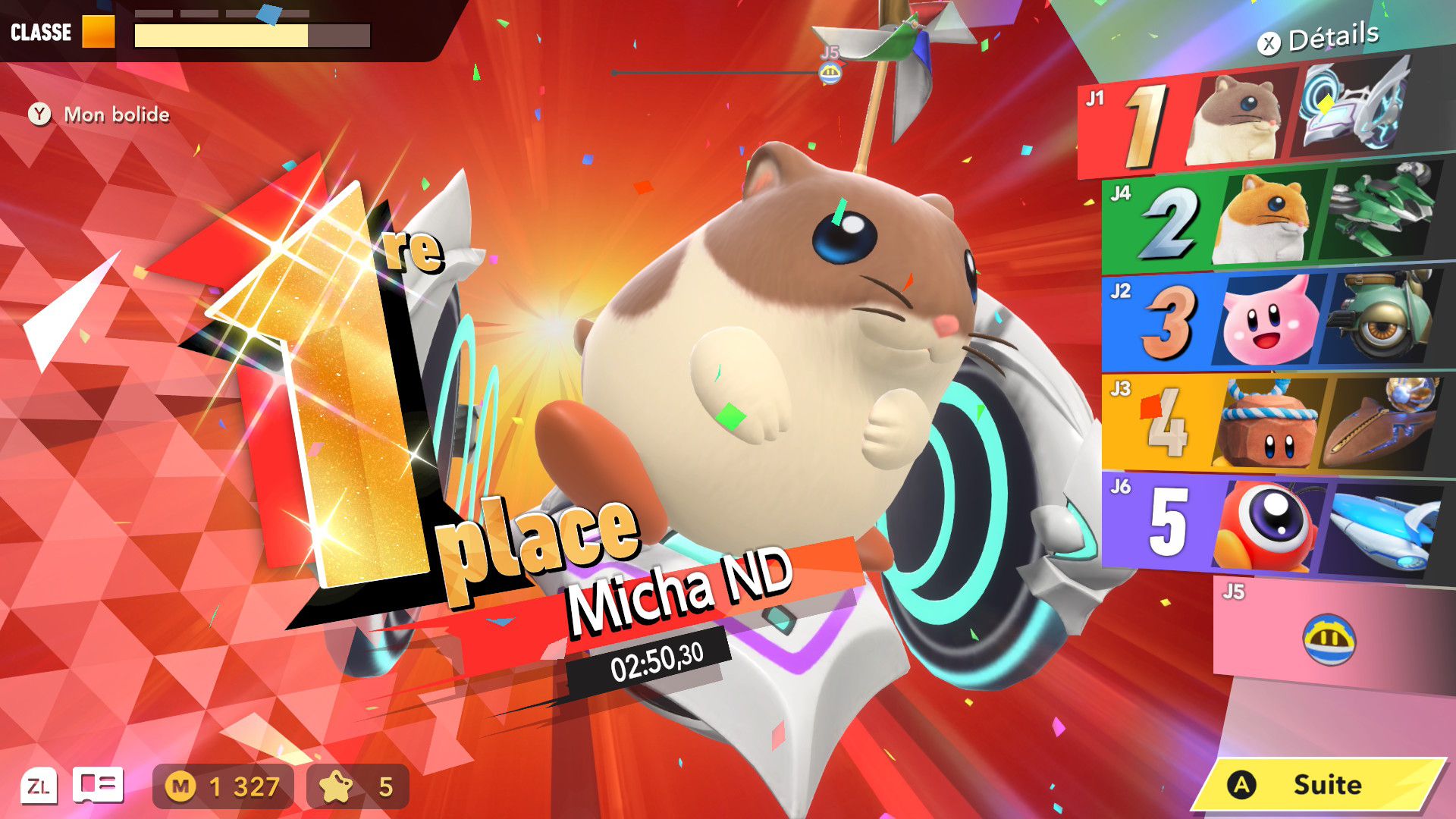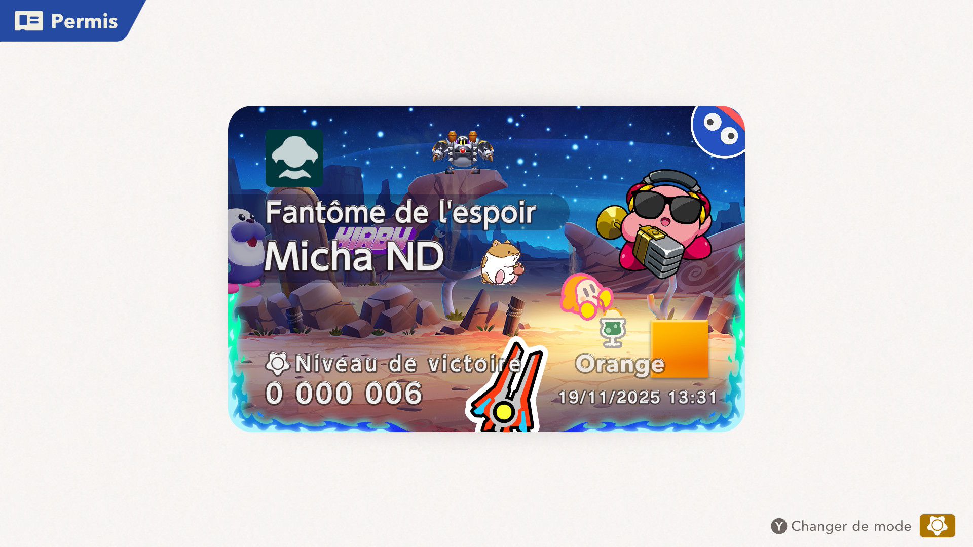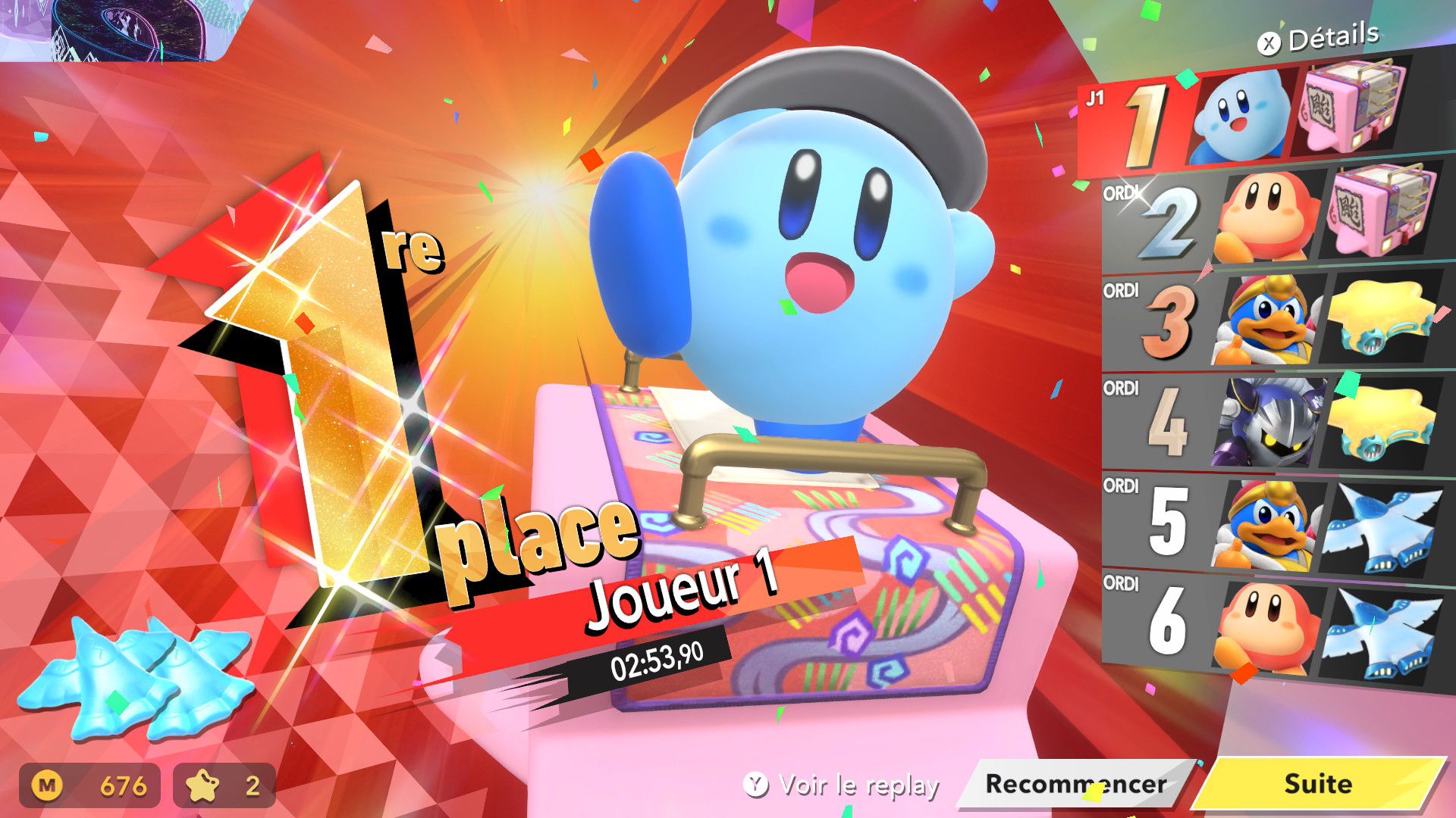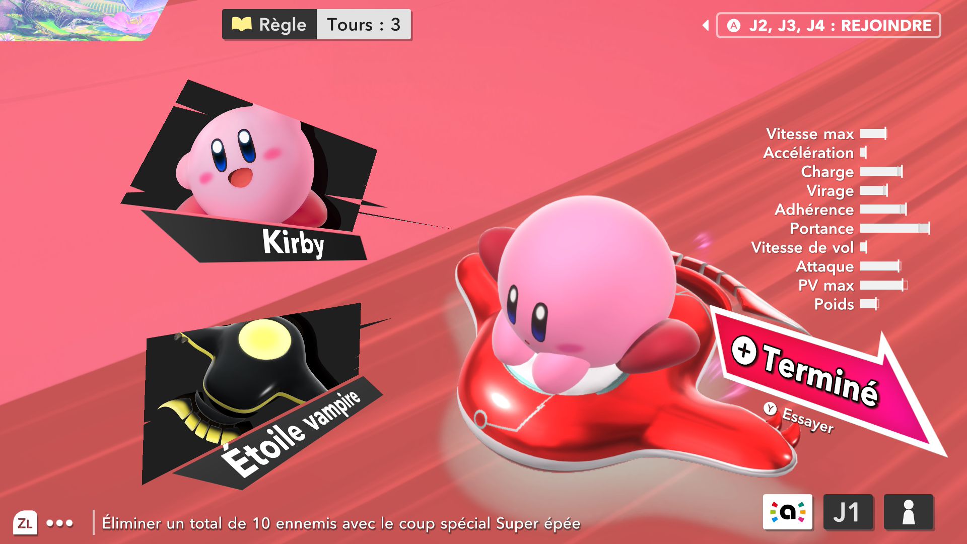 Les autres éléments de Kirby Air Riders sont assez secondaires, mais tout de même amusants. On souhaiterait d’abord parler de la fonction « Mon bolide », elle aussi présentée dans un Direct dédié au jeu. Jusqu’à 100 bolides personnalisés peuvent être créés en choisissant les couleurs, les motifs, les accessoires, les décalcos, les effets et les sons. En découvrant cette fonctionnalité, on peut se dire que les possibilités sont assez limitées. Cependant, on découvre par la suite que de nombreux éléments de personnalisation doivent être débloqués par le biais des missions, et que ceux-ci peuvent offrir encore plus de liberté de création. Étant donné que le jeu était déjà sorti au Japon et en Australie, on a pu d’ailleurs découvrir les premiers bolides partagés par d’autres joueurs et joueuses. Les résultats sont assez impressionnants : on trouve des bolides inspirés de Pokémon (Stari, notamment, ou encore Kyogre), Bob l’éponge (Patrick, évidemment) et bien d’autres. De notre côté, dans le cadre de ce test, nous avons voulu tester un peu les limites de la créativité de cette fonction en essayant de créer un bolide Monado – la fameuse épée légendaire de Xenoblade Chronicles – en choisissant l’étoile vampire. Des personnes arriveront peut-être à faire mieux, grâce à des éléments qu’elles auront réussi à débloquer grâce aux missions, mais le résultat (ci-dessous) est plutôt amusant.