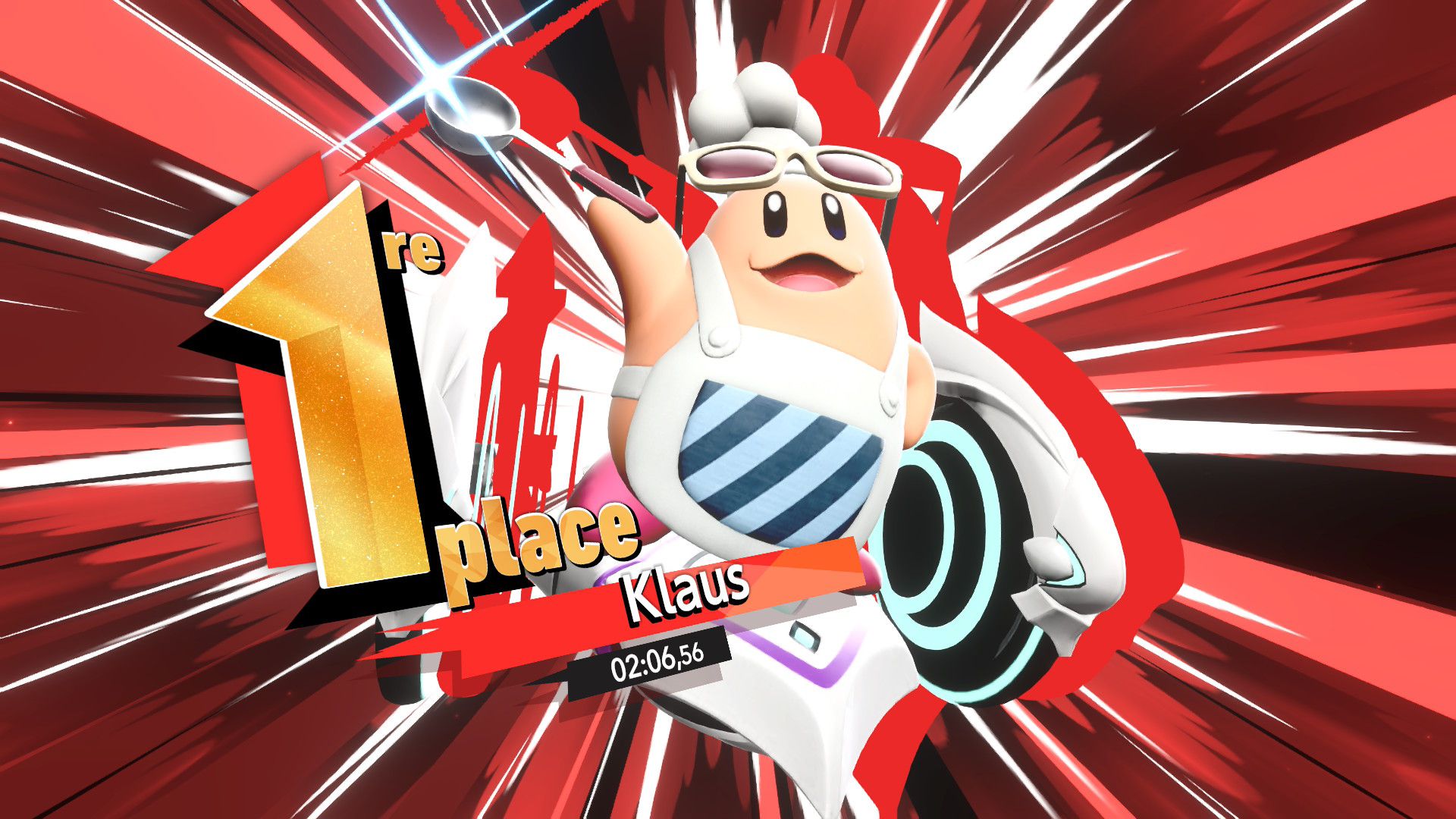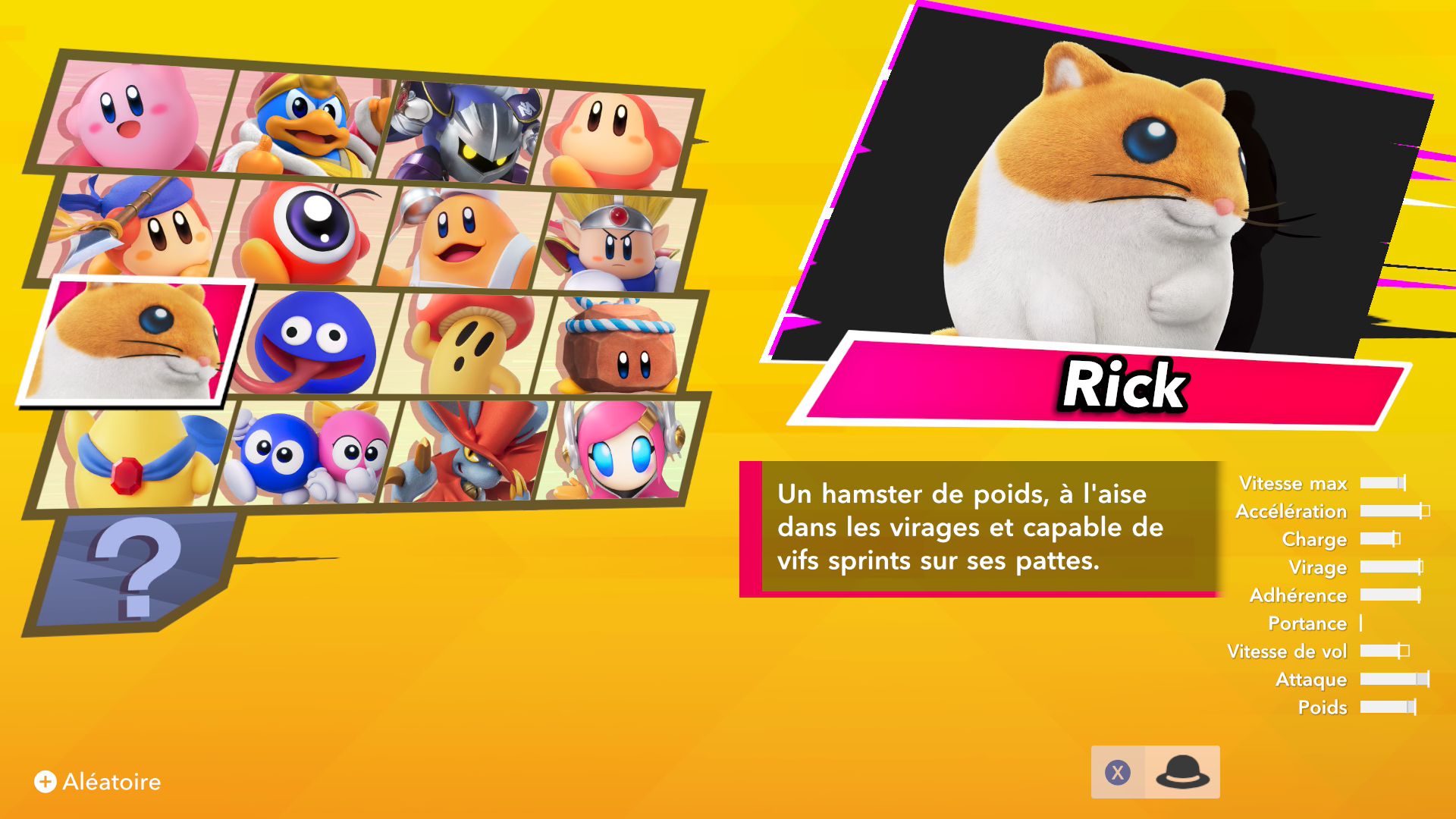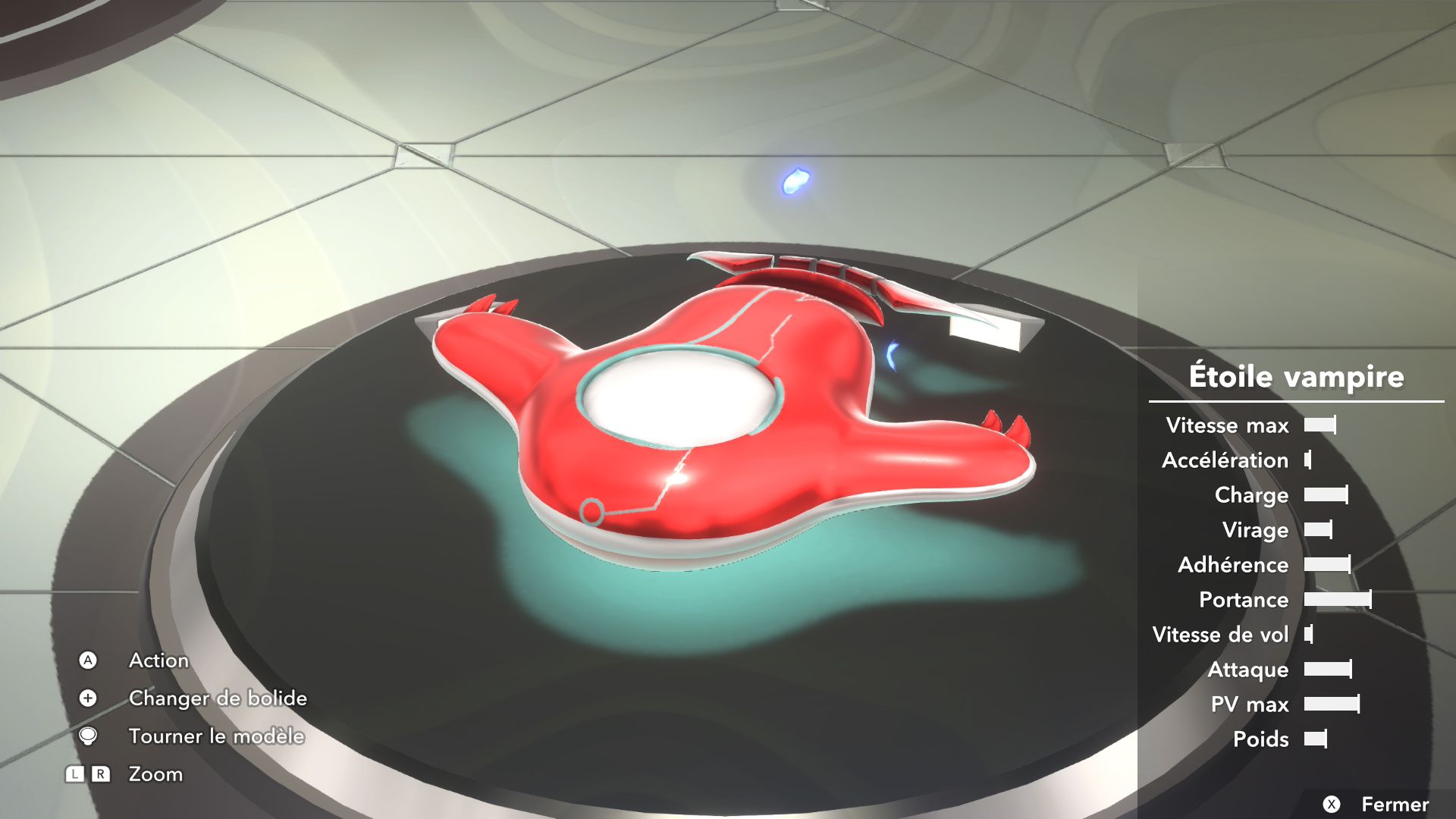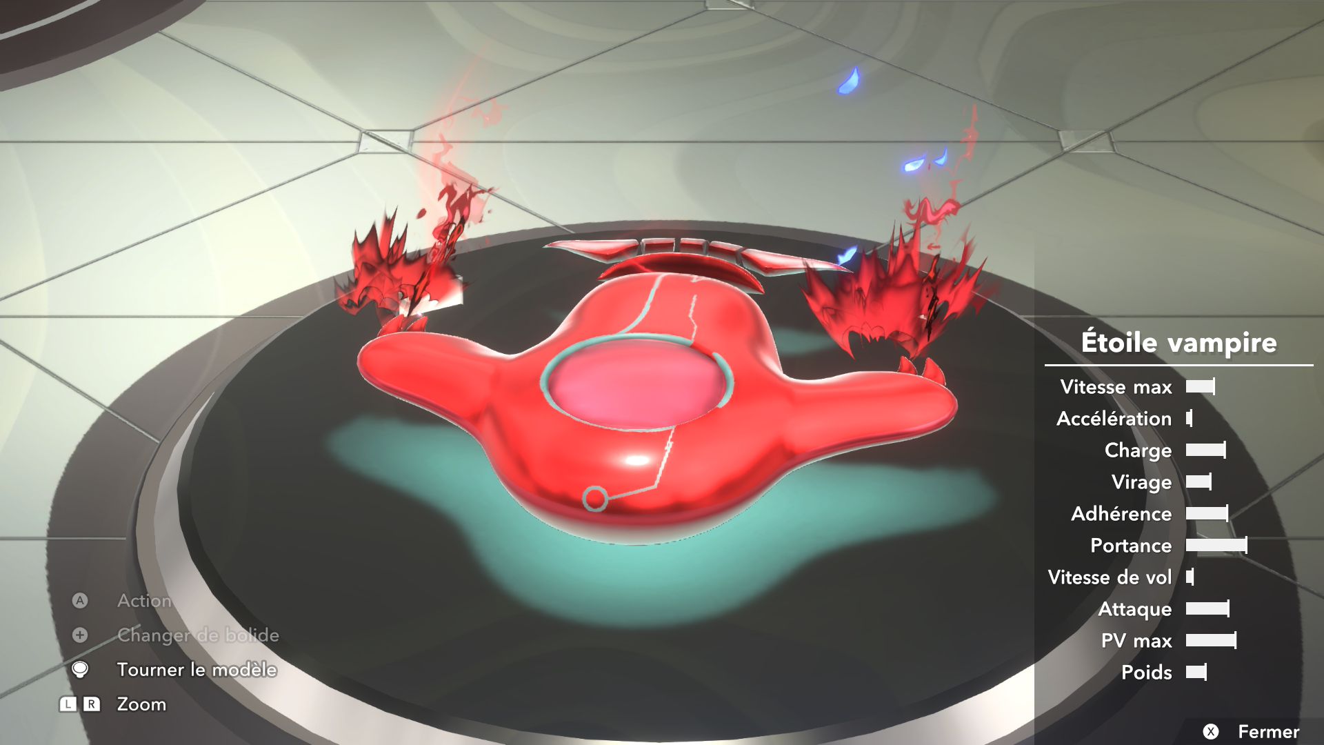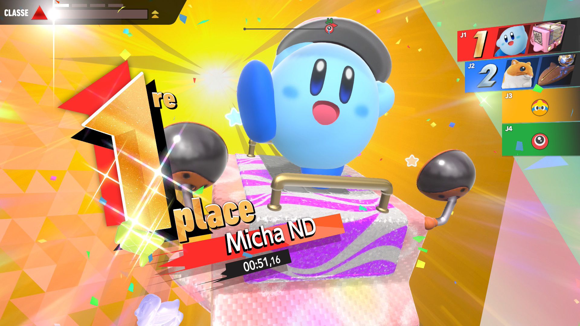 Les autres éléments de Kirby Air Riders sont assez secondaires, mais tout de même amusants. On souhaiterait d’abord parler de la fonction « Mon bolide », elle aussi présentée dans un Direct dédié au jeu. Jusqu’à 100 bolides personnalisés peuvent être créés en choisissant les couleurs, les motifs, les accessoires, les décalcos, les effets et les sons. En découvrant cette fonctionnalité, on peut se dire que les possibilités sont assez limitées. Cependant, on découvre par la suite que de nombreux éléments de personnalisation doivent être débloqués par le biais des missions, et que ceux-ci peuvent offrir encore plus de liberté de création. Étant donné que le jeu était déjà sorti au Japon et en Australie, on a pu d’ailleurs découvrir les premiers bolides partagés par d’autres joueurs et joueuses. Les résultats sont assez impressionnants : on trouve des bolides inspirés de Pokémon (Stari, notamment, ou encore Kyogre), Bob l’éponge (Patrick, évidemment) et bien d’autres. De notre côté, dans le cadre de ce test, nous avons voulu tester un peu les limites de la créativité de cette fonction en essayant de créer un bolide Monado – la fameuse épée légendaire de Xenoblade Chronicles – en choisissant l’étoile vampire. Des personnes arriveront peut-être à faire mieux, grâce à des éléments qu’elles auront réussi à débloquer grâce aux missions, mais le résultat (ci-dessous) est plutôt amusant.
