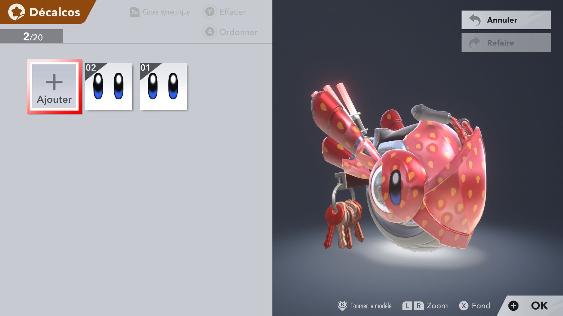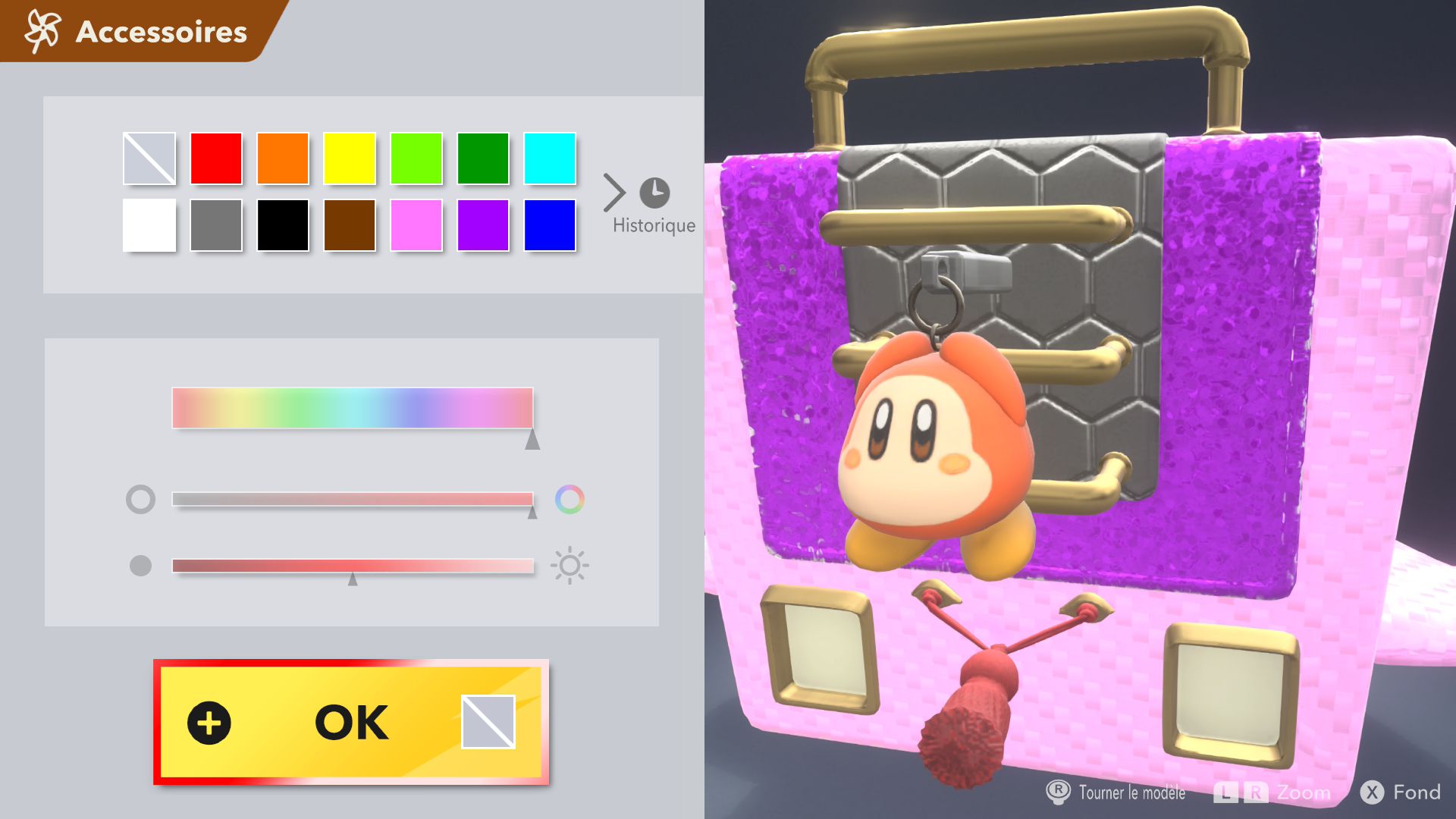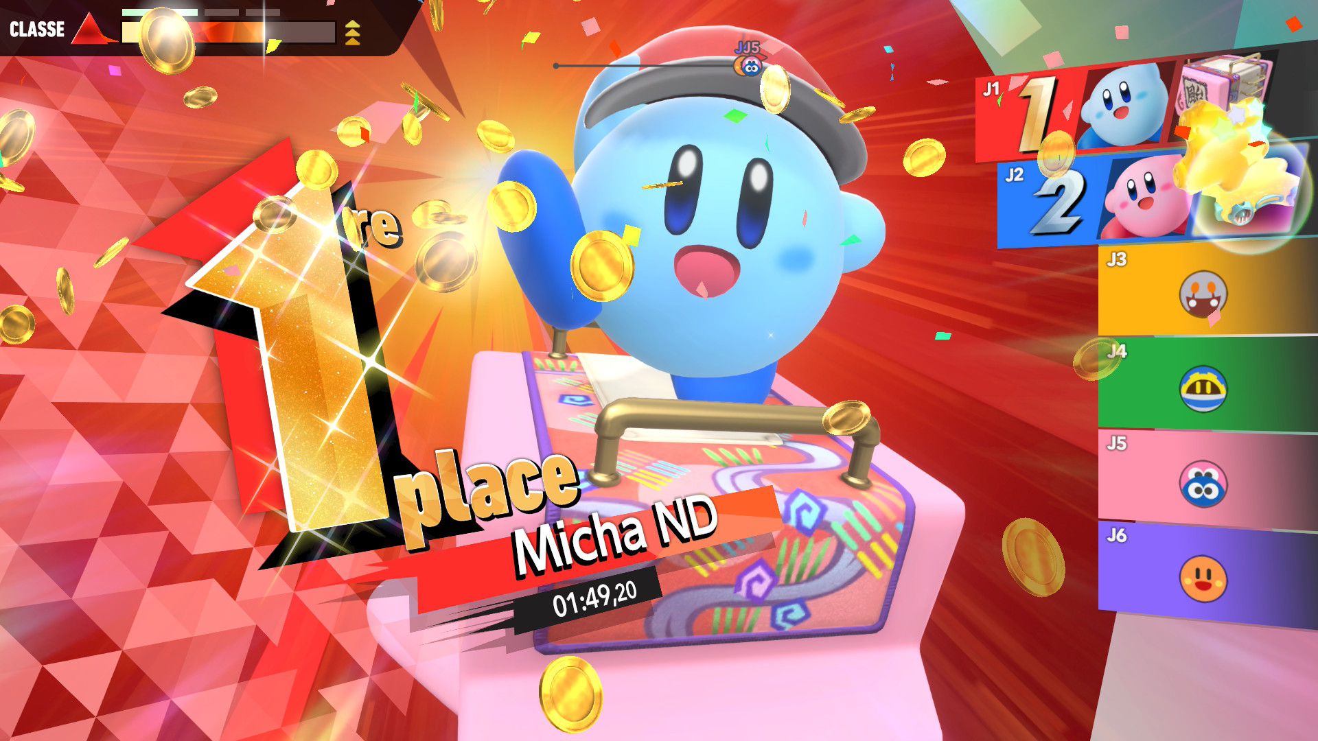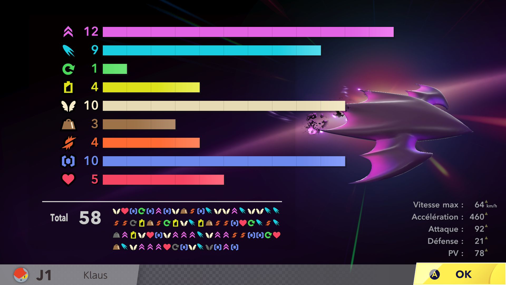 Les autres éléments de Kirby Air Riders sont assez secondaires, mais tout de même amusants. On souhaiterait d’abord parler de la fonction « Mon bolide », elle aussi présentée dans un Direct dédié au jeu. Jusqu’à 100 bolides personnalisés peuvent être créés en choisissant les couleurs, les motifs, les accessoires, les décalcos, les effets et les sons. En découvrant cette fonctionnalité, on peut se dire que les possibilités sont assez limitées. Cependant, on découvre par la suite que de nombreux éléments de personnalisation doivent être débloqués par le biais des missions, et que ceux-ci peuvent offrir encore plus de liberté de création. Étant donné que le jeu était déjà sorti au Japon et en Australie, on a pu d’ailleurs découvrir les premiers bolides partagés par d’autres joueurs et joueuses. Les résultats sont assez impressionnants : on trouve des bolides inspirés de Pokémon (Stari, notamment, ou encore Kyogre), Bob l’éponge (Patrick, évidemment) et bien d’autres. De notre côté, dans le cadre de ce test, nous avons voulu tester un peu les limites de la créativité de cette fonction en essayant de créer un bolide Monado – la fameuse épée légendaire de Xenoblade Chronicles – en choisissant l’étoile vampire. Des personnes arriveront peut-être à faire mieux, grâce à des éléments qu’elles auront réussi à débloquer grâce aux missions, mais le résultat (ci-dessous) est plutôt amusant.