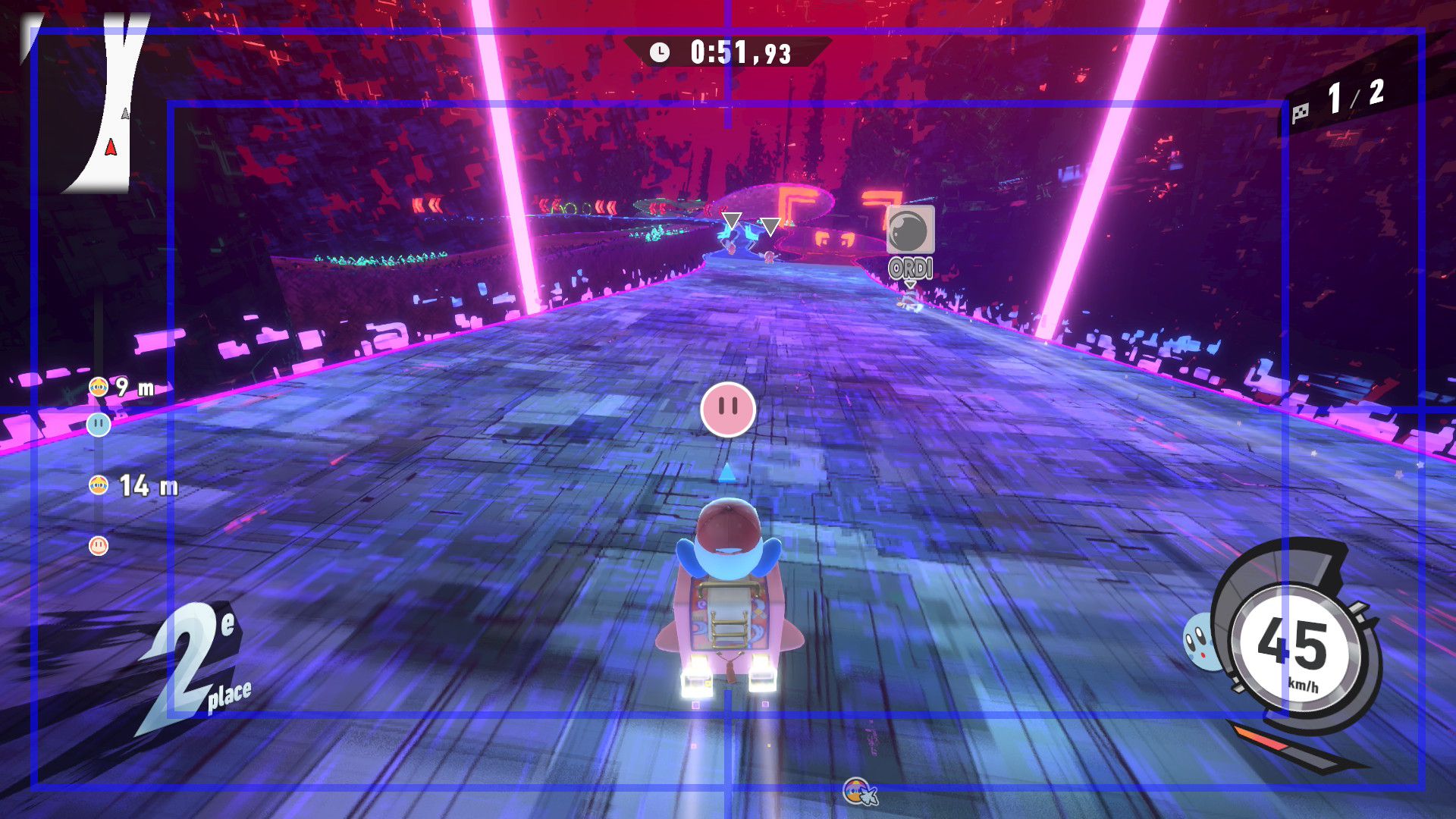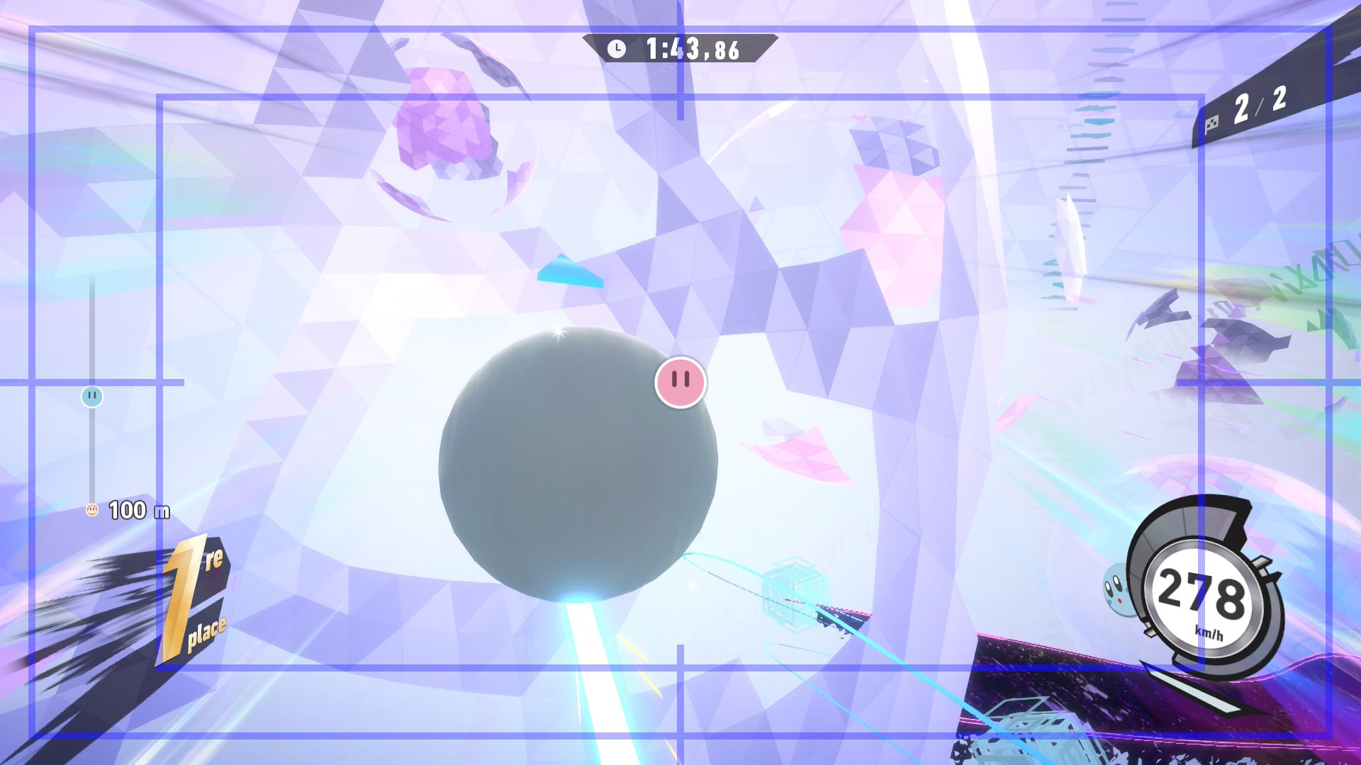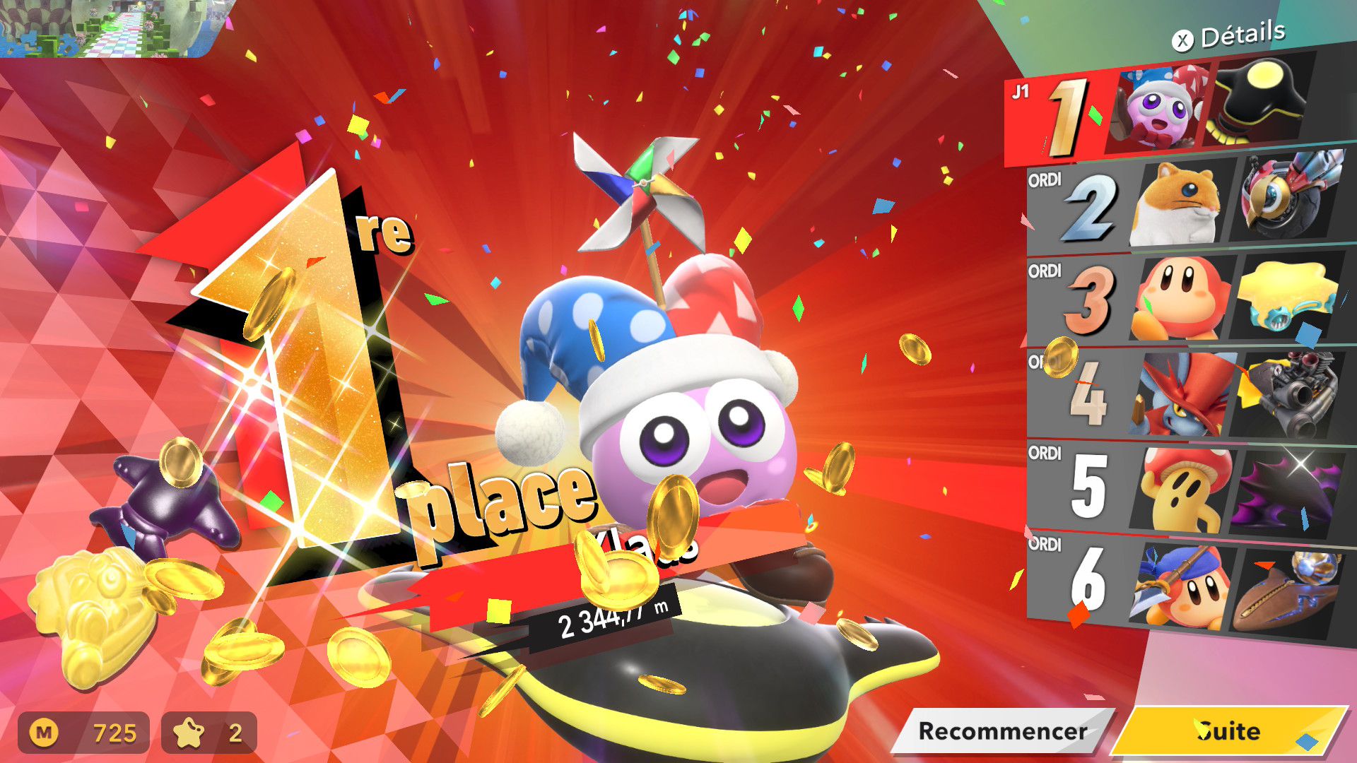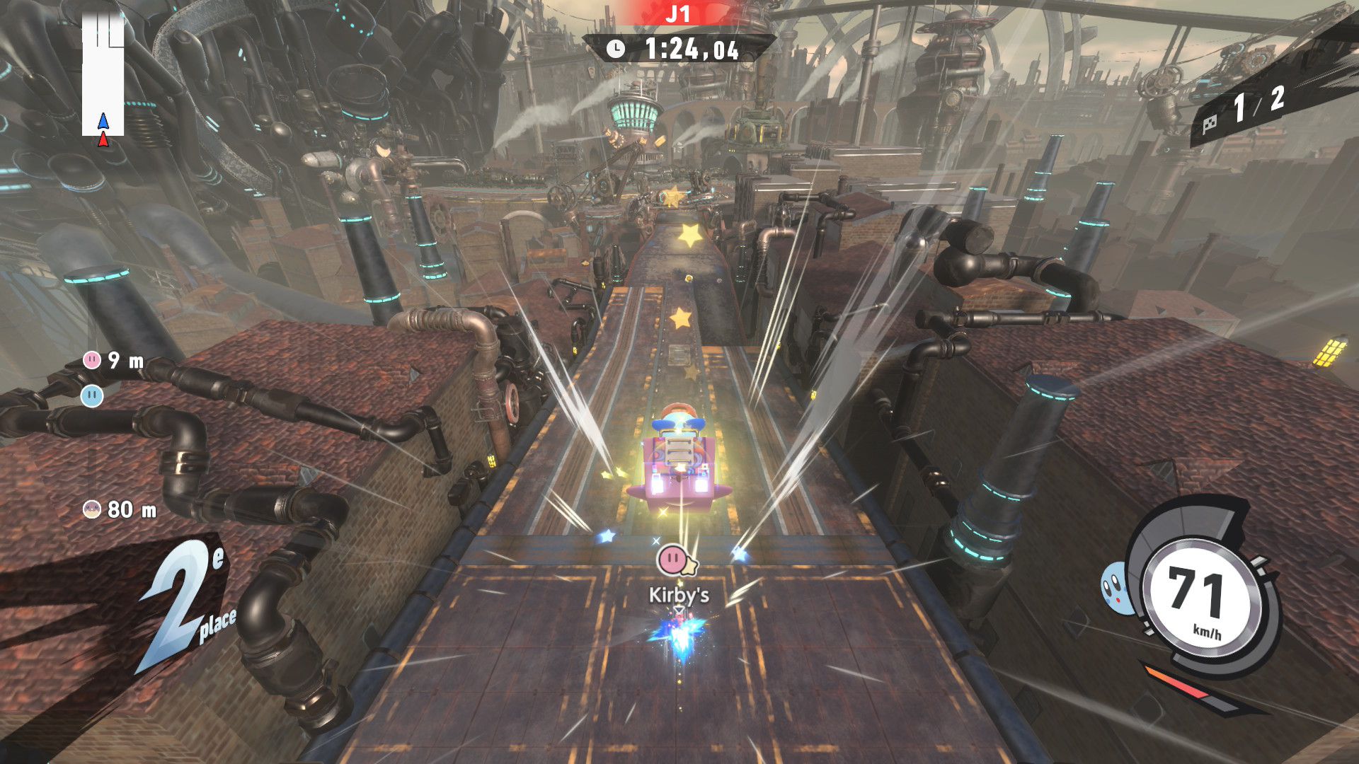 On termine ce test avec un rapport sur tous les aspects techniques concernant Kirby Air Riders. Le jeu s’en sort heureusement très bien, avec une fluidité constante dans tous les modes de jeu, que ce soit en solo ou en ligne. La direction artistique nous offre des environnements variés et des musiques très soignées qui devraient mettre tout le monde d’accord sur la qualité de la bande-son et plus largement de celle de toute la franchise Kirby. Les plus sensibles aux aspects techniques dans les jeux vidéo remarqueront cependant qu’en termes de modélisation ou de graphismes, Kirby Air Riders paraît tout de même quelque peu daté et qu’il se rapproche de ce que l’on pouvait voir sur Switch. Toutefois, nous n’avons noté aucun souci au niveau des performances, y compris concernant les temps de chargement qui sont très courts, ou de la résolution. La comparaison peut aussi se faire avec Mario Kart World, qui offre des environnements plus détaillés, mais il est important de noter que les deux jeux sont largement différents et qu’ils ne nécessitaient certainement pas les mêmes ressources. Kirby Air Riders demandait une attention toute particulière à de nombreuses spécificités liées aux bolides et aux riders, d’où la présence de plusieurs options qui permettent de personnaliser le jeu en profondeur. De plus, par nature, le jeu est bien plus « rapide » et ne demande pas d’accorder une attention particulière aux environnements, là où Mario Kart World peut avoir clairement une dimension plus « contemplative » par le biais de son mode balade. Néanmoins, on remarque ici encore plus facilement qu’à l’origine, Kirby Air Riders était tout simplement un jeu Switch. Toutefois, ce défaut ne gâche absolument pas l’expérience et on arrive très bien à apprécier la variété des environnements, la modélisation des bolides, les personnages et de nombreux éléments qui composent cette nouvelle aventure, plus de 20 ans après Kirby Air Ride sur GameCube, et qui s’impose clairement comme l’une des meilleures productions des équipes de Sakurai, et qui sera probablement le jeu préféré de nombreuses personnes appréciant le travail de Sora Ltd.