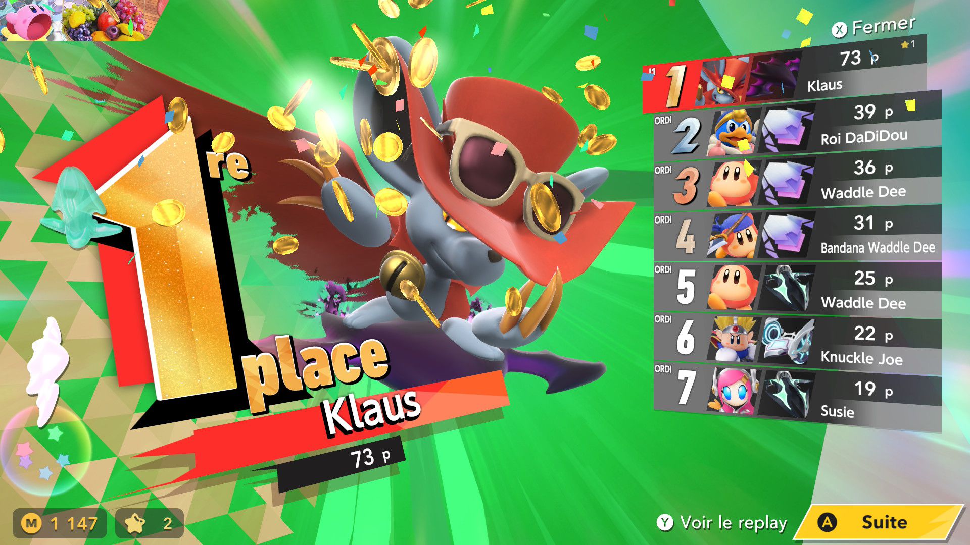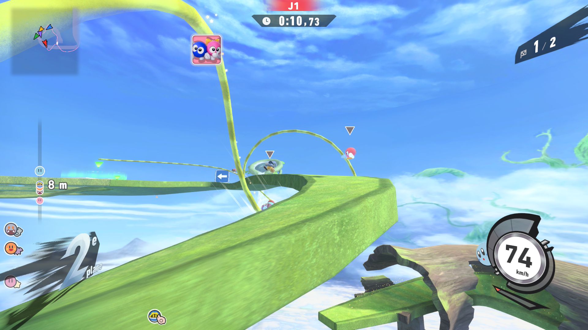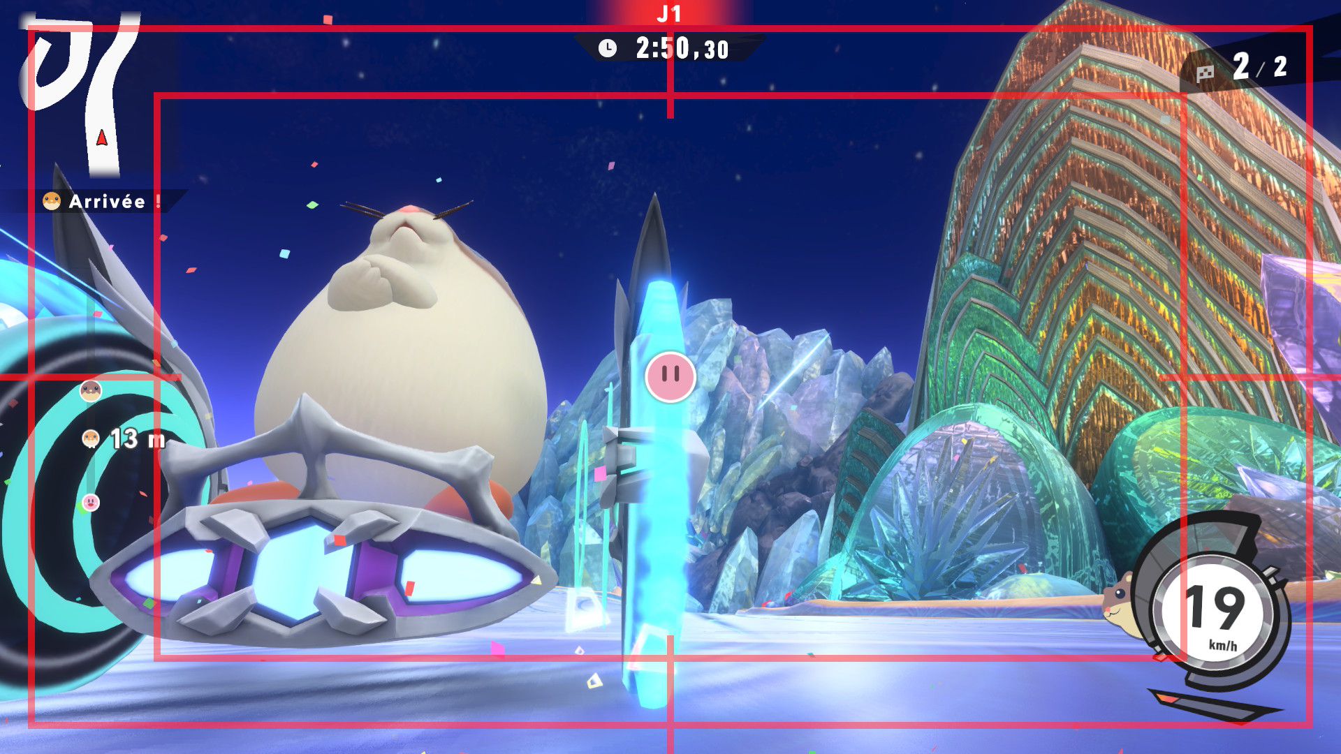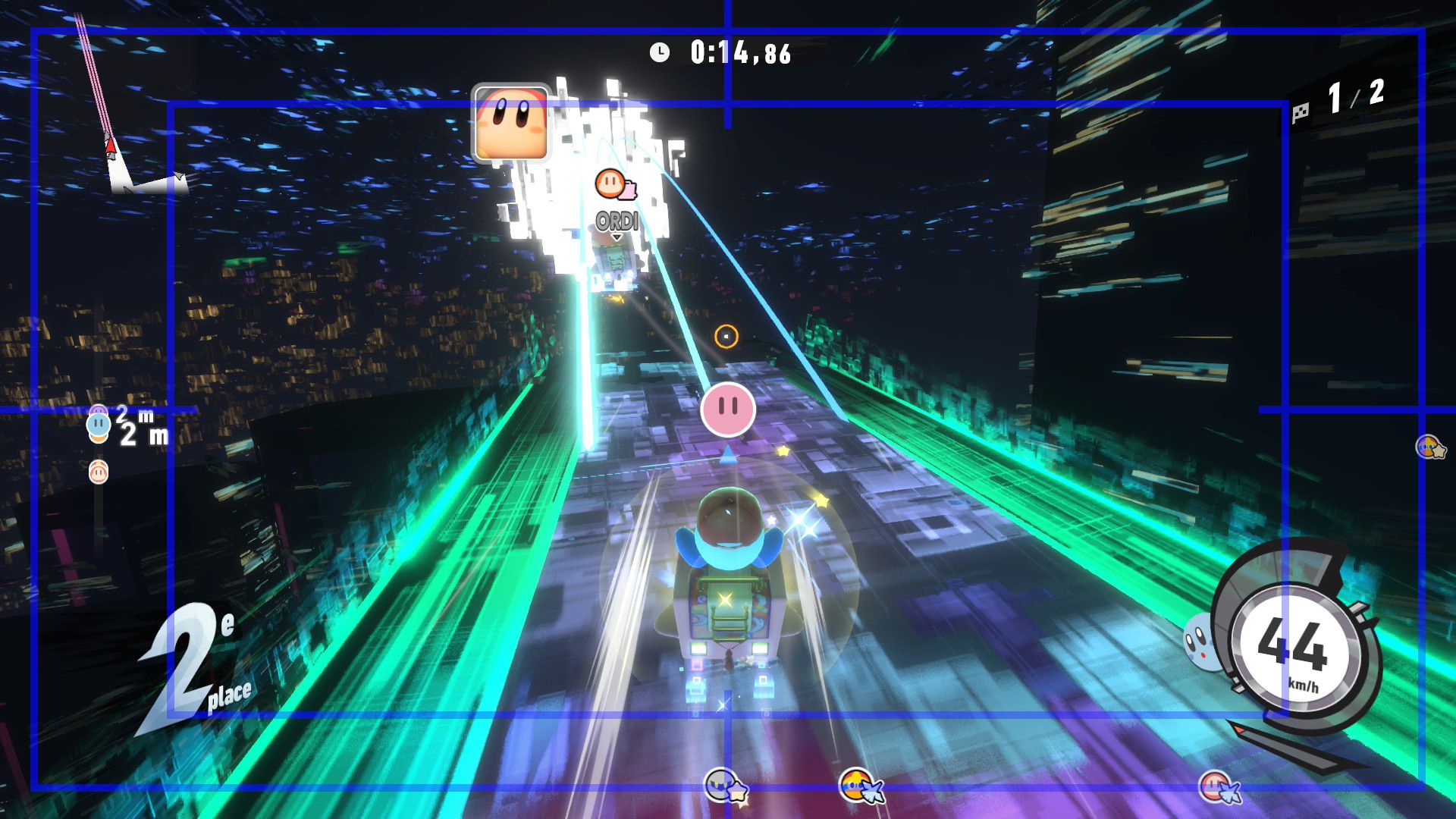 On termine ce test avec un rapport sur tous les aspects techniques concernant Kirby Air Riders. Le jeu s’en sort heureusement très bien, avec une fluidité constante dans tous les modes de jeu, que ce soit en solo ou en ligne. La direction artistique nous offre des environnements variés et des musiques très soignées qui devraient mettre tout le monde d’accord sur la qualité de la bande-son et plus largement de celle de toute la franchise Kirby. Les plus sensibles aux aspects techniques dans les jeux vidéo remarqueront cependant qu’en termes de modélisation ou de graphismes, Kirby Air Riders paraît tout de même quelque peu daté et qu’il se rapproche de ce que l’on pouvait voir sur Switch. Toutefois, nous n’avons noté aucun souci au niveau des performances, y compris concernant les temps de chargement qui sont très courts, ou de la résolution. La comparaison peut aussi se faire avec Mario Kart World, qui offre des environnements plus détaillés, mais il est important de noter que les deux jeux sont largement différents et qu’ils ne nécessitaient certainement pas les mêmes ressources. Kirby Air Riders demandait une attention toute particulière à de nombreuses spécificités liées aux bolides et aux riders, d’où la présence de plusieurs options qui permettent de personnaliser le jeu en profondeur. De plus, par nature, le jeu est bien plus « rapide » et ne demande pas d’accorder une attention particulière aux environnements, là où Mario Kart World peut avoir clairement une dimension plus « contemplative » par le biais de son mode balade. Néanmoins, on remarque ici encore plus facilement qu’à l’origine, Kirby Air Riders était tout simplement un jeu Switch. Toutefois, ce défaut ne gâche absolument pas l’expérience et on arrive très bien à apprécier la variété des environnements, la modélisation des bolides, les personnages et de nombreux éléments qui composent cette nouvelle aventure, plus de 20 ans après Kirby Air Ride sur GameCube, et qui s’impose clairement comme l’une des meilleures productions des équipes de Sakurai, et qui sera probablement le jeu préféré de nombreuses personnes appréciant le travail de Sora Ltd.