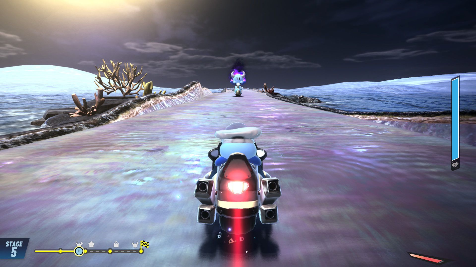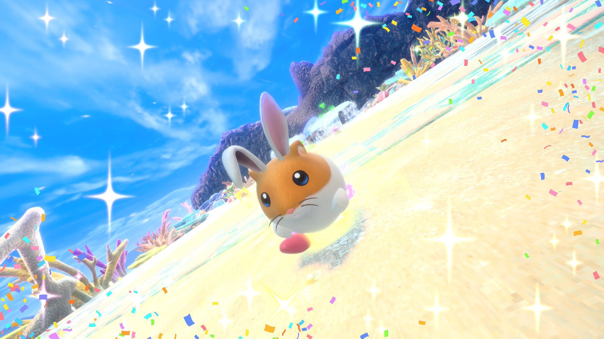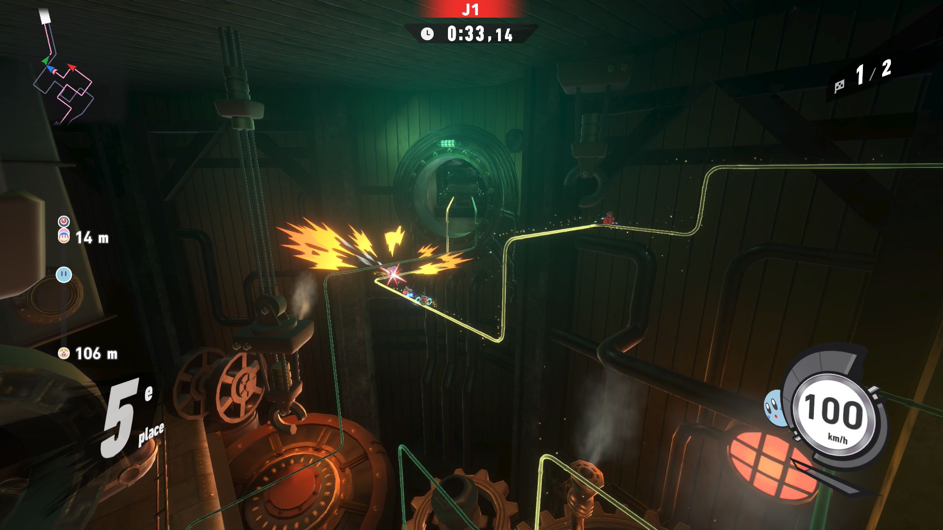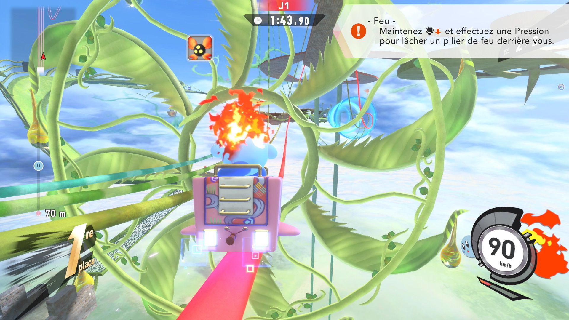 On termine ce test avec un rapport sur tous les aspects techniques concernant Kirby Air Riders. Le jeu s’en sort heureusement très bien, avec une fluidité constante dans tous les modes de jeu, que ce soit en solo ou en ligne. La direction artistique nous offre des environnements variés et des musiques très soignées qui devraient mettre tout le monde d’accord sur la qualité de la bande-son et plus largement de celle de toute la franchise Kirby. Les plus sensibles aux aspects techniques dans les jeux vidéo remarqueront cependant qu’en termes de modélisation ou de graphismes, Kirby Air Riders paraît tout de même quelque peu daté et qu’il se rapproche de ce que l’on pouvait voir sur Switch. Toutefois, nous n’avons noté aucun souci au niveau des performances, y compris concernant les temps de chargement qui sont très courts, ou de la résolution. La comparaison peut aussi se faire avec Mario Kart World, qui offre des environnements plus détaillés, mais il est important de noter que les deux jeux sont largement différents et qu’ils ne nécessitaient certainement pas les mêmes ressources. Kirby Air Riders demandait une attention toute particulière à de nombreuses spécificités liées aux bolides et aux riders, d’où la présence de plusieurs options qui permettent de personnaliser le jeu en profondeur. De plus, par nature, le jeu est bien plus « rapide » et ne demande pas d’accorder une attention particulière aux environnements, là où Mario Kart World peut avoir clairement une dimension plus « contemplative » par le biais de son mode balade. Néanmoins, on remarque ici encore plus facilement qu’à l’origine, Kirby Air Riders était tout simplement un jeu Switch. Toutefois, ce défaut ne gâche absolument pas l’expérience et on arrive très bien à apprécier la variété des environnements, la modélisation des bolides, les personnages et de nombreux éléments qui composent cette nouvelle aventure, plus de 20 ans après Kirby Air Ride sur GameCube, et qui s’impose clairement comme l’une des meilleures productions des équipes de Sakurai, et qui sera probablement le jeu préféré de nombreuses personnes appréciant le travail de Sora Ltd.