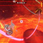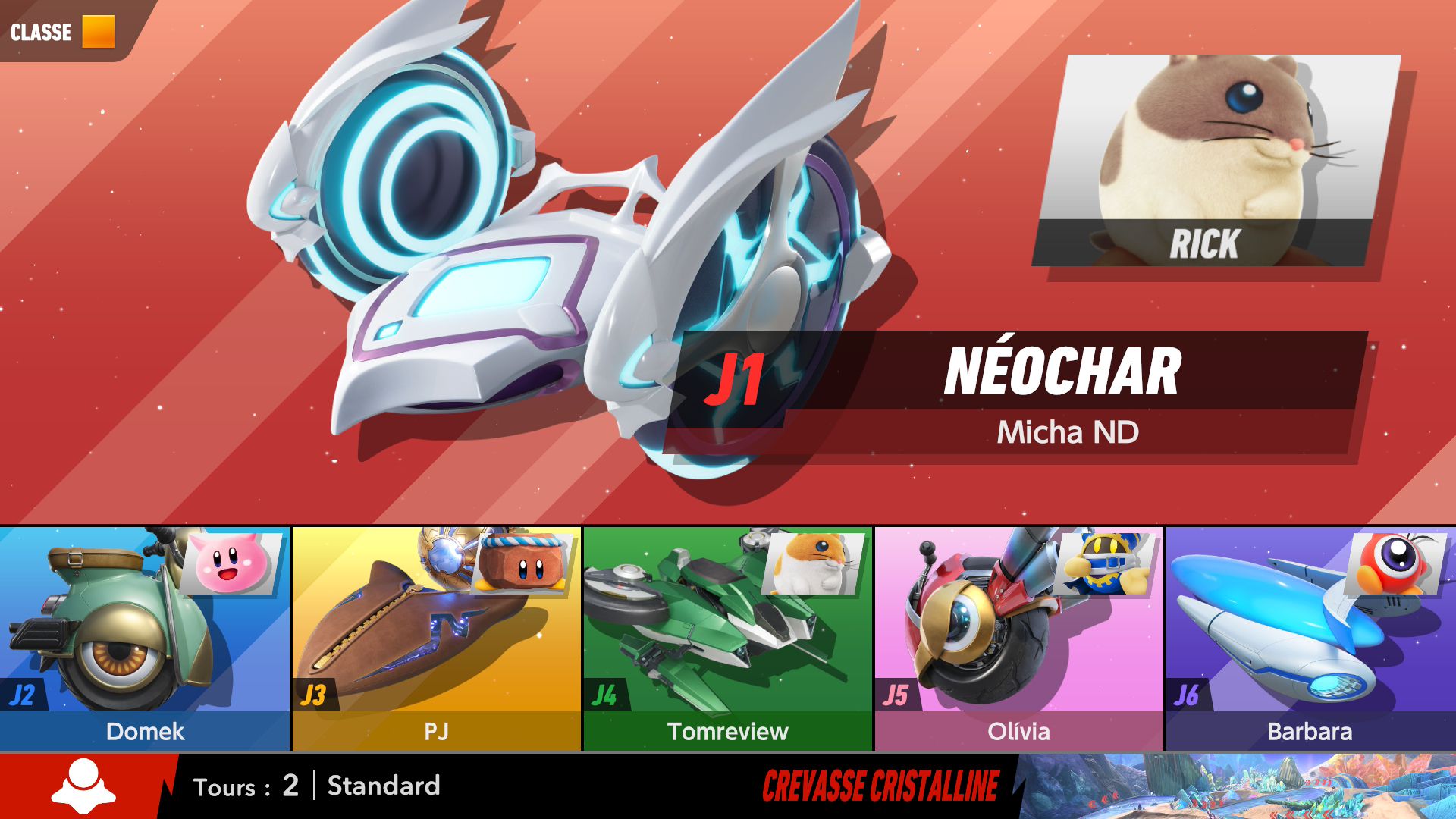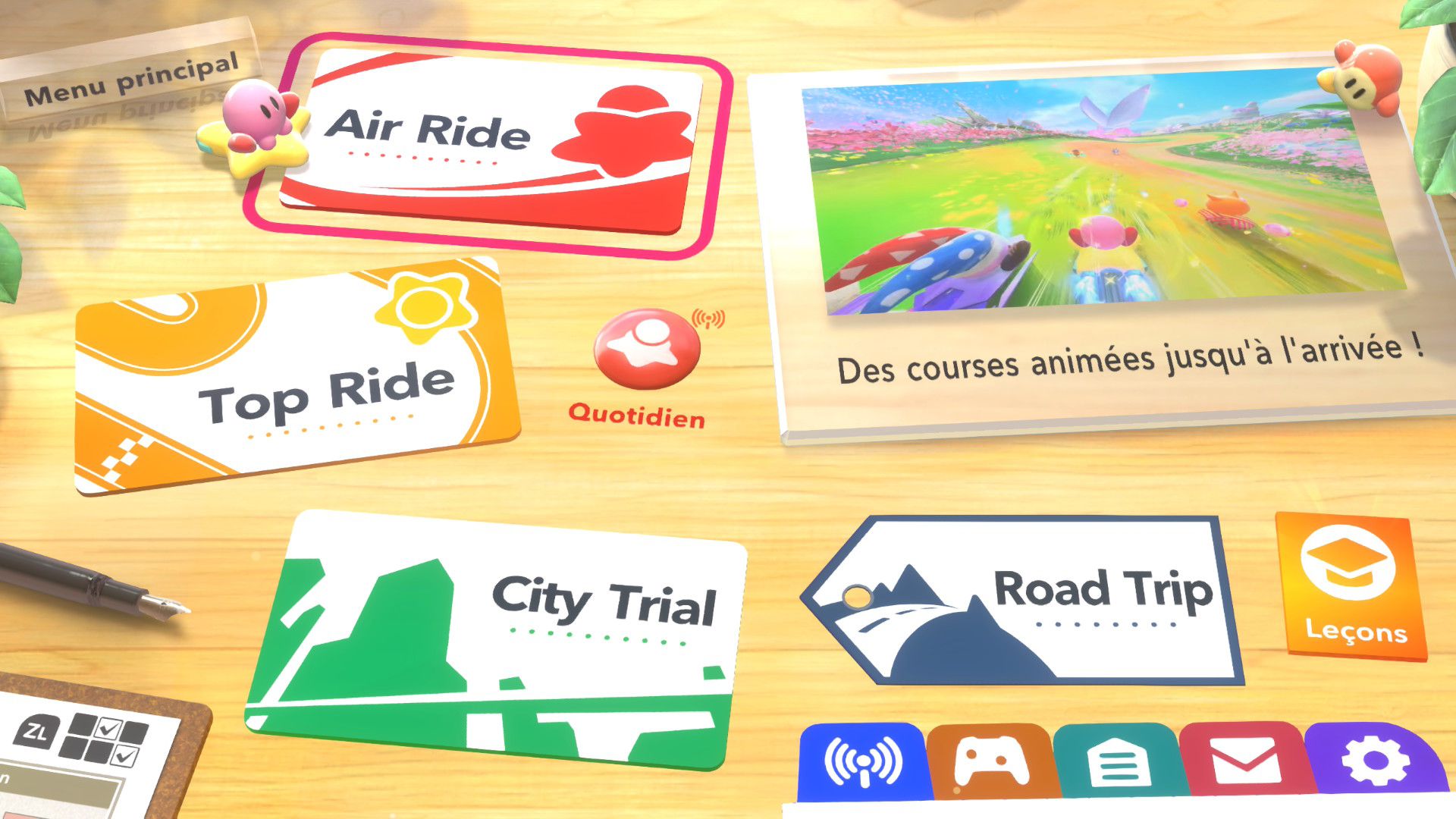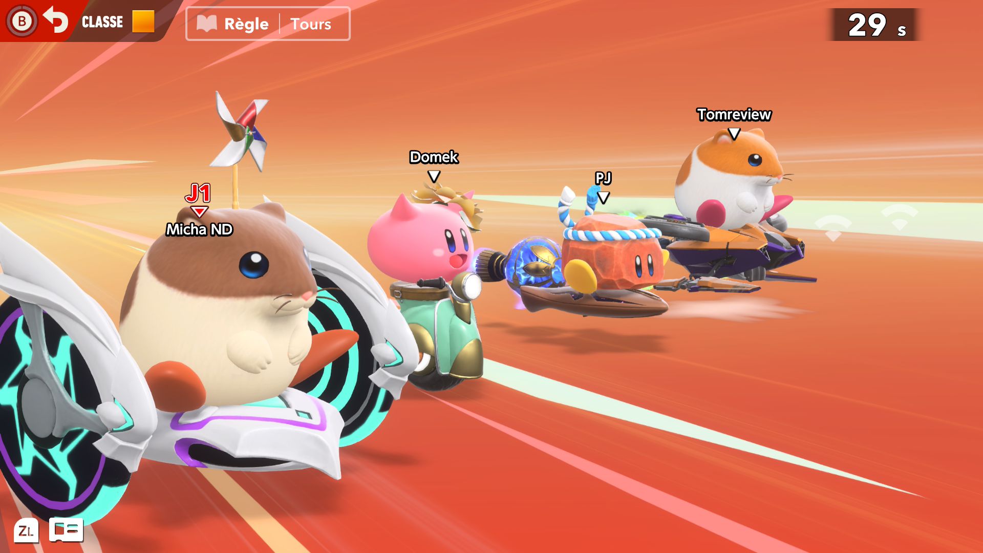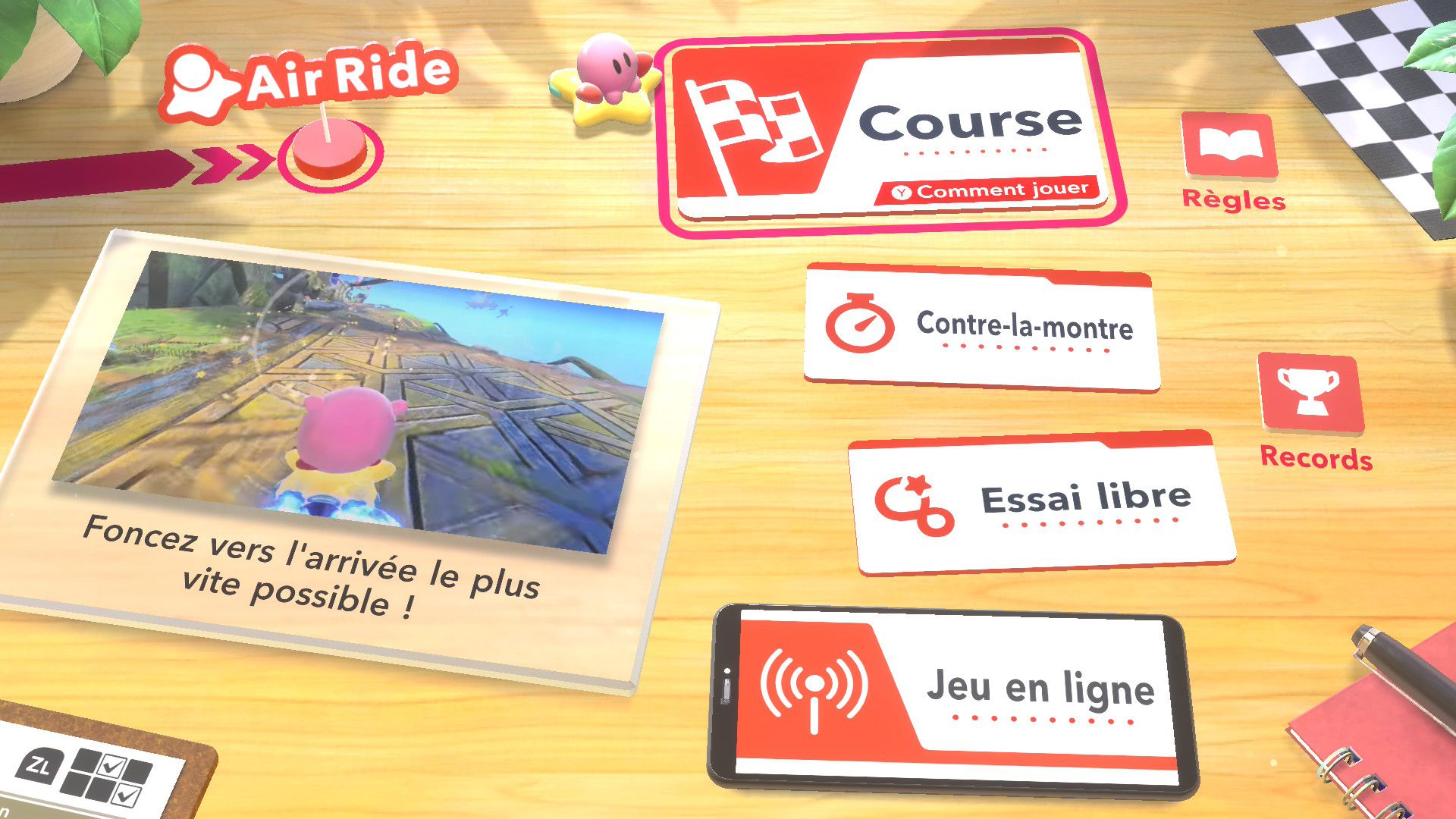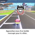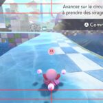 Dans Air Ride, après avoir sélectionné un circuit, on peut choisir un rider et un bolide. Là aussi, au début du jeu, le choix est très restreint. Petit à petit, on peut débloquer de nouveaux riders et bolides grâce aux missions. Celles-ci peuvent être accomplies assez naturellement en règle générale, mais d’autres nécessitent de réaliser des actions assez spécifiques, ce qui nécessite de consulter régulièrement le tableau des missions de chaque mode pour savoir exactement quoi faire. En plus des courses standard, il y a des modes contre-la-montre et essai libre. Ce dernier permet de parcourir chaque circuit simplement, sans chrono ni adversaires, ce qui est très utile pour se familiariser correctement avec chaque tracé. Évidemment, il y a aussi le mode en ligne, avec des parties classées et rapides, ainsi qu’un foyer, largement présenté dans le dernier Direct dédié au jeu, qui permet à plusieurs personnes de se rejoindre. On peut le considérer comme un bonus, mais cela ajoute une véritable identité au jeu, que l’on voit encore plus comme une grande célébration de la série Kirby.