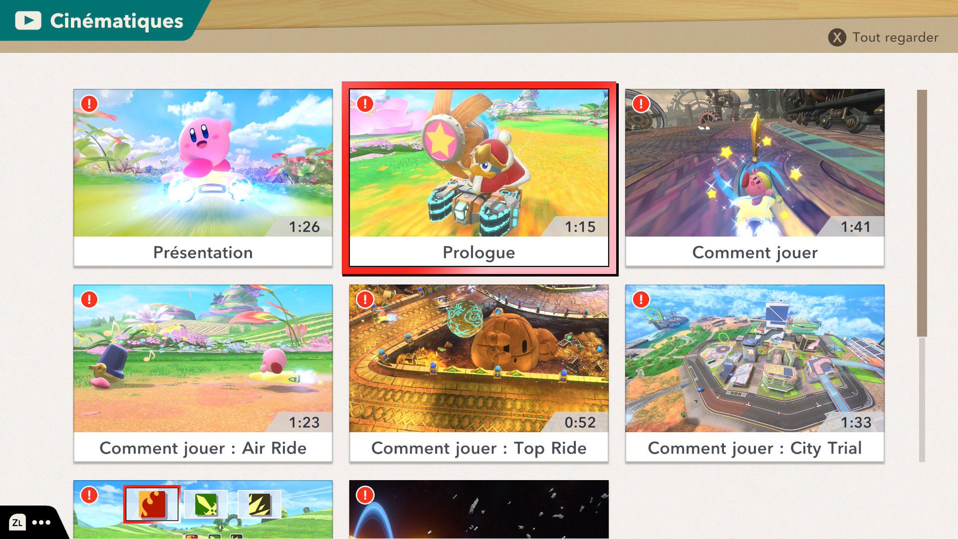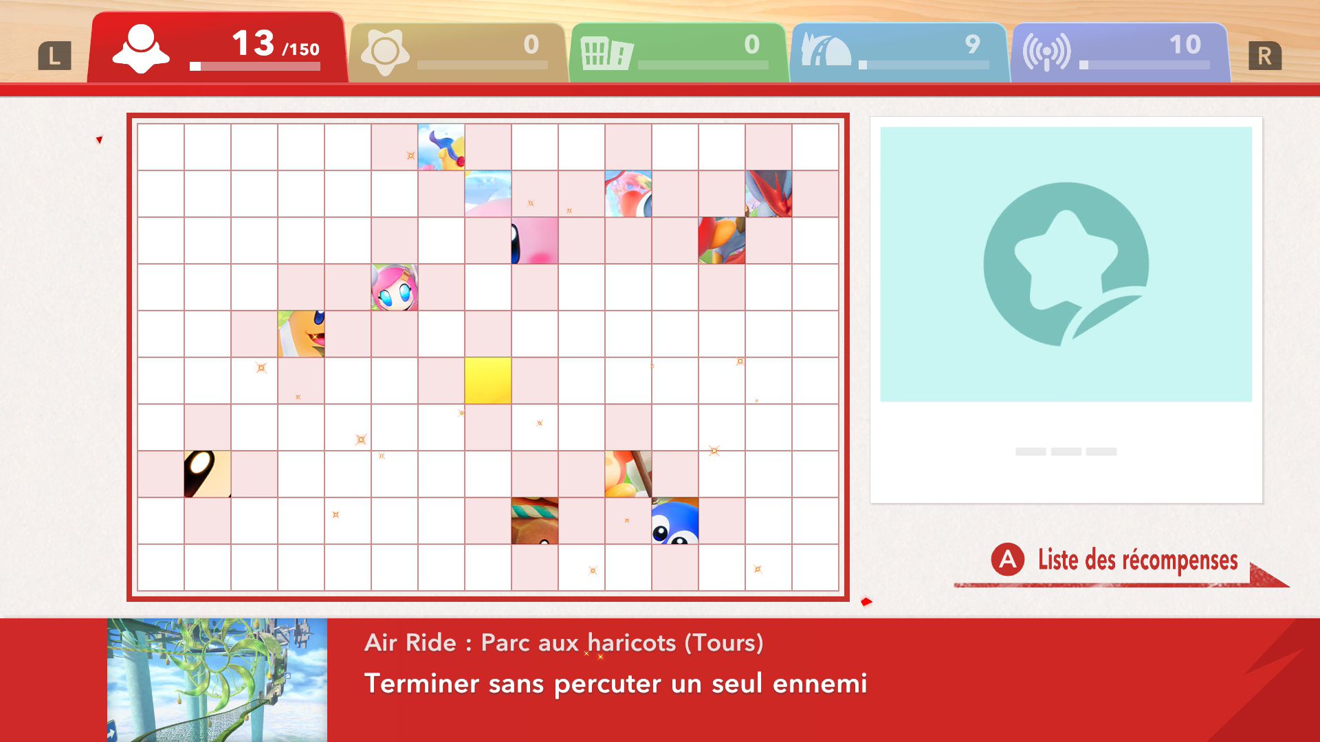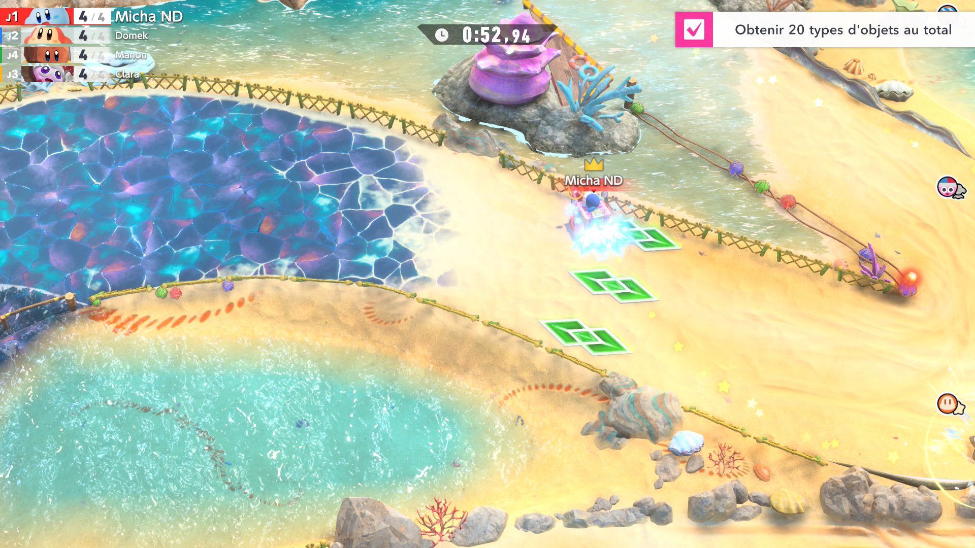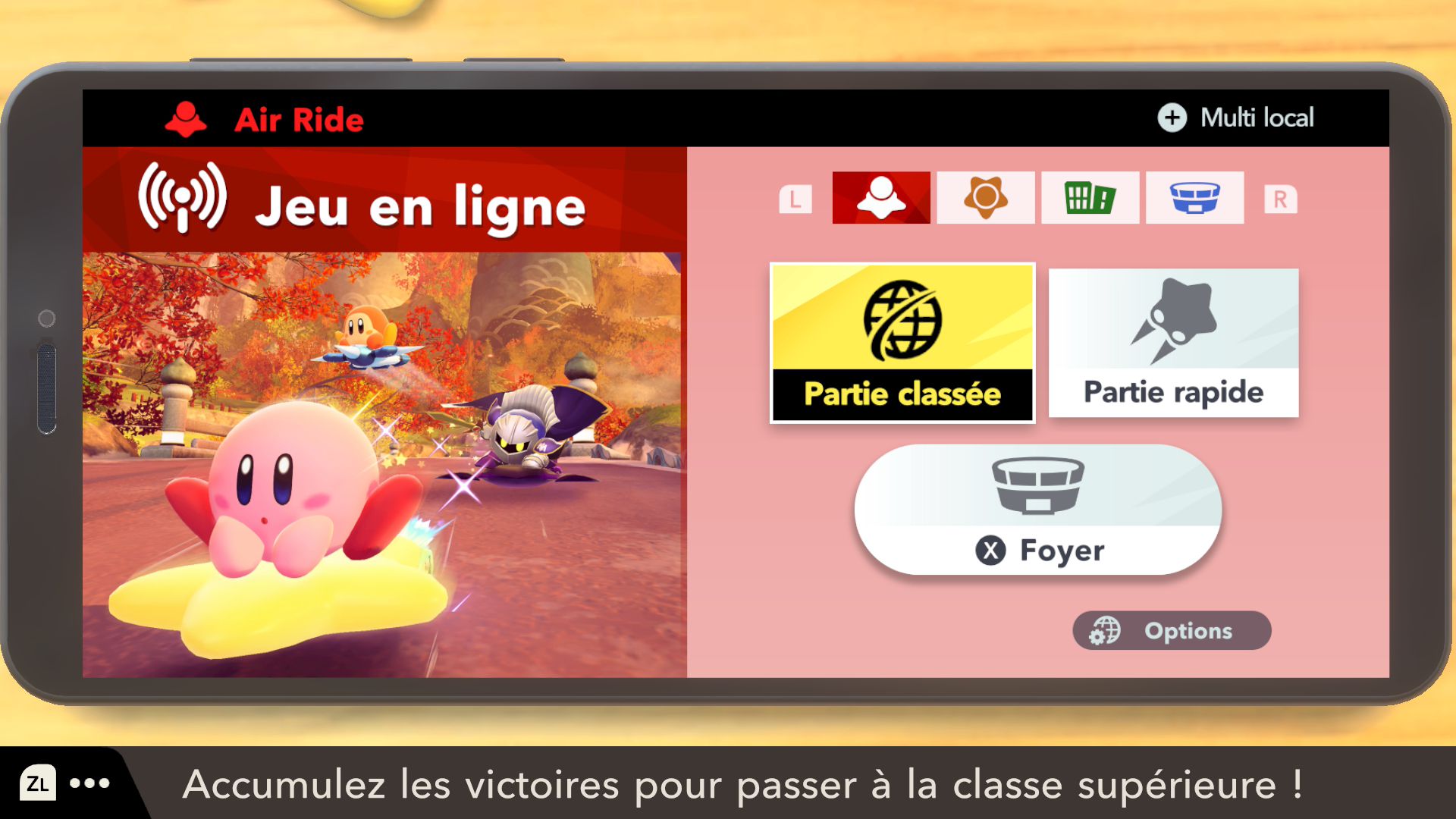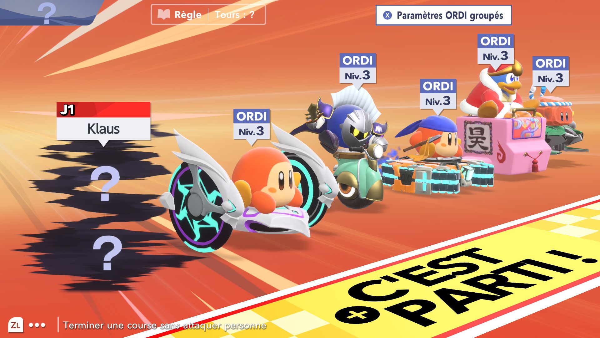 Dans Air Ride, après avoir sélectionné un circuit, on peut choisir un rider et un bolide. Là aussi, au début du jeu, le choix est très restreint. Petit à petit, on peut débloquer de nouveaux riders et bolides grâce aux missions. Celles-ci peuvent être accomplies assez naturellement en règle générale, mais d’autres nécessitent de réaliser des actions assez spécifiques, ce qui nécessite de consulter régulièrement le tableau des missions de chaque mode pour savoir exactement quoi faire. En plus des courses standard, il y a des modes contre-la-montre et essai libre. Ce dernier permet de parcourir chaque circuit simplement, sans chrono ni adversaires, ce qui est très utile pour se familiariser correctement avec chaque tracé. Évidemment, il y a aussi le mode en ligne, avec des parties classées et rapides, ainsi qu’un foyer, largement présenté dans le dernier Direct dédié au jeu, qui permet à plusieurs personnes de se rejoindre. On peut le considérer comme un bonus, mais cela ajoute une véritable identité au jeu, que l’on voit encore plus comme une grande célébration de la série Kirby.