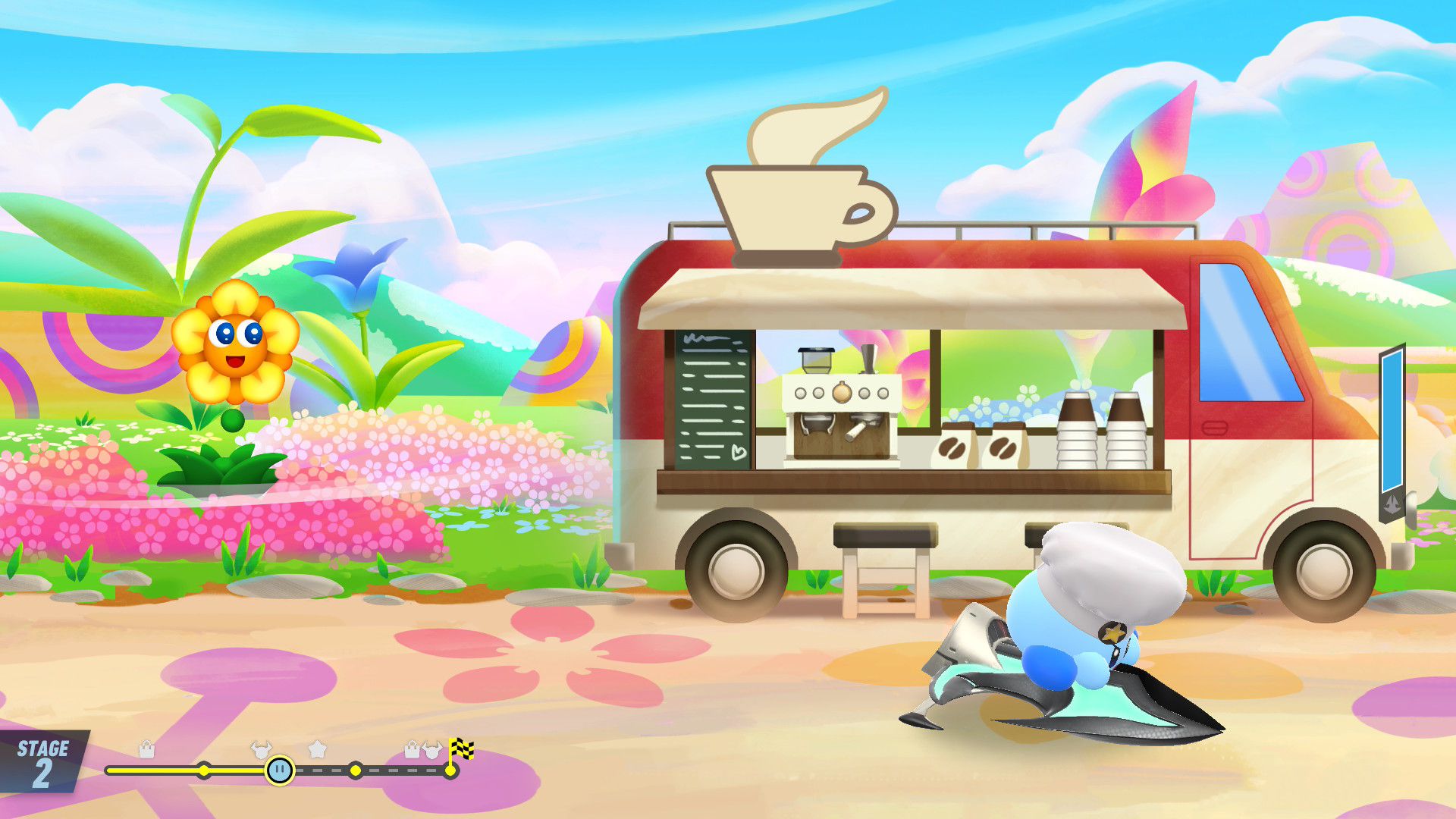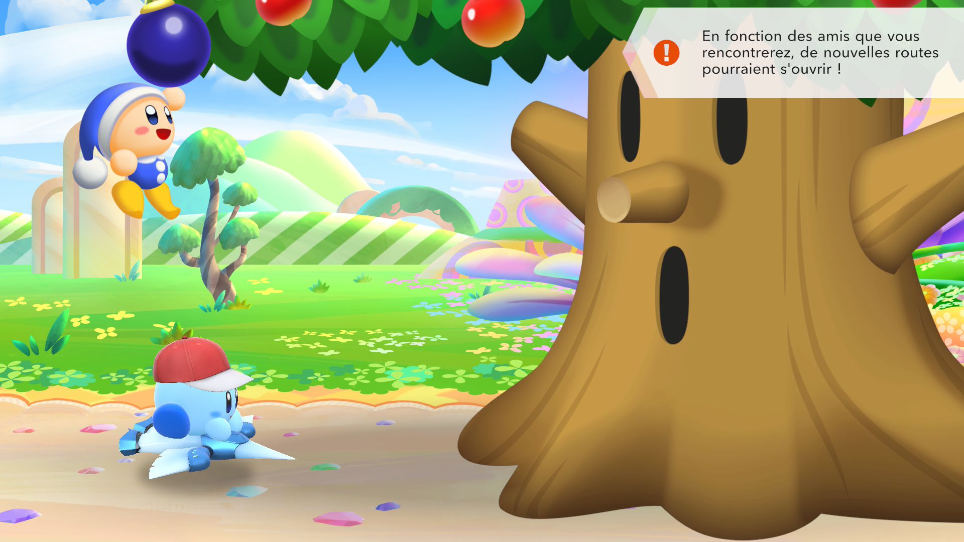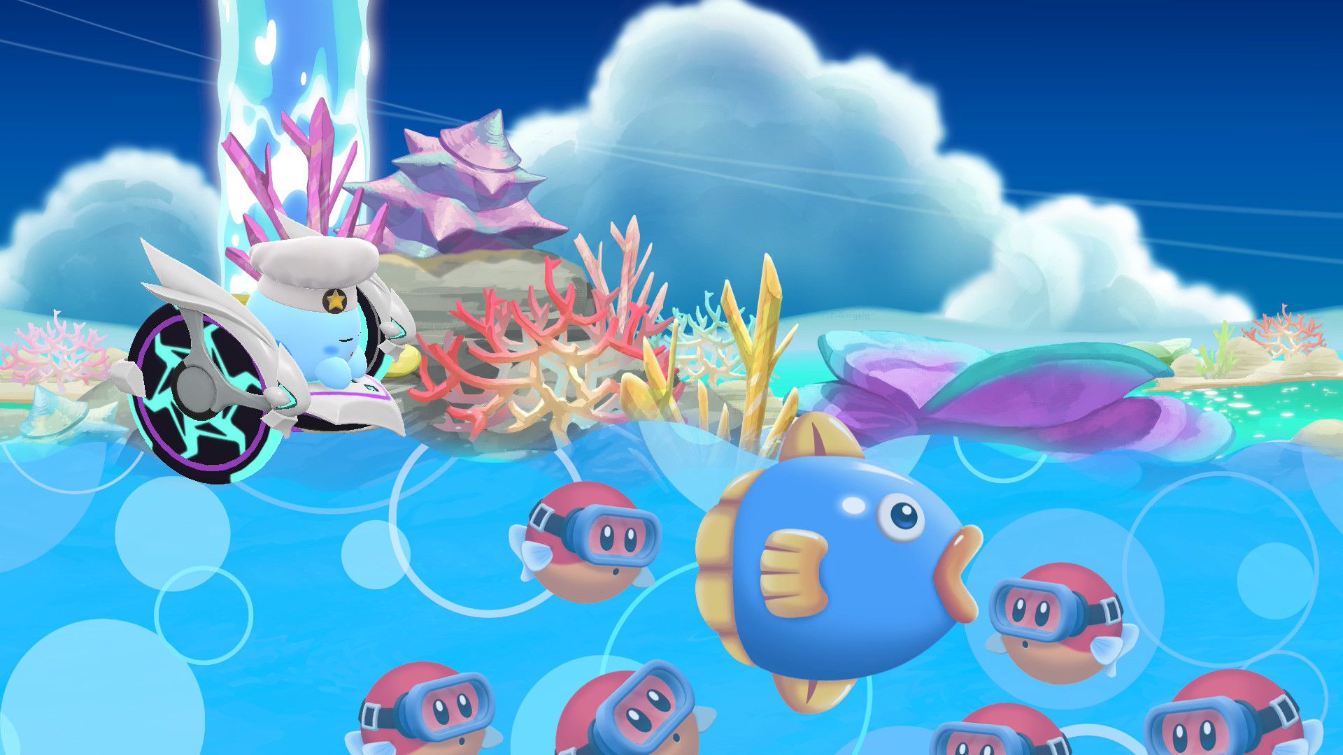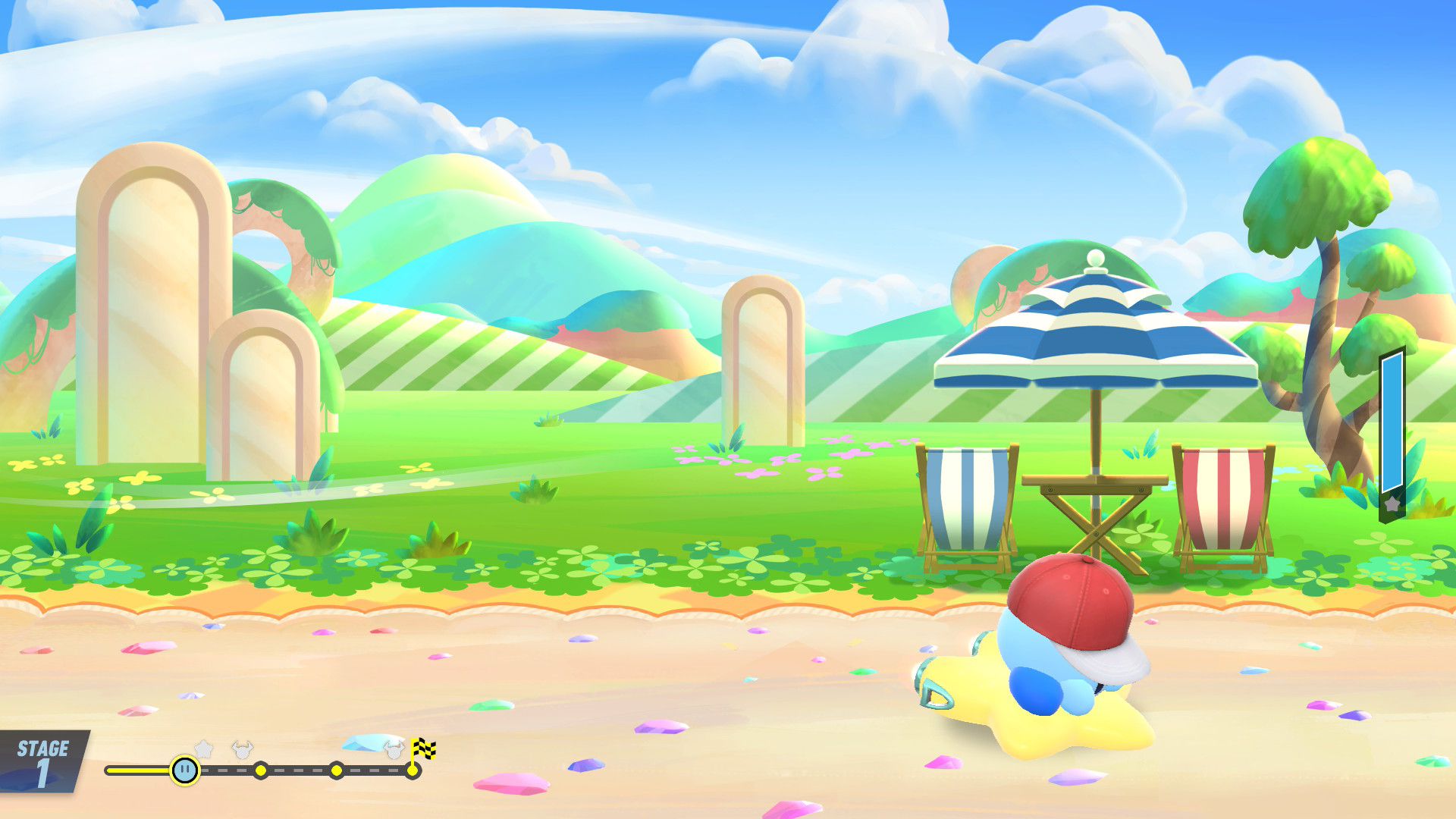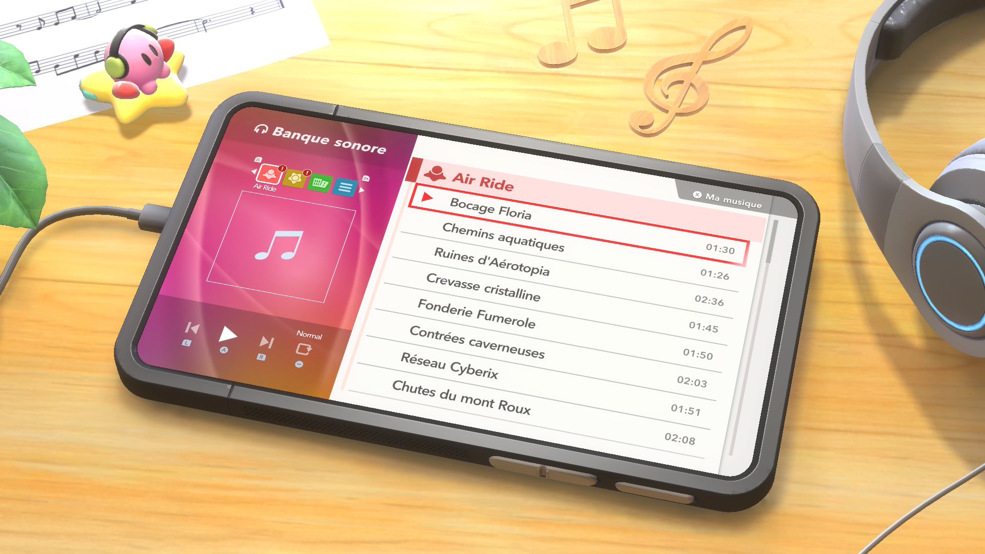Le choix des circuits est divisé en deux parties : les nouveaux et les nouvelles versions des tracés de Kirby Air Ride. À la façon des Mario Kart qui précédaient World sur Switch 2, les circuits repensés de Kirby Air Ride dans Kirby Air Riders ont une réalisation moins poussée que pour les nouveaux, mais les graphismes ont clairement été améliorés. Les musiques ont aussi le mérite de bénéficier de reprises. De manière générale, les compositeurs appelés sur cet épisode, ici principalement Shogo Sakai et Noriyuki Iwadare comme l’avait révélé Sakurai, ont offert une bande originale soignée dont on appréciera aussi l’écoute en dehors du jeu… ou bien directement dedans ! En effet, comme dans les Super Smash Bros., il est possible d’écouter l’ensemble des pistes dans le menu Banque sonore. On peut même en débloquer de nouvelles dans la foire aux Miles, la monnaie du jeu.