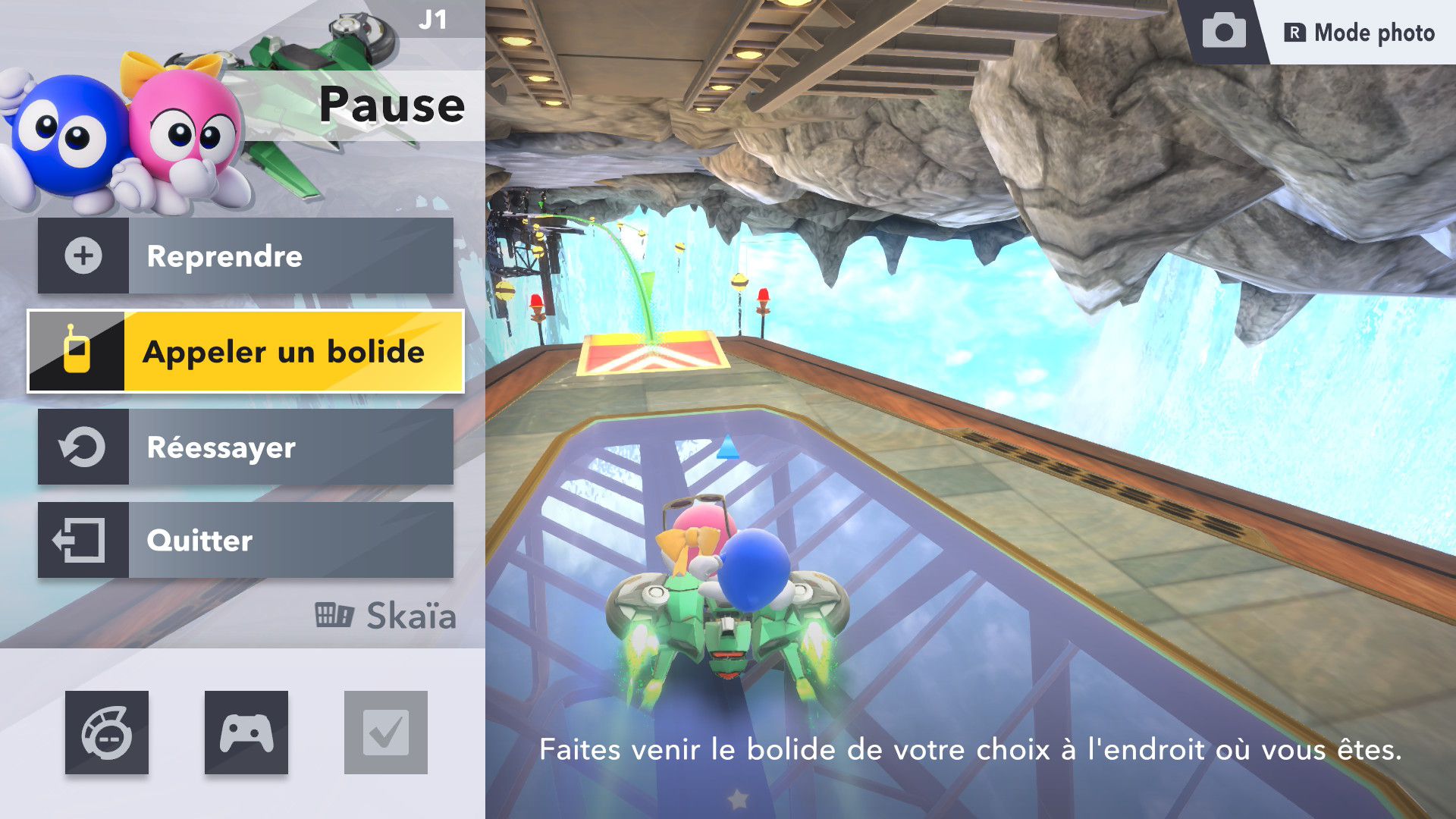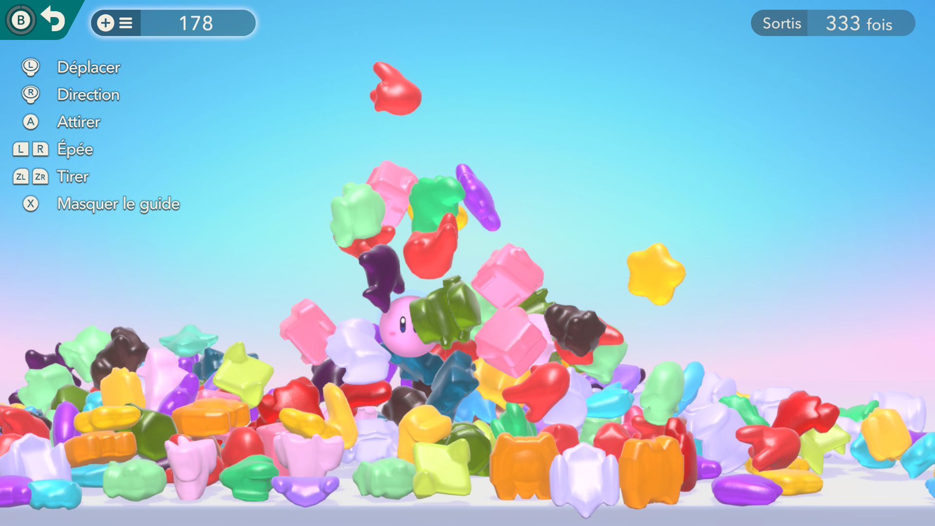 Il est également possible d’exposer les bolides obtenus et personnalisés dans des garages et de voir ce que l’on appelle les bonbecs. Ces derniers sont comme des souvenirs de toutes nos victoires, symbolisés par des bonbons en forme de bolides vaincus au cours du jeu. C’est certainement la fonction la plus secondaire du jeu, mais l’ajout est plutôt mignon et correspond bien au fait que quand Sakurai a une idée derrière la tête, il donne l’impression de tout mettre en œuvre pour qu’elle soit incorporée dans le jeu, même si on peut se dire qu’elle n’a pas beaucoup d’utilité. Par contre, le mode photo, qui peut là aussi être considéré comme très secondaire, est pourtant un ajout assez appréciable avec la possibilité de créer ce qui peut s’apparenter à des œuvres d’art grâce aux différentes options à disposition.